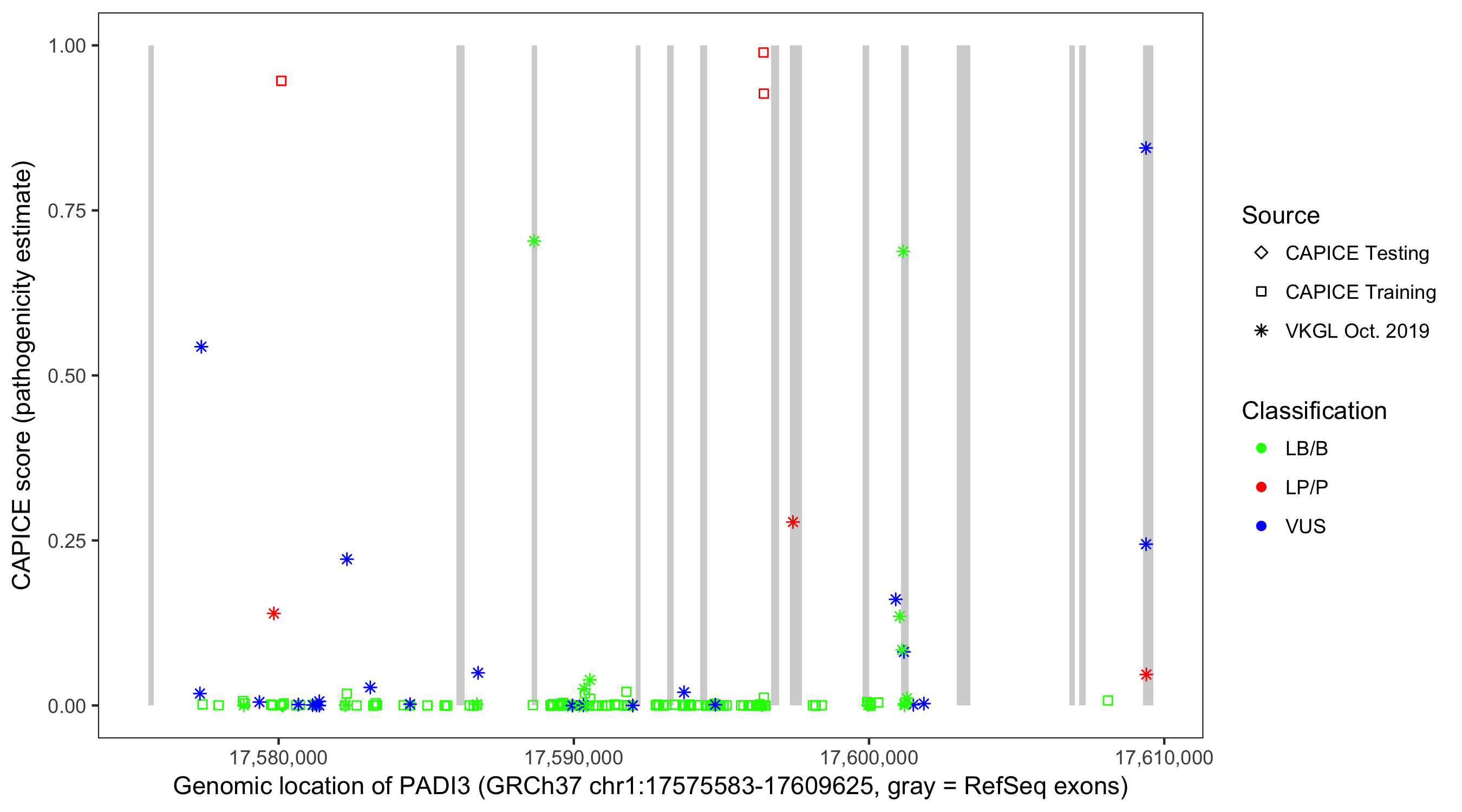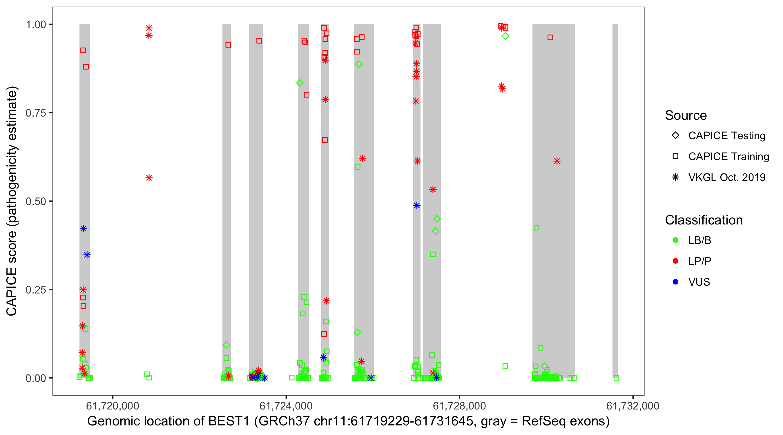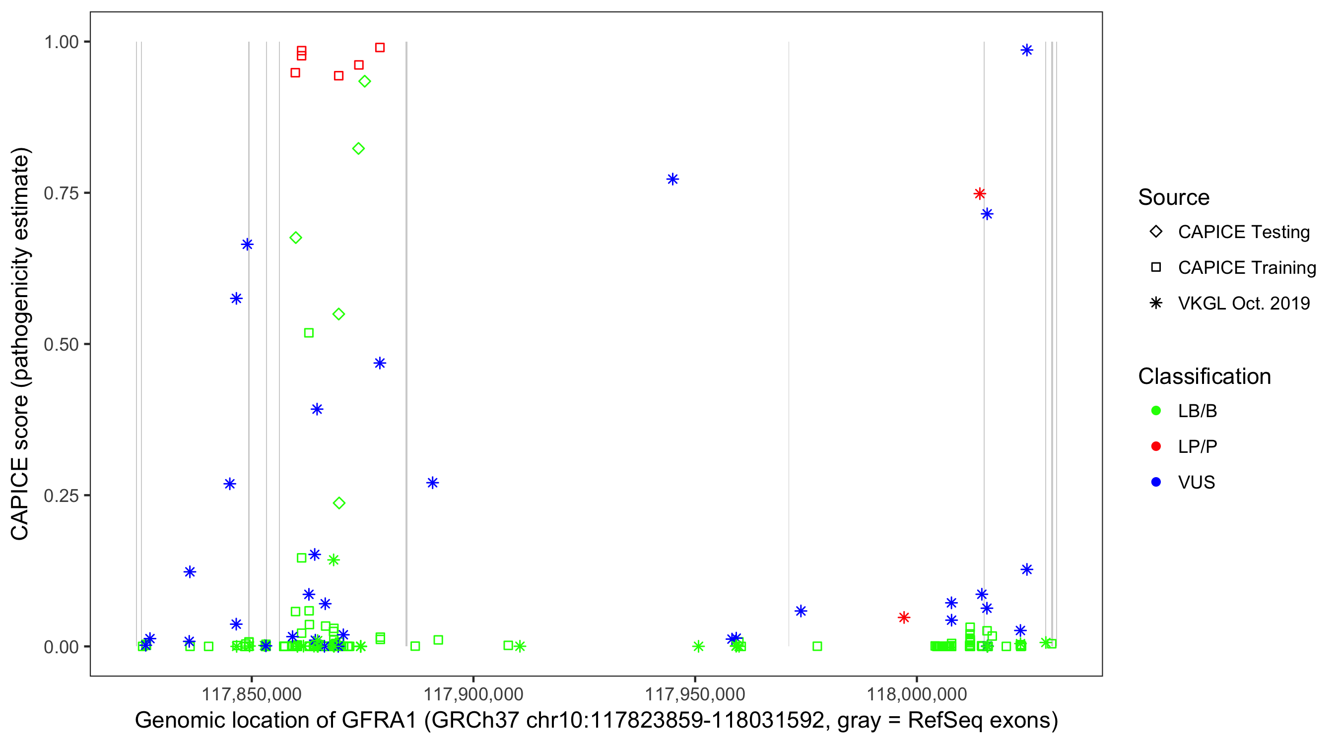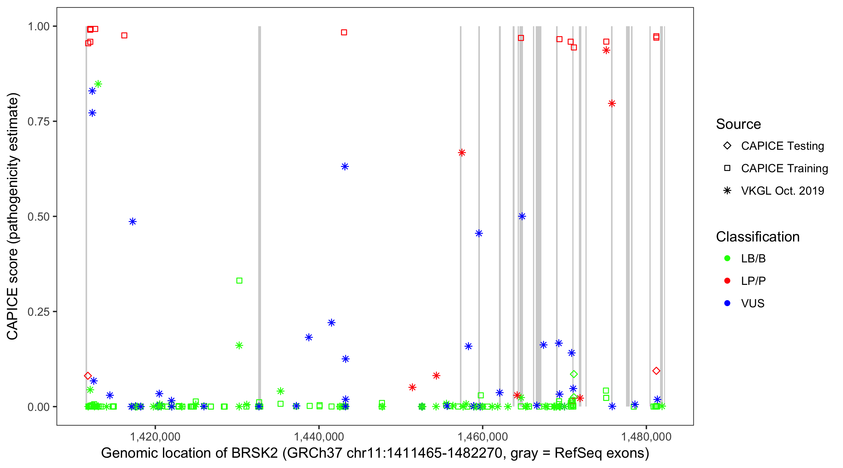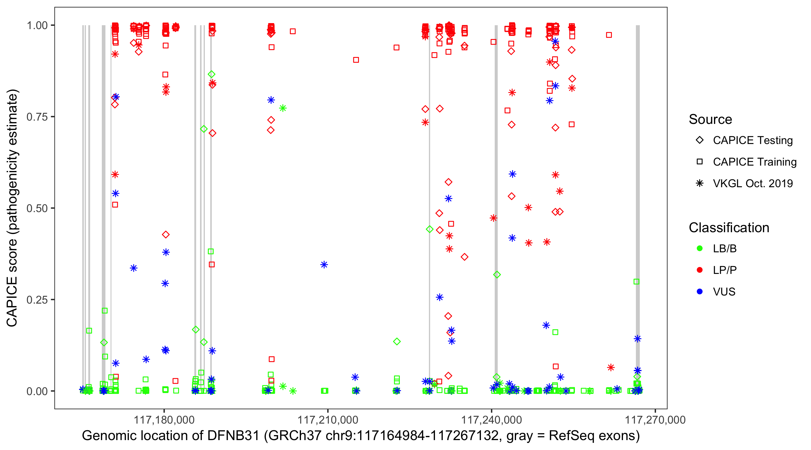Shown are CAPICE train/test variants plus VKGL Oct 2019.