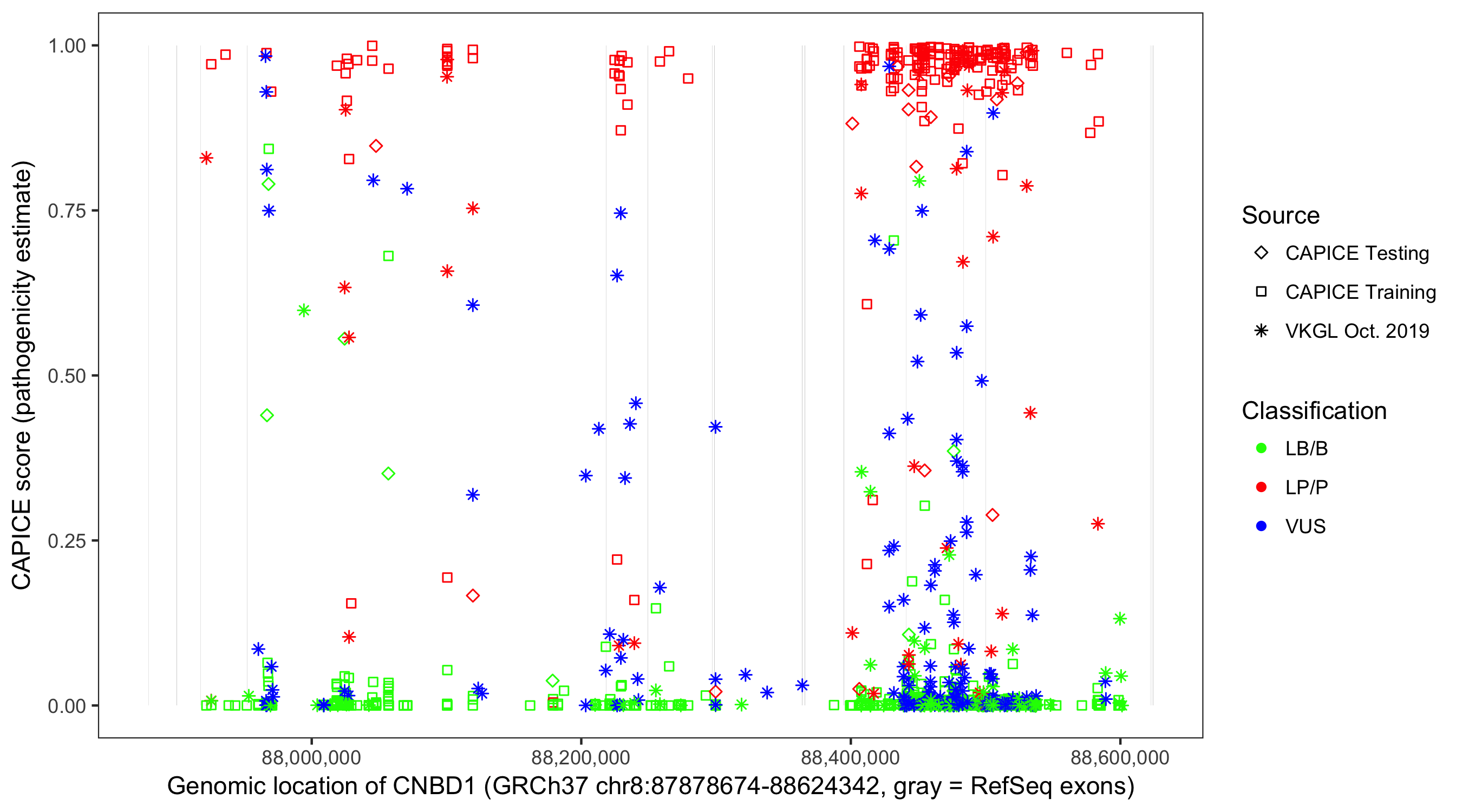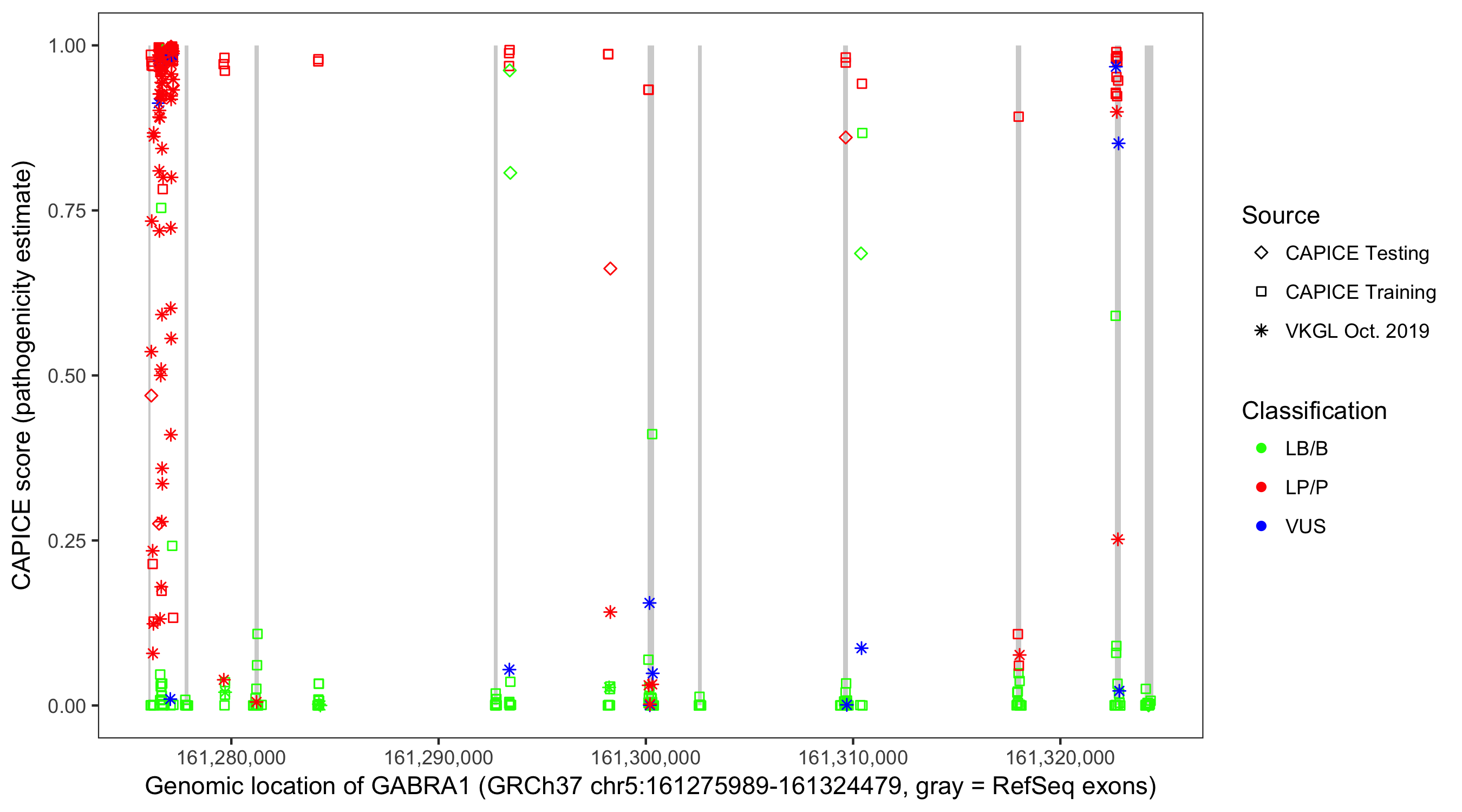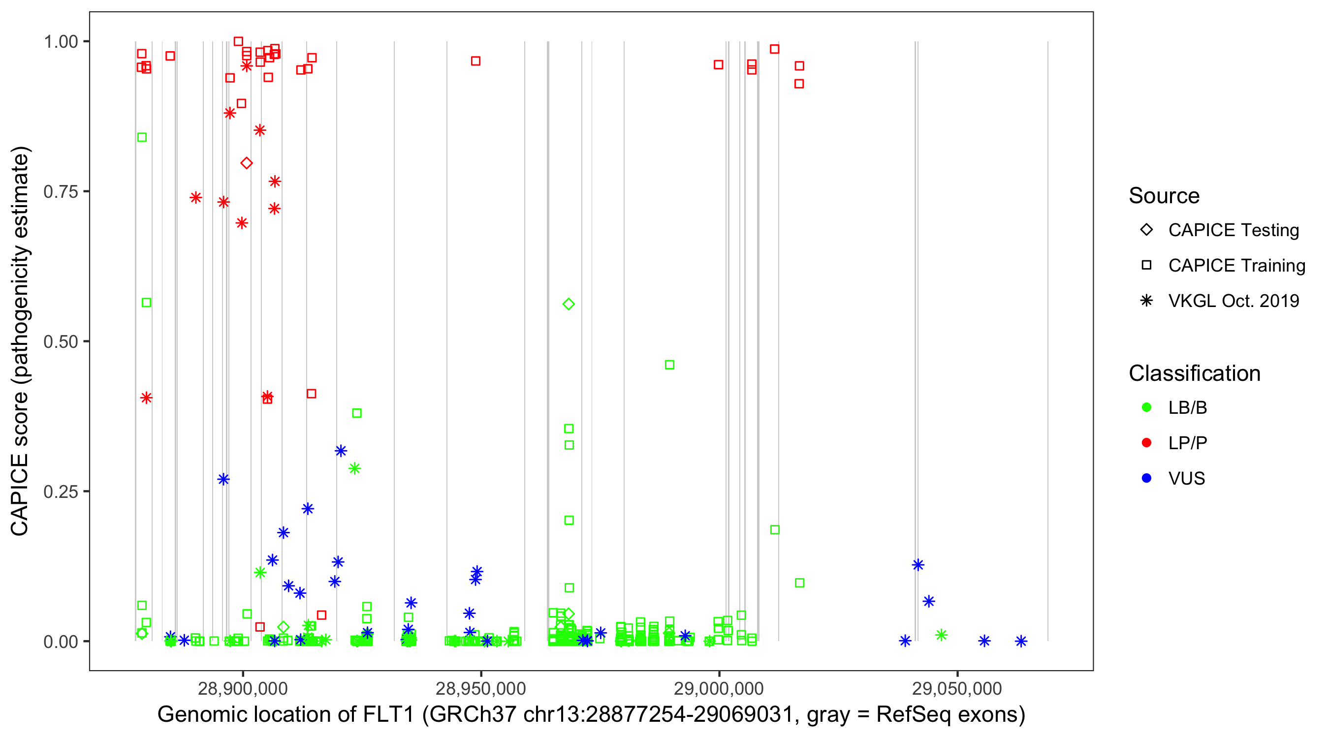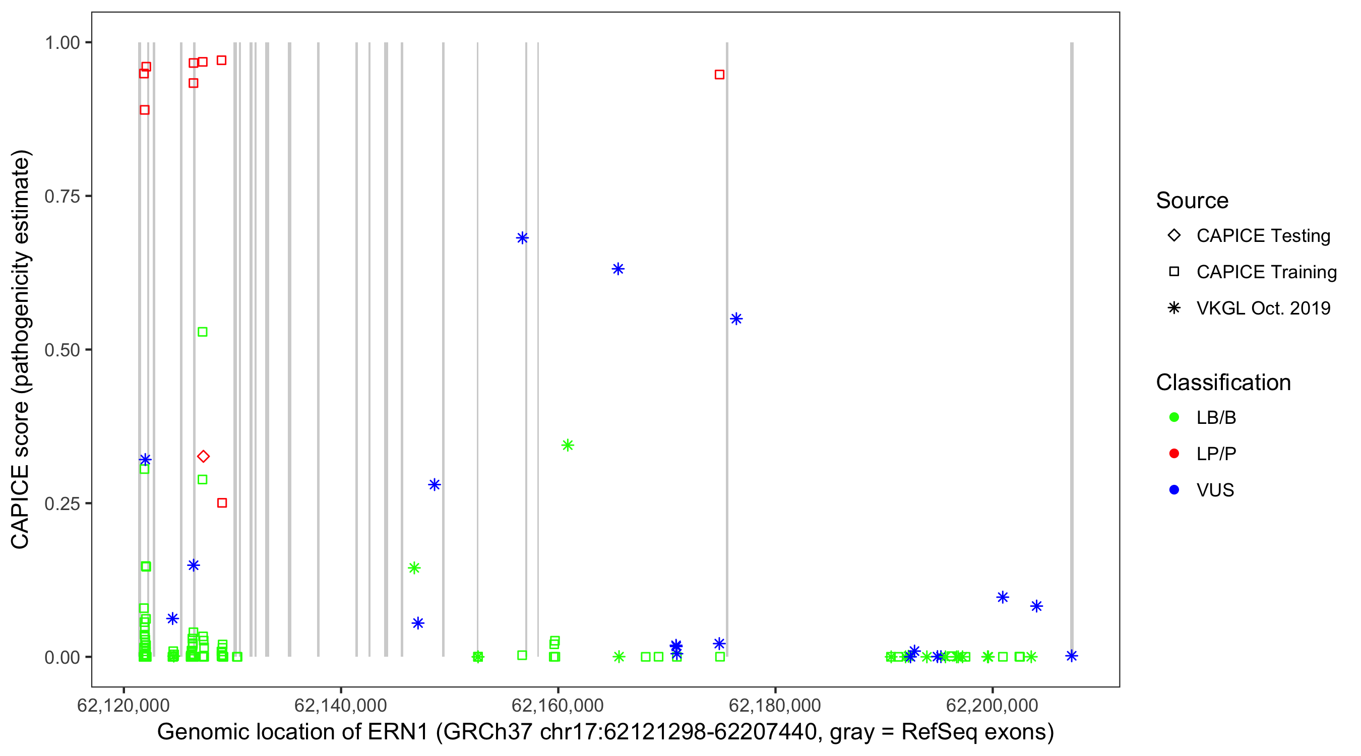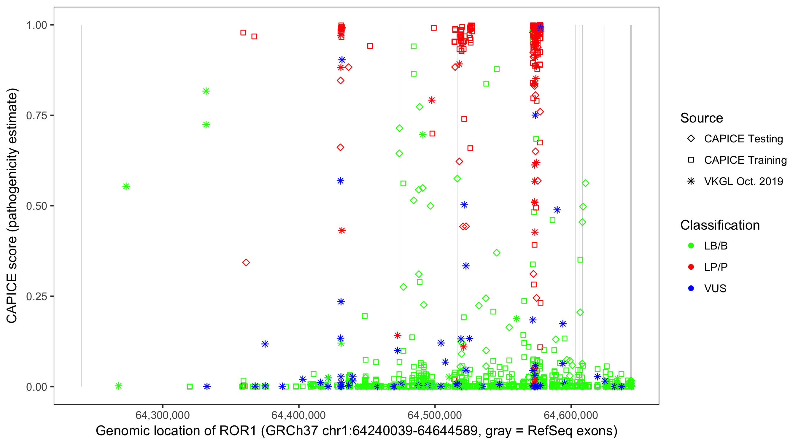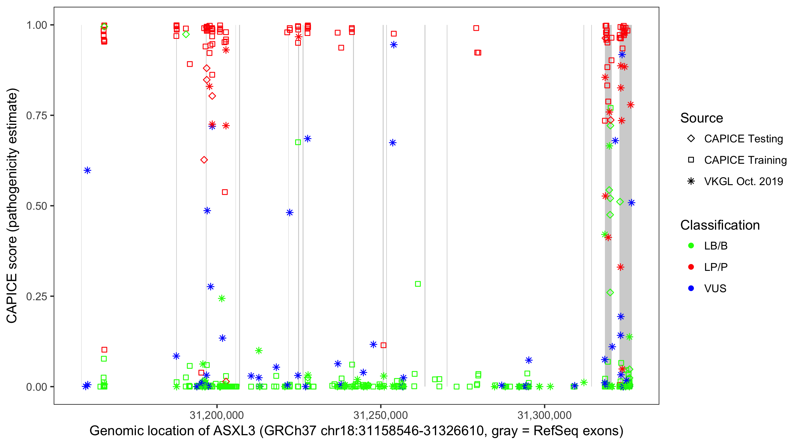 Shown are CAPICE train/test variants plus VKGL Oct 2019.