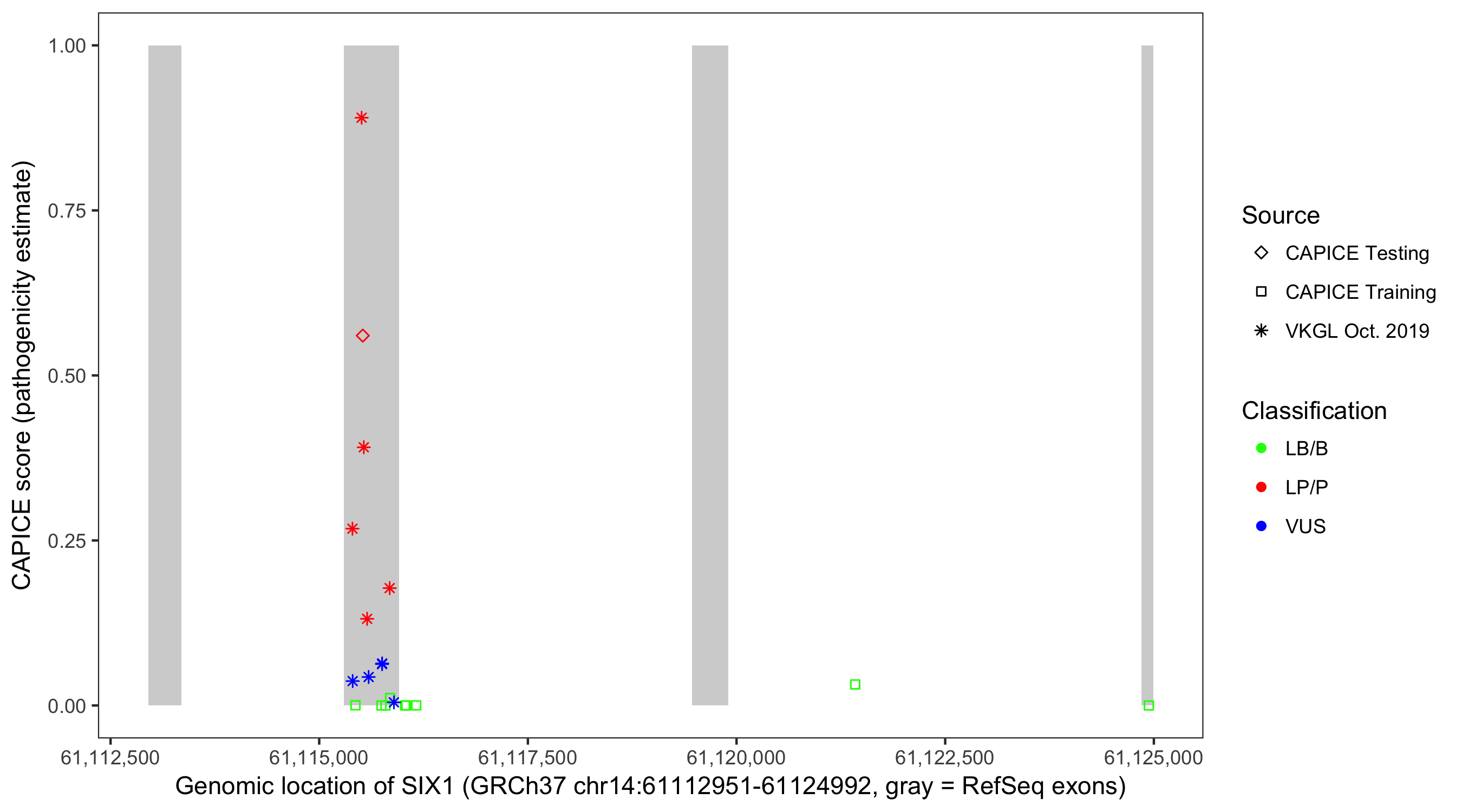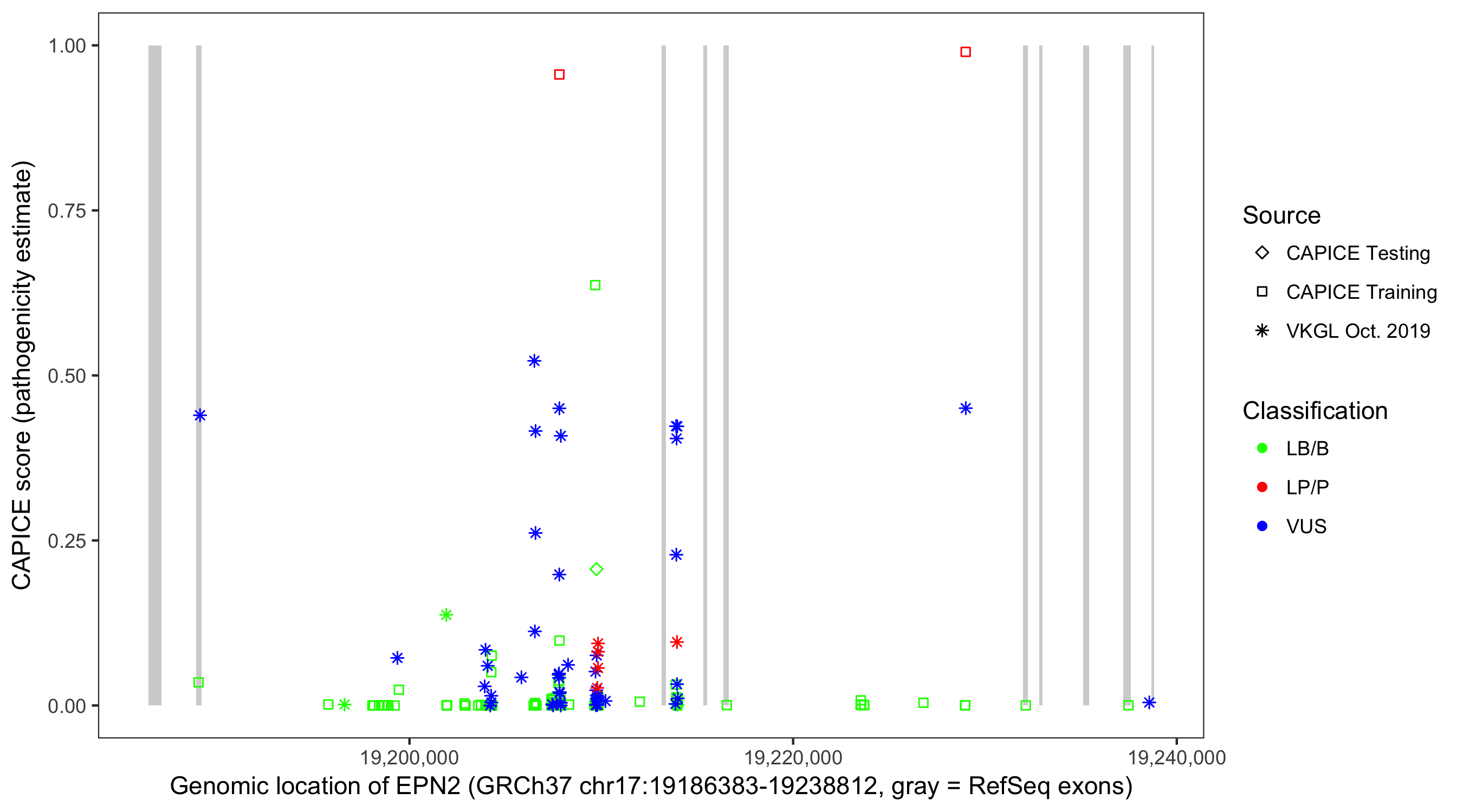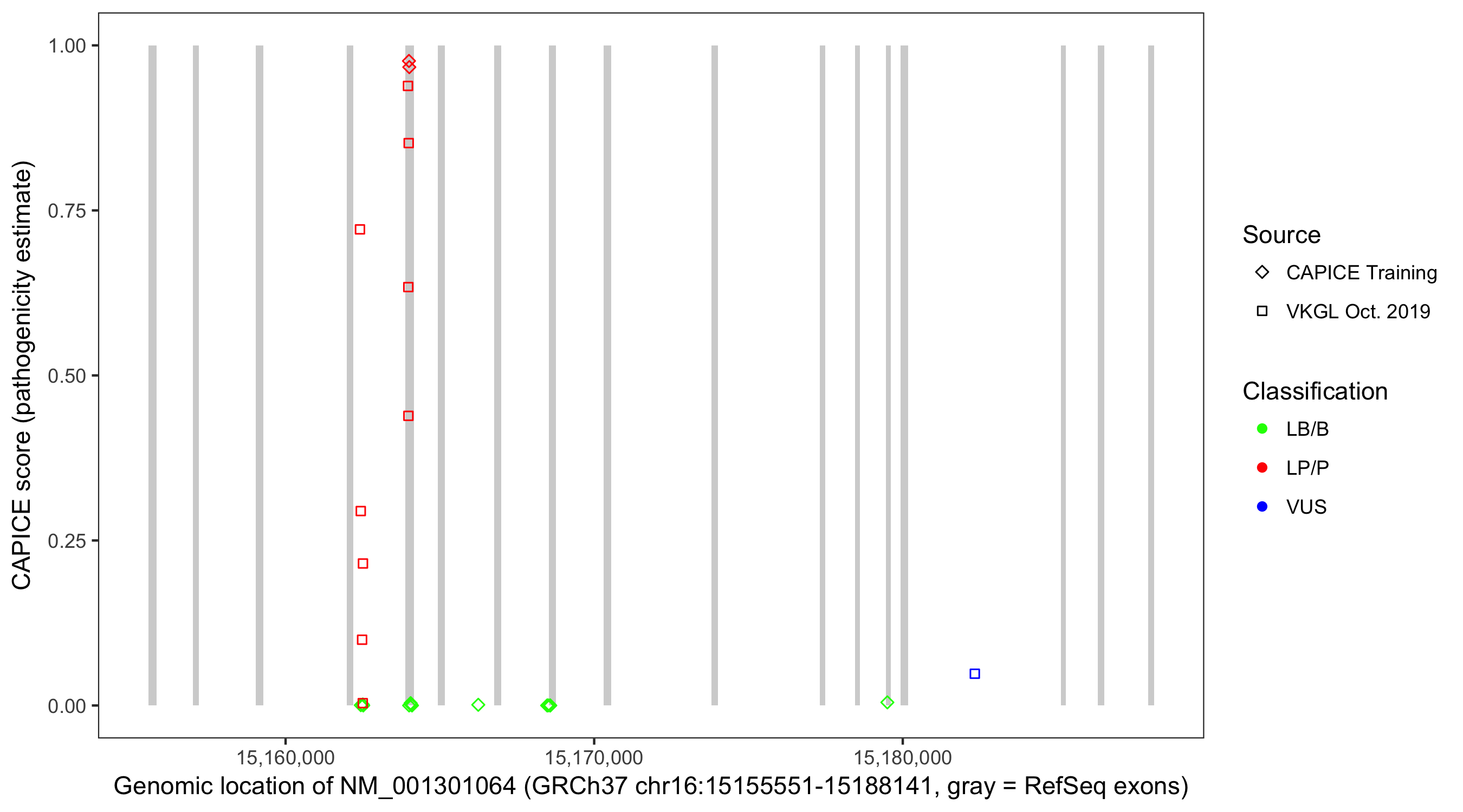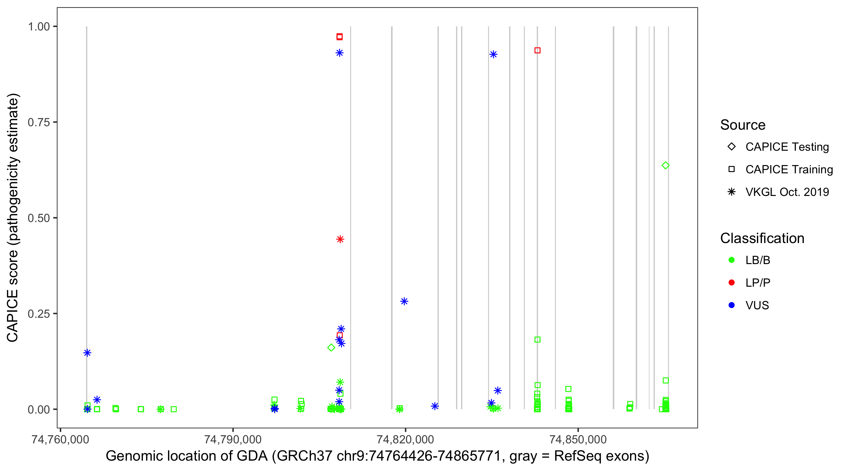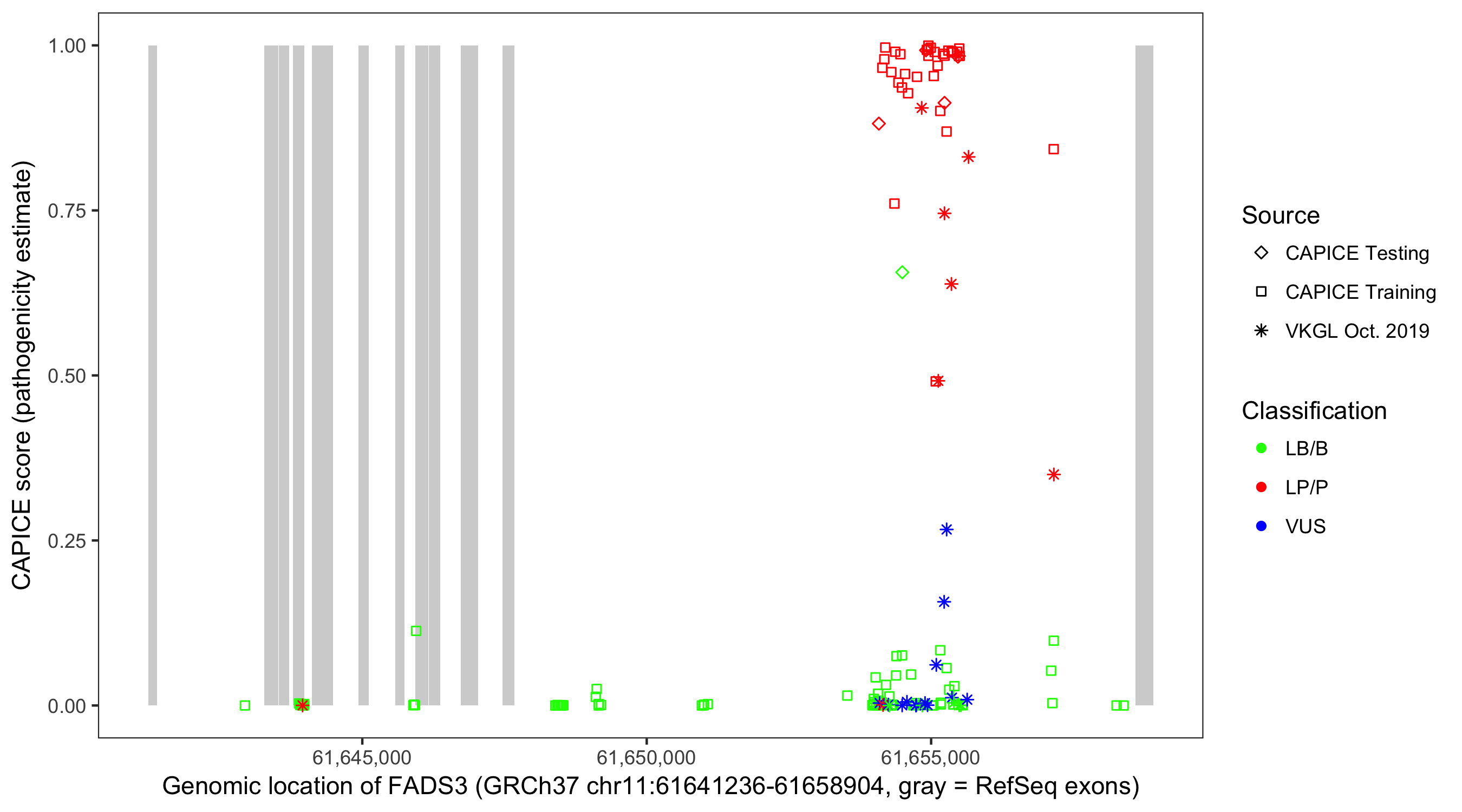 Shown are CAPICE train/test variants plus VKGL Oct 2019.