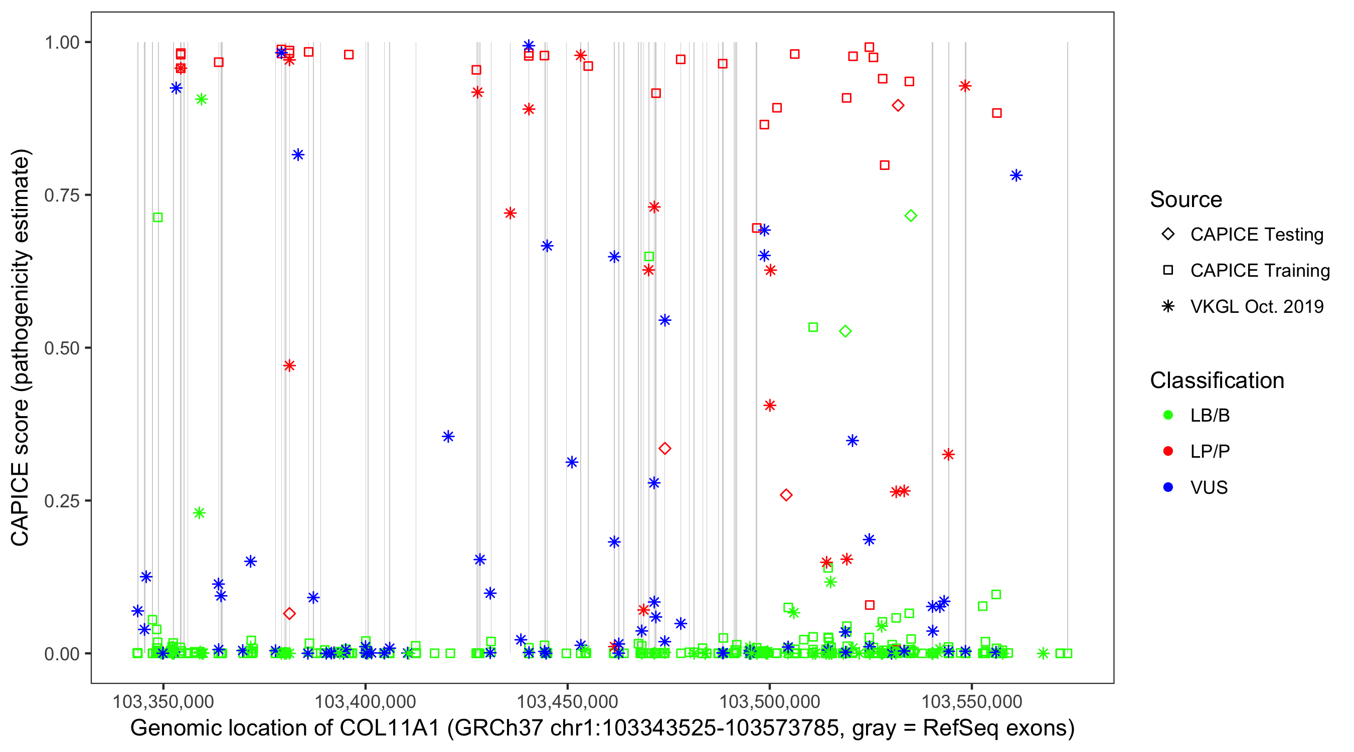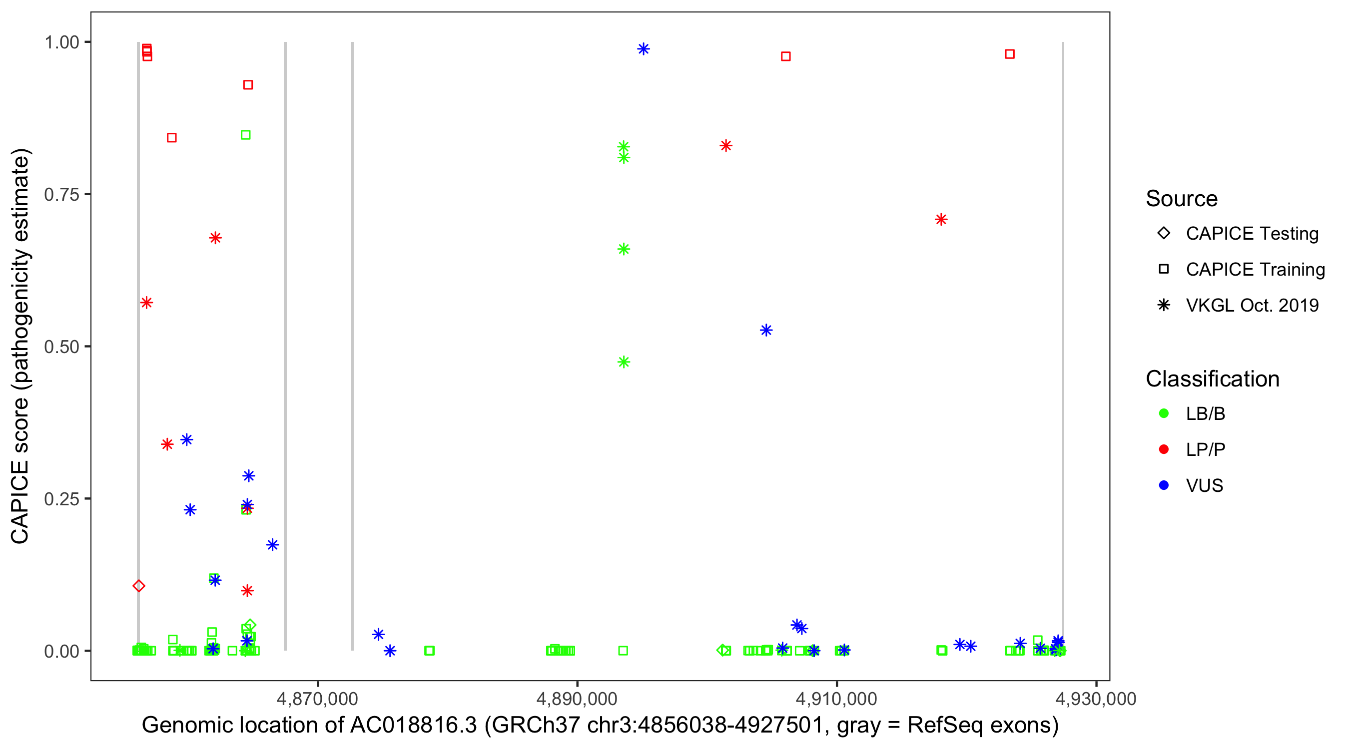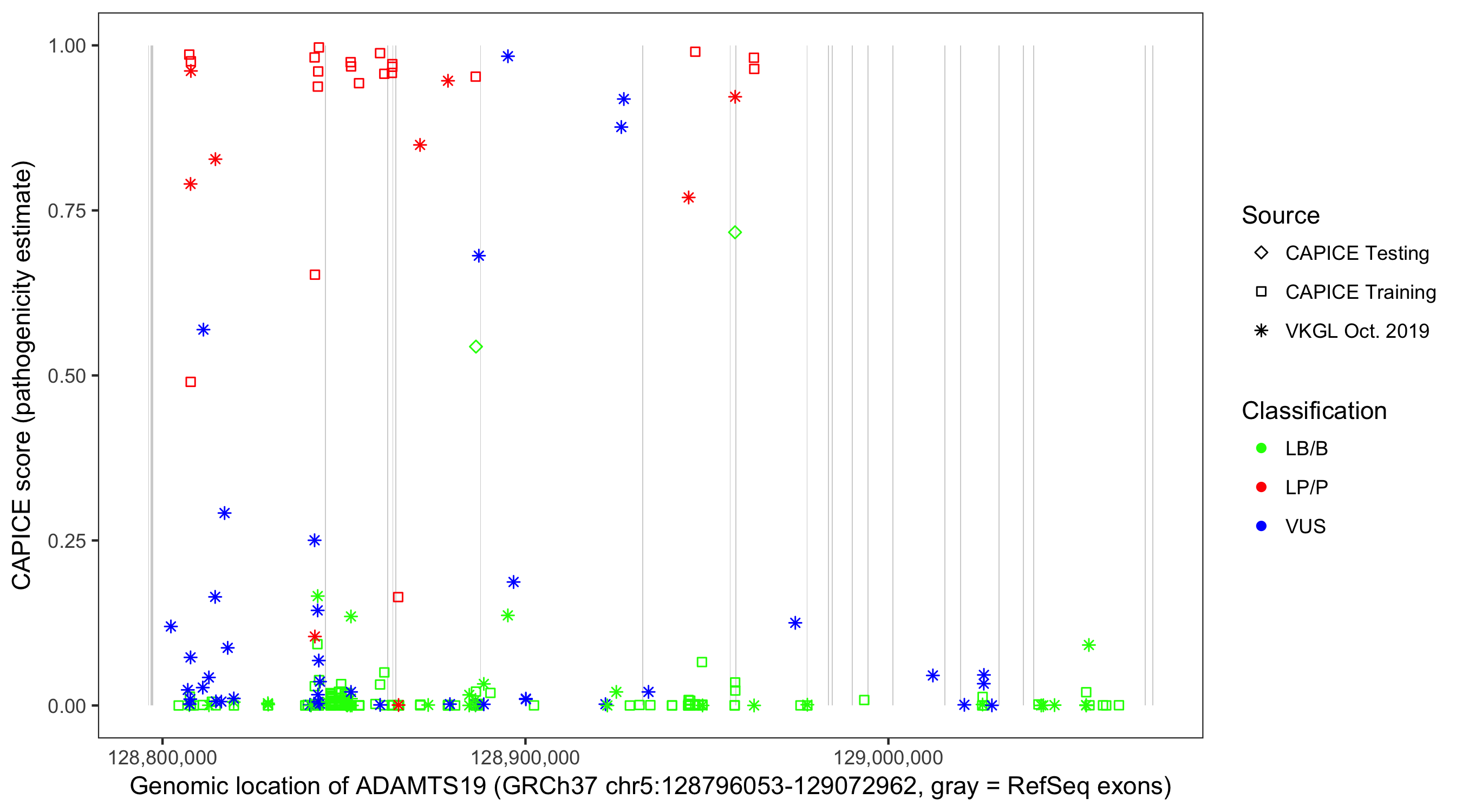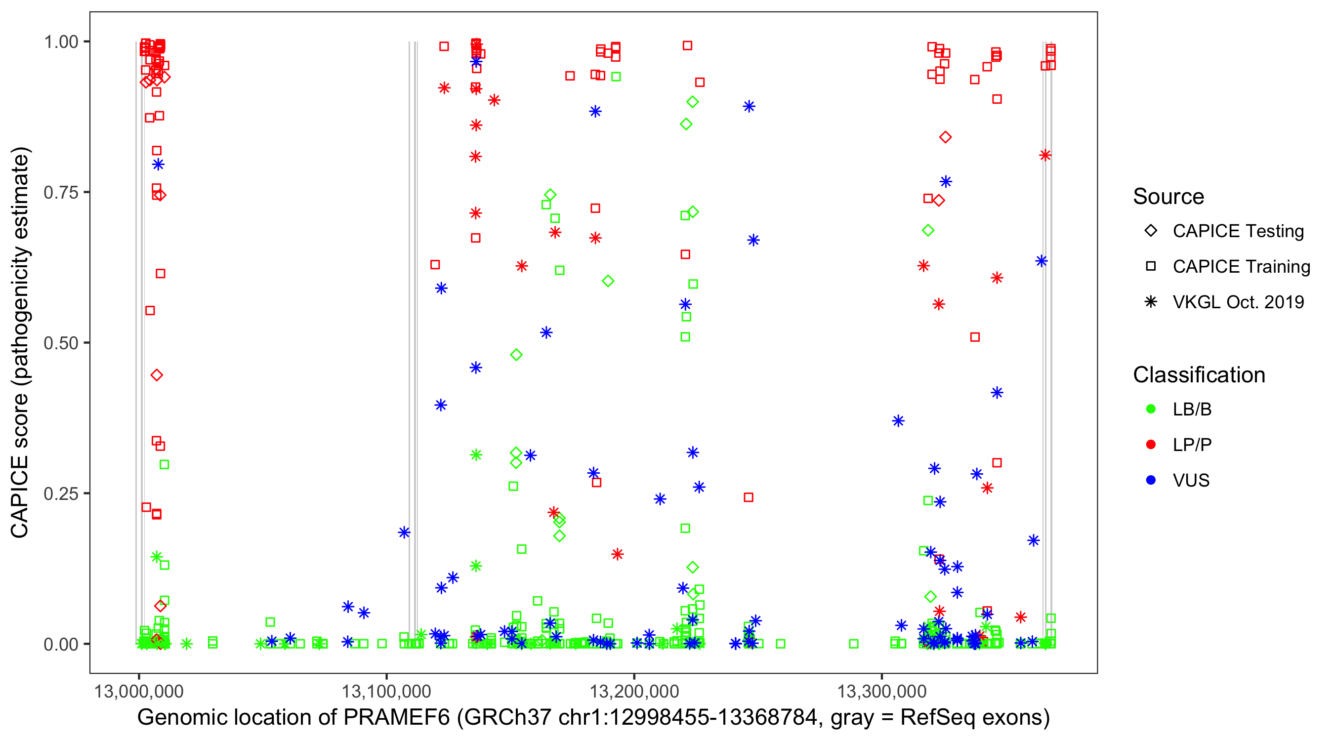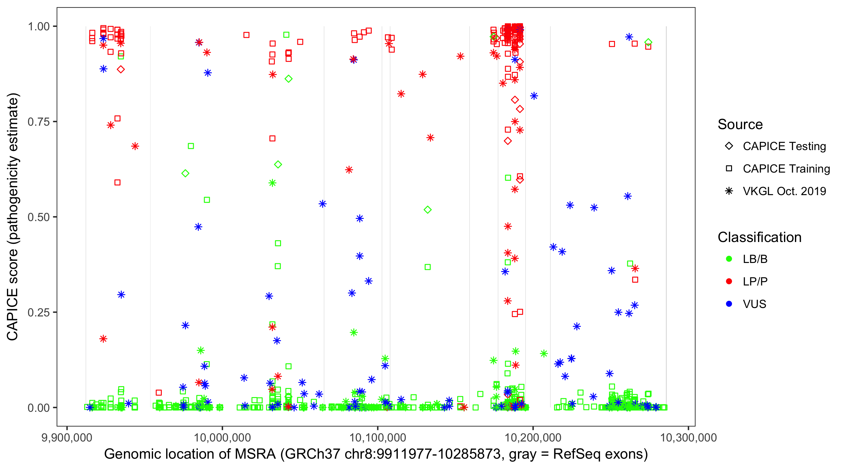 Shown are CAPICE train/test variants plus VKGL Oct 2019.
