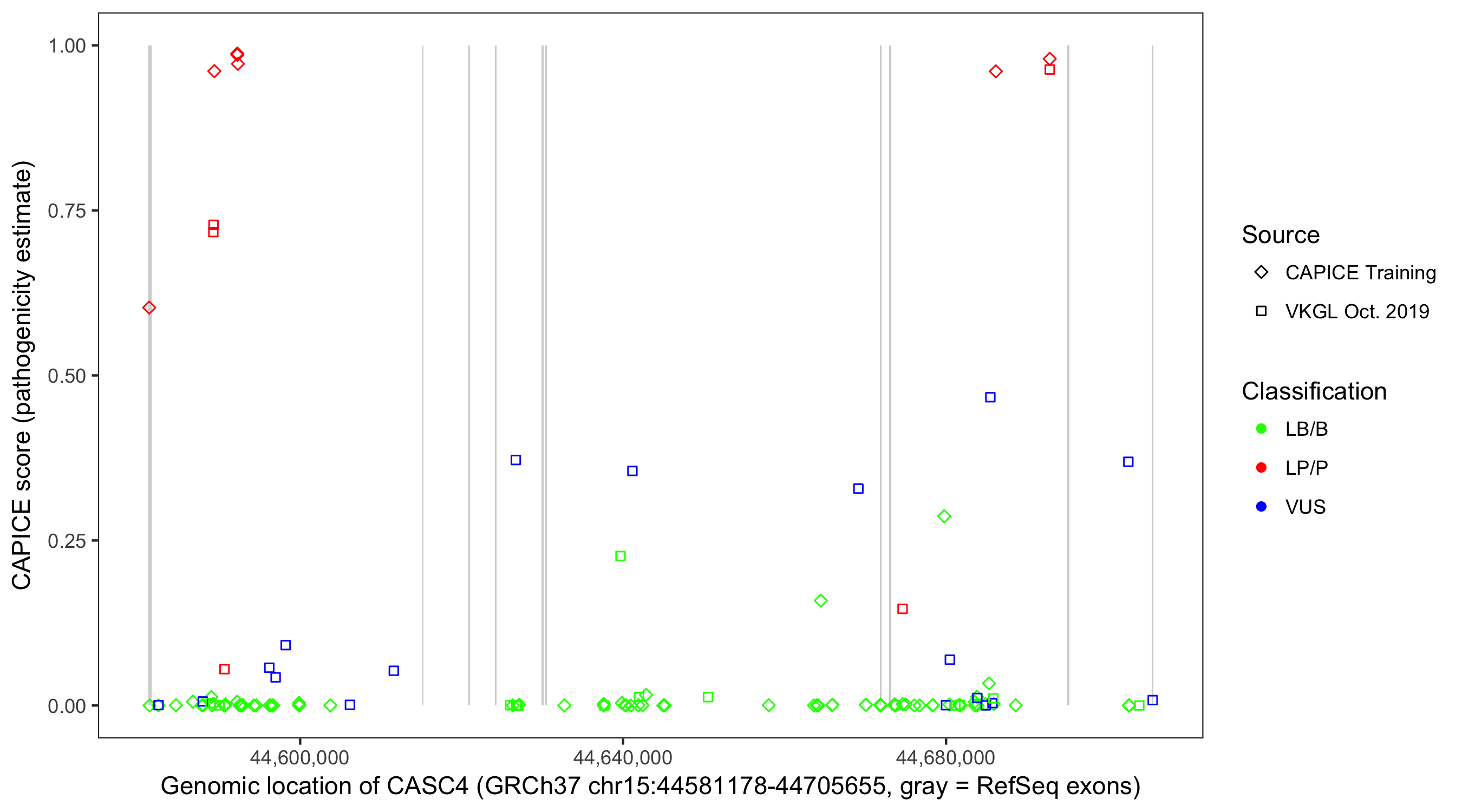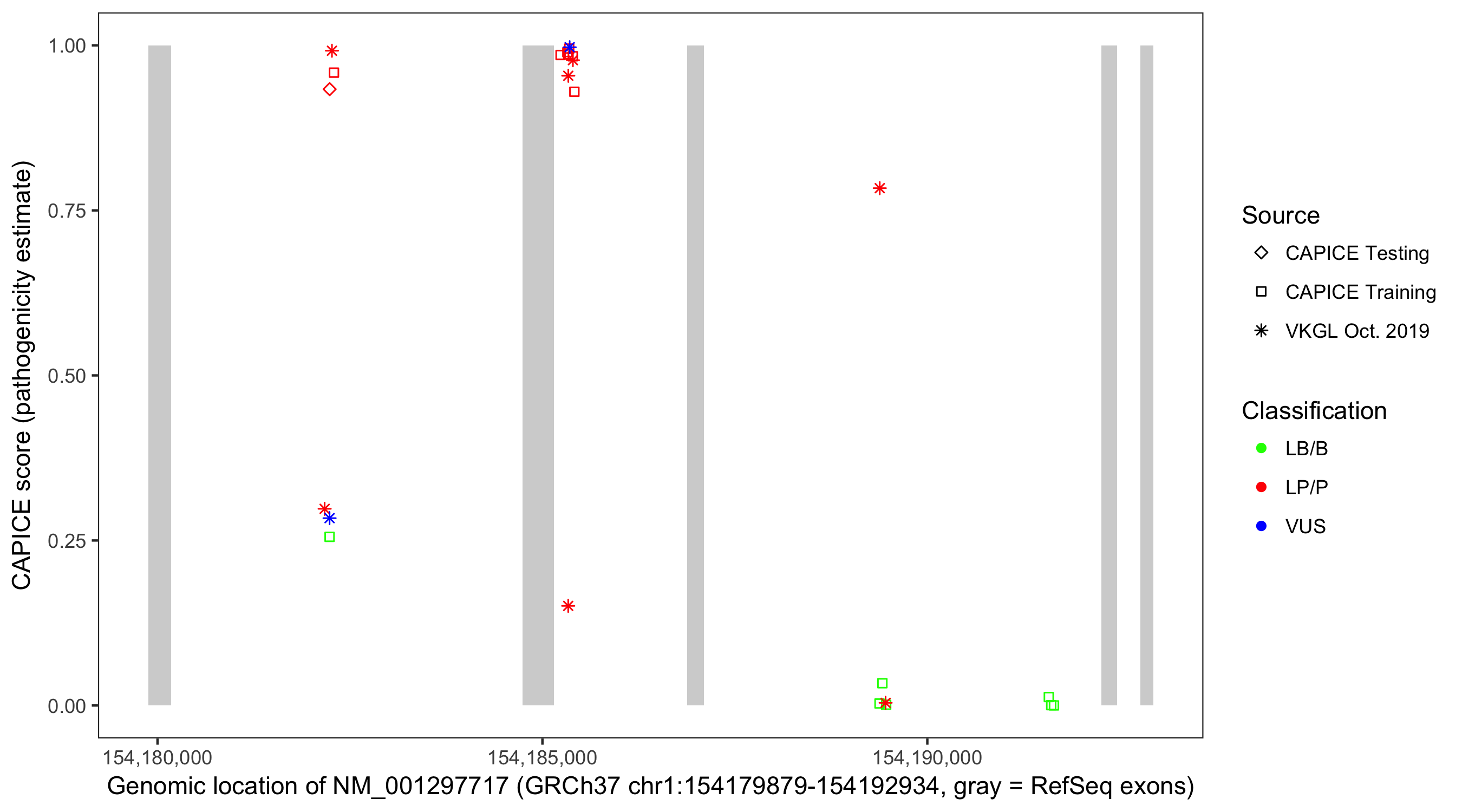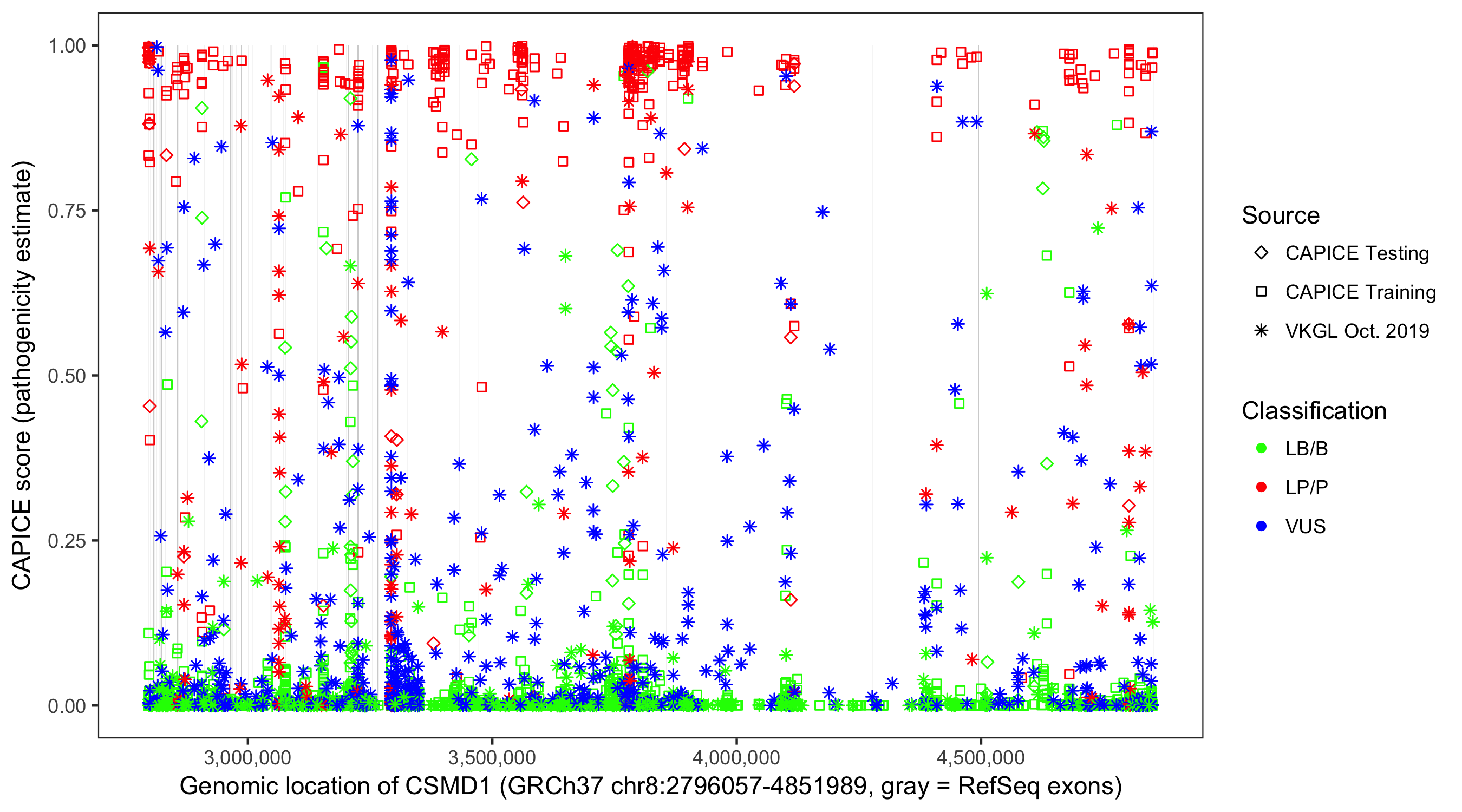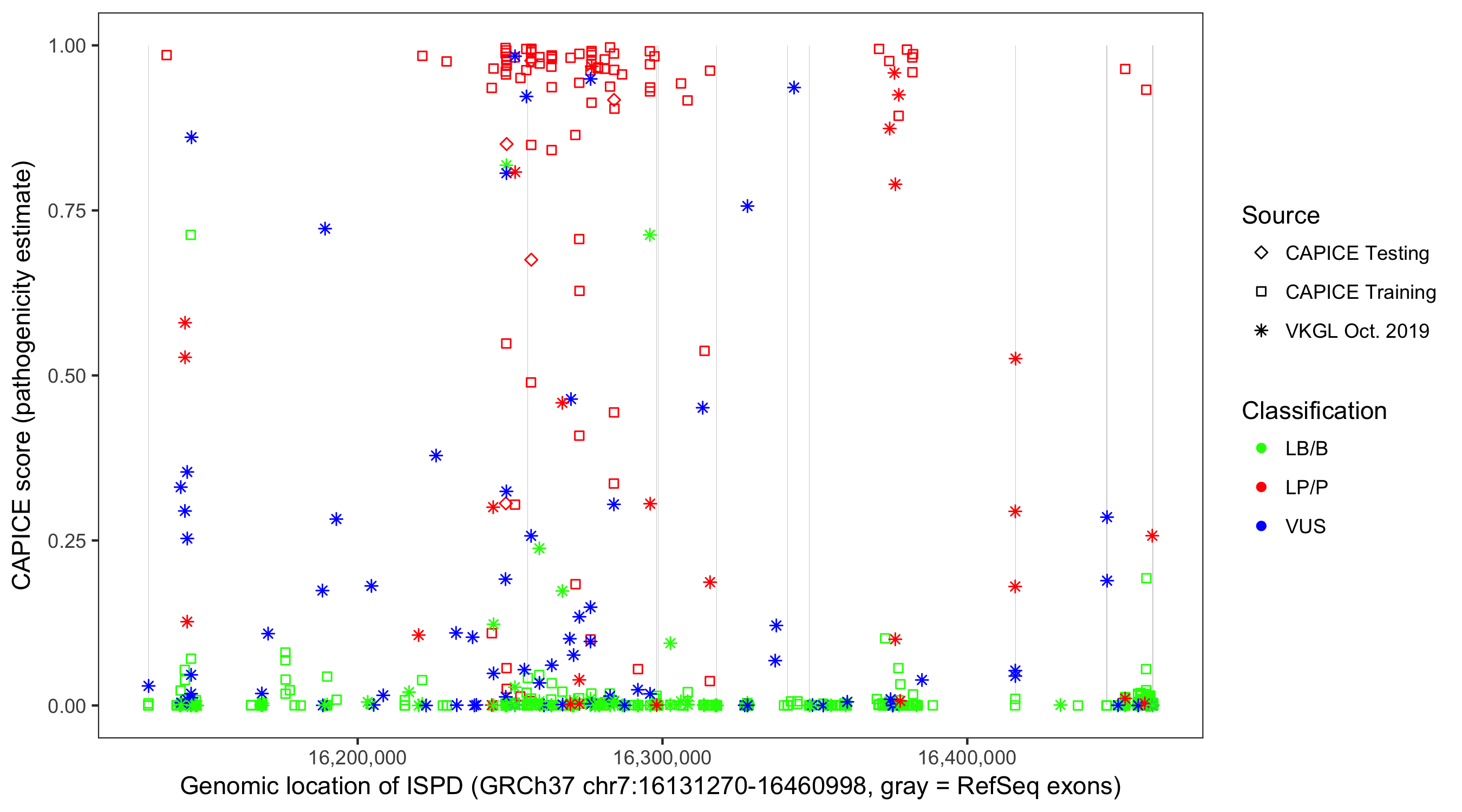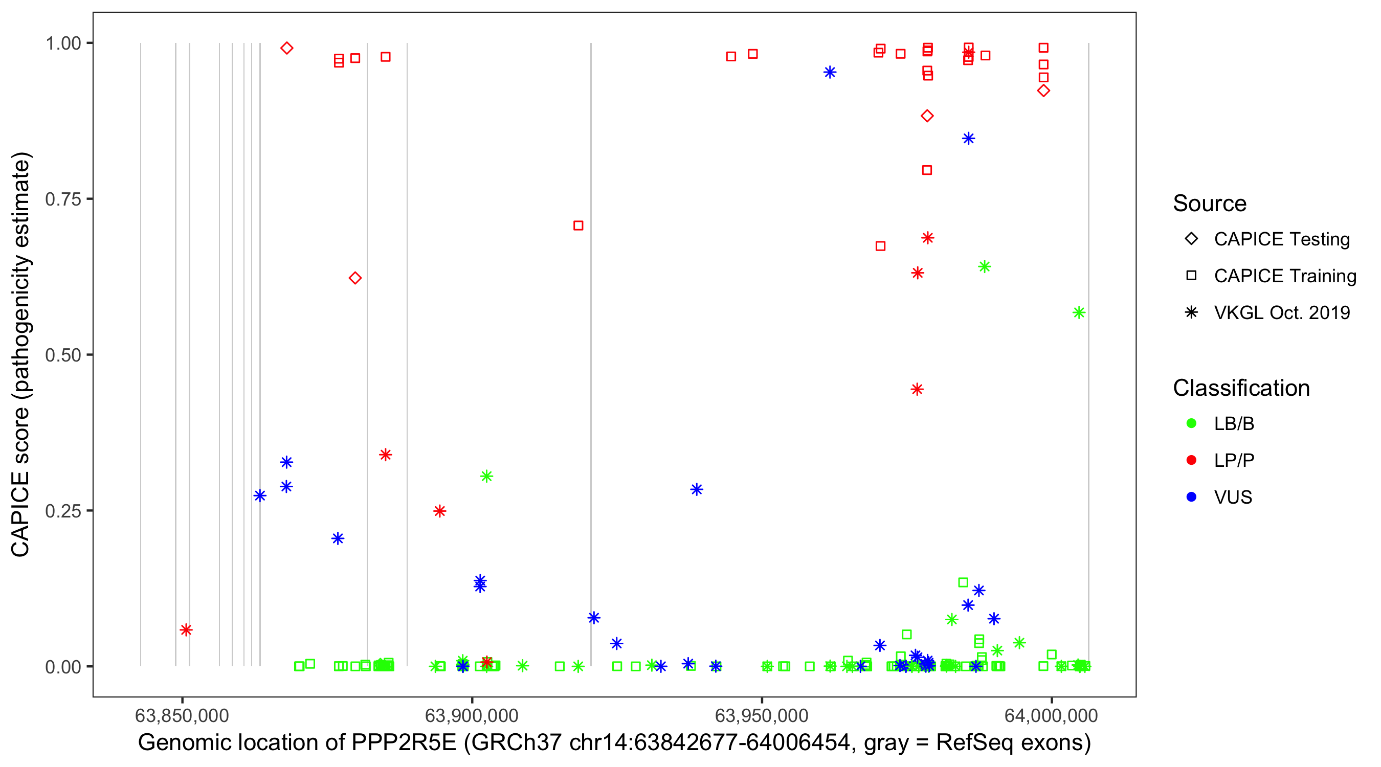Shown are CAPICE train/test variants plus VKGL Oct 2019.