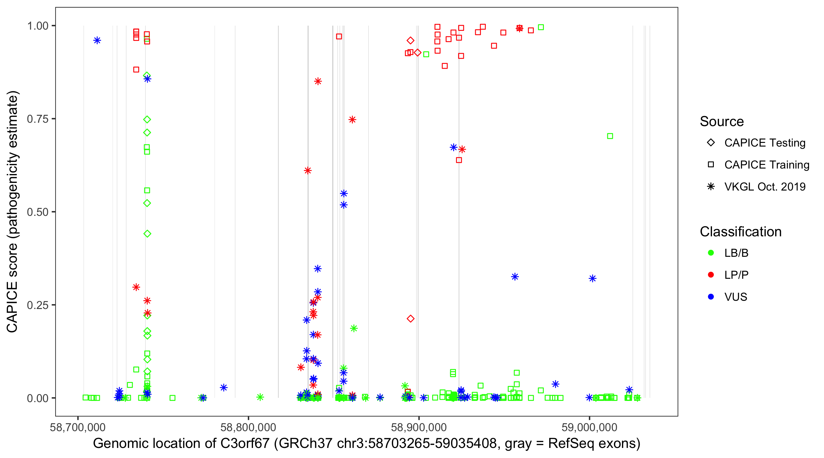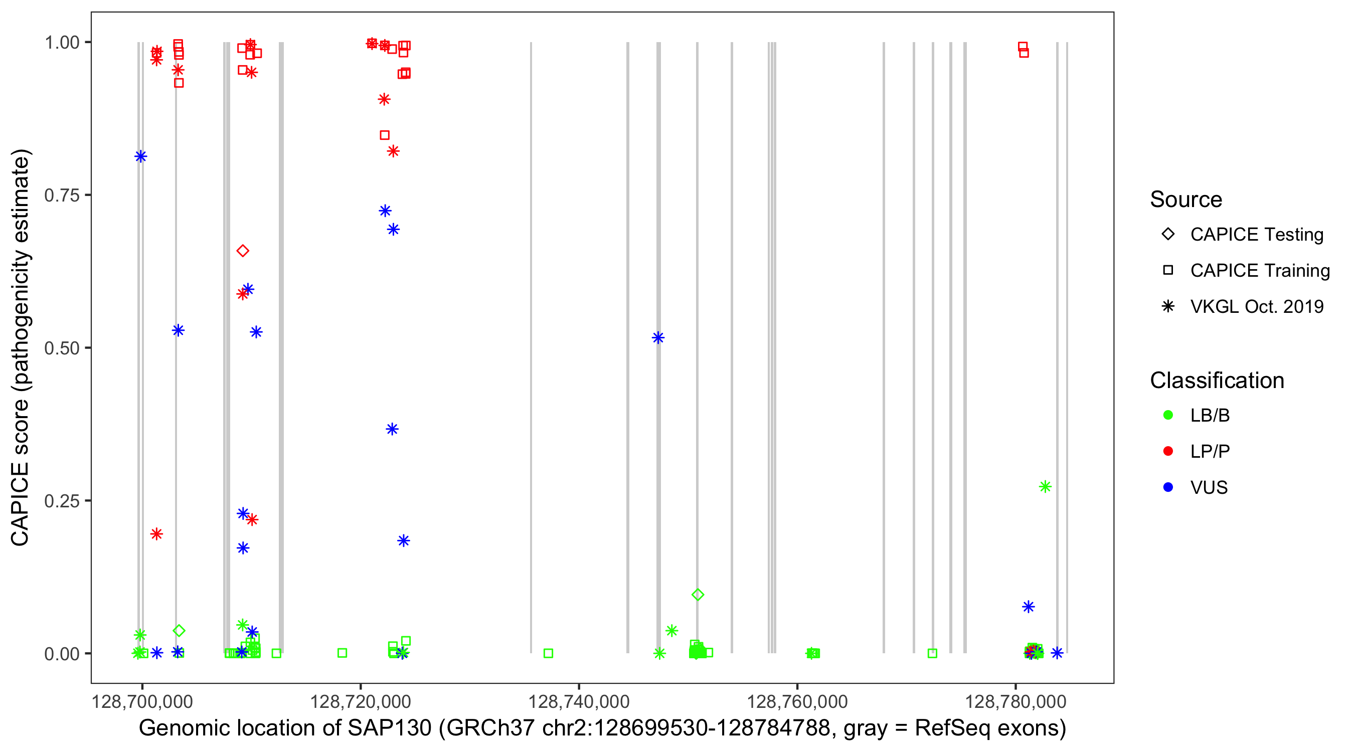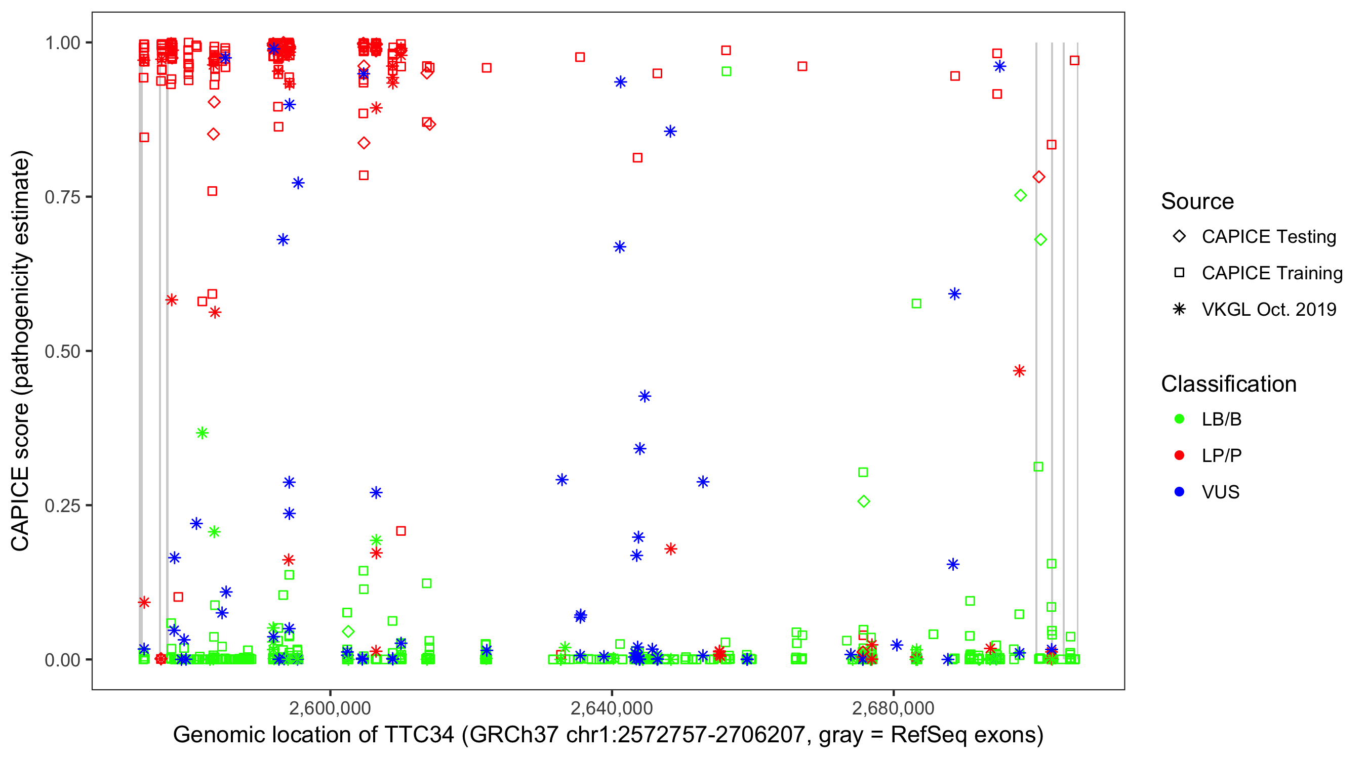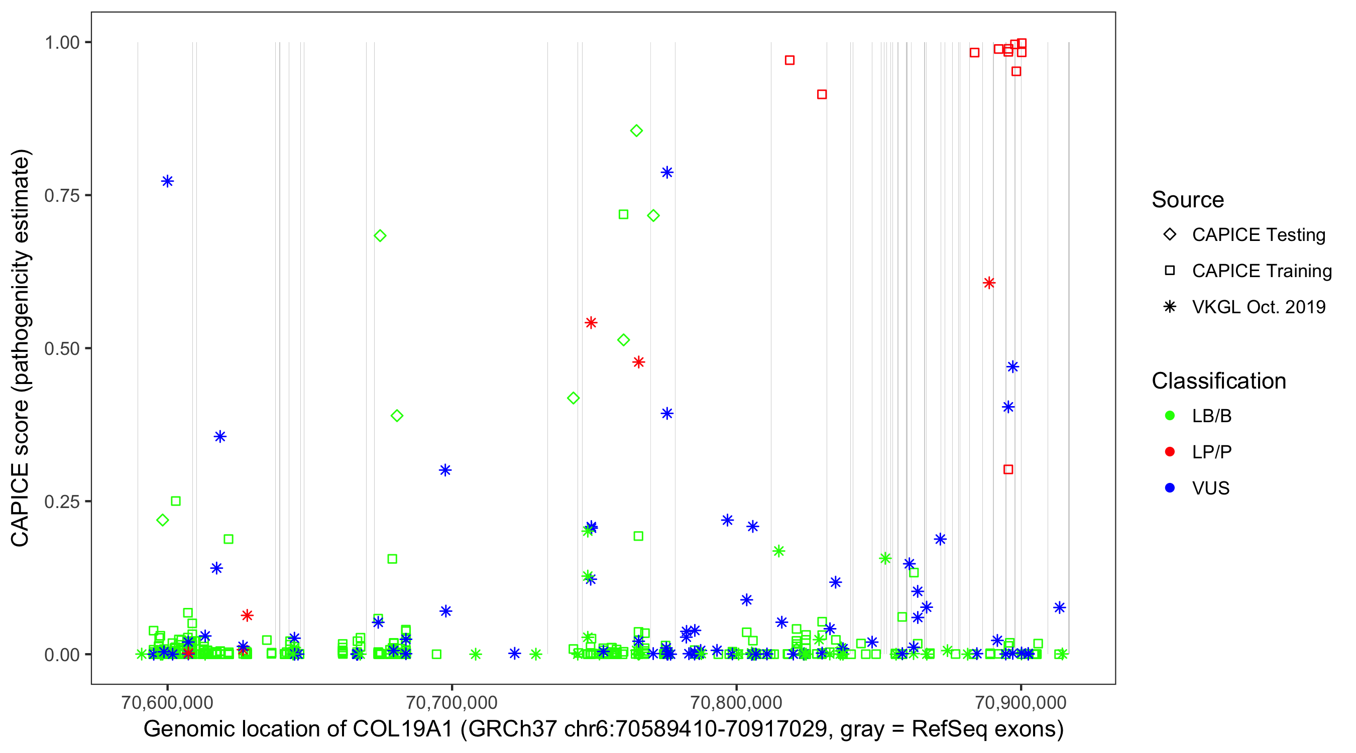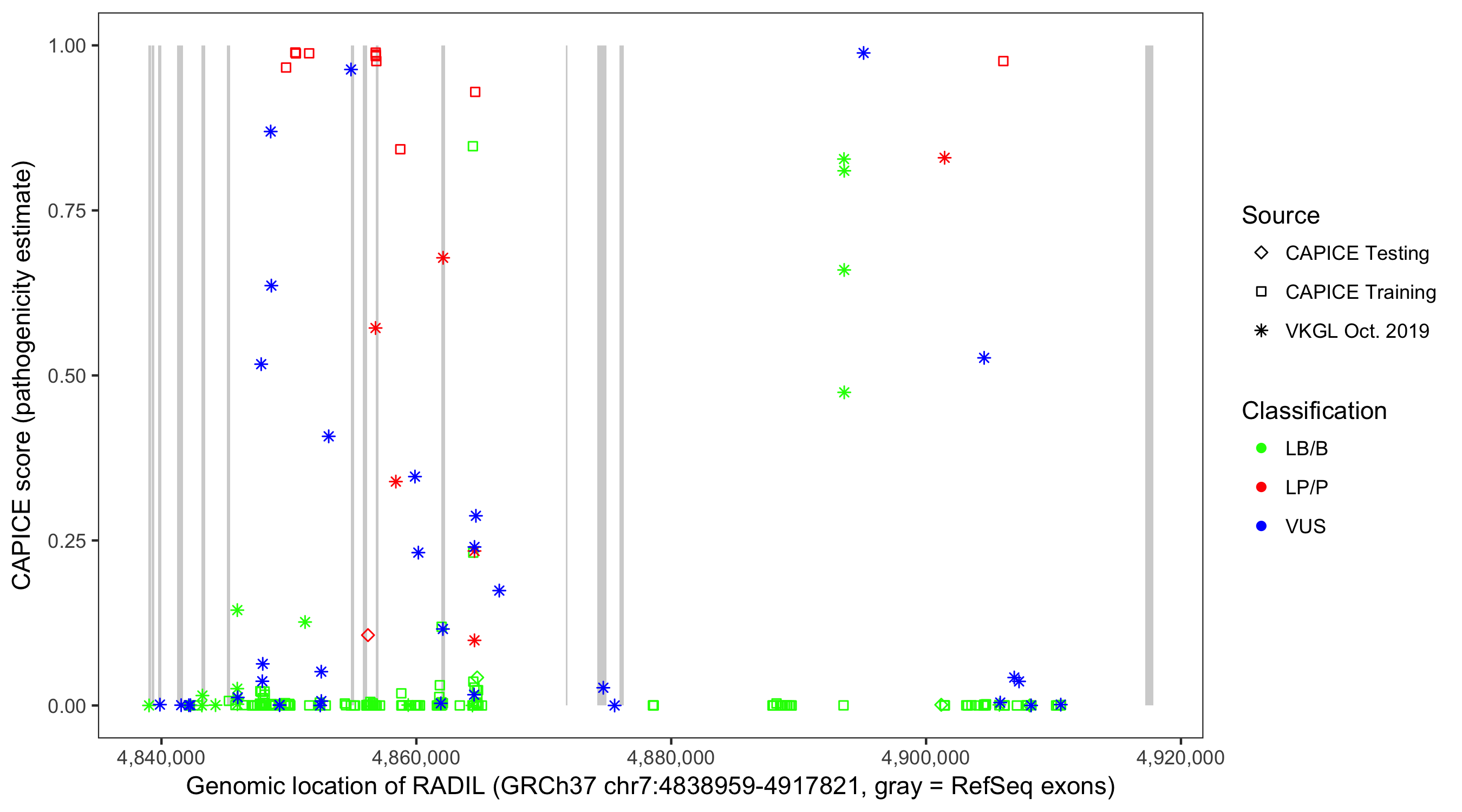 Shown are CAPICE train/test variants plus VKGL Oct 2019.