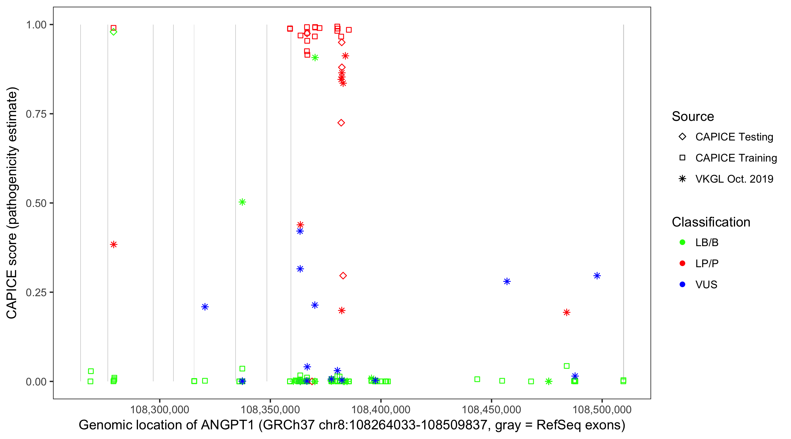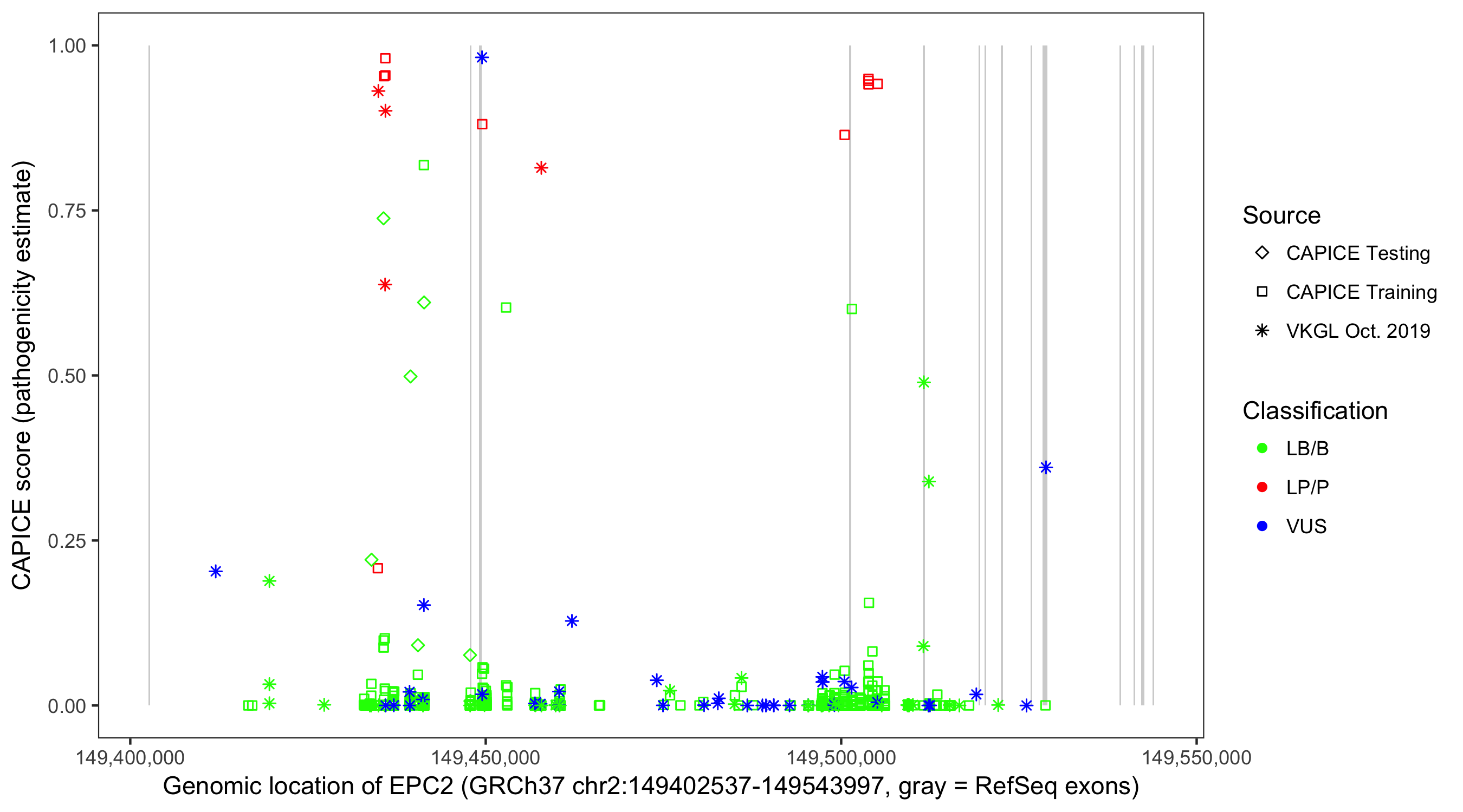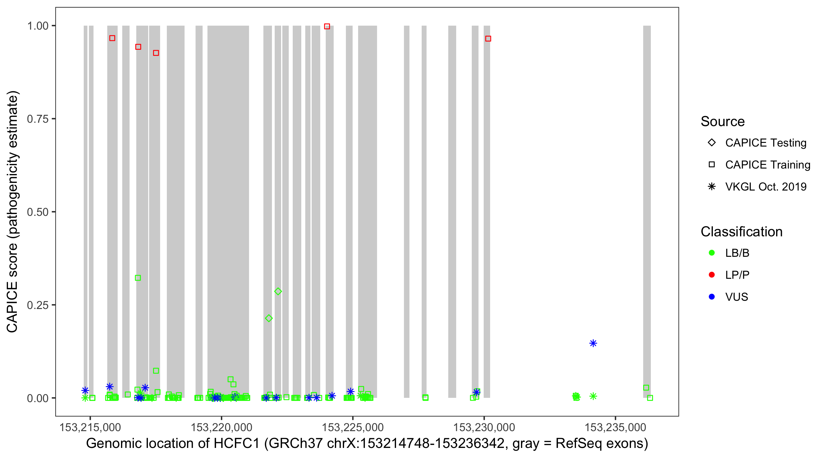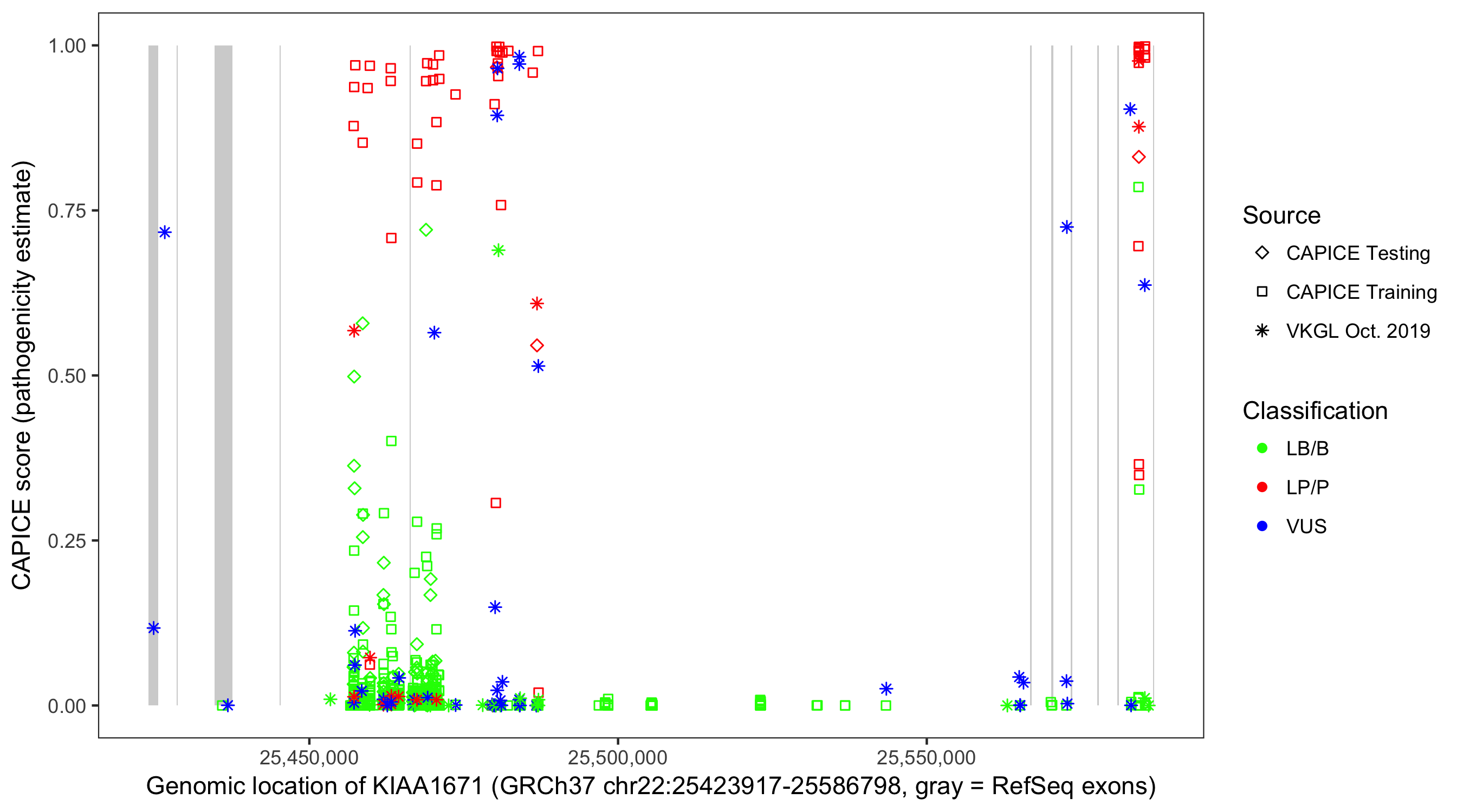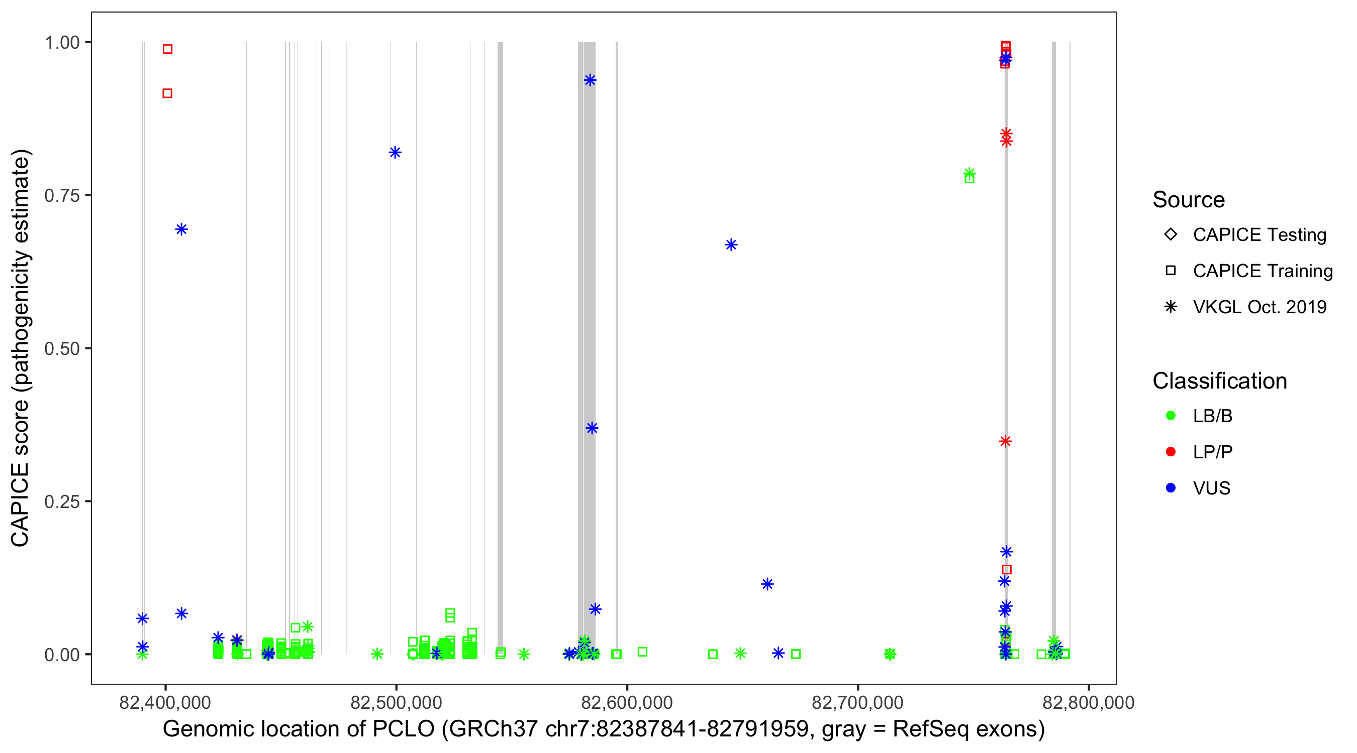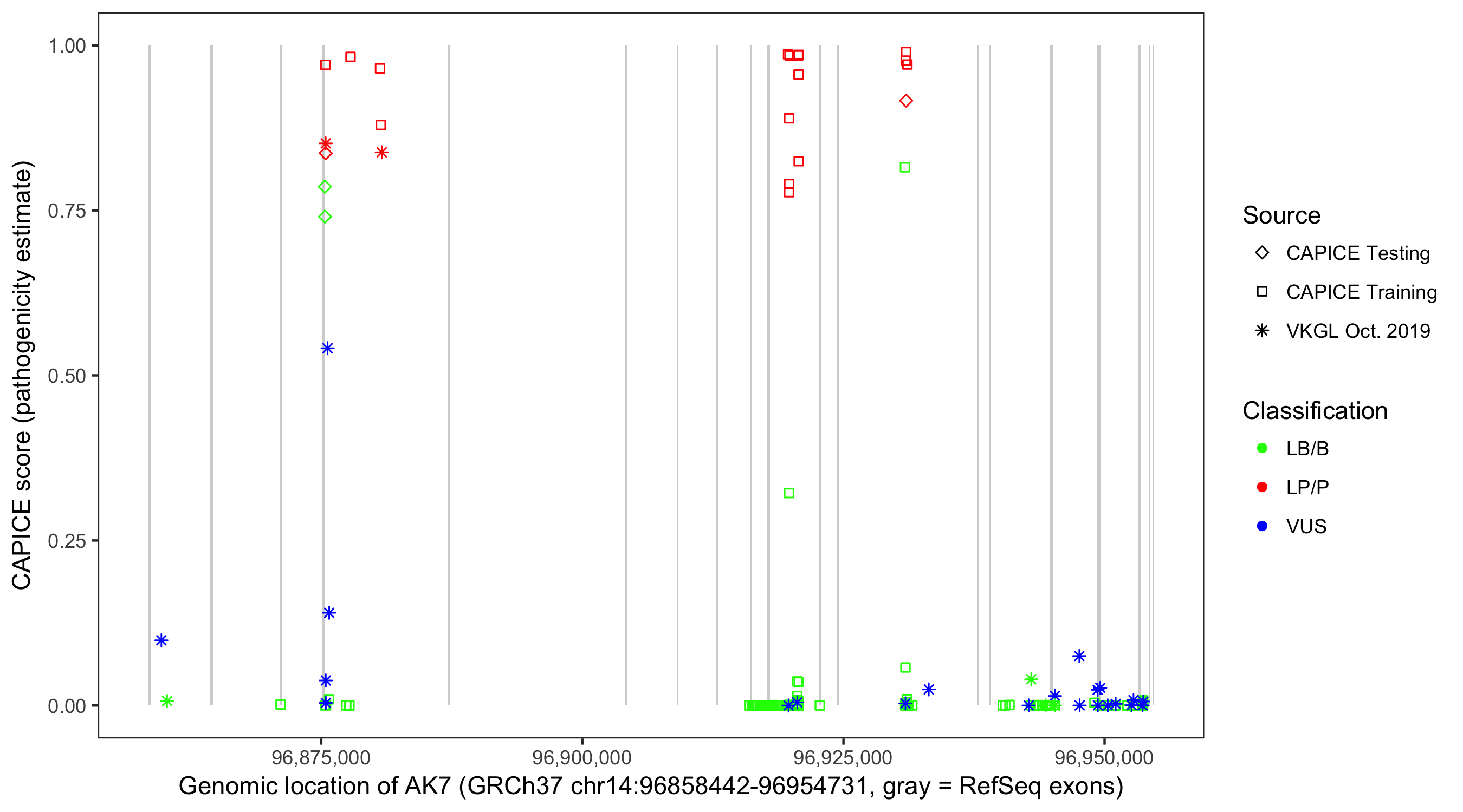 Shown are CAPICE train/test variants plus VKGL Oct 2019.