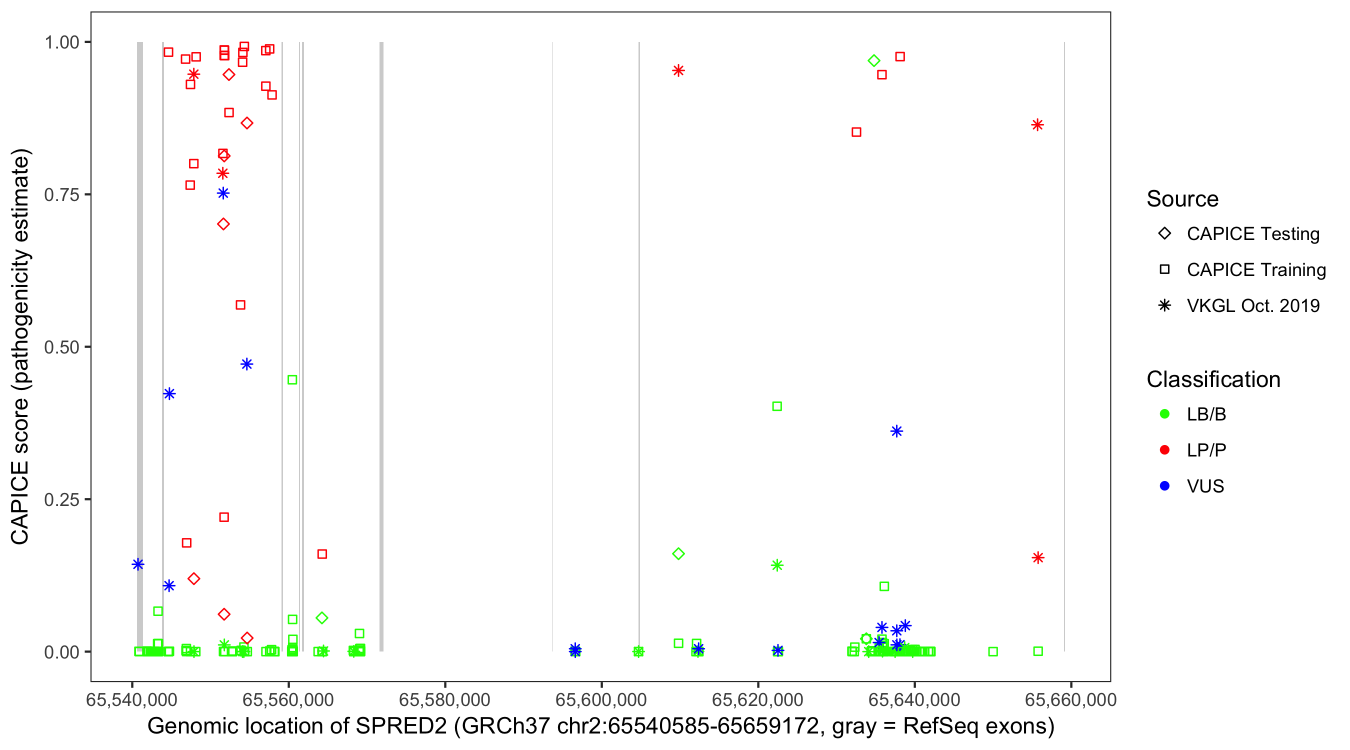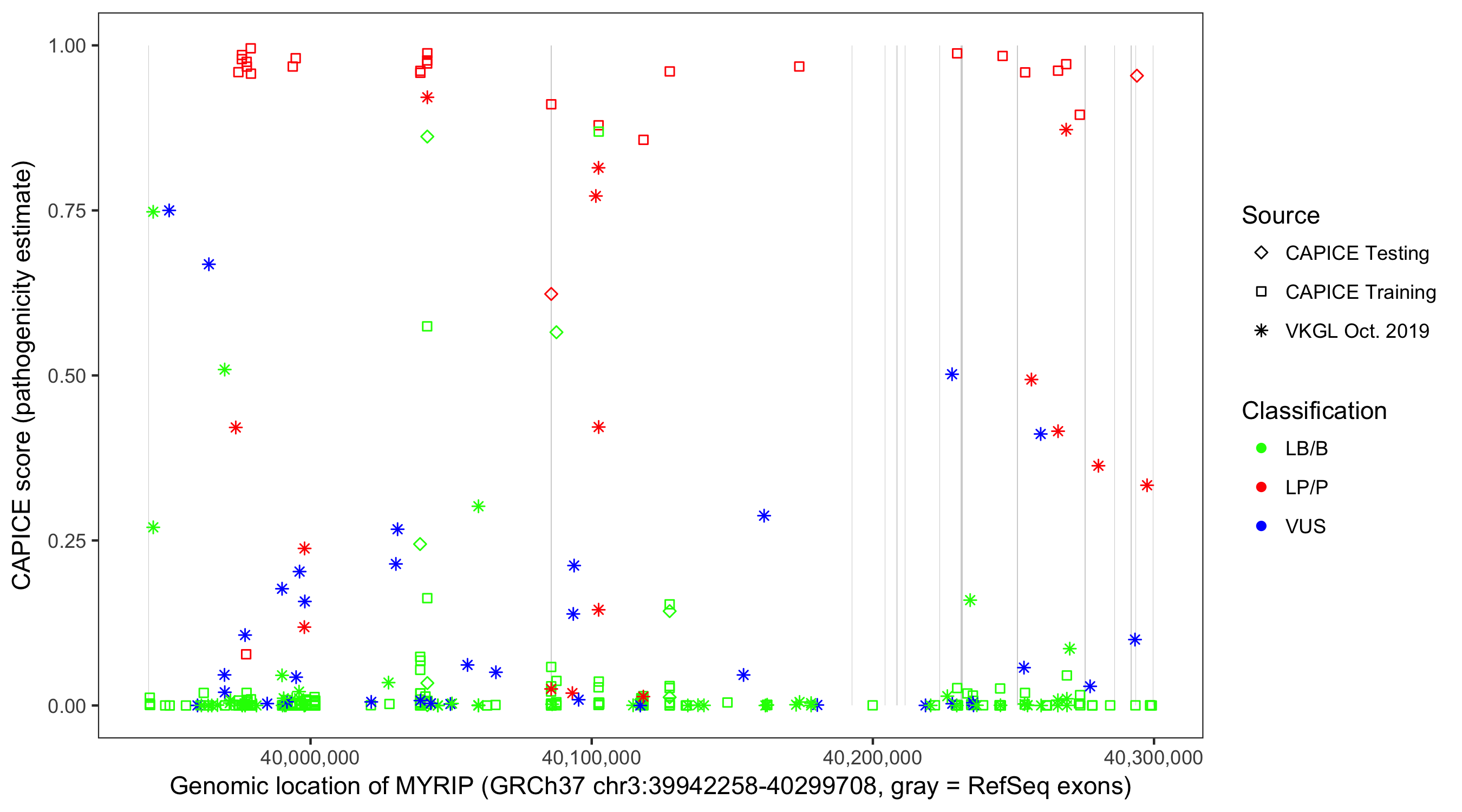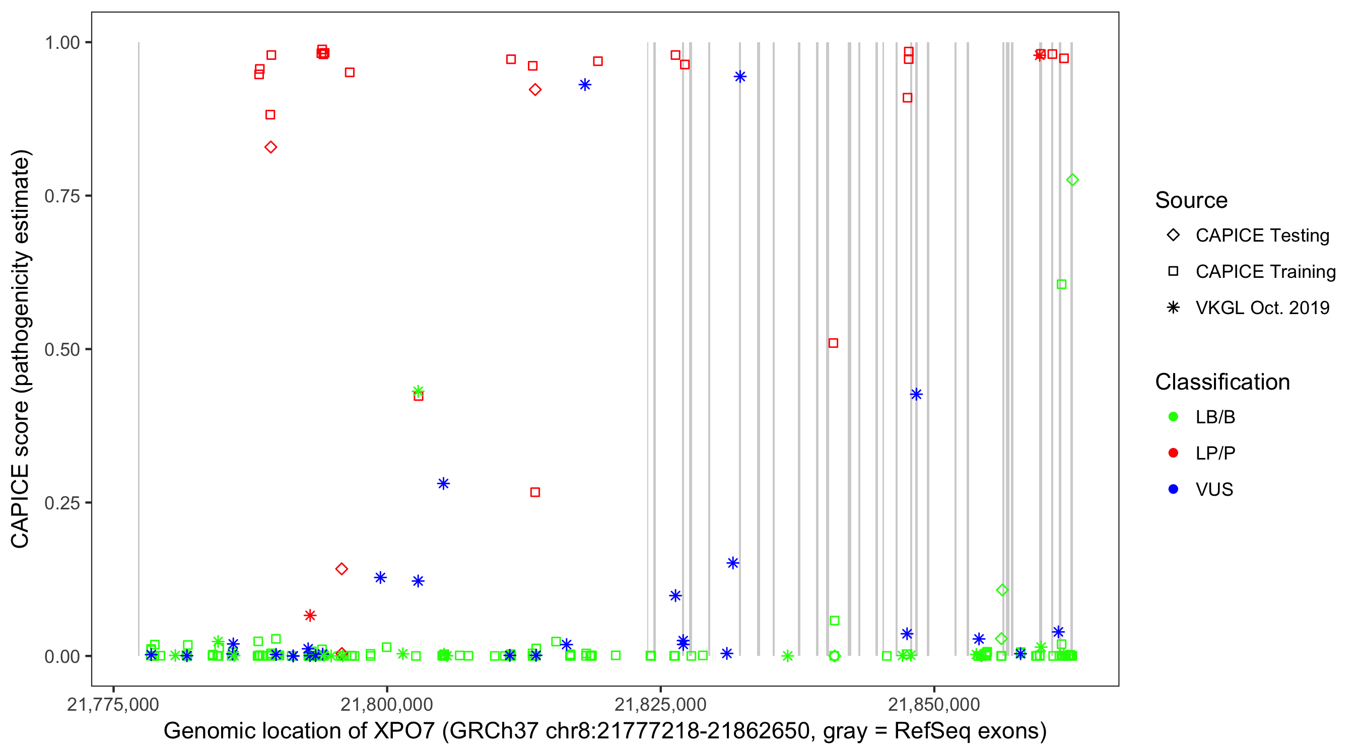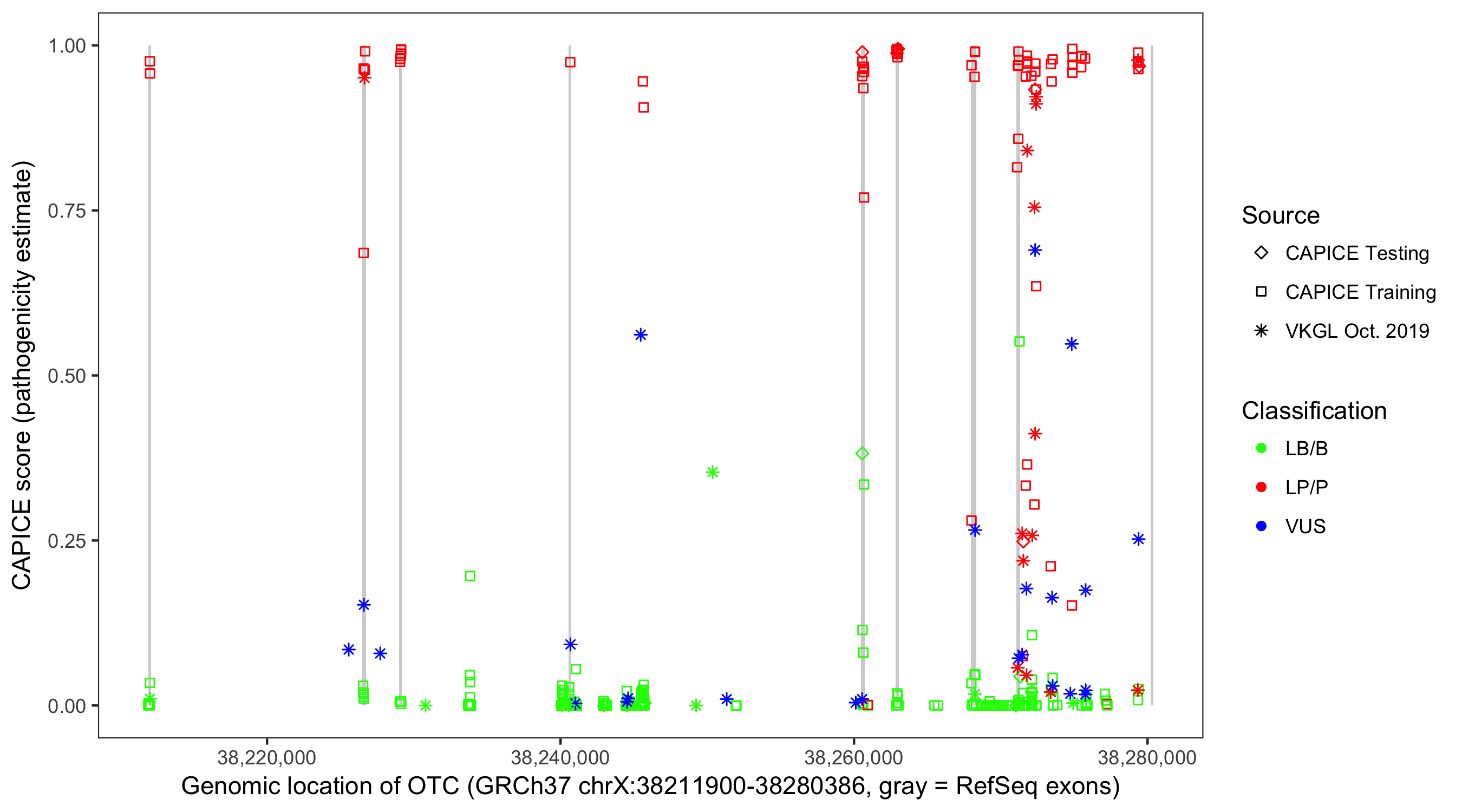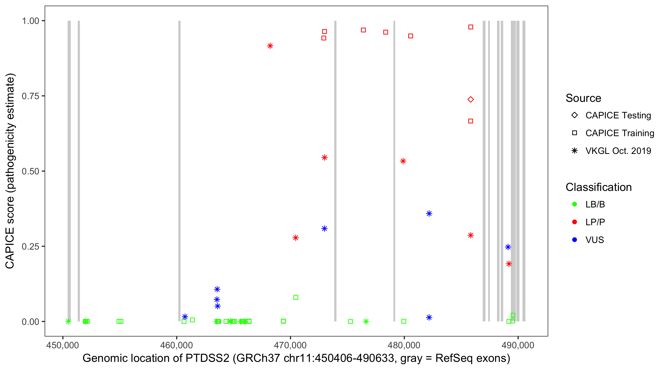 Shown are CAPICE train/test variants plus VKGL Oct 2019.