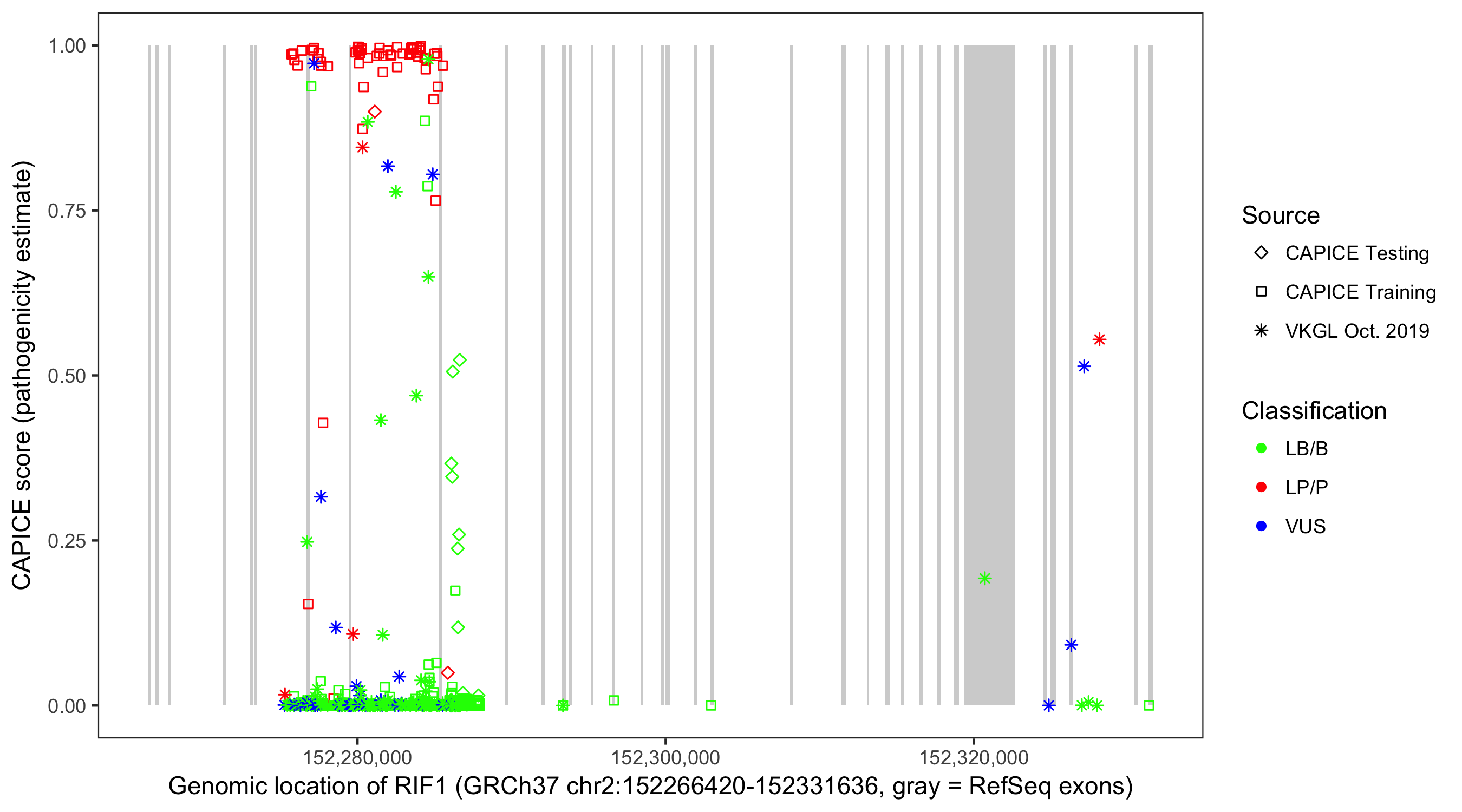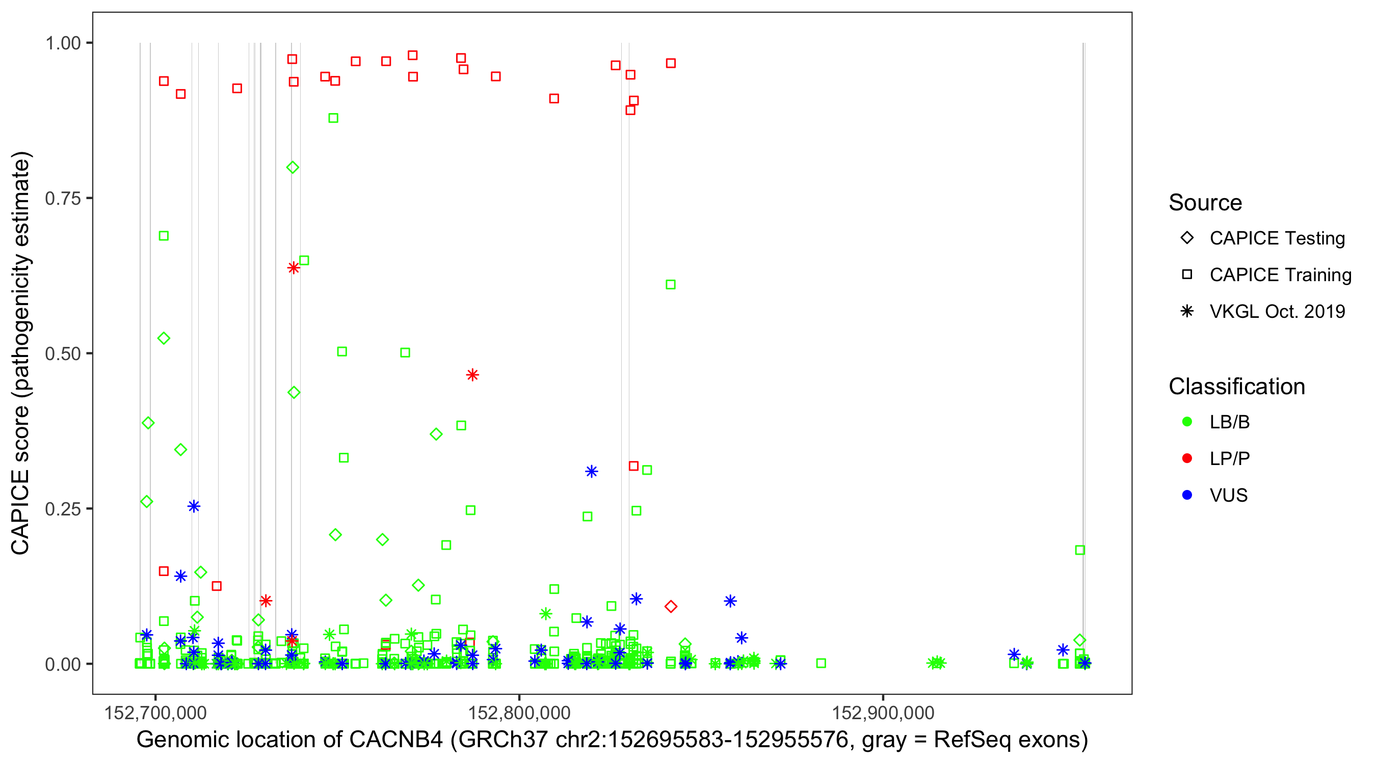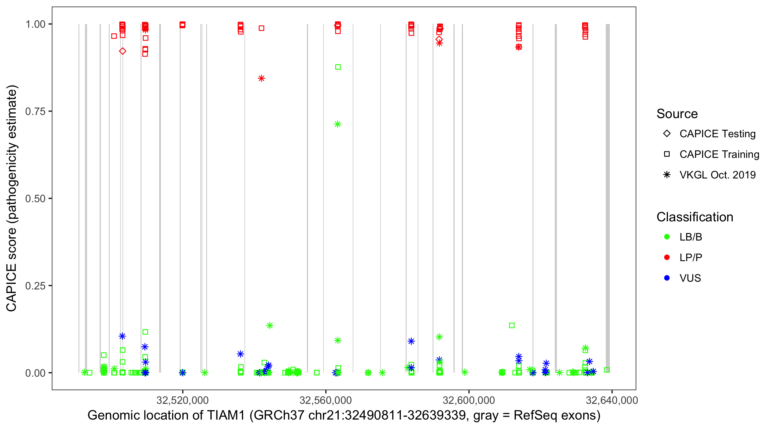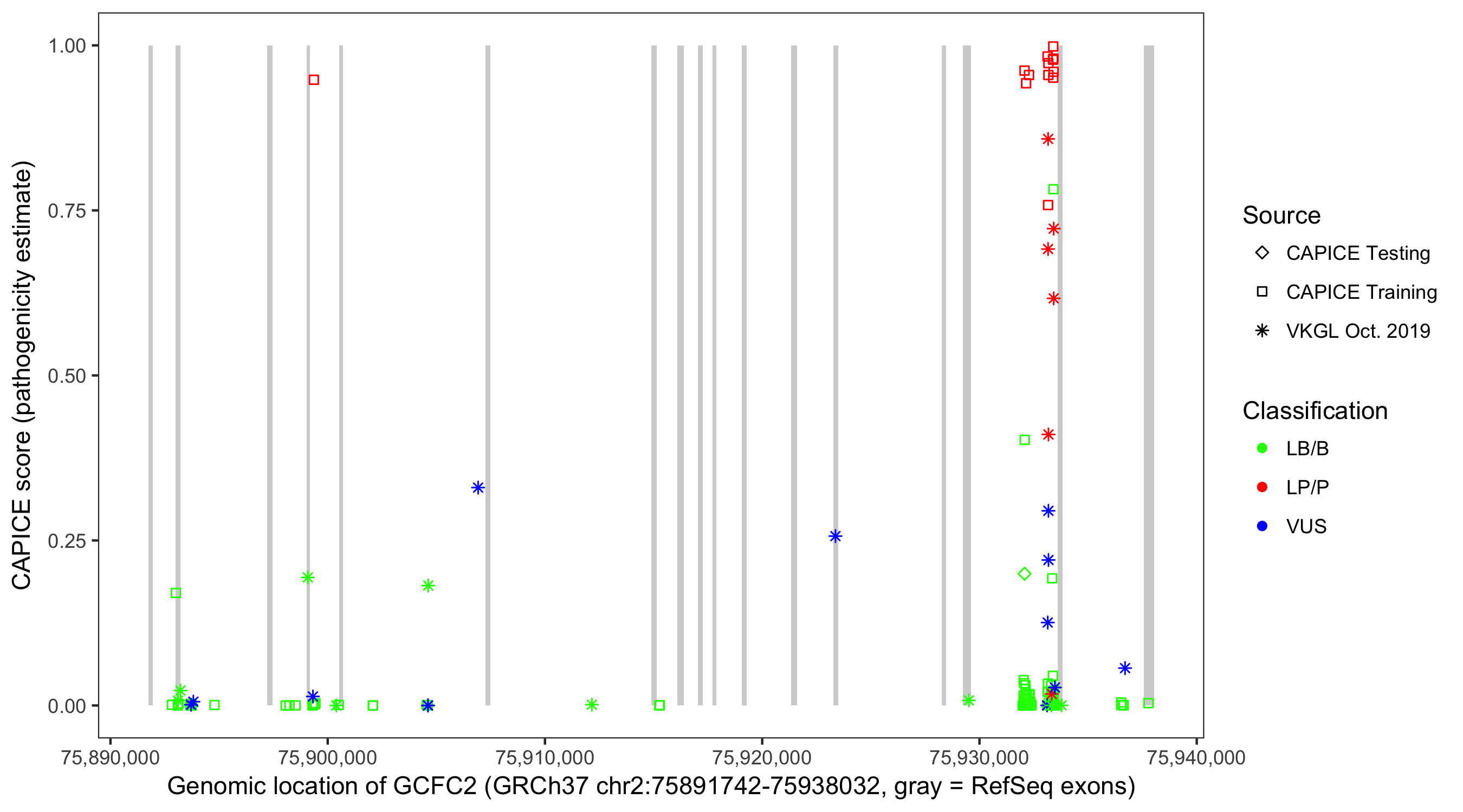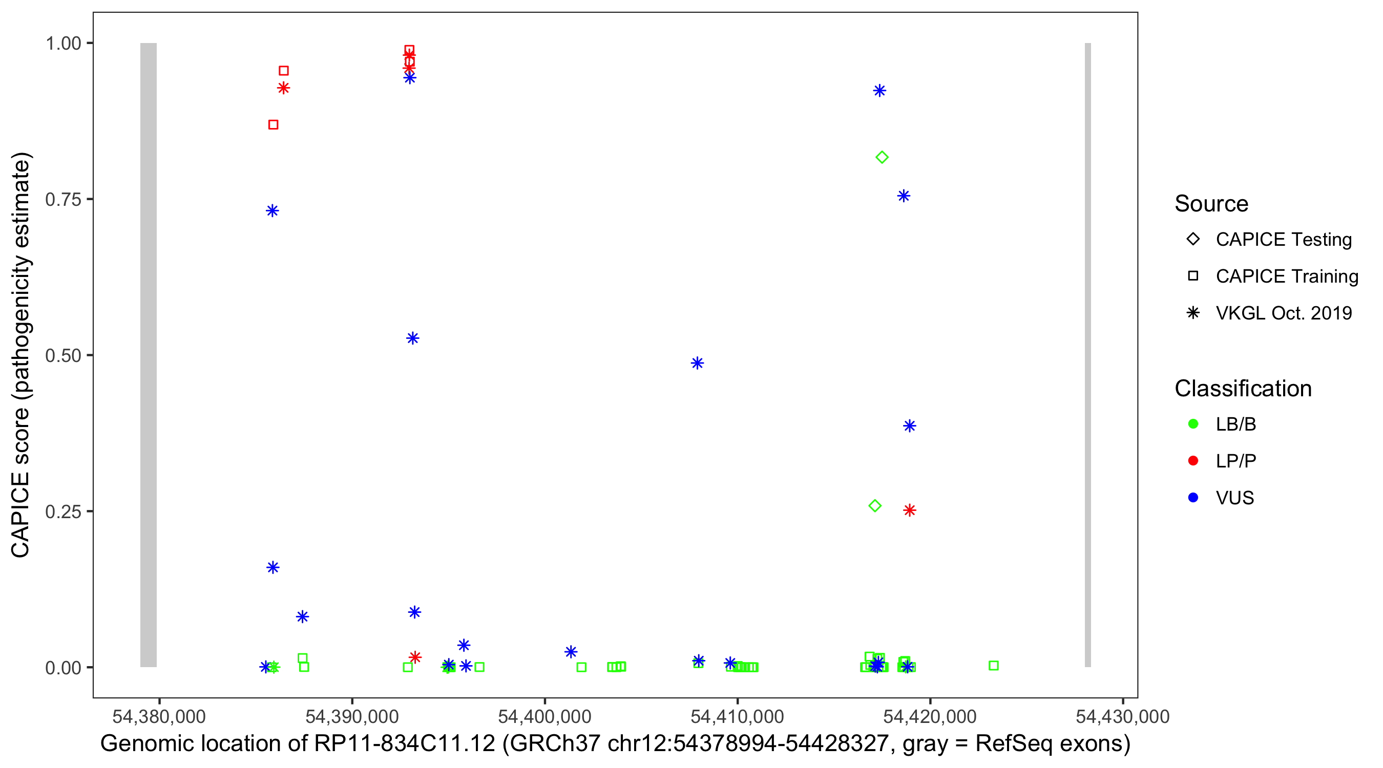 Shown are CAPICE train/test variants plus VKGL Oct 2019.