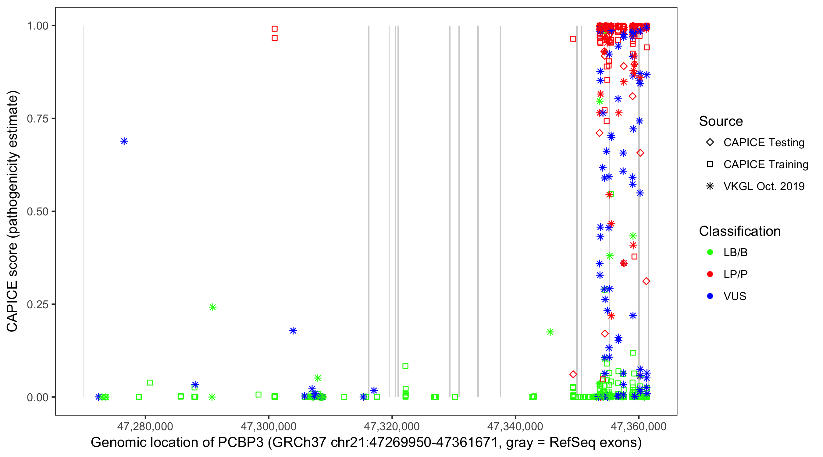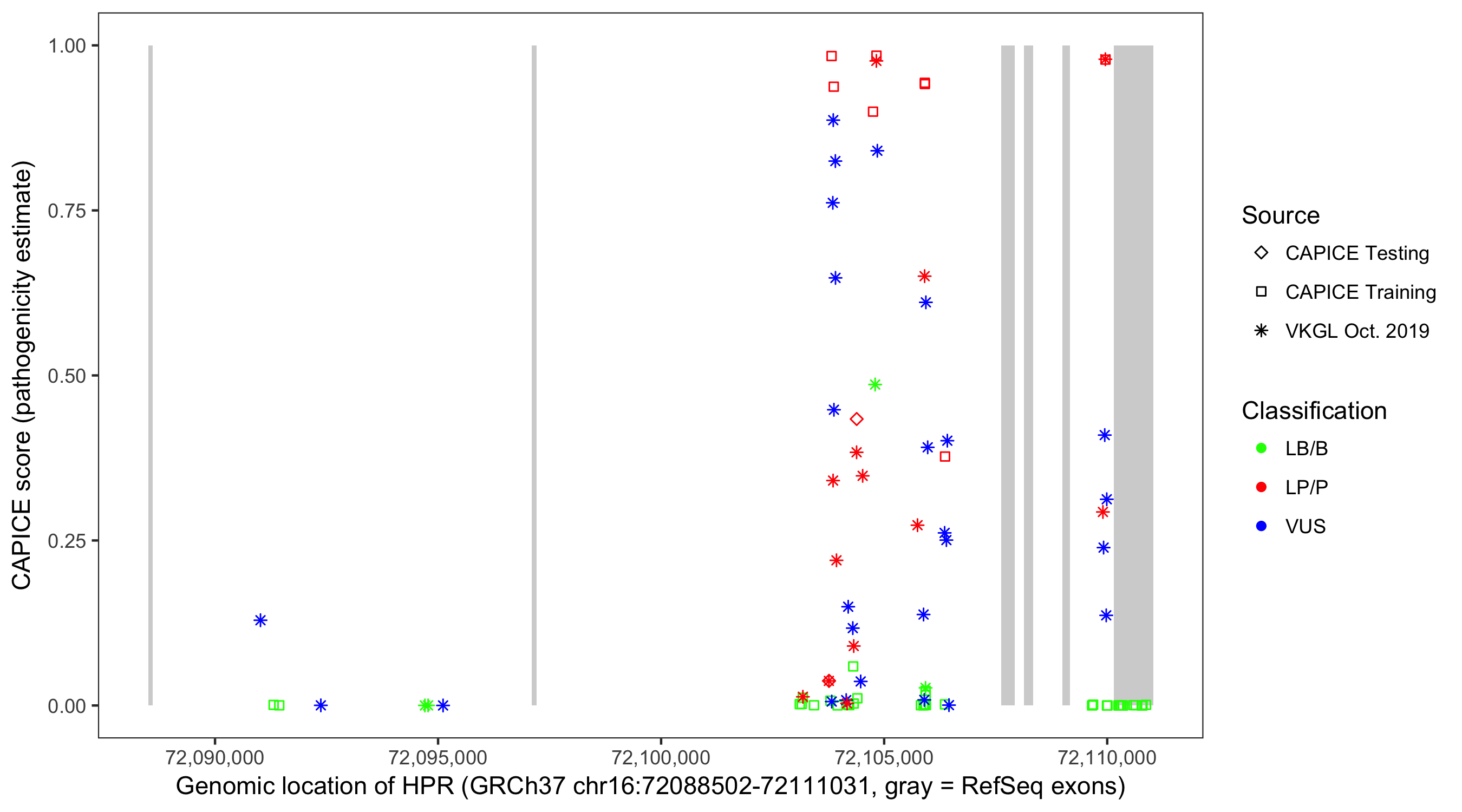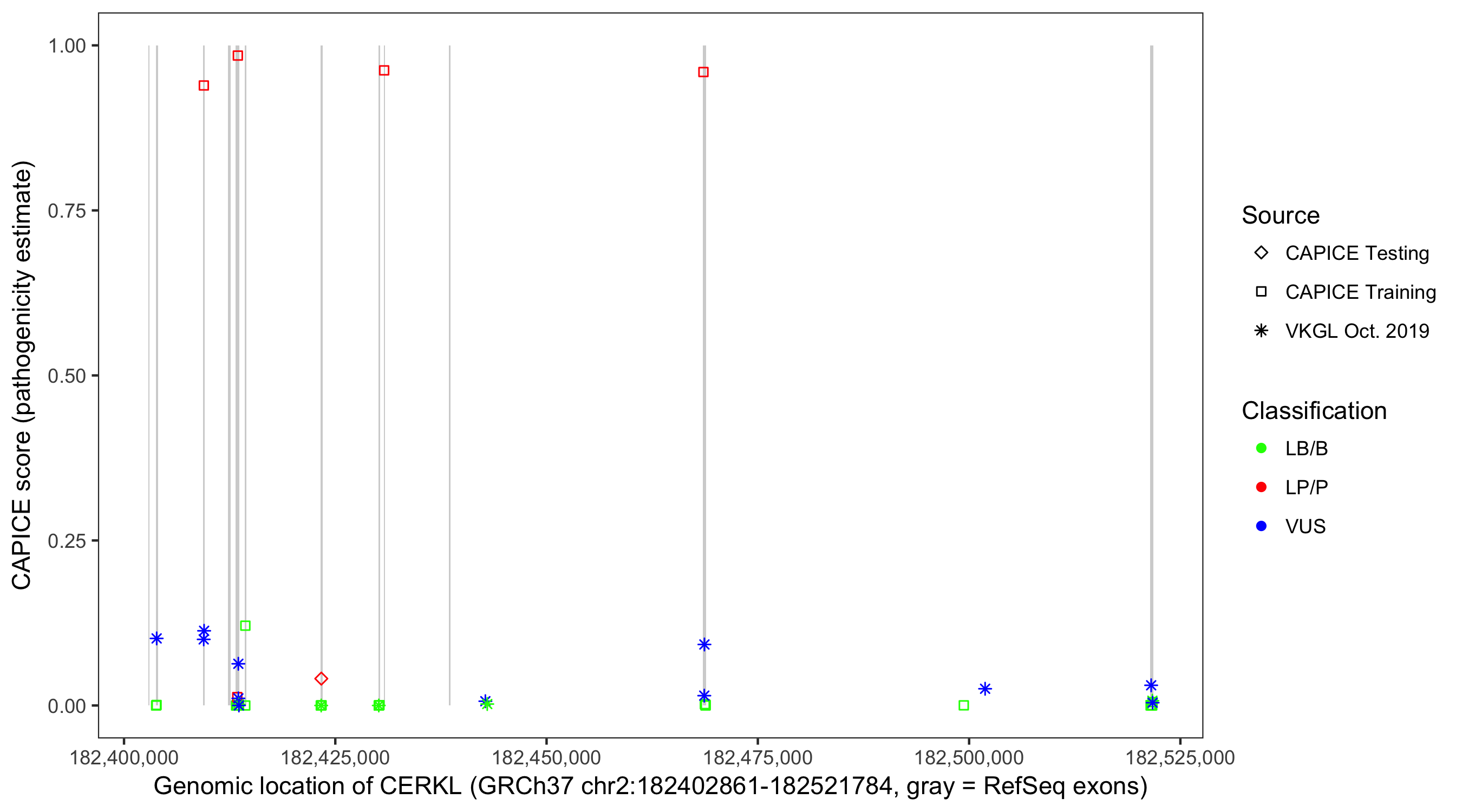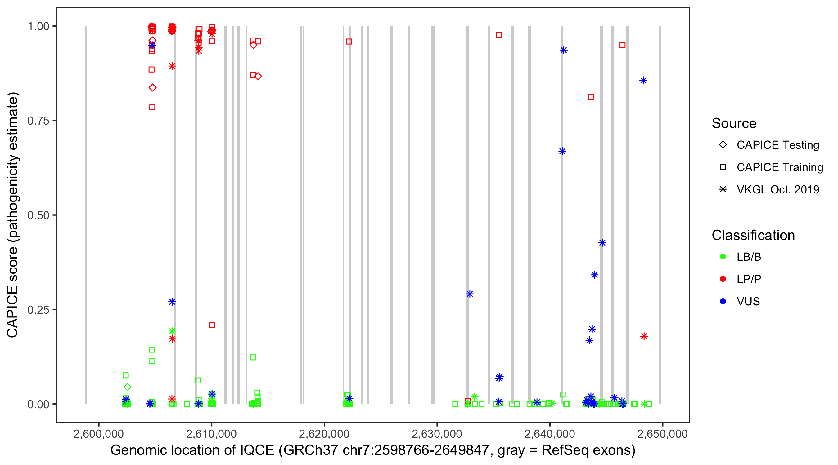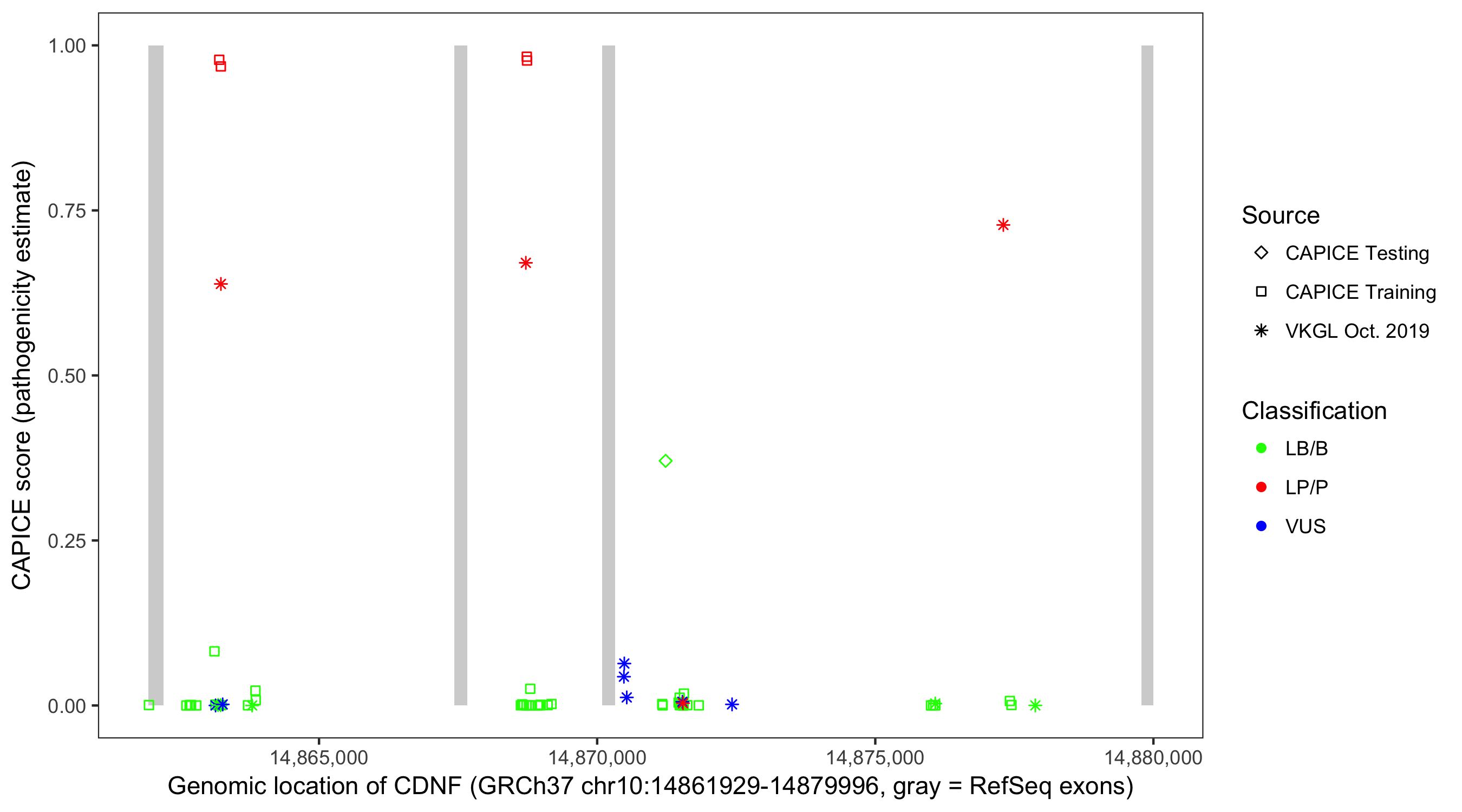 Shown are CAPICE train/test variants plus VKGL Oct 2019.