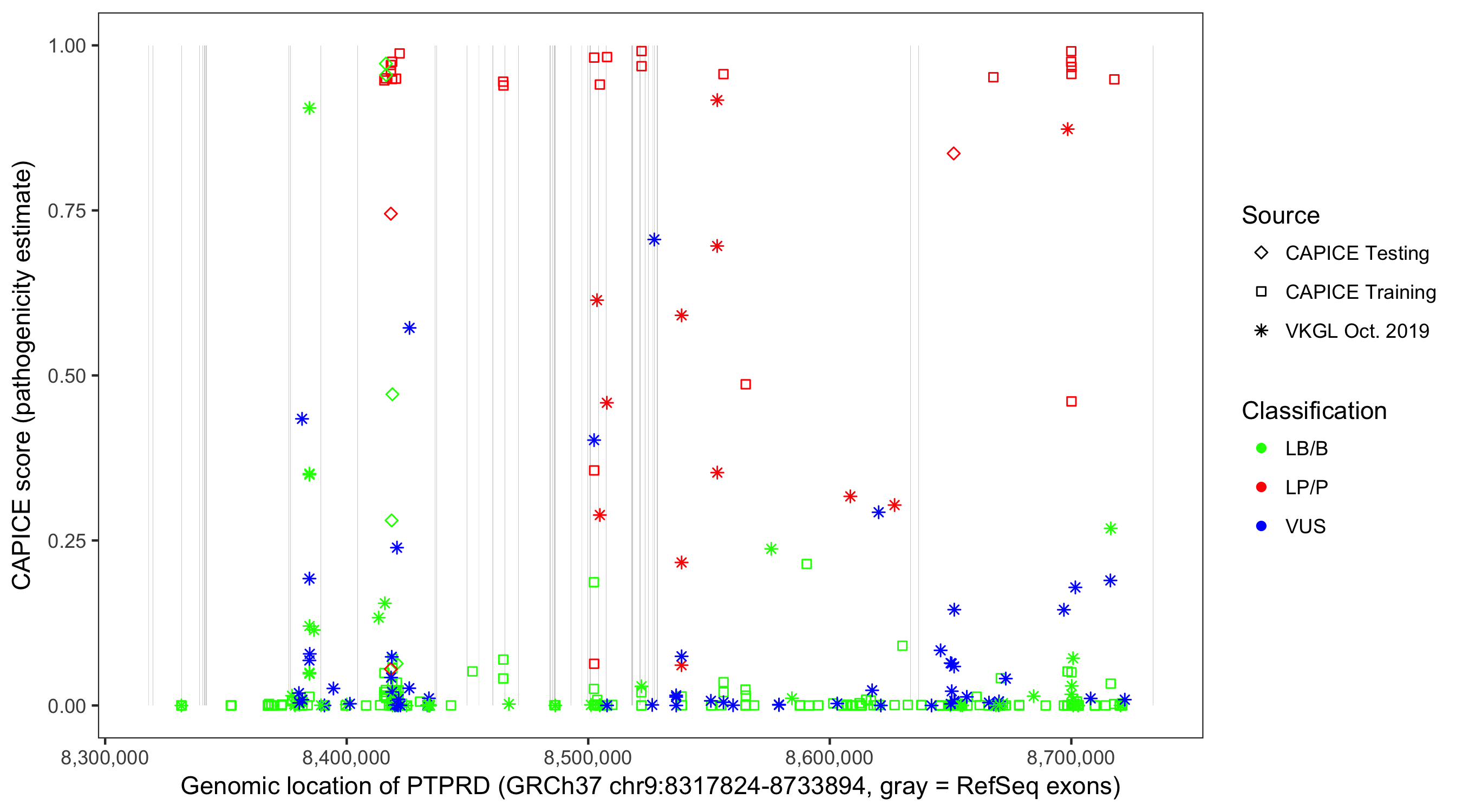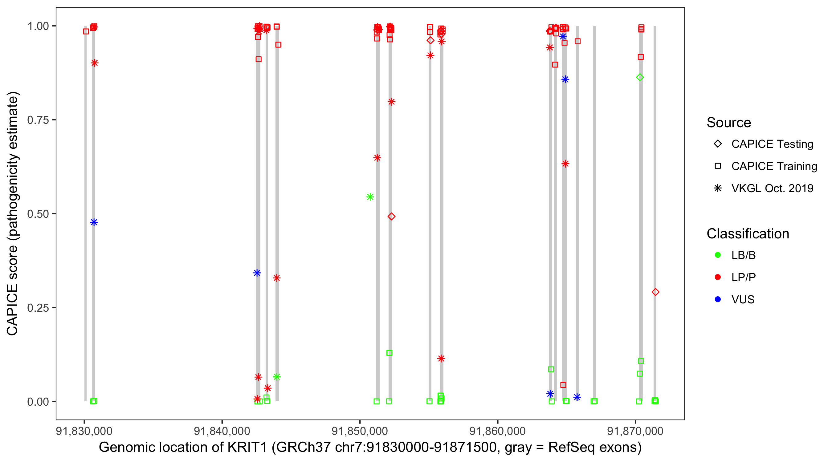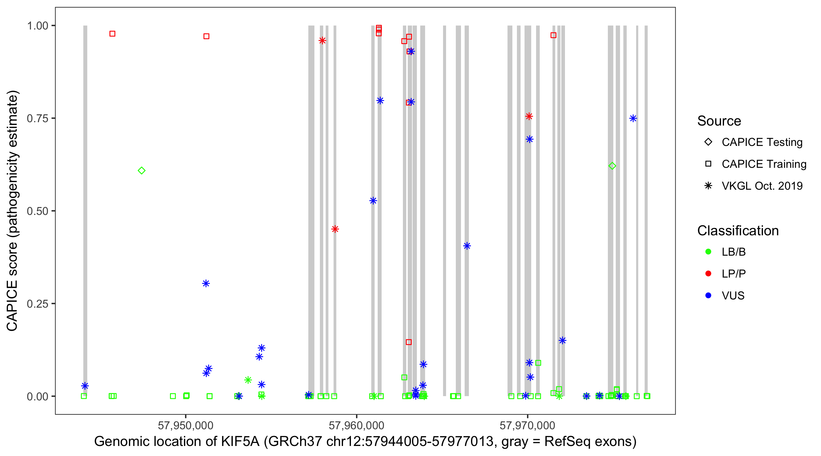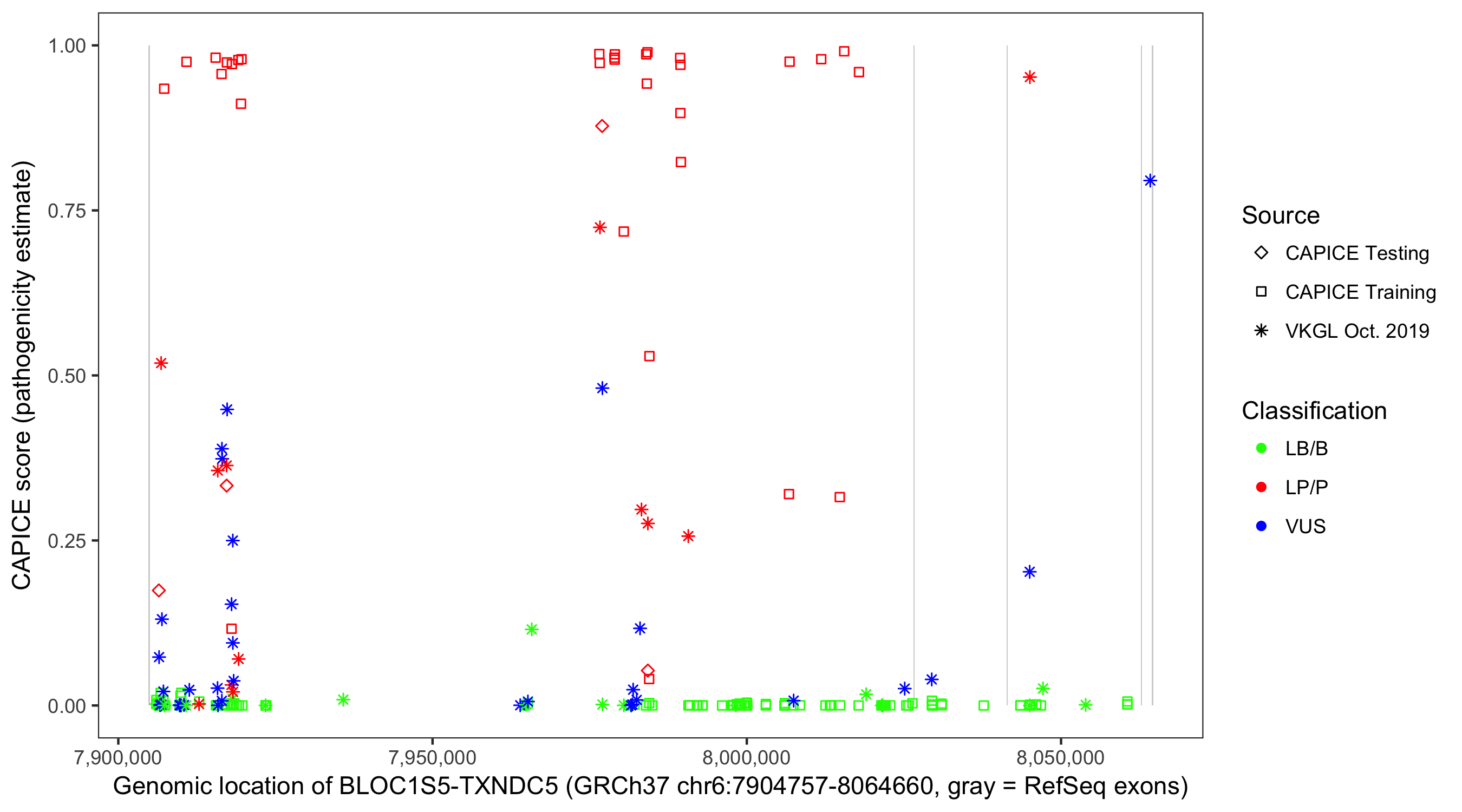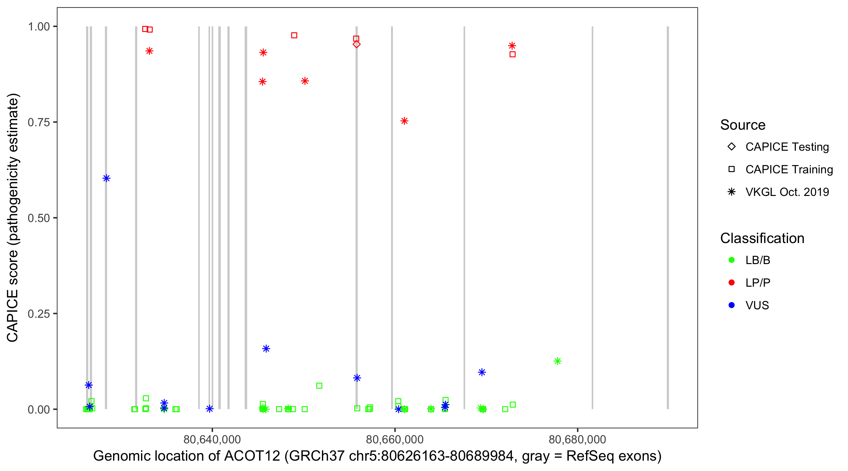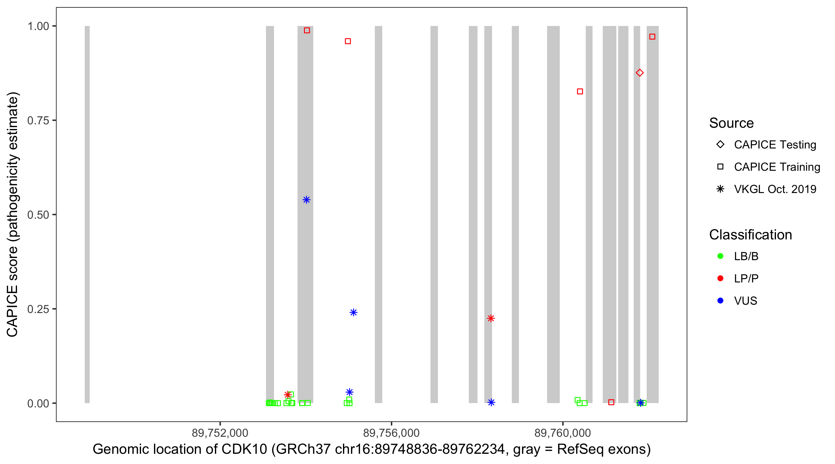 Shown are CAPICE train/test variants plus VKGL Oct 2019.