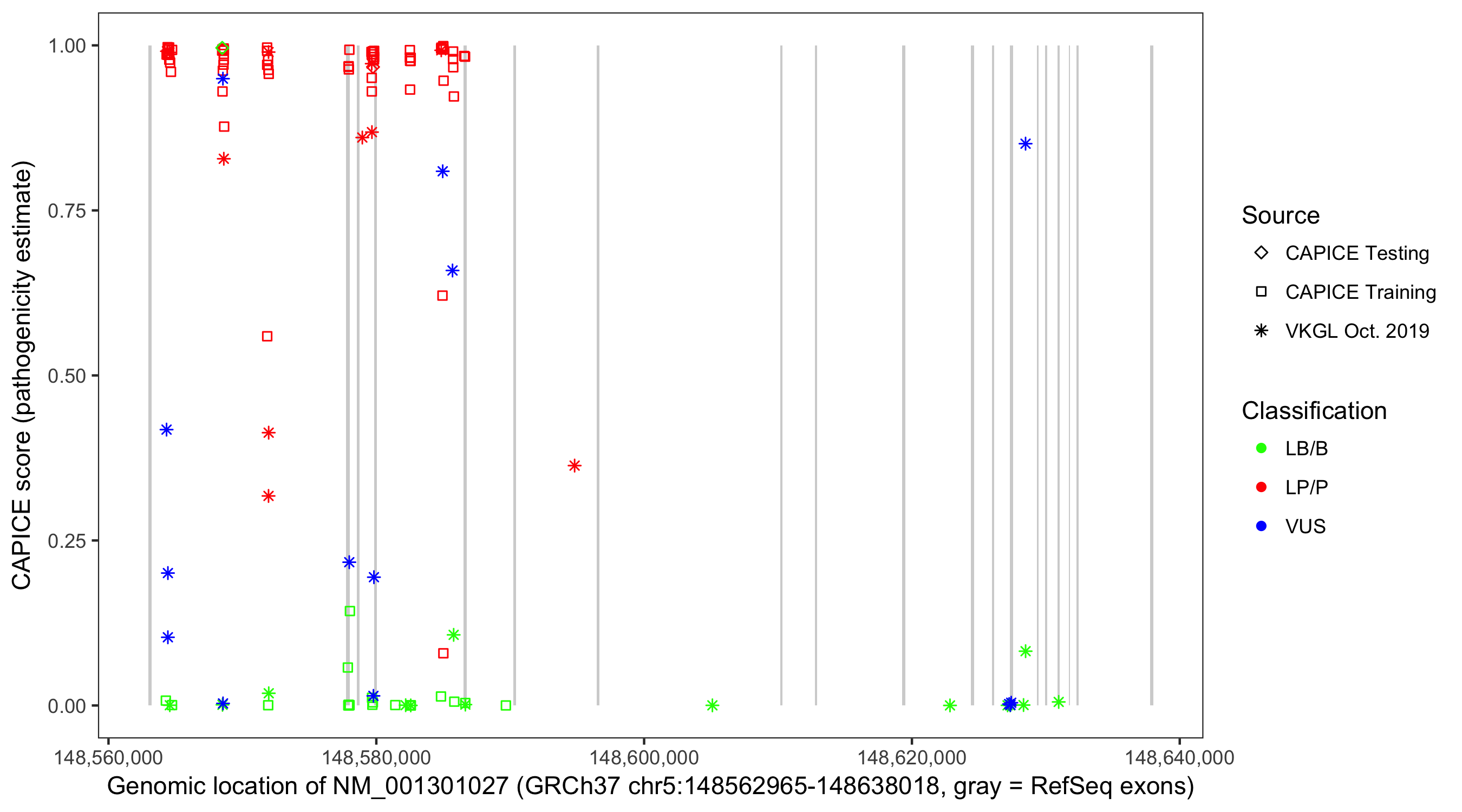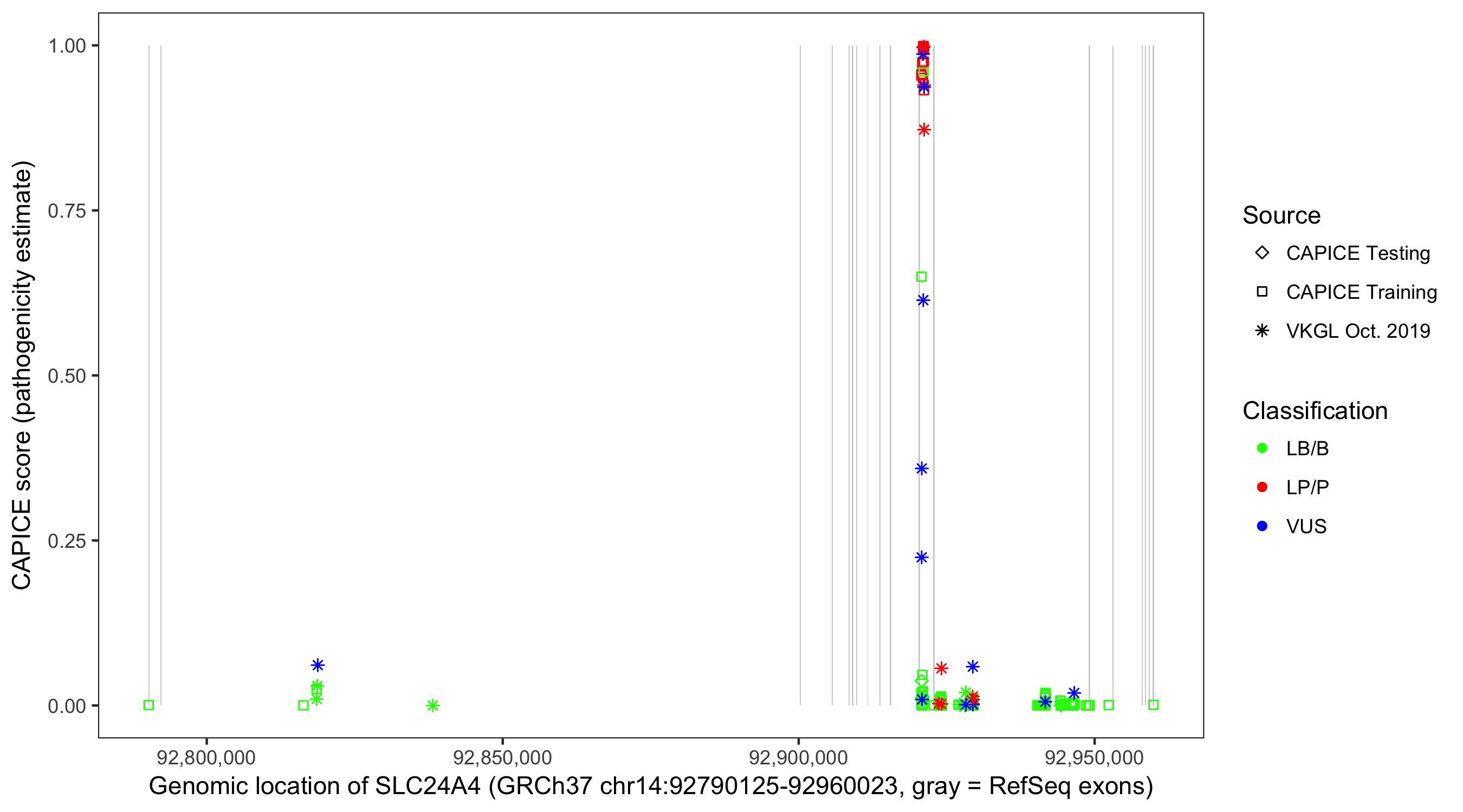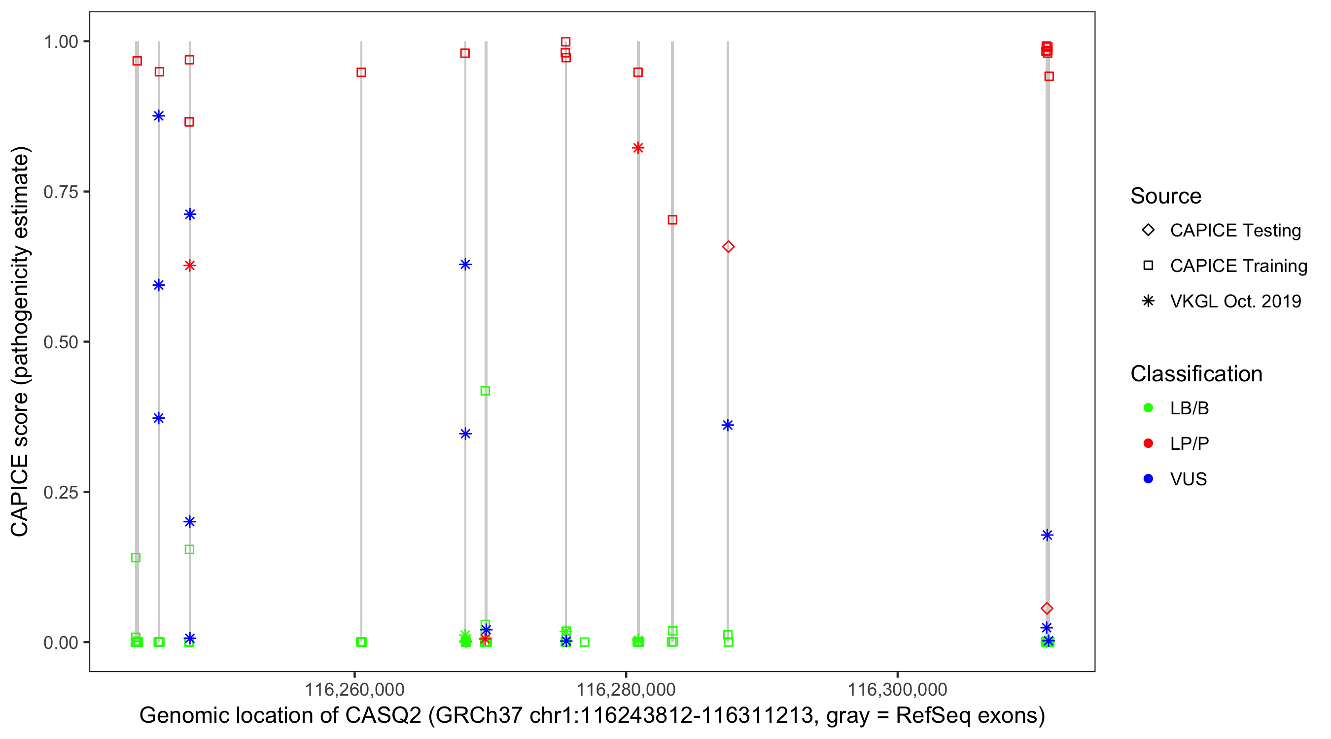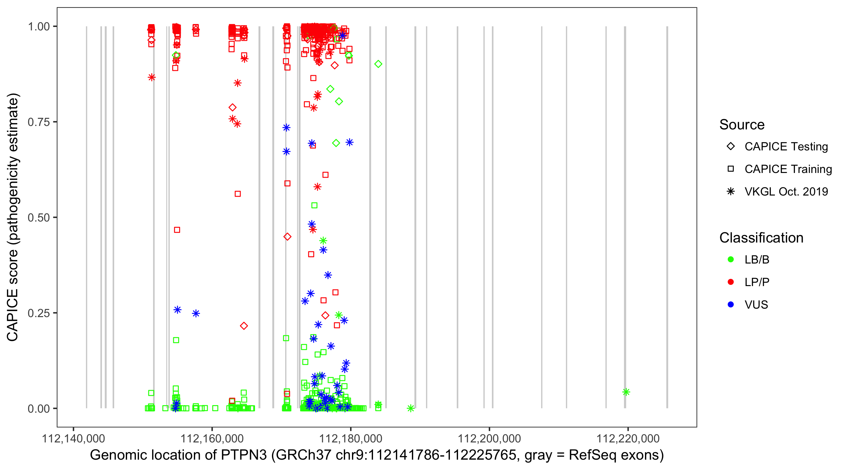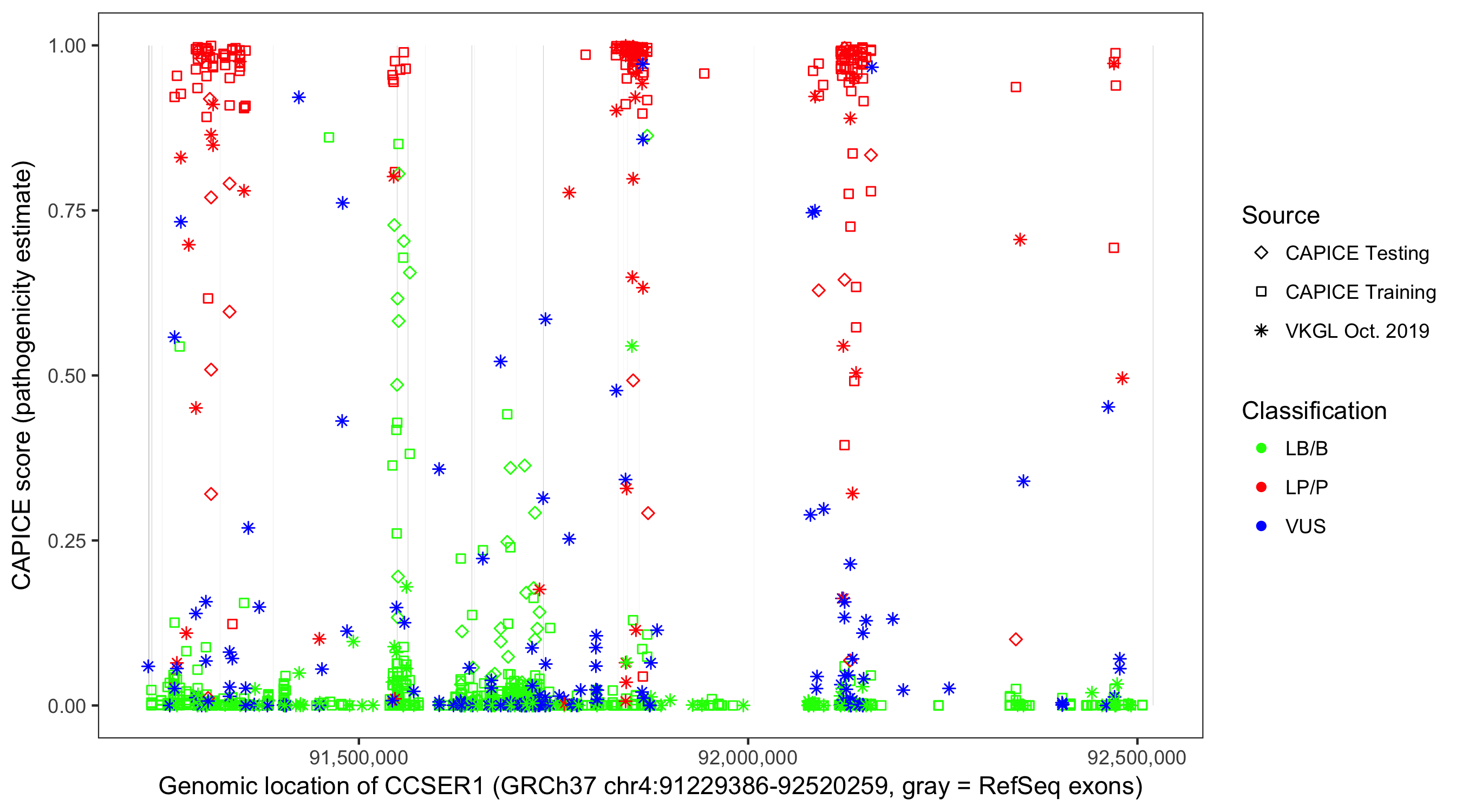 Shown are CAPICE train/test variants plus VKGL Oct 2019.