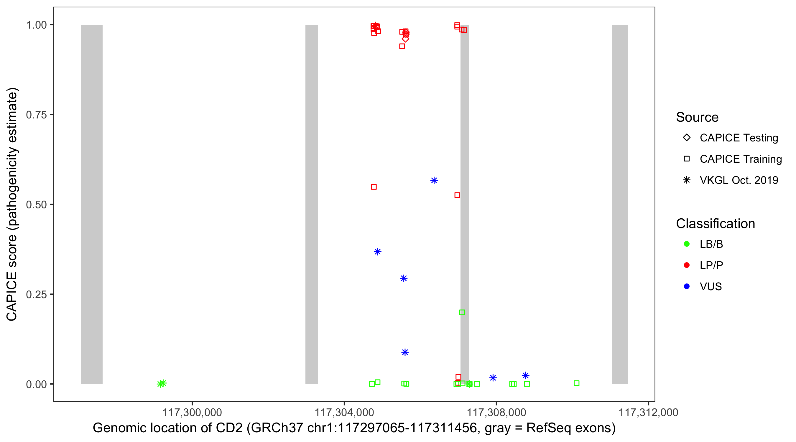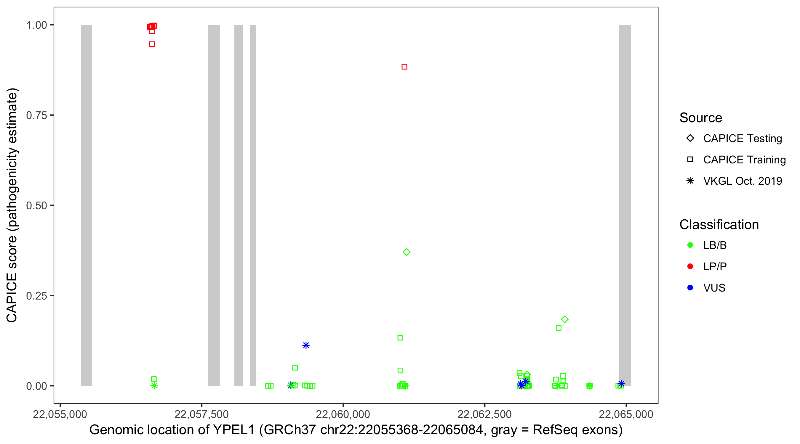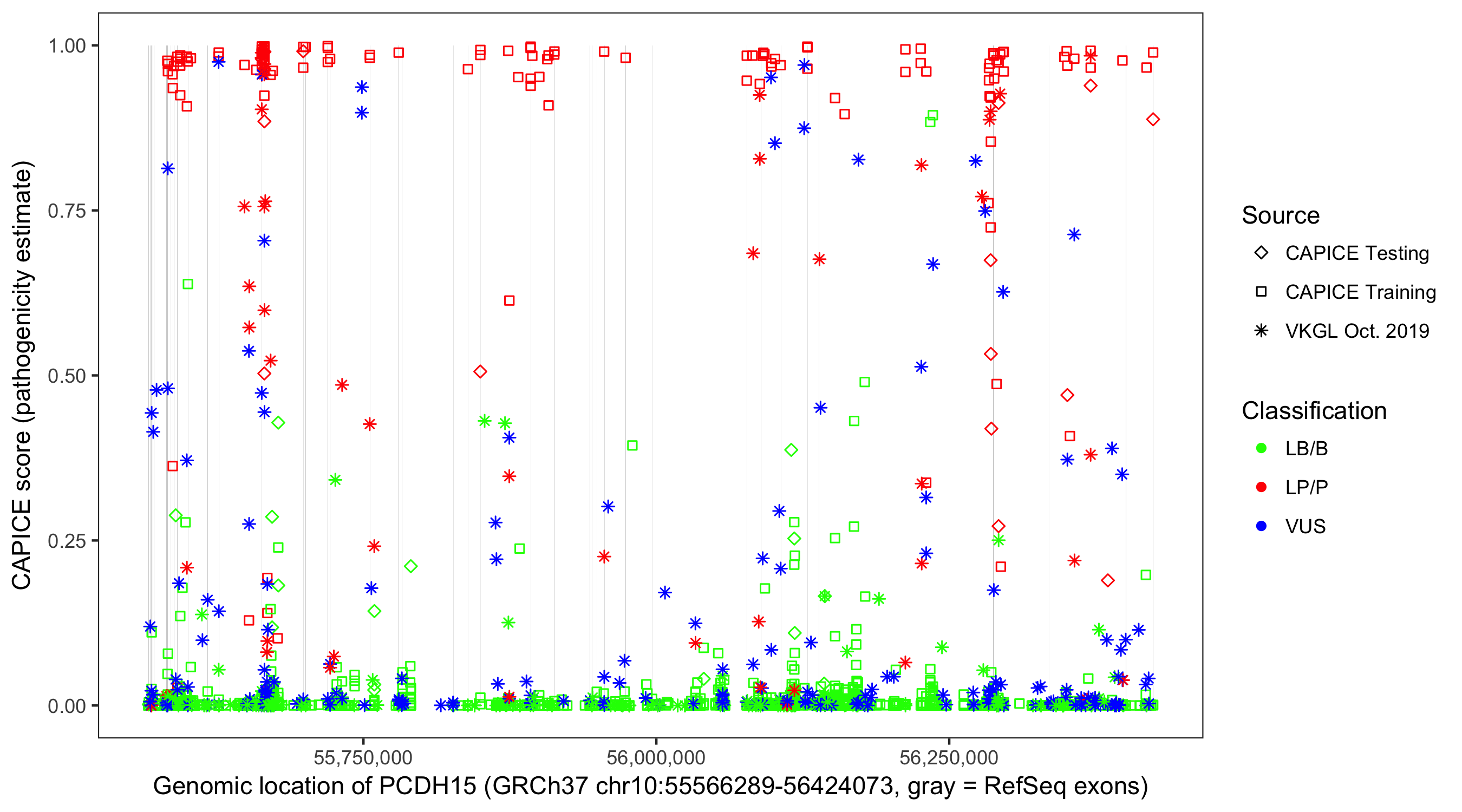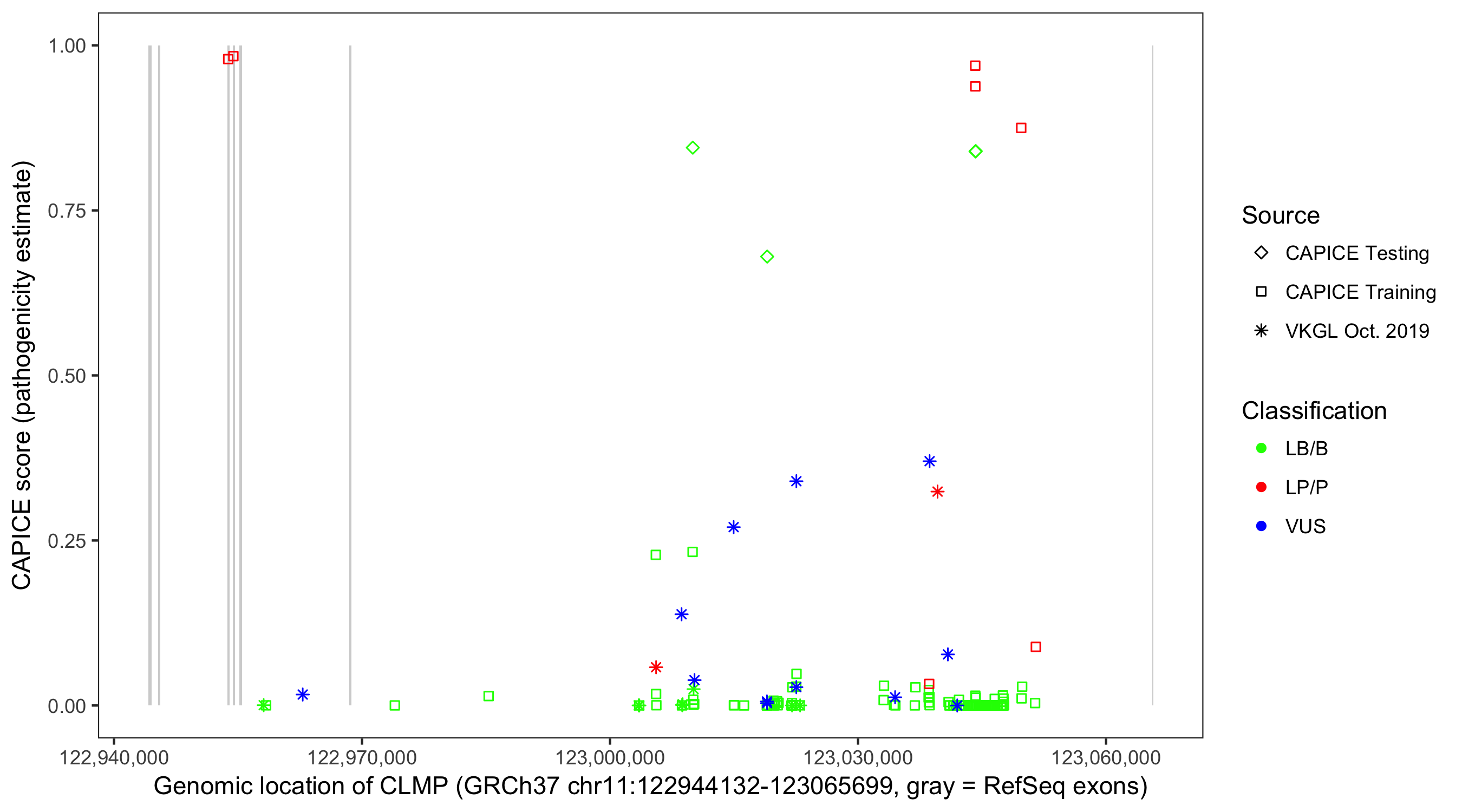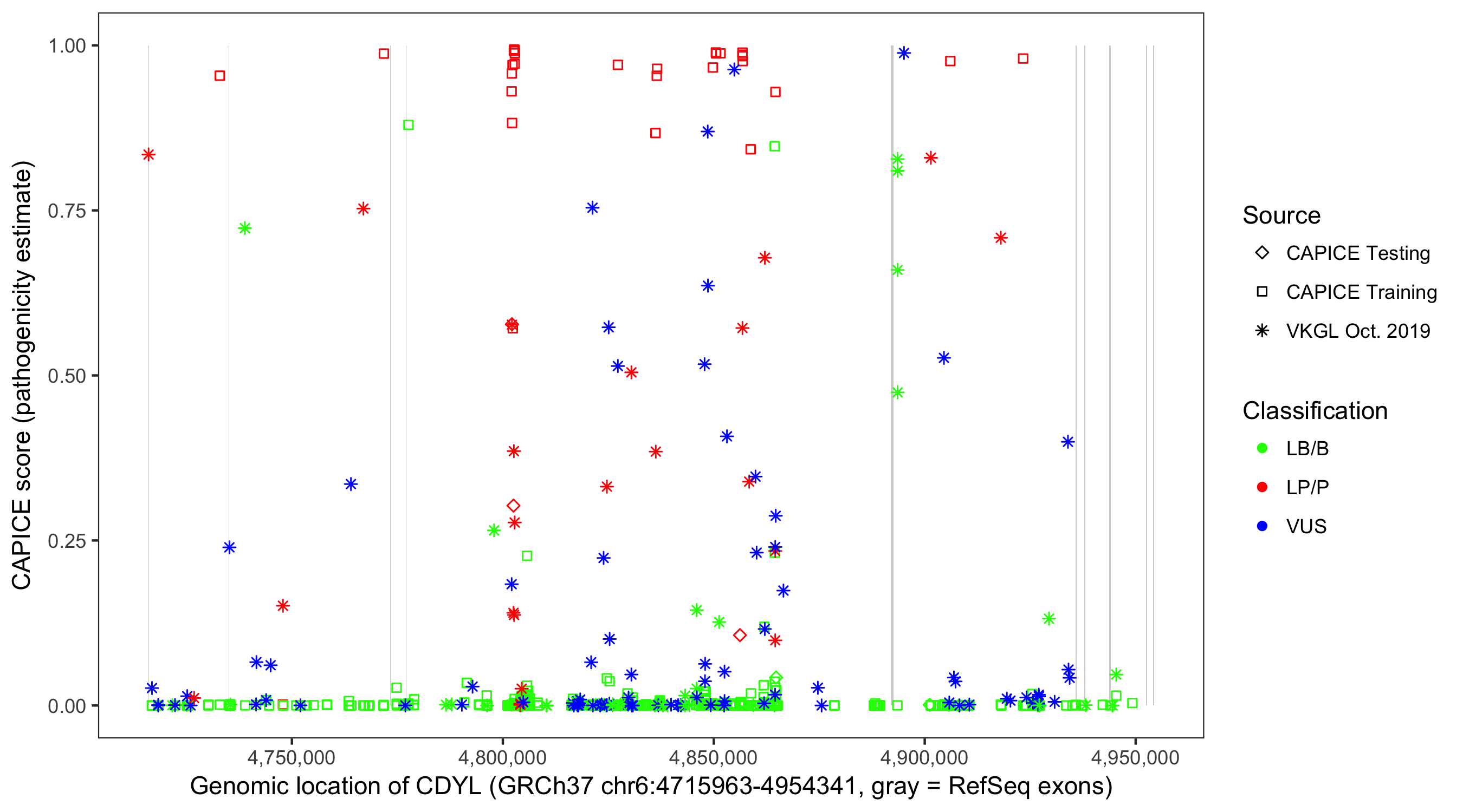 Shown are CAPICE train/test variants plus VKGL Oct 2019.
