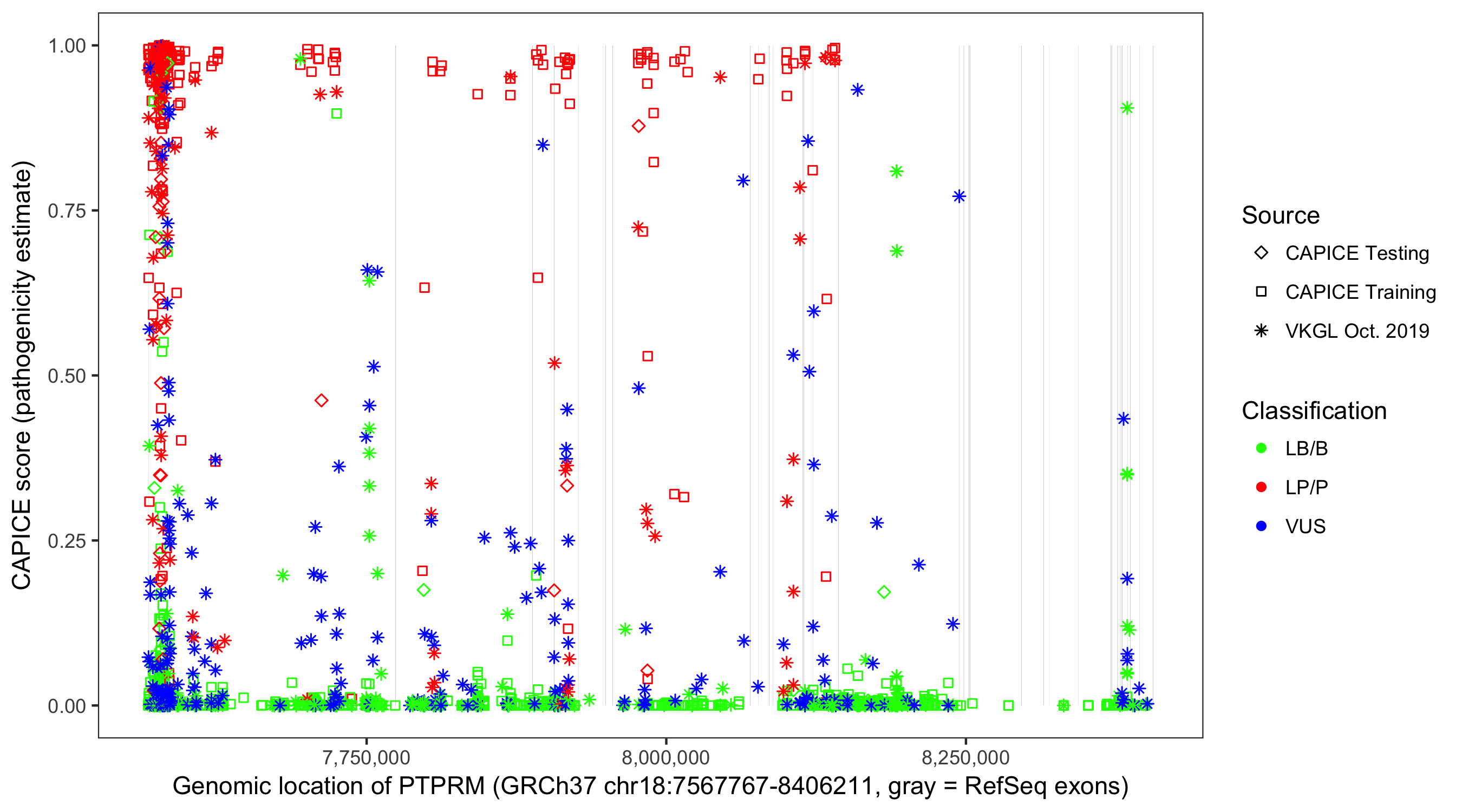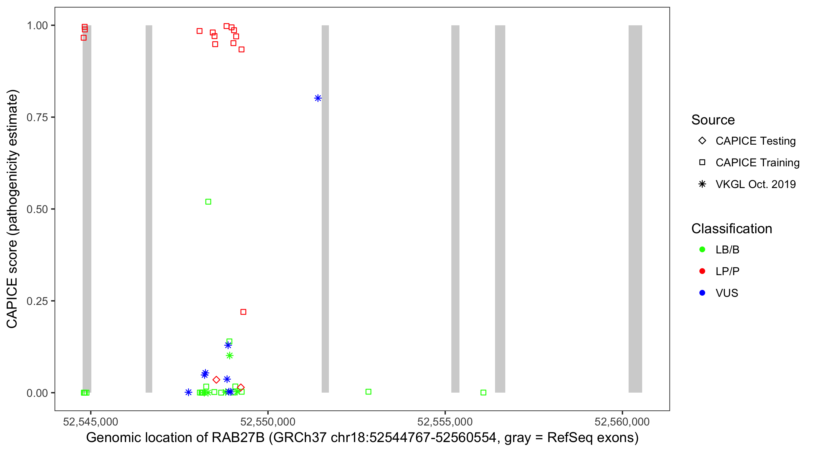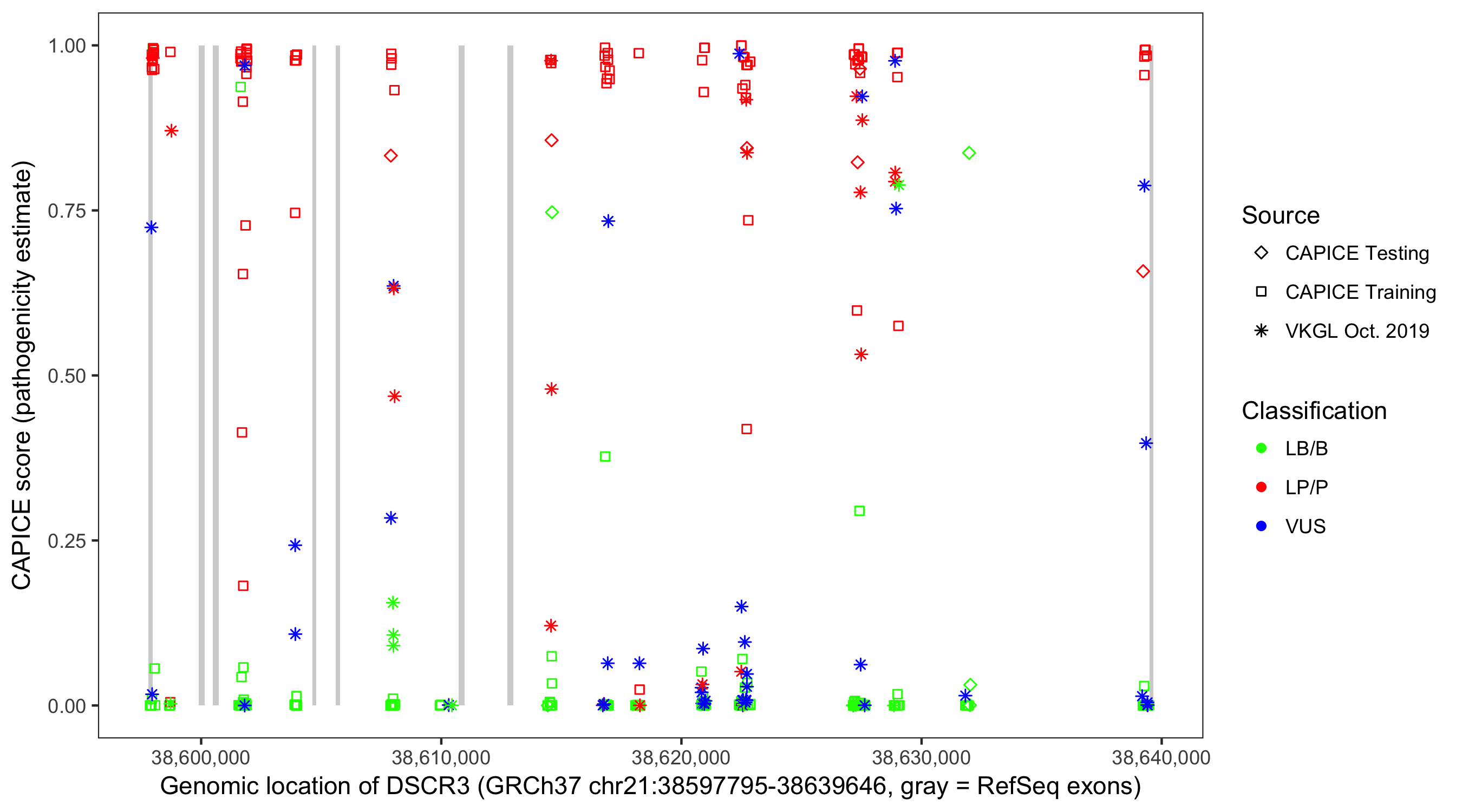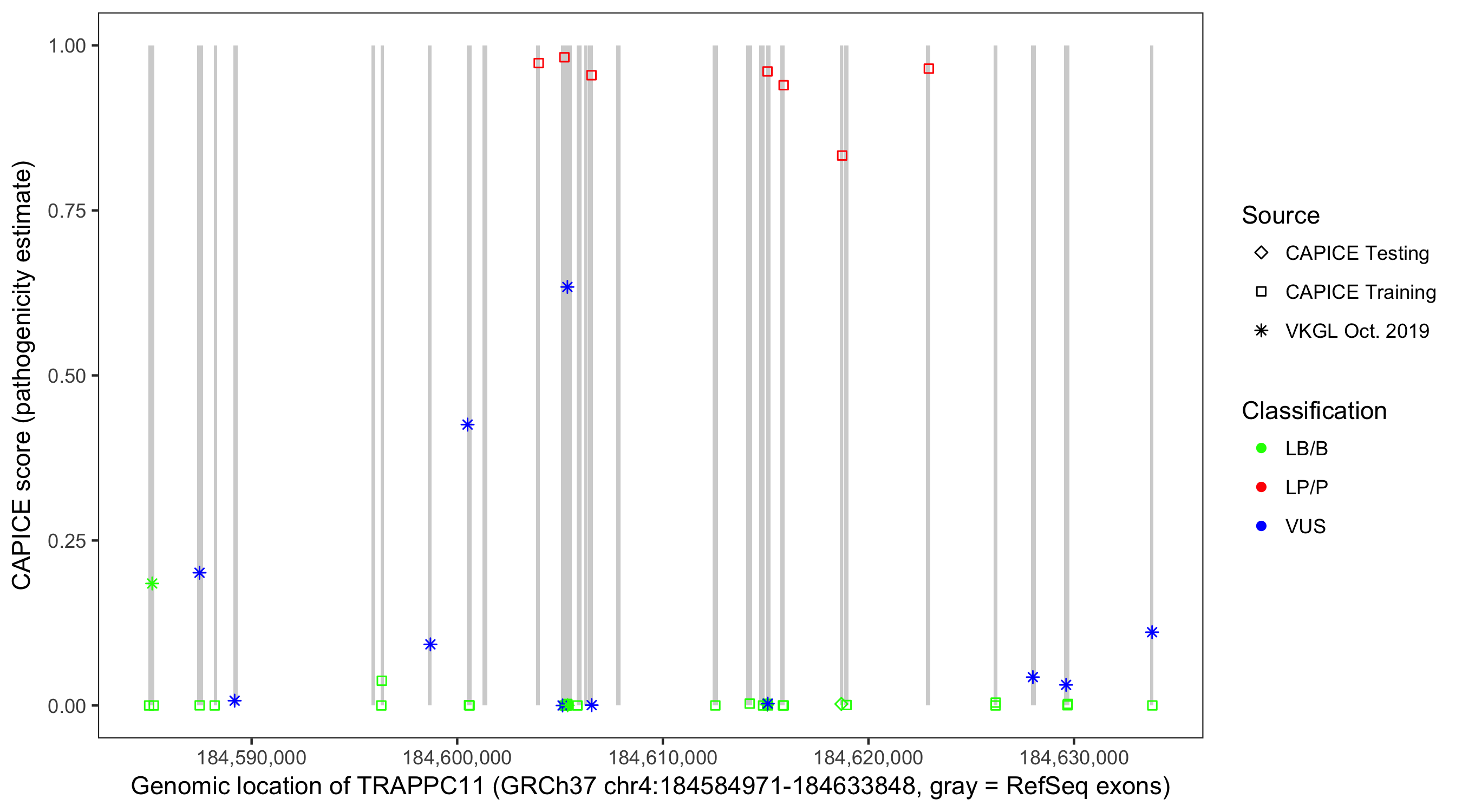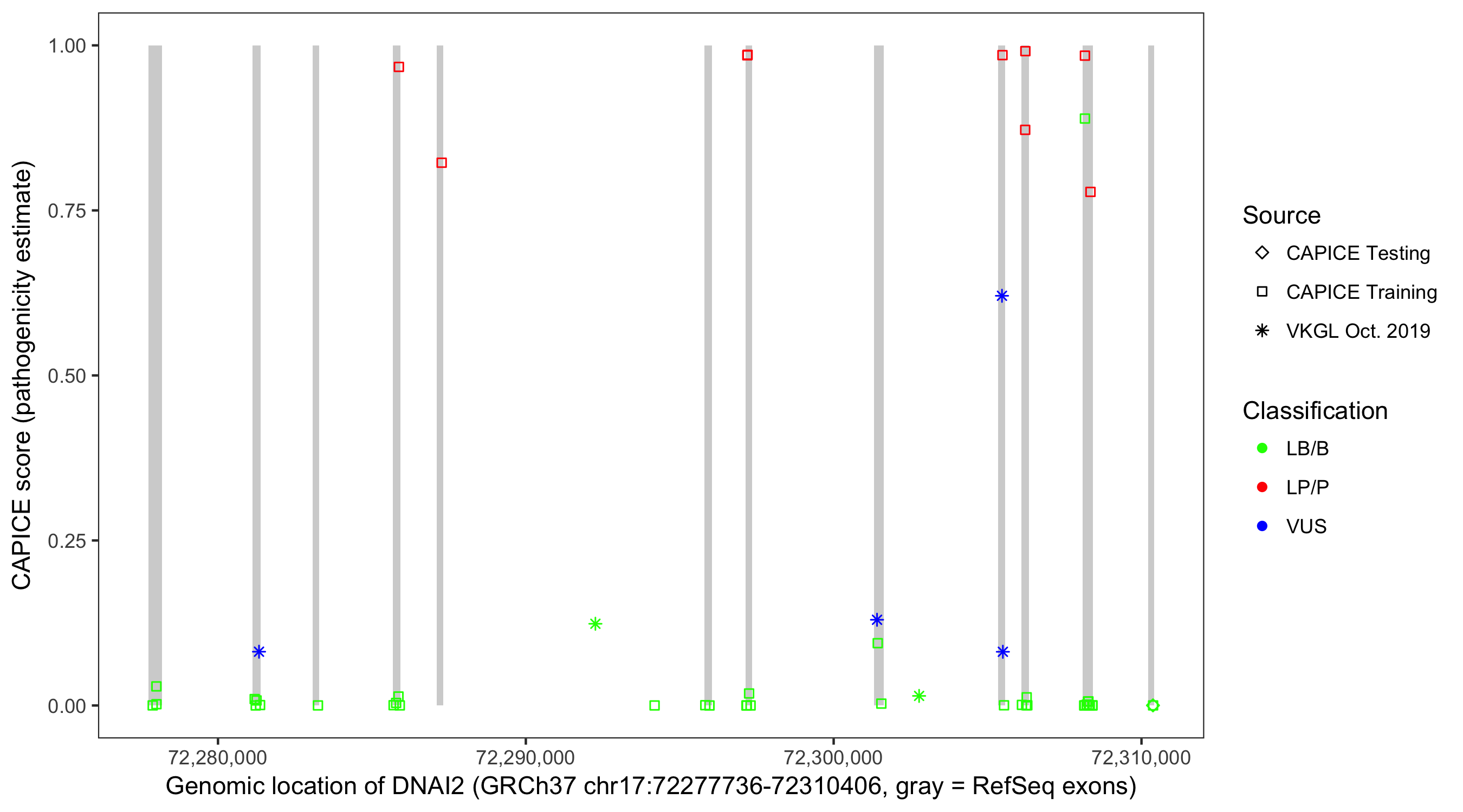 Shown are CAPICE train/test variants plus VKGL Oct 2019.