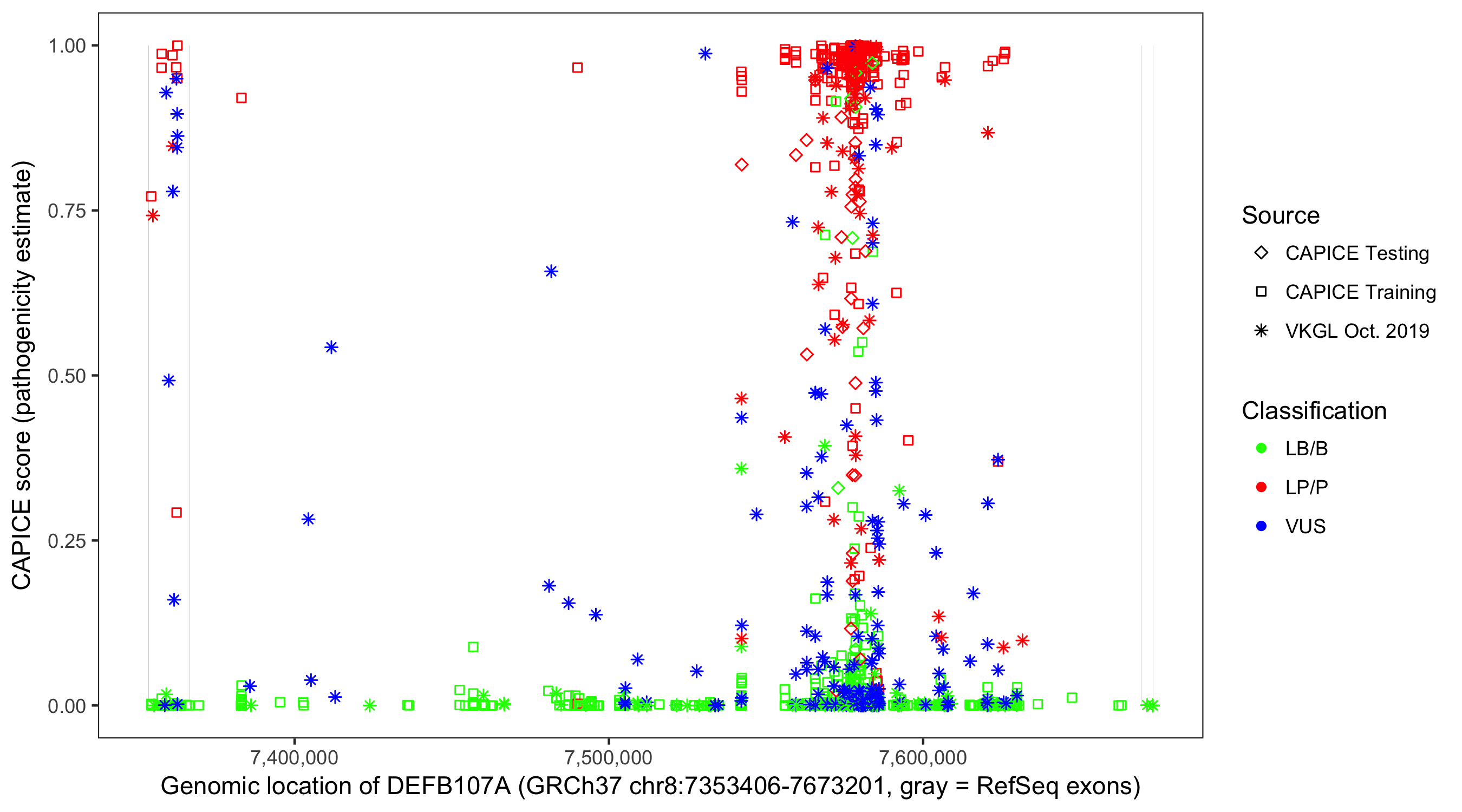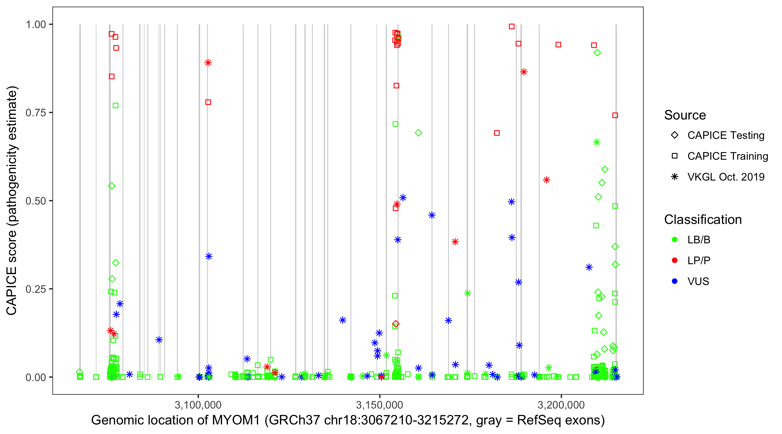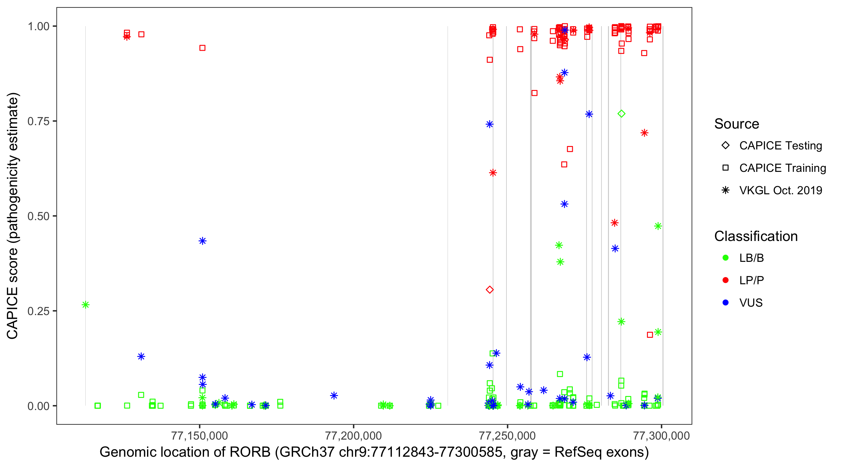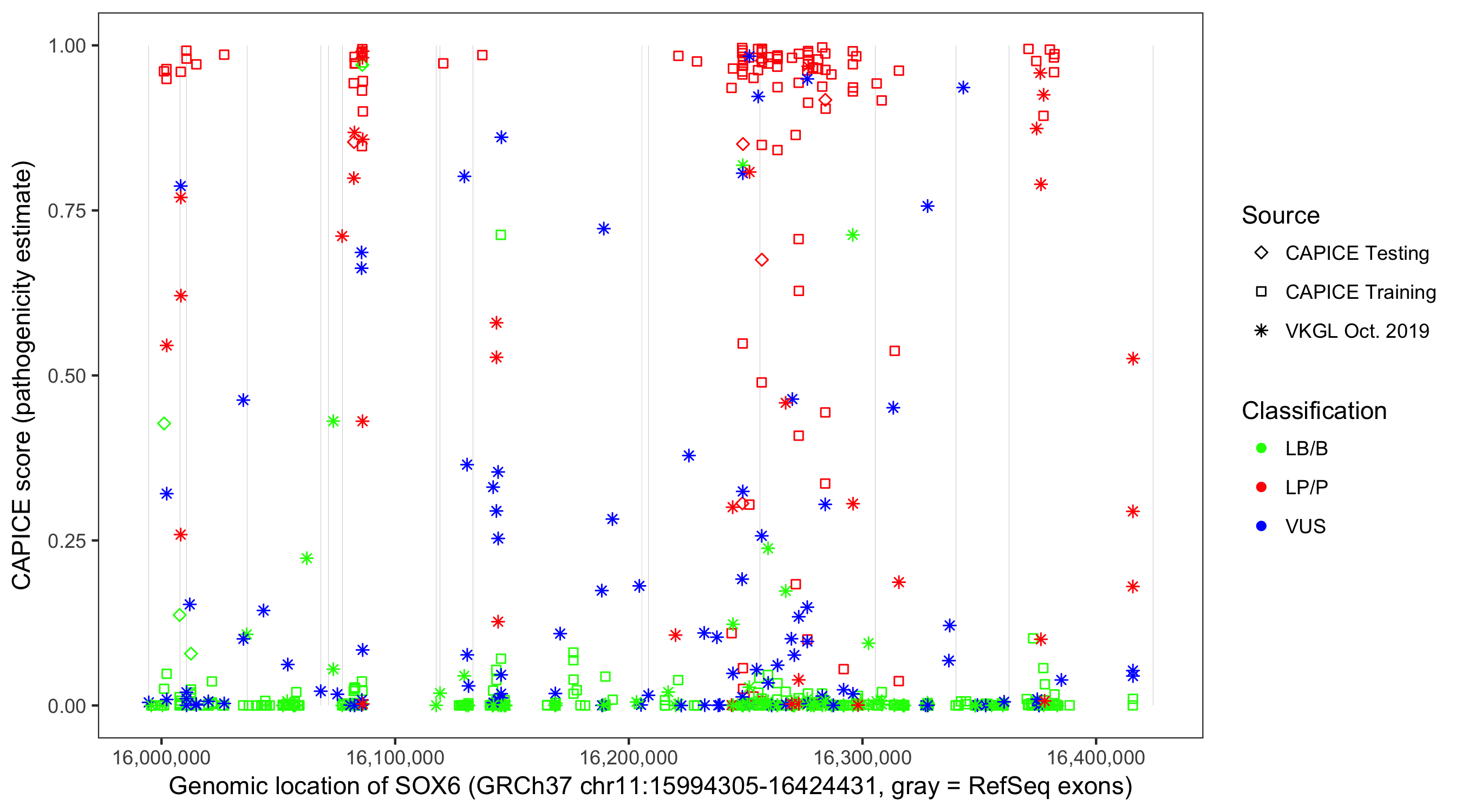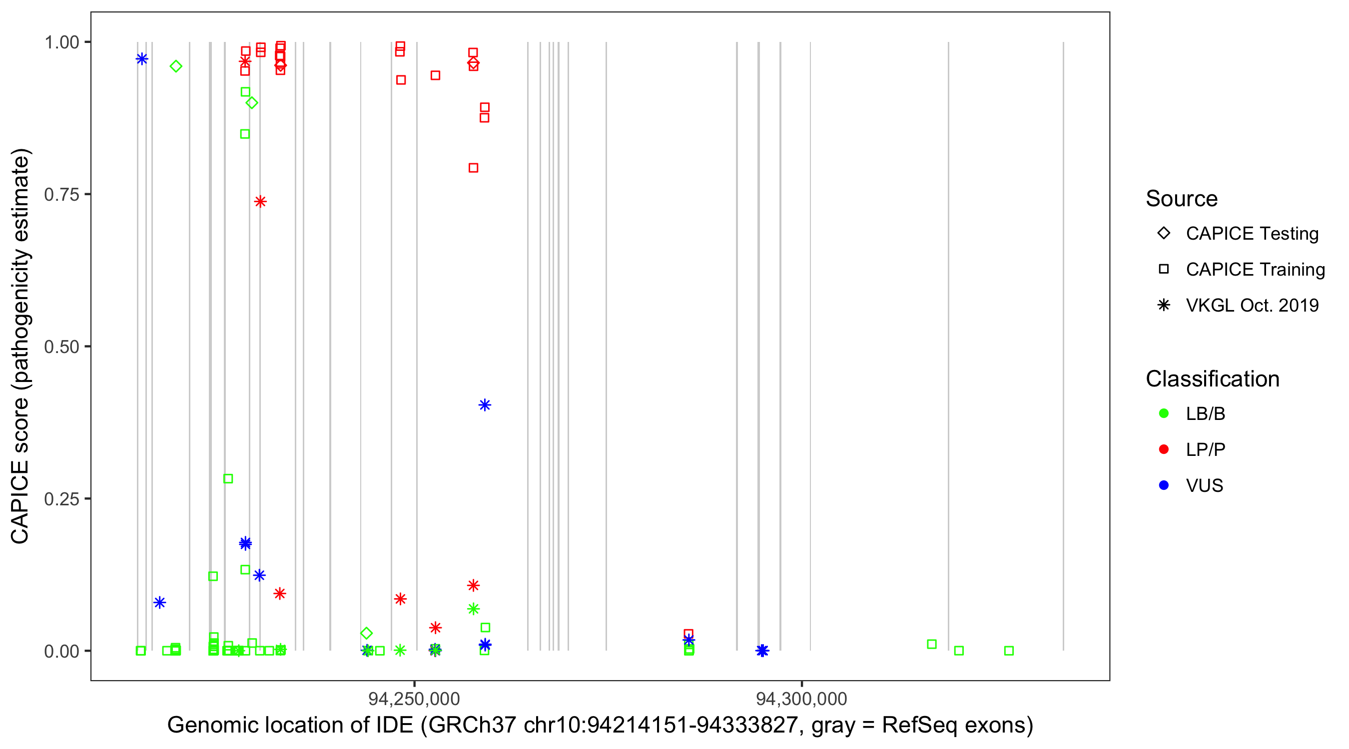 Shown are CAPICE train/test variants plus VKGL Oct 2019.