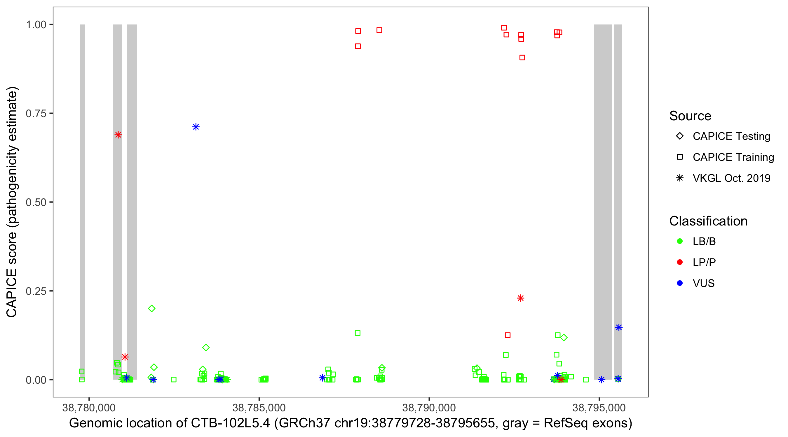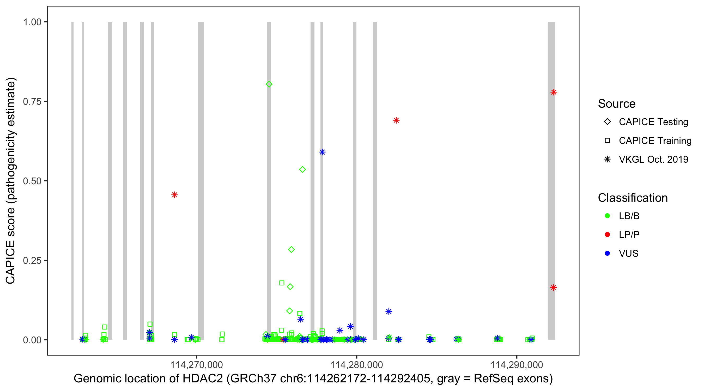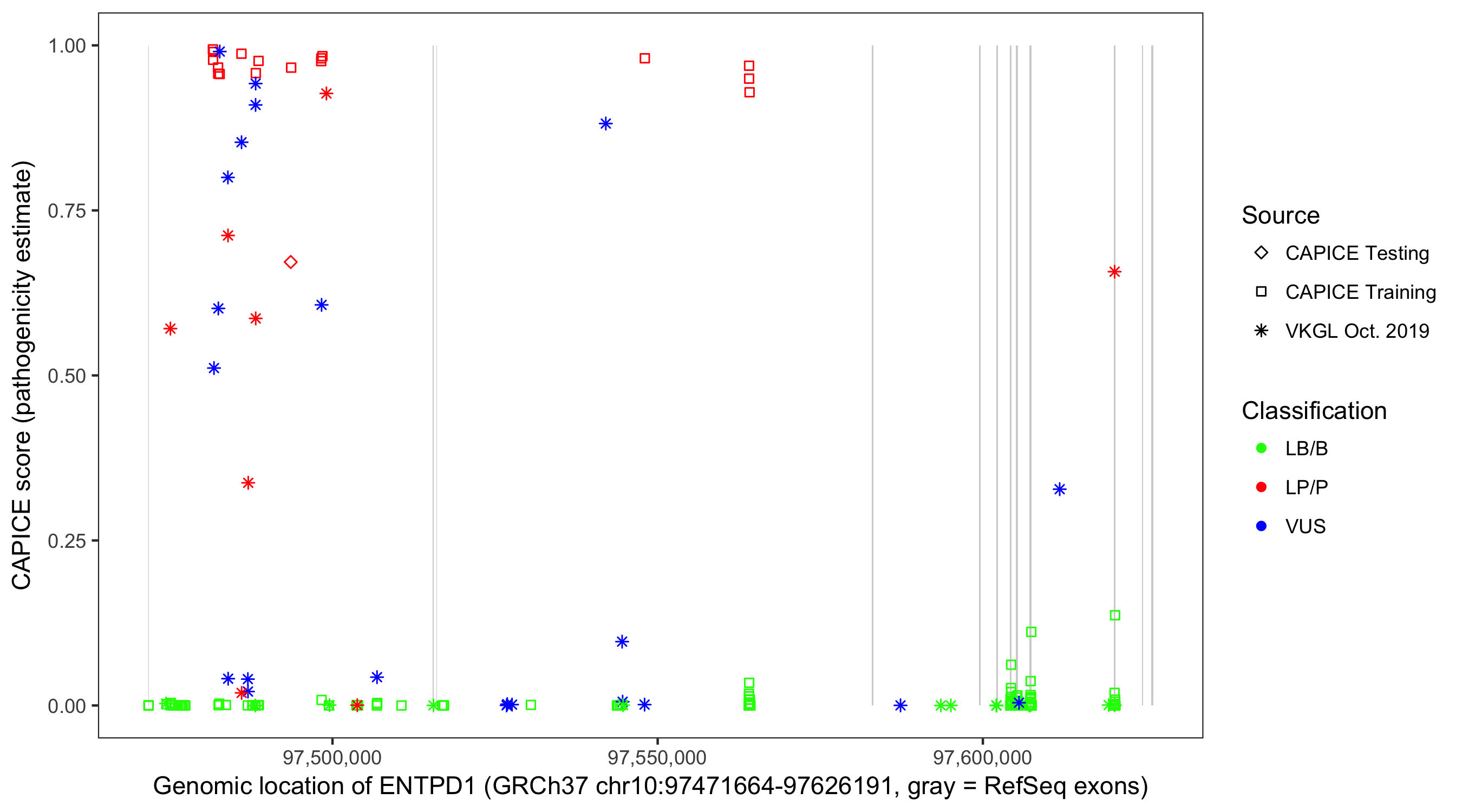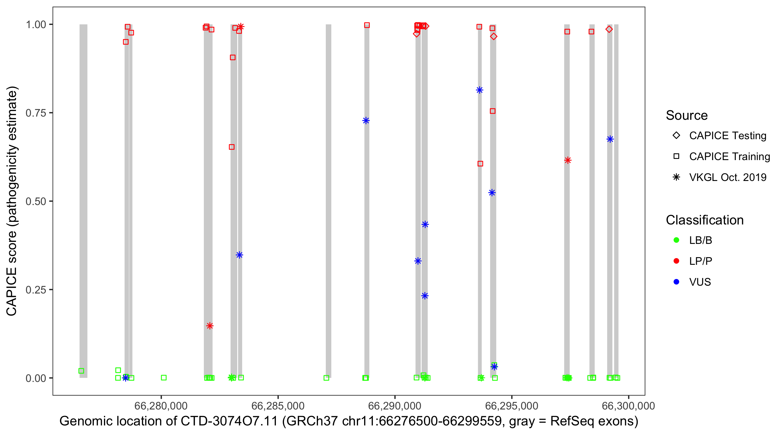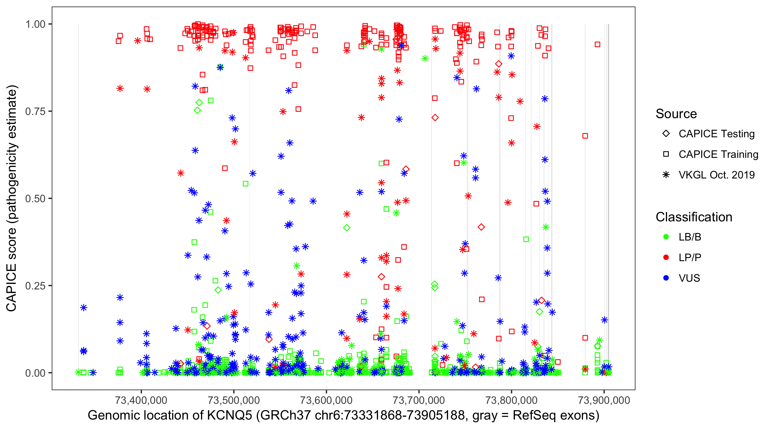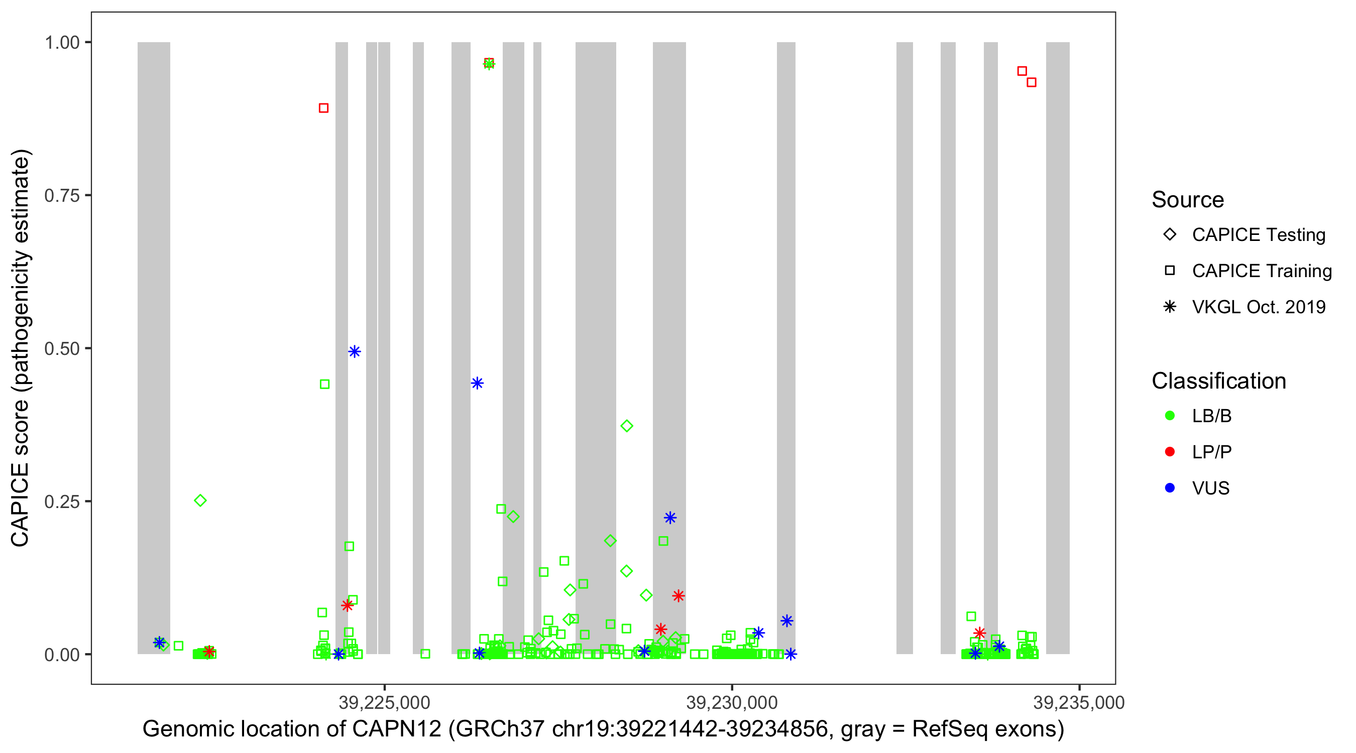 Shown are CAPICE train/test variants plus VKGL Oct 2019.