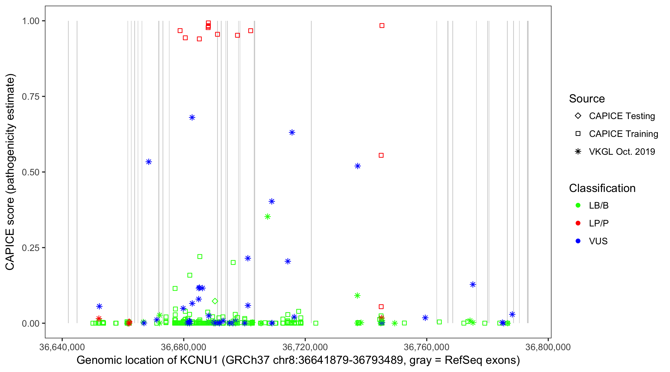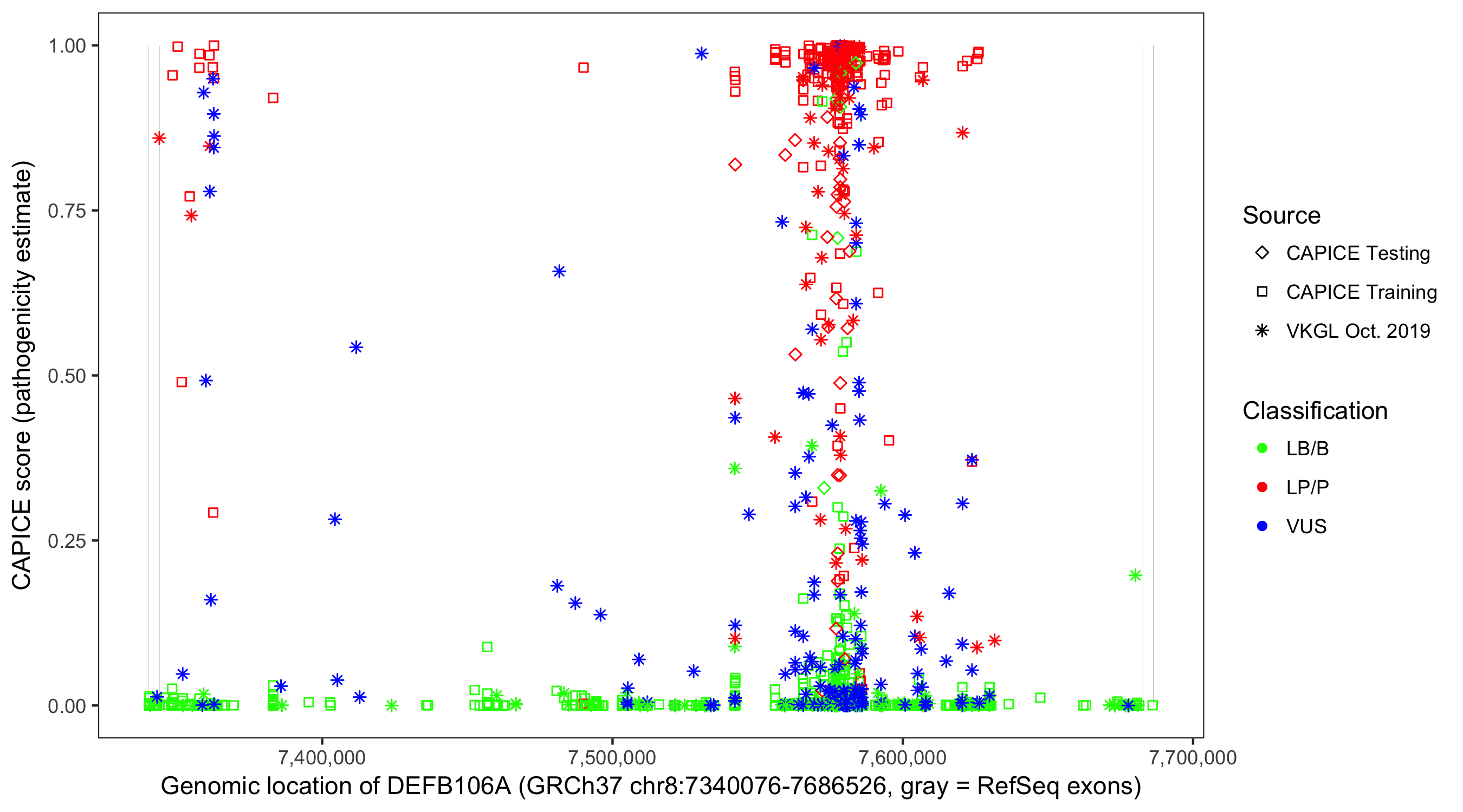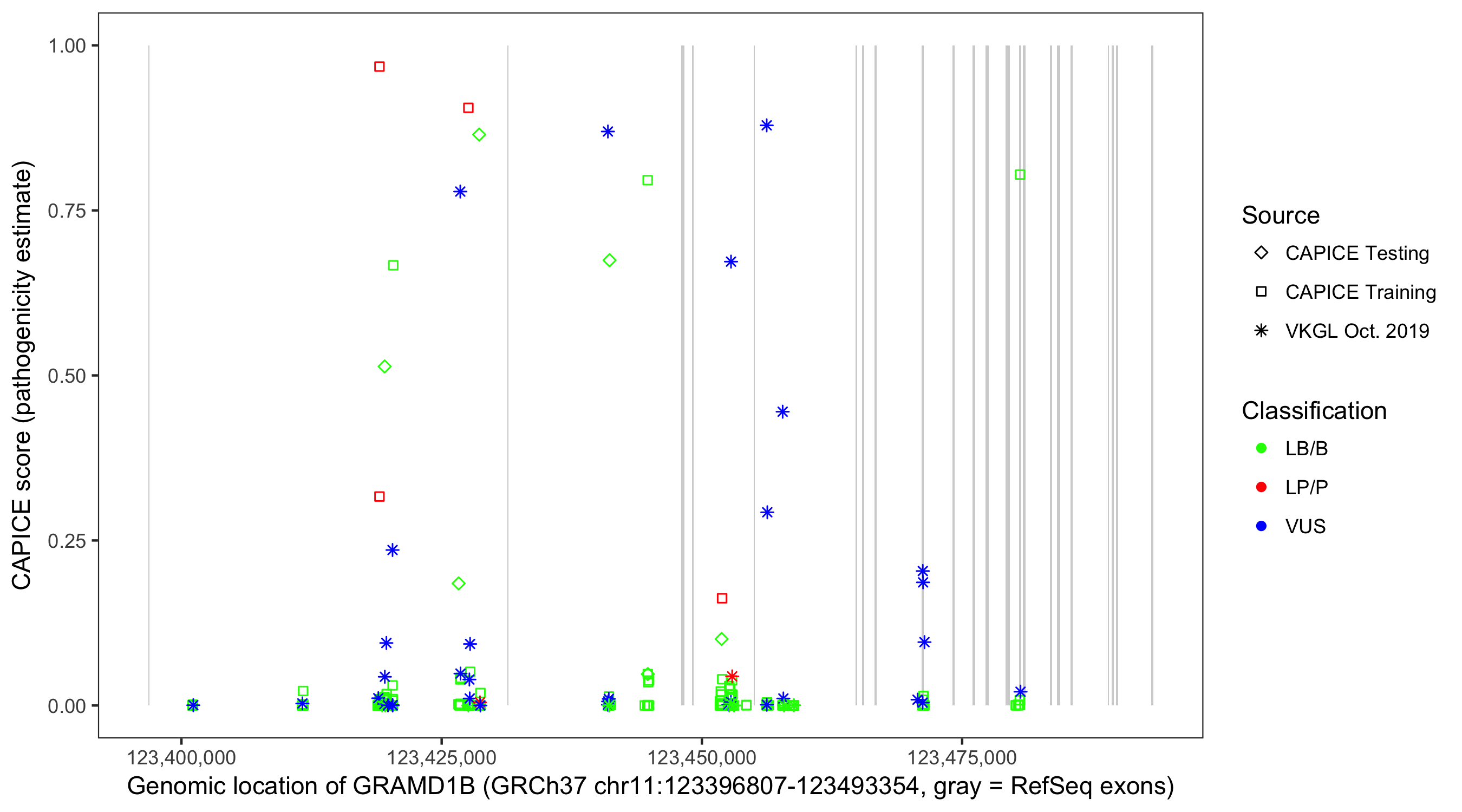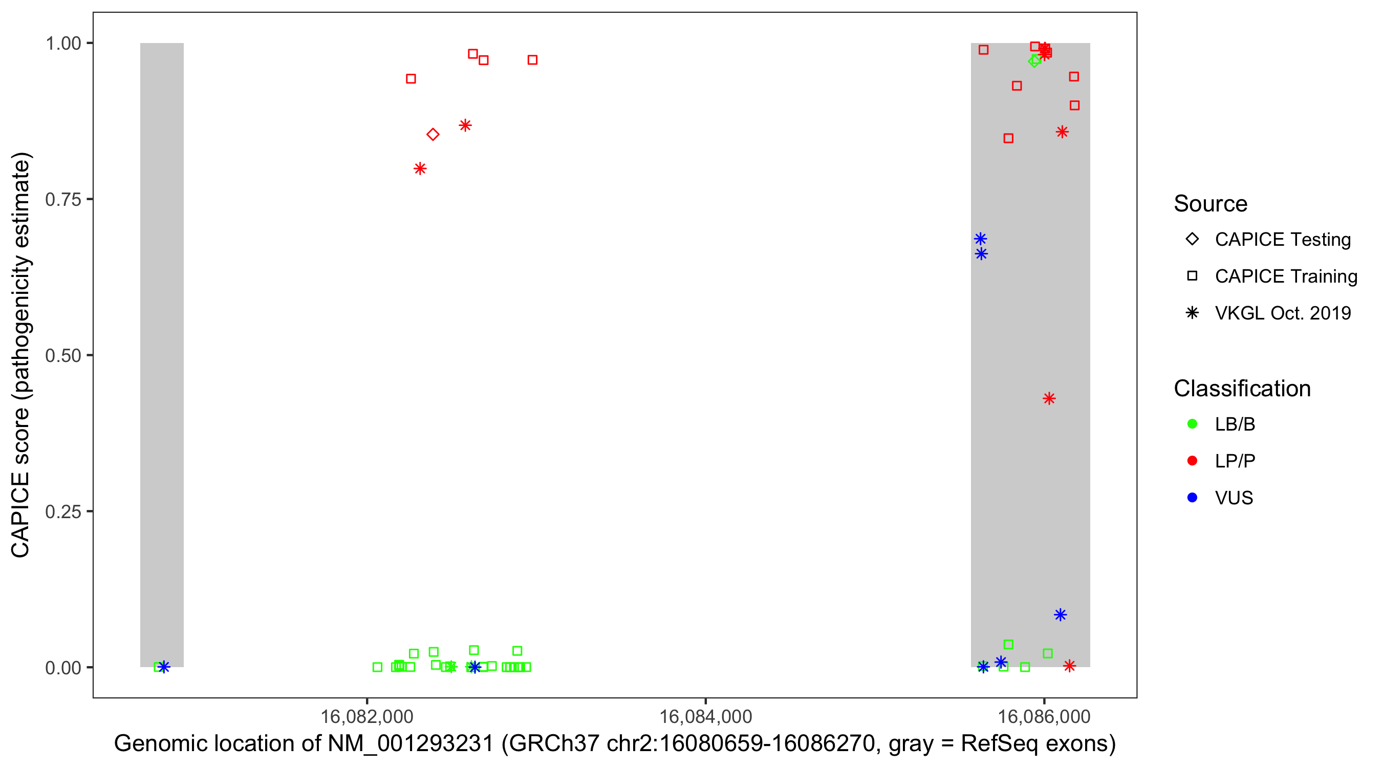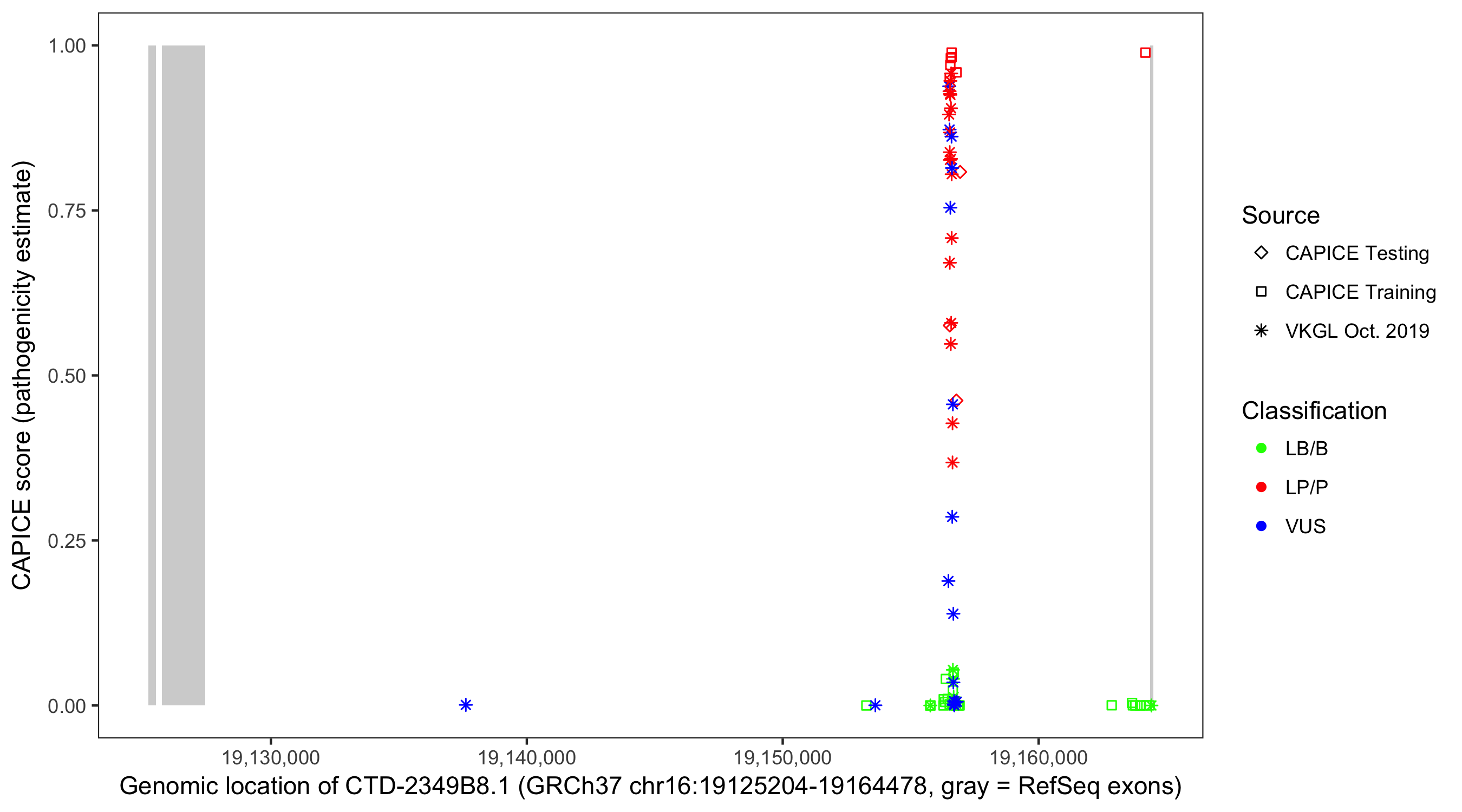 Shown are CAPICE train/test variants plus VKGL Oct 2019.