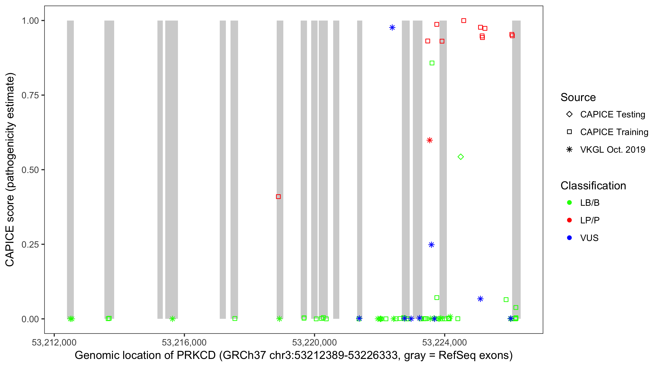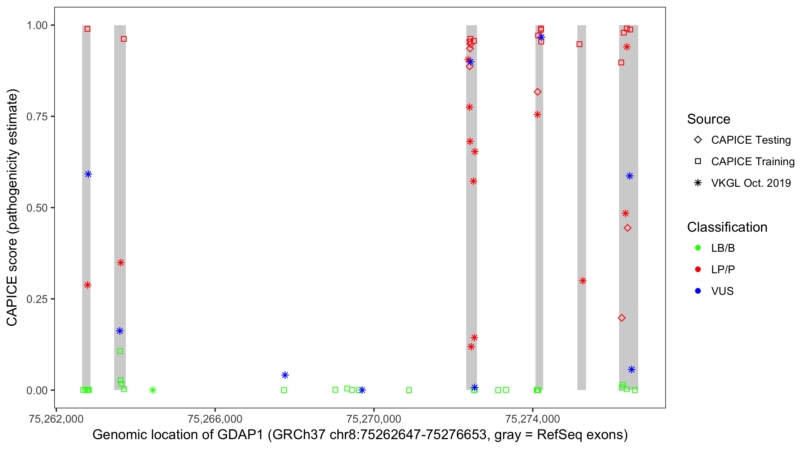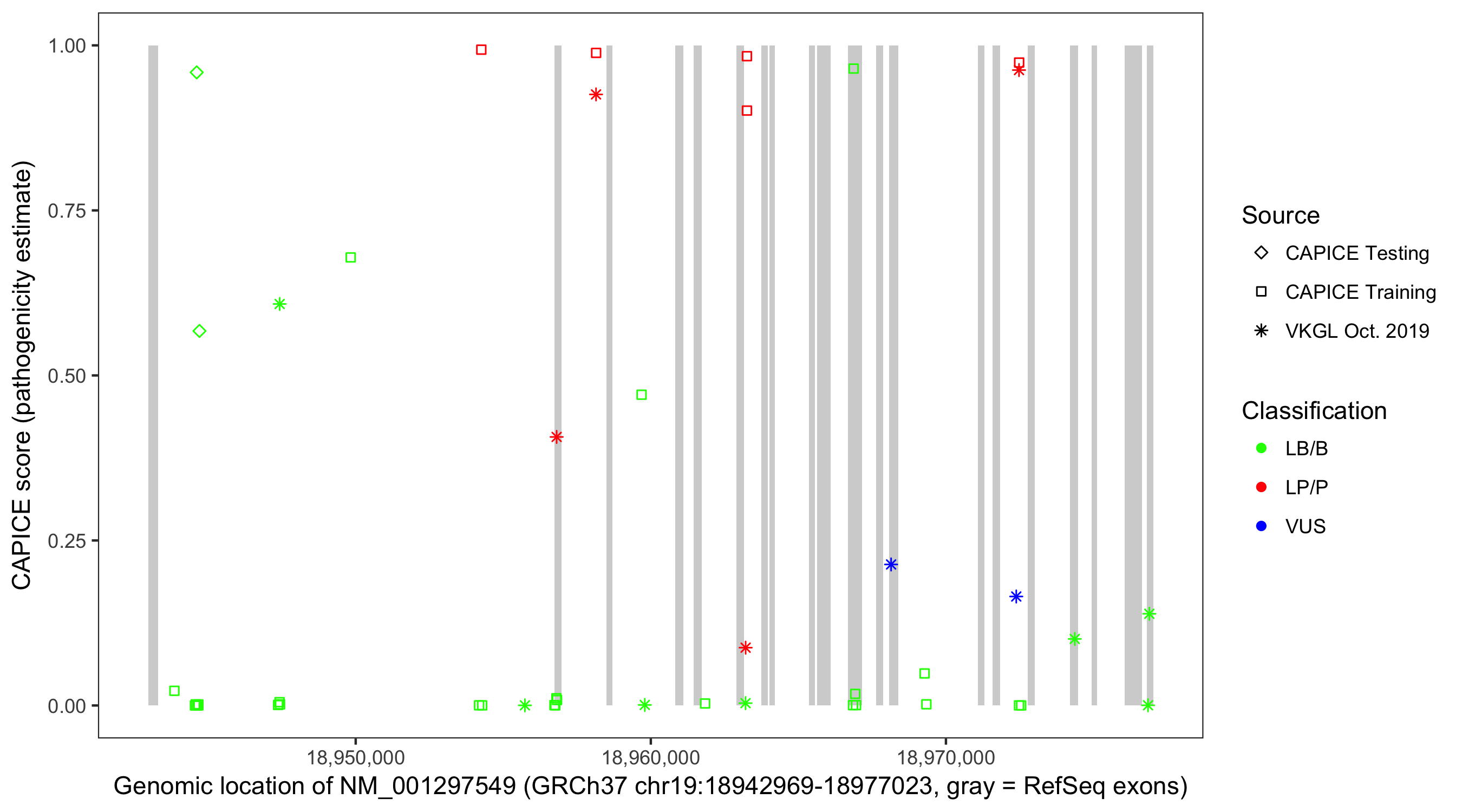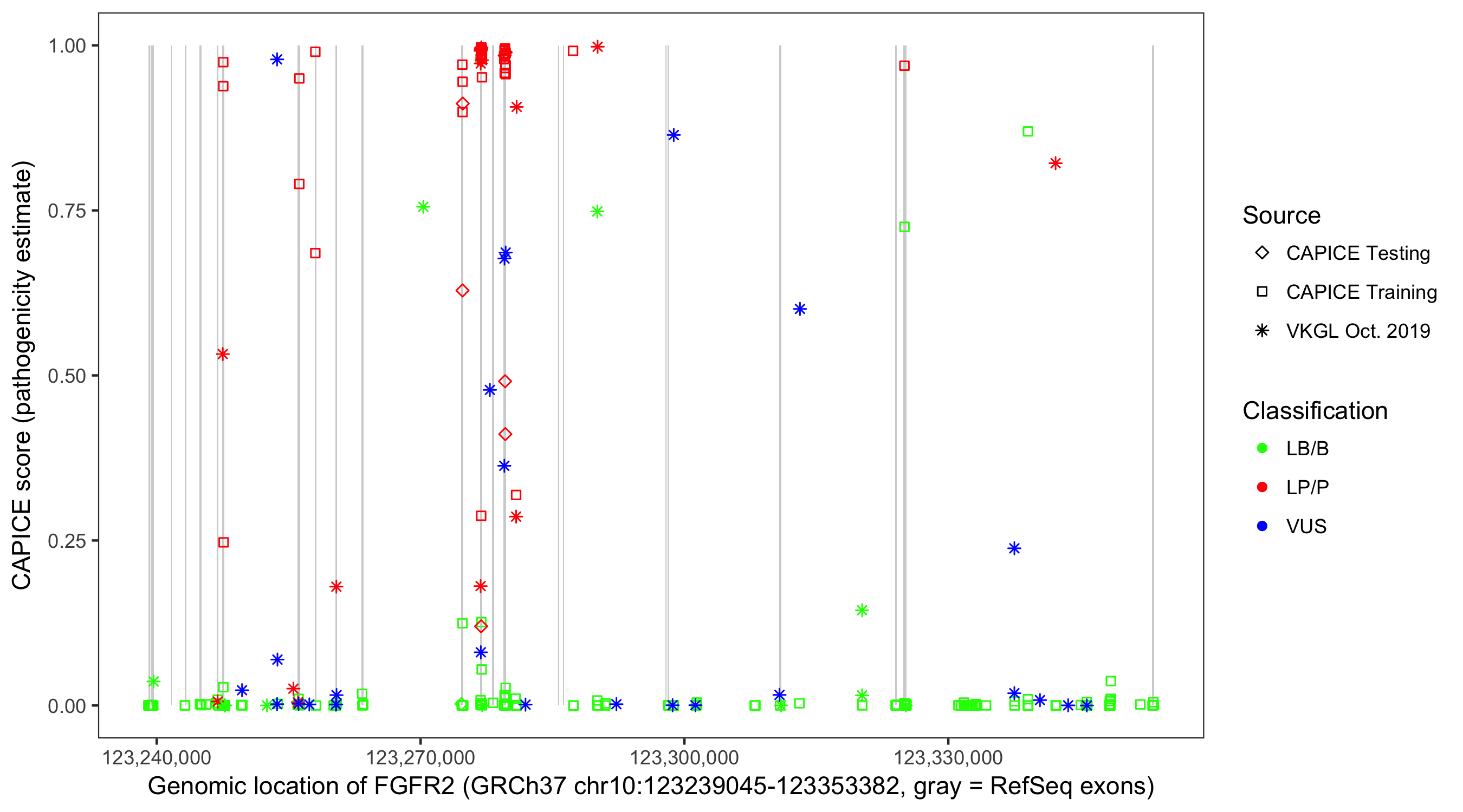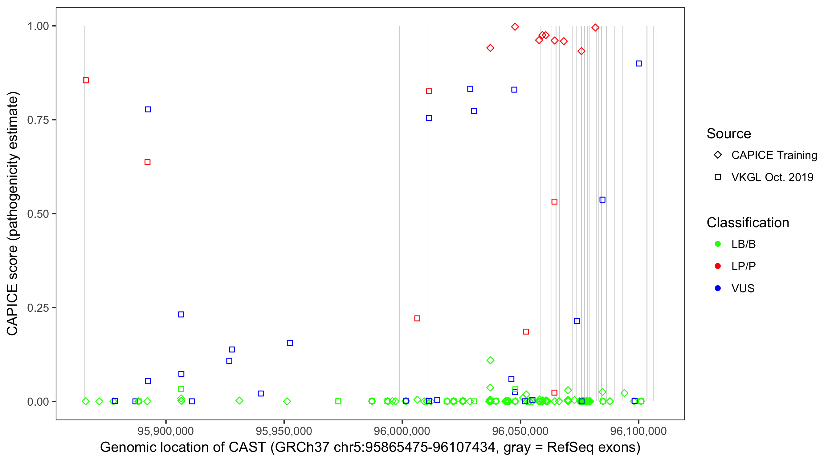 Shown are CAPICE train/test variants plus VKGL Oct 2019.