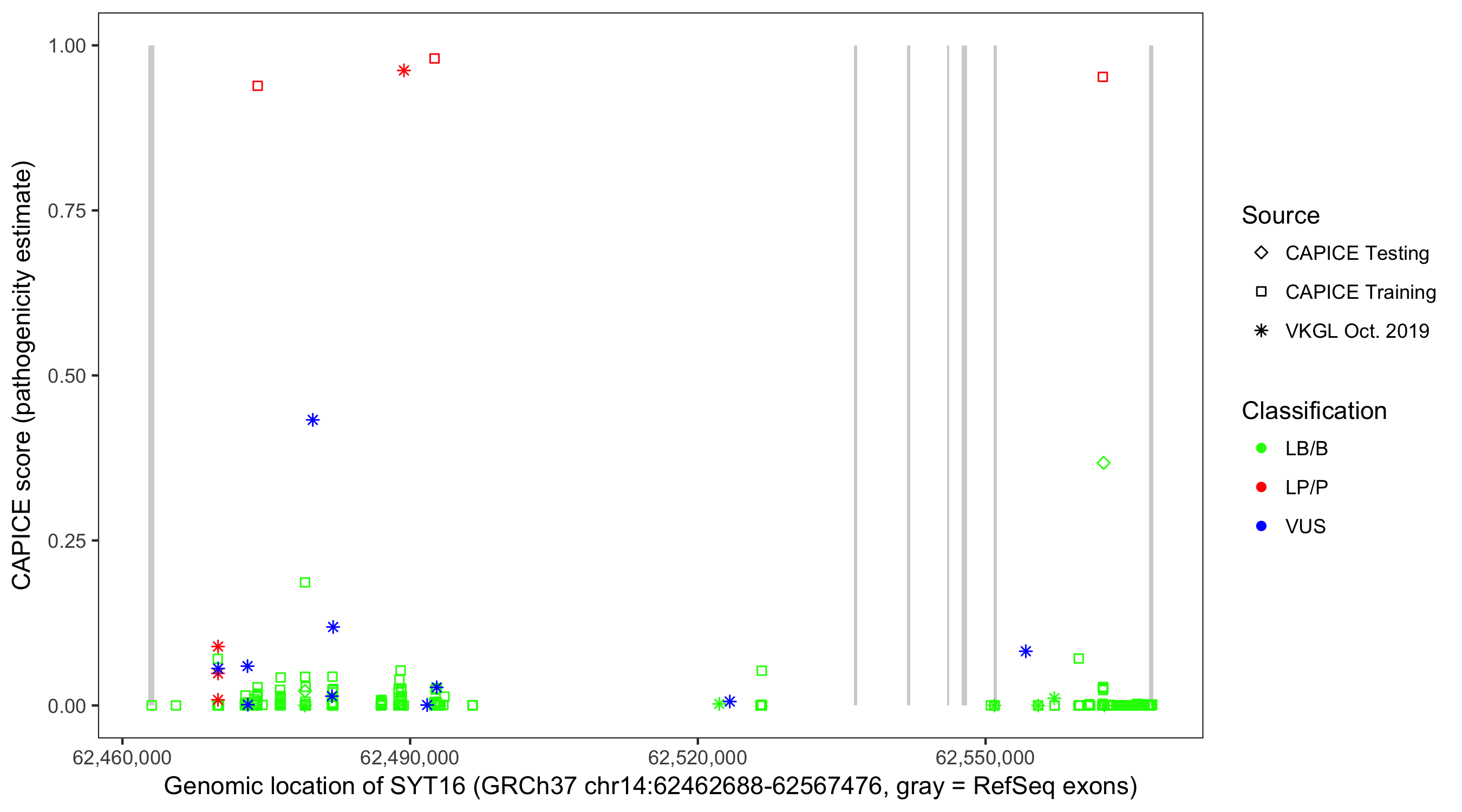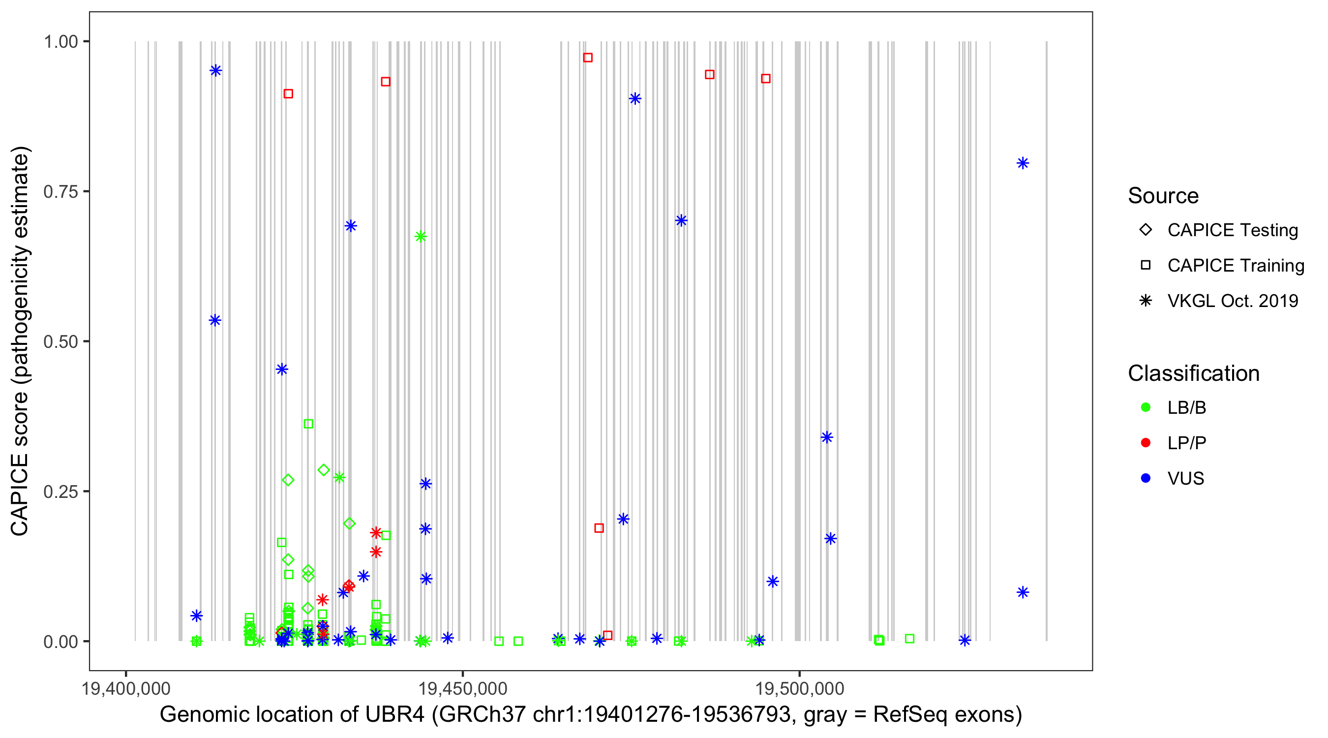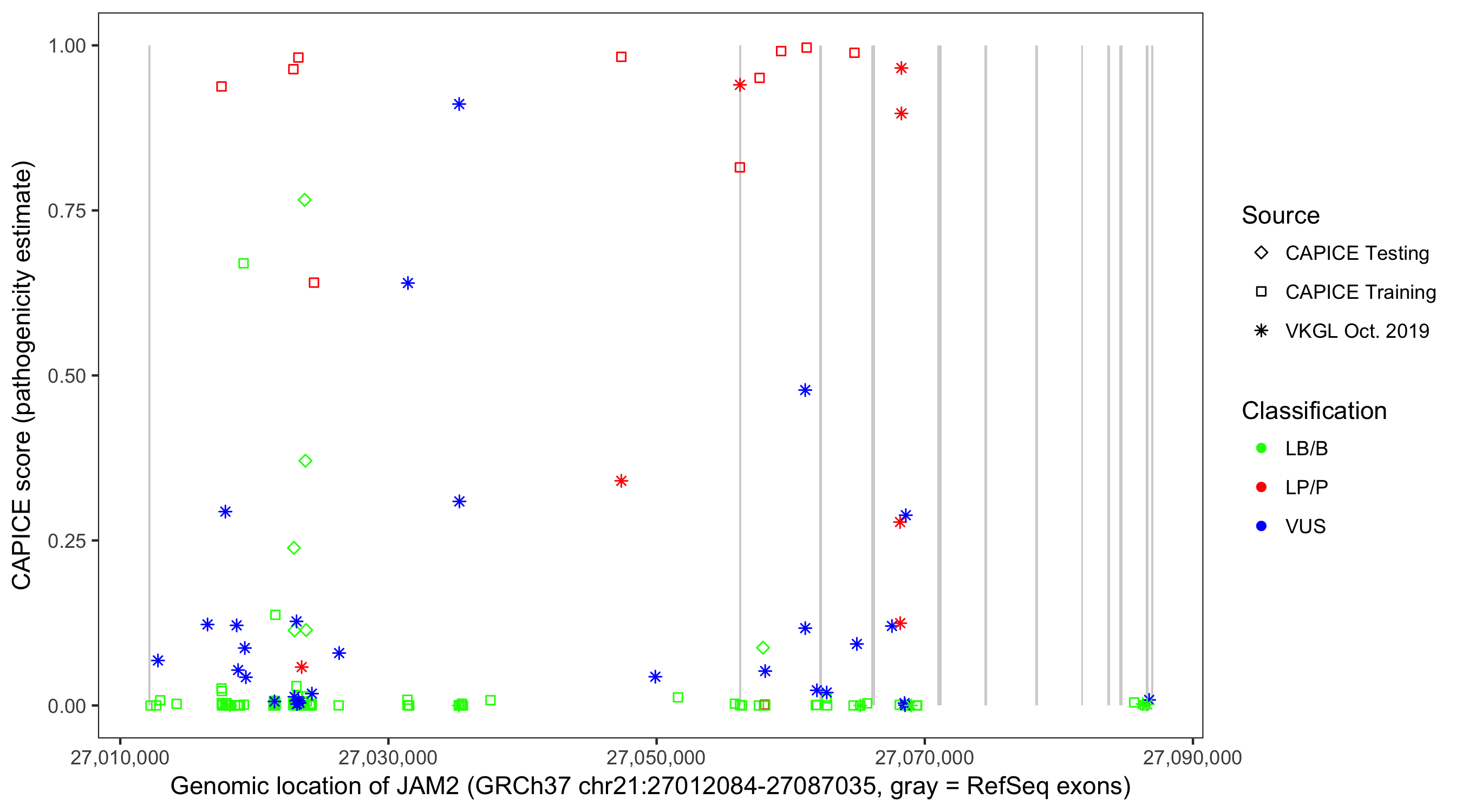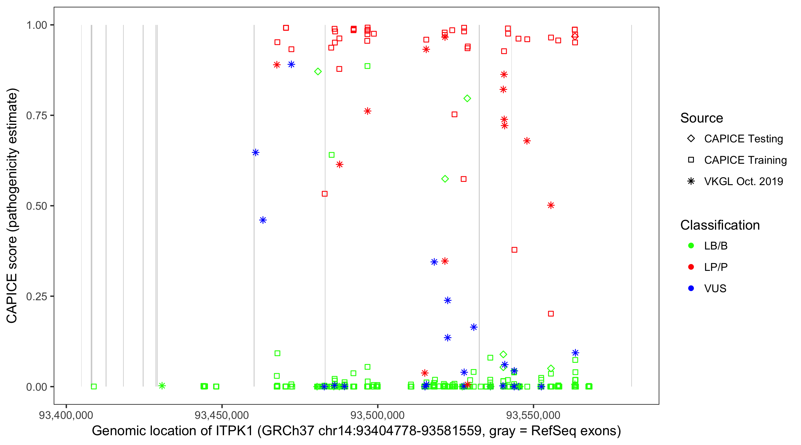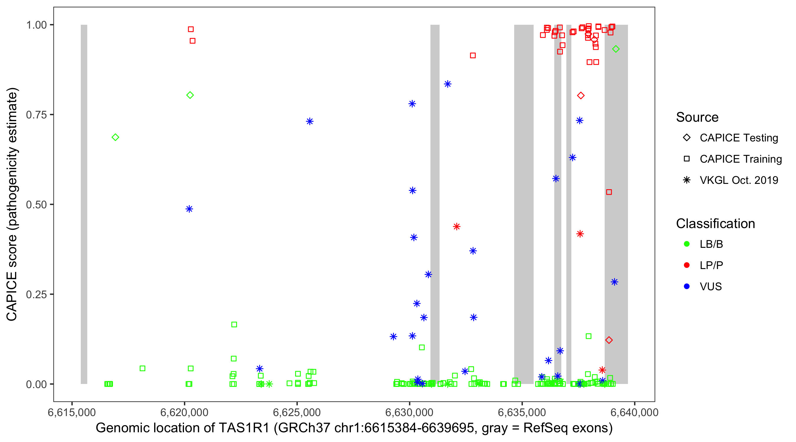 Shown are CAPICE train/test variants plus VKGL Oct 2019.