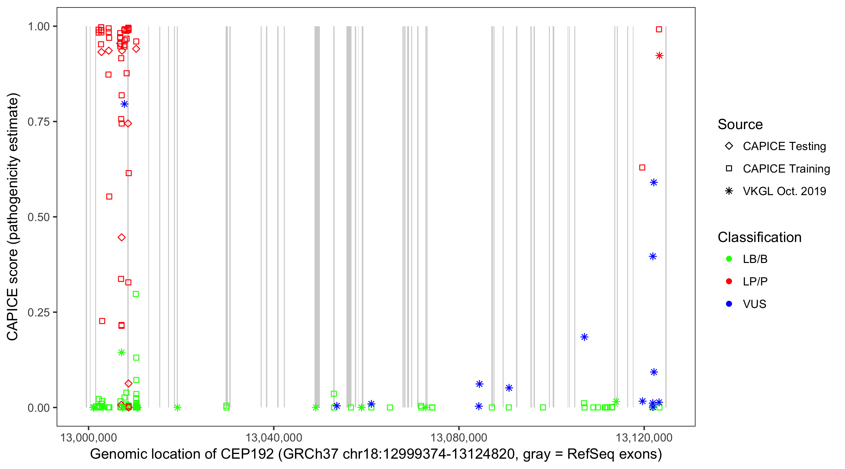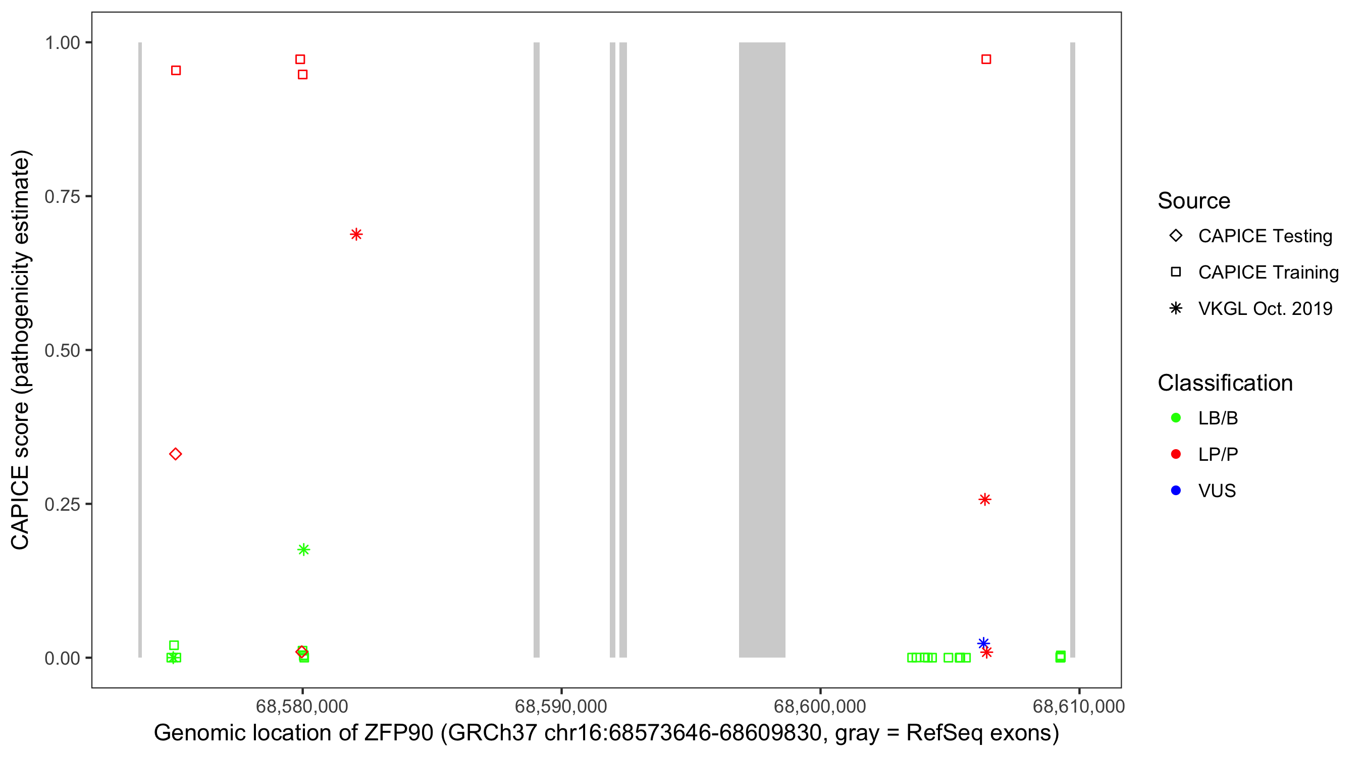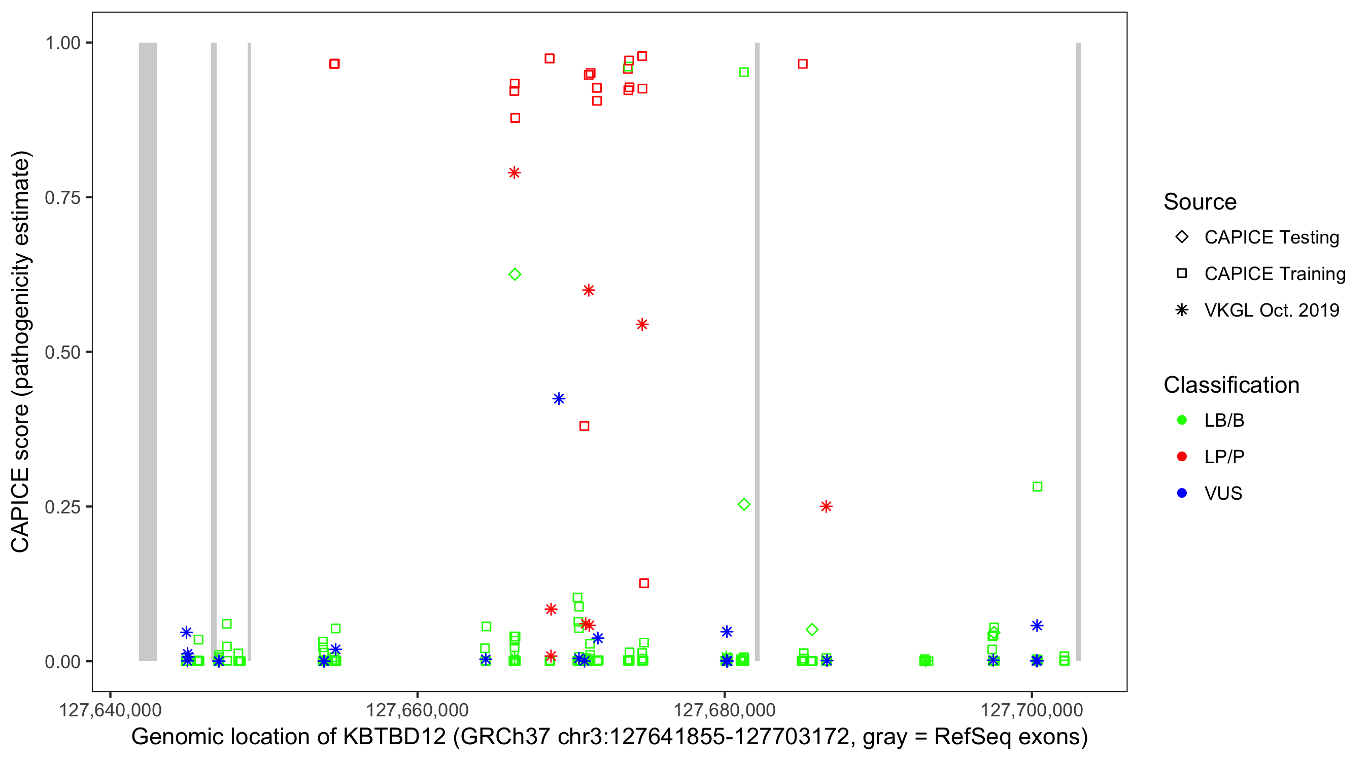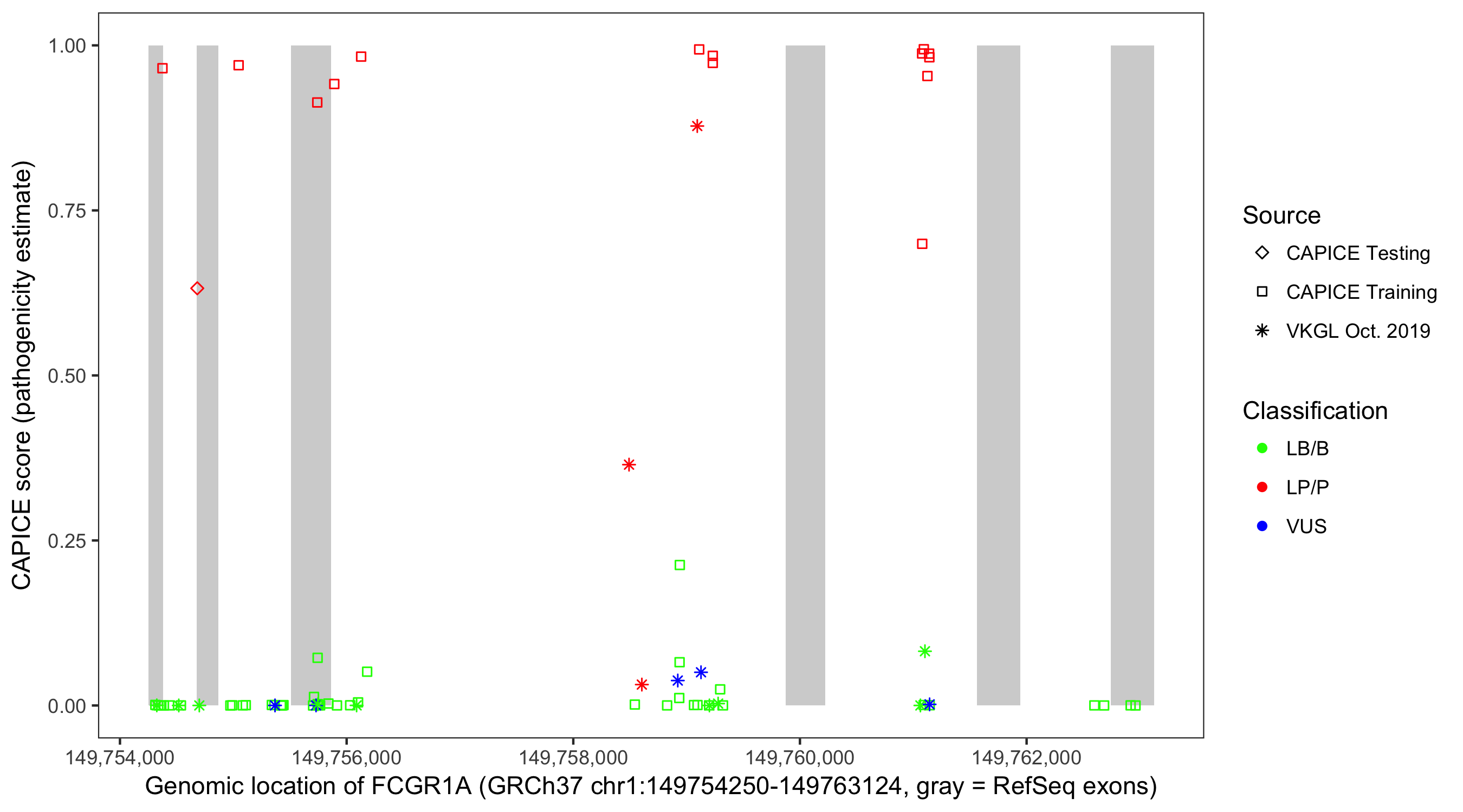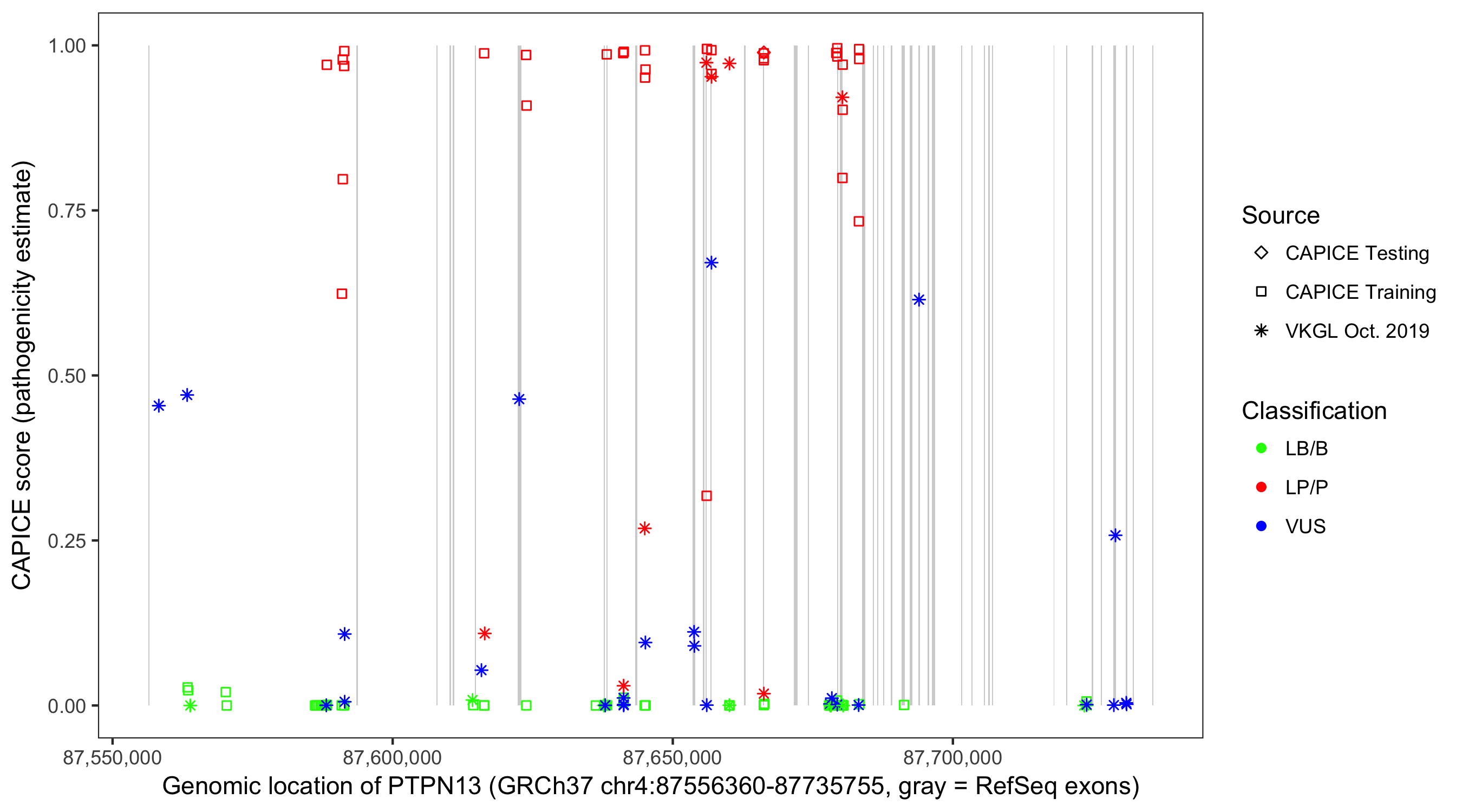 Shown are CAPICE train/test variants plus VKGL Oct 2019.