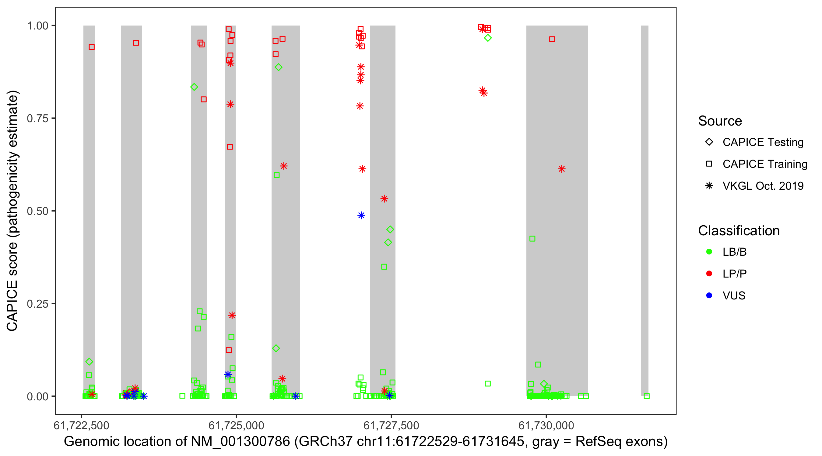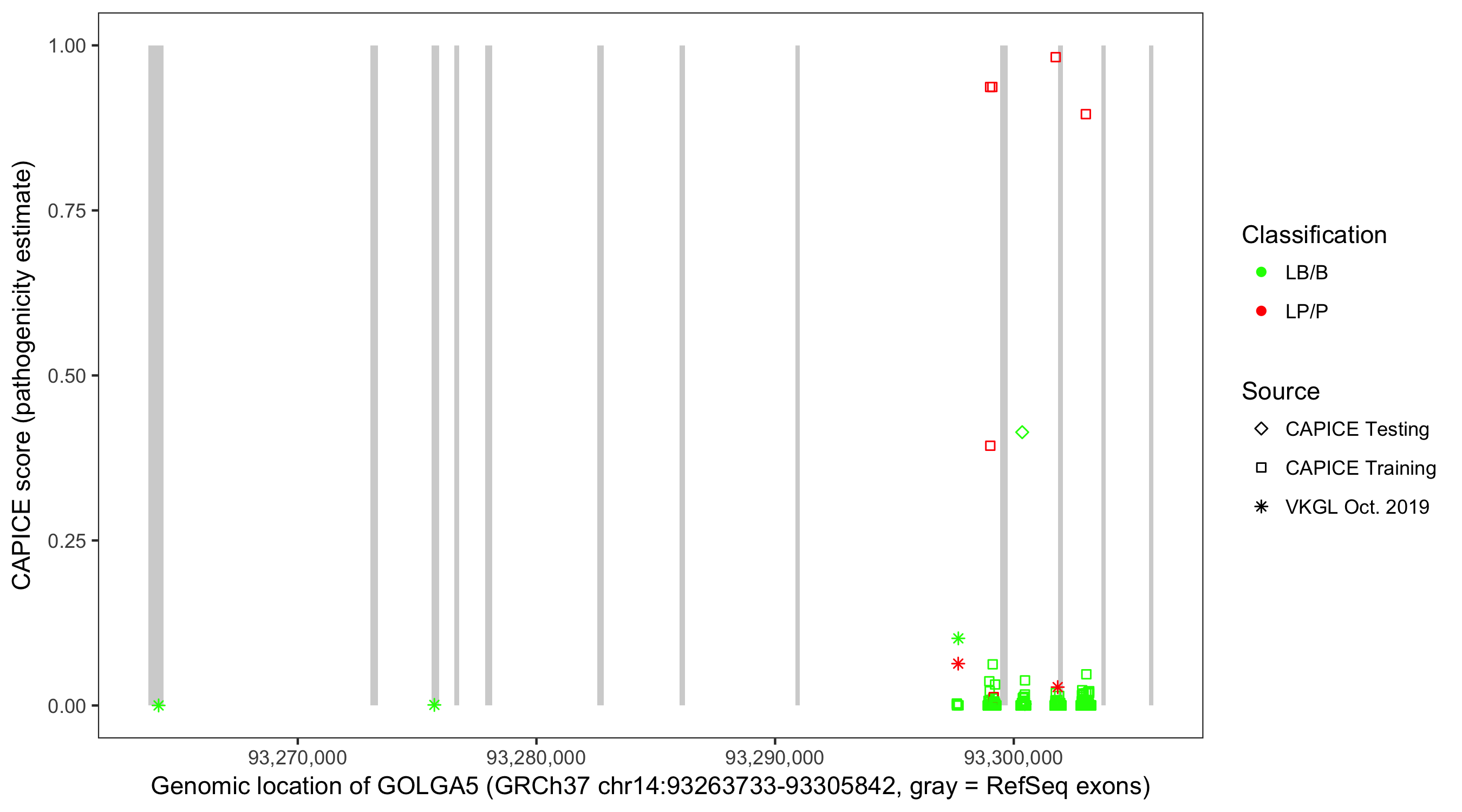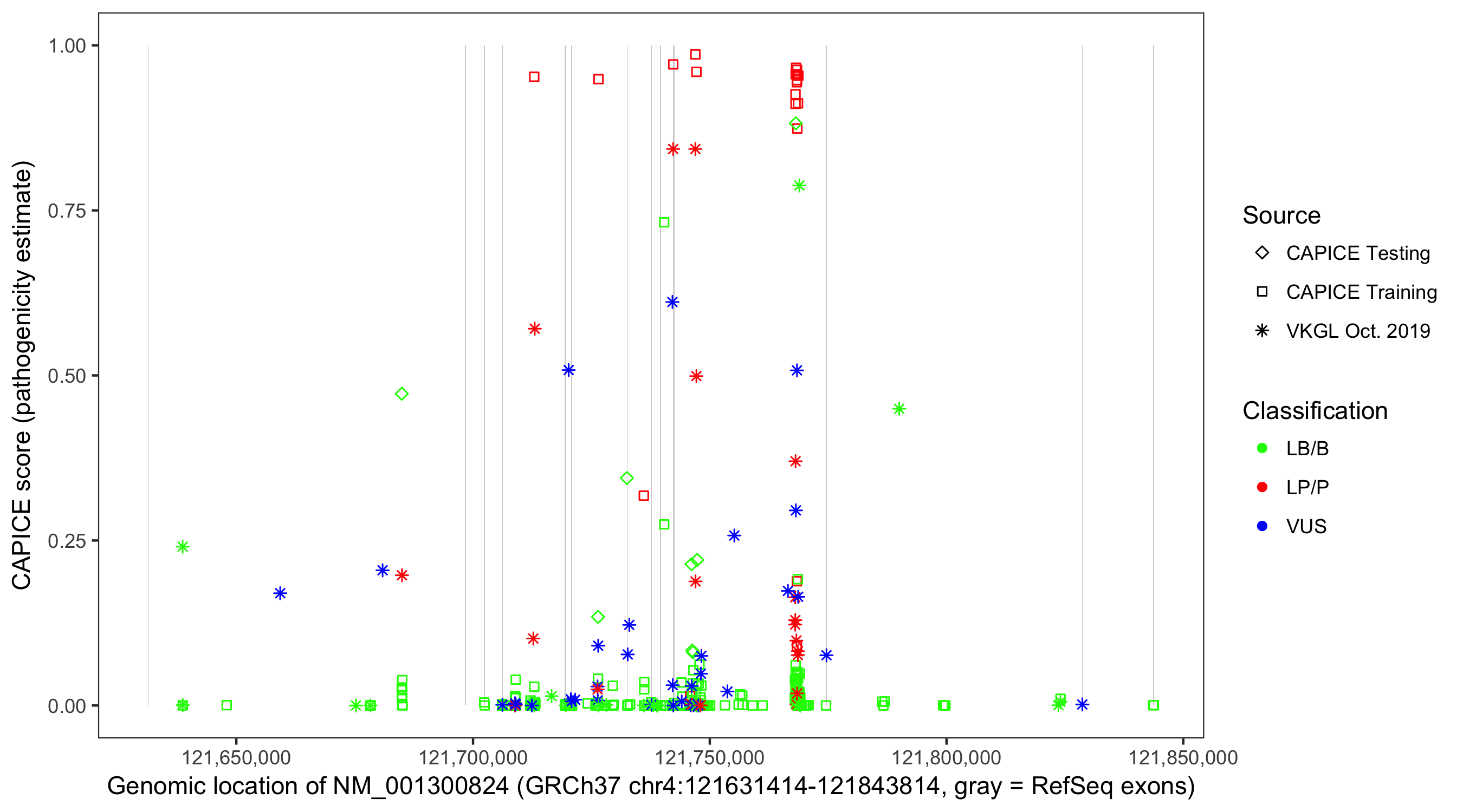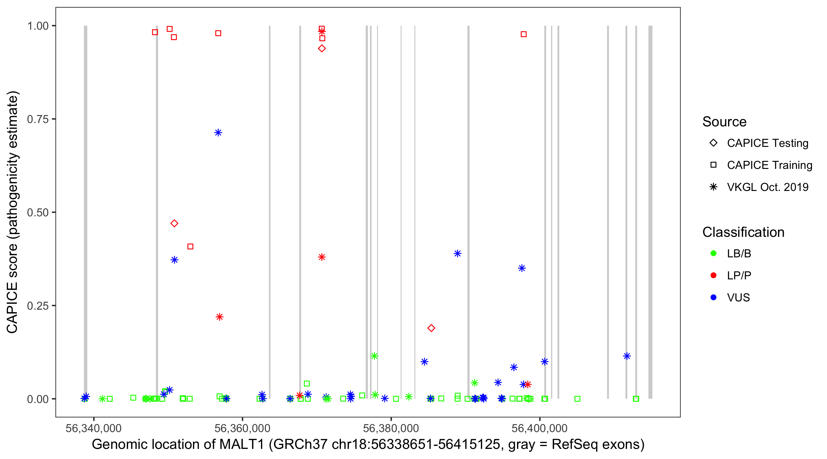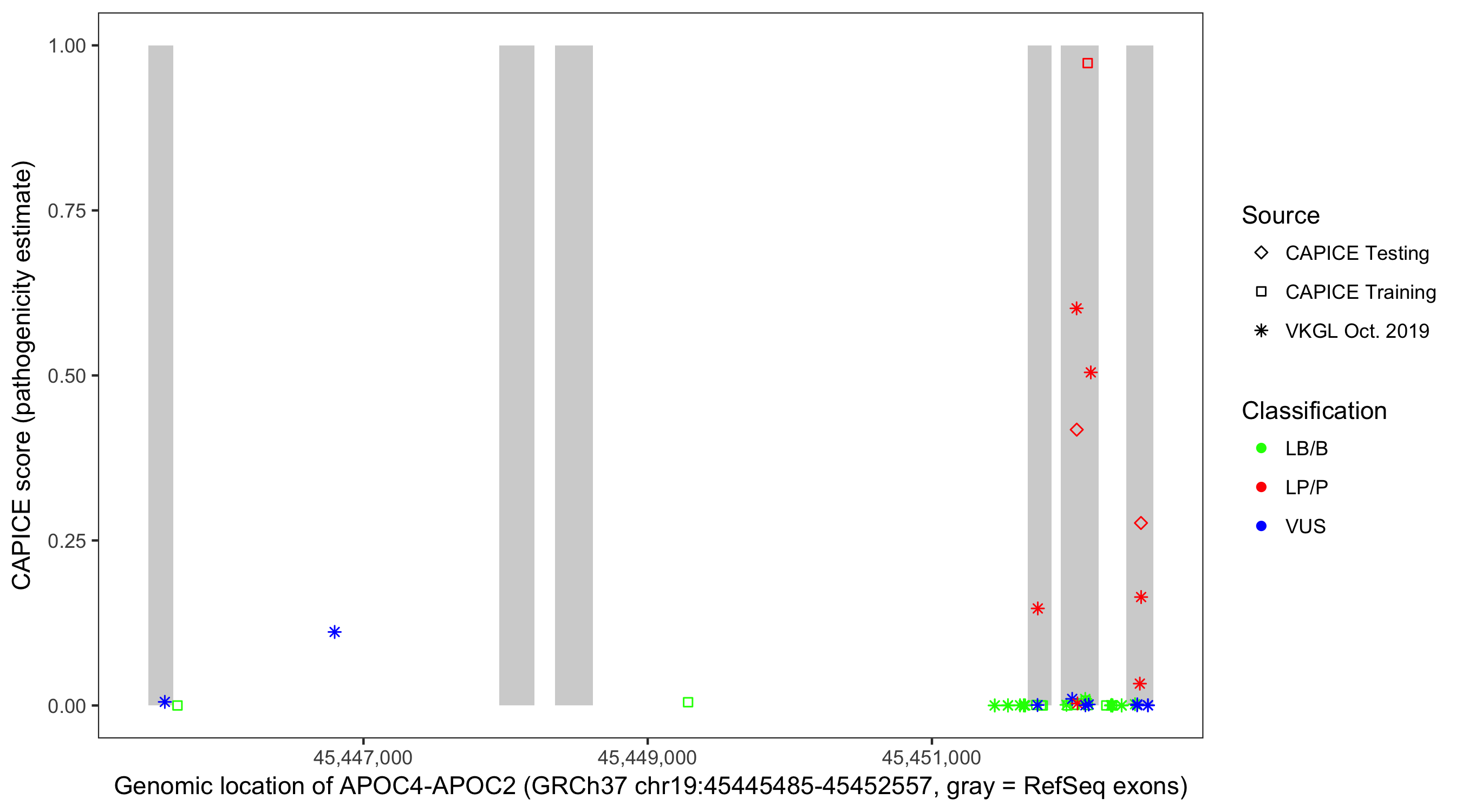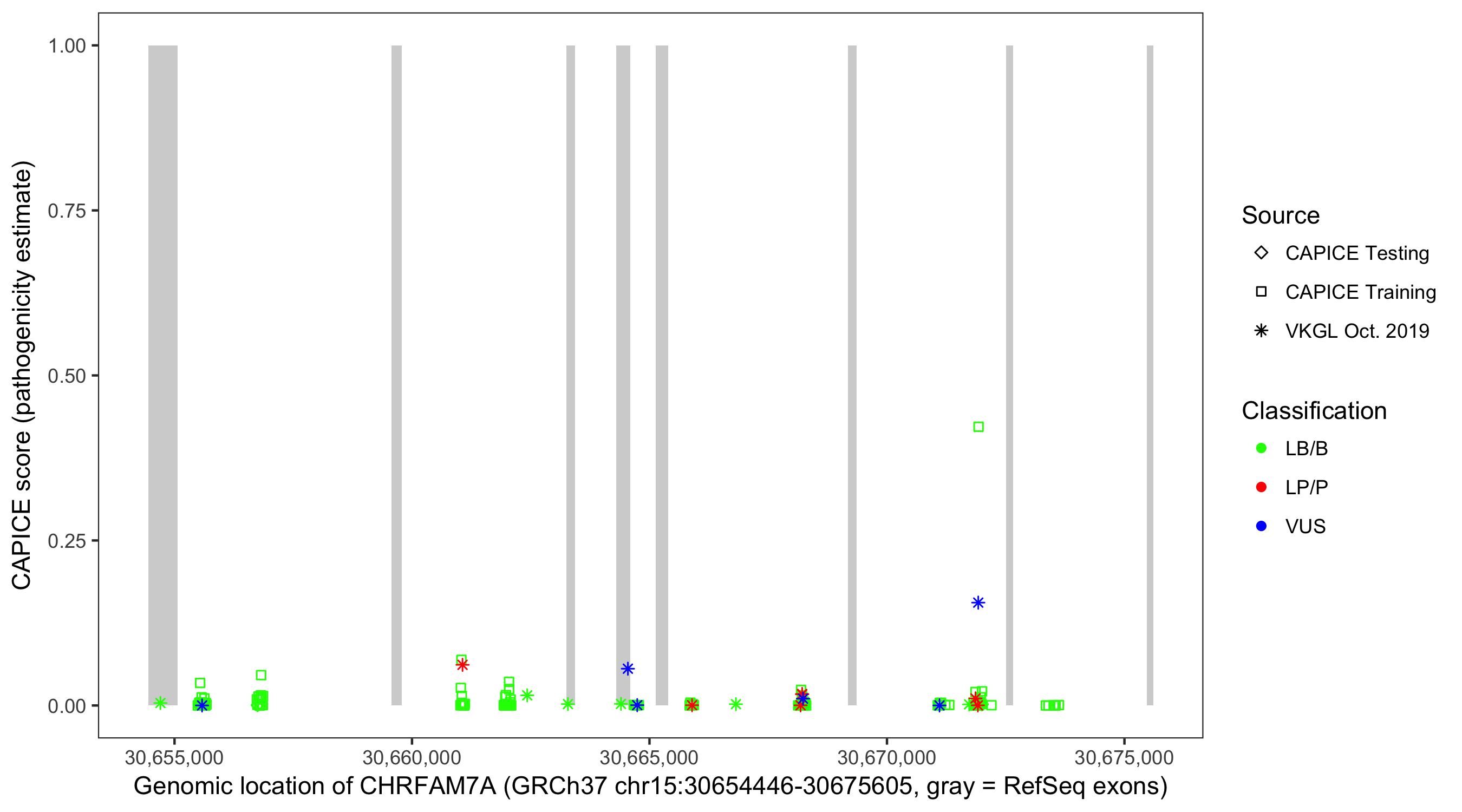 Shown are CAPICE train/test variants plus VKGL Oct 2019.