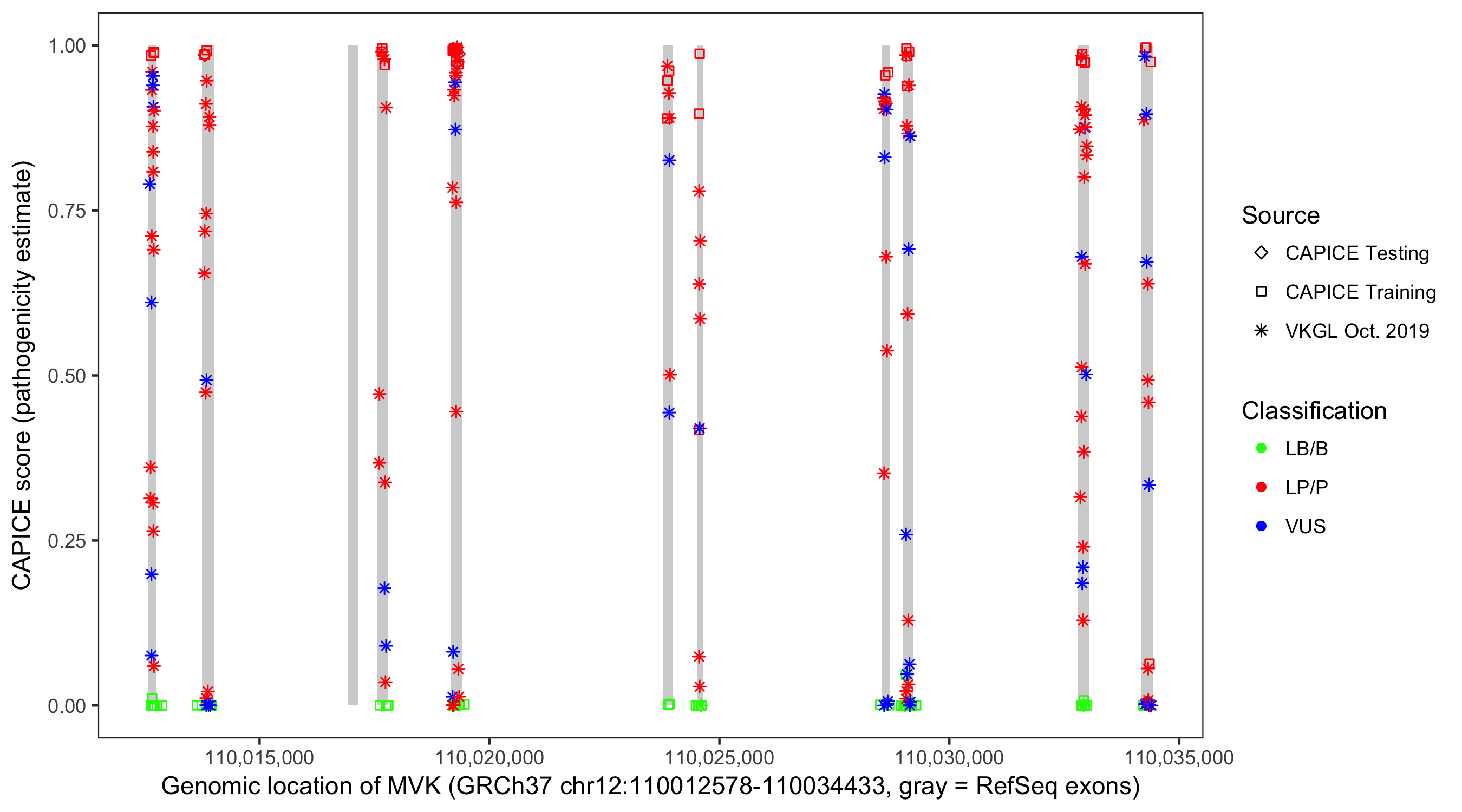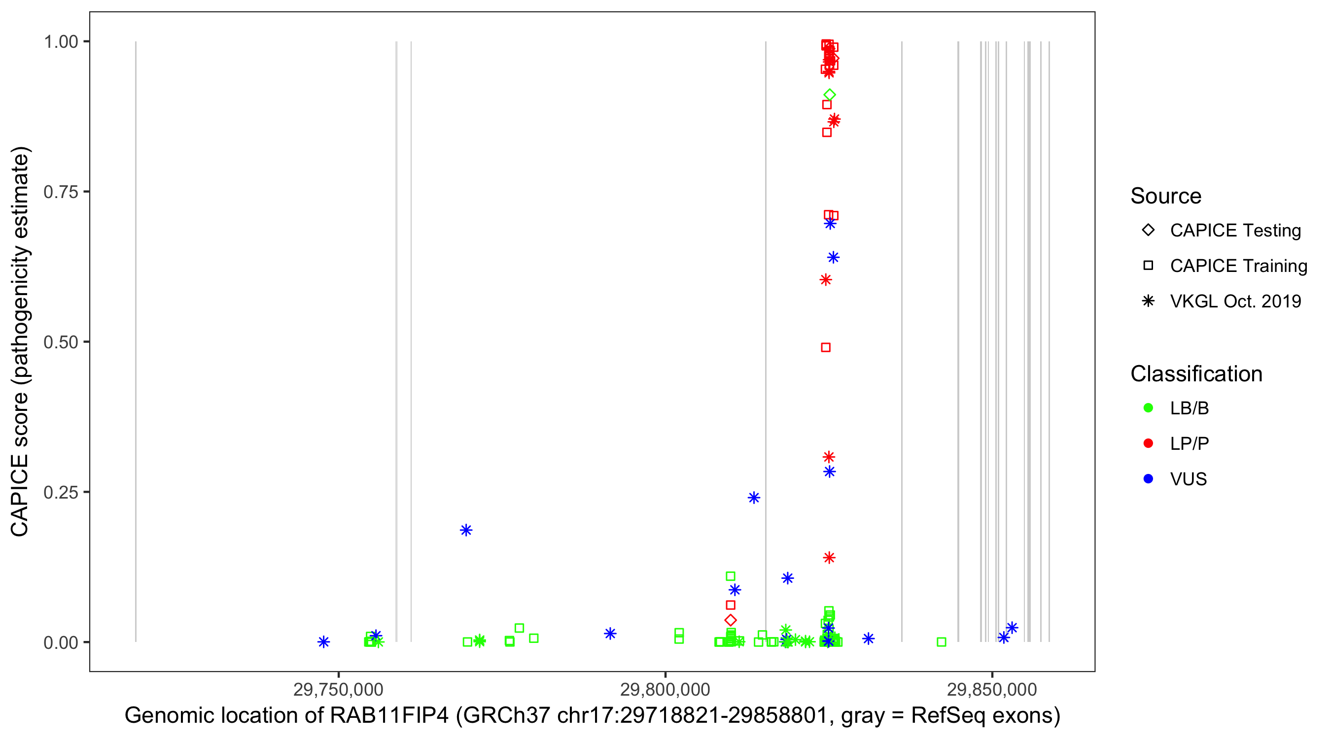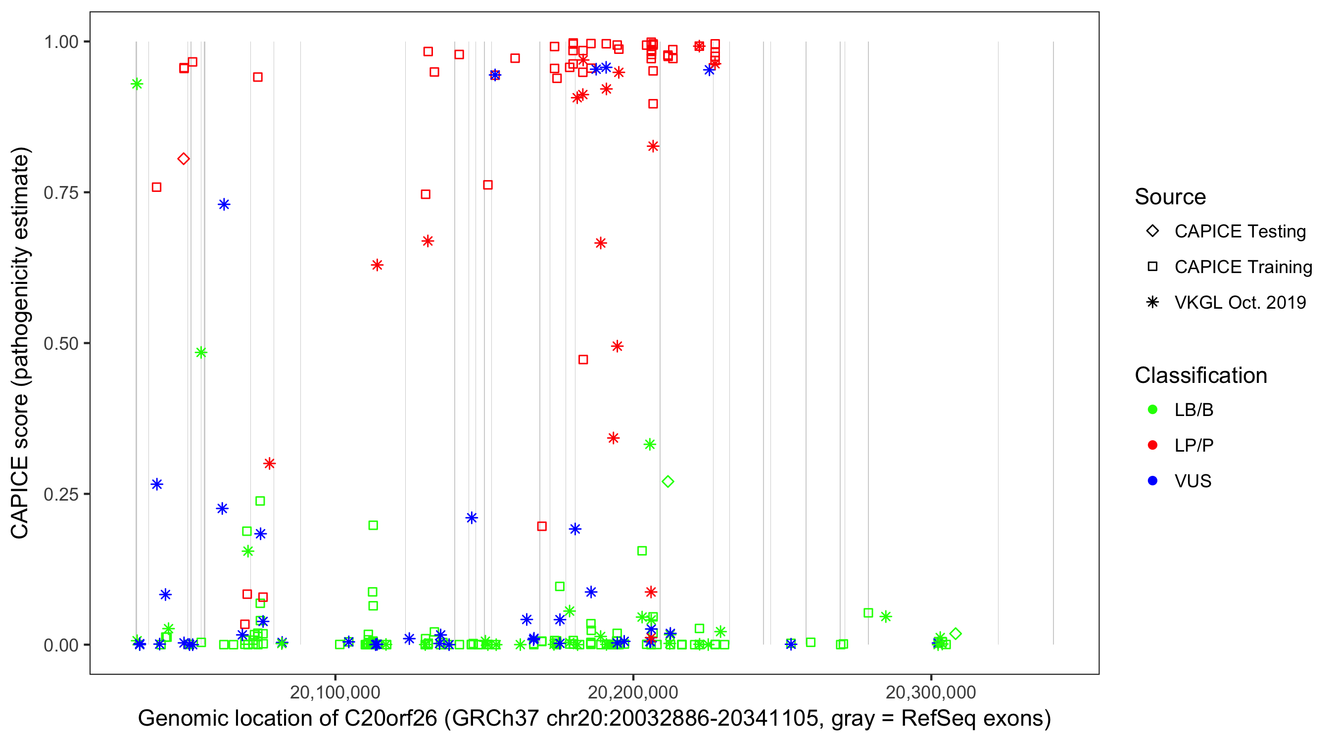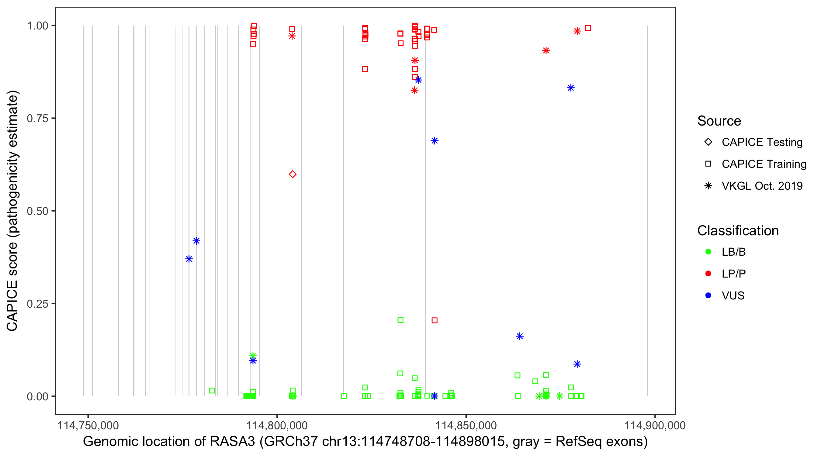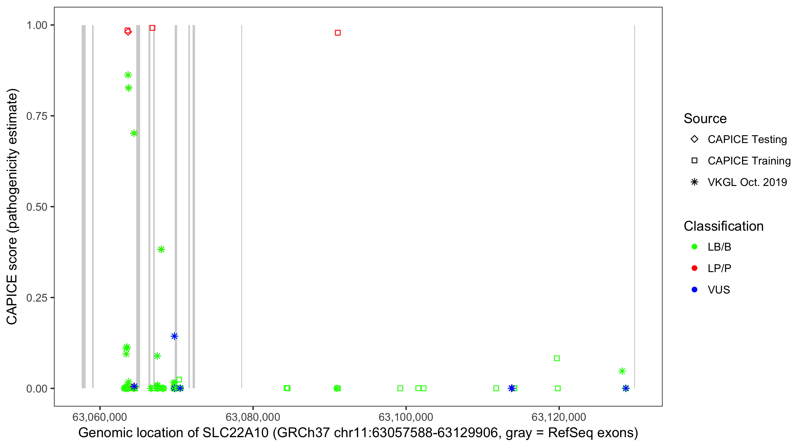 Shown are CAPICE train/test variants plus VKGL Oct 2019.