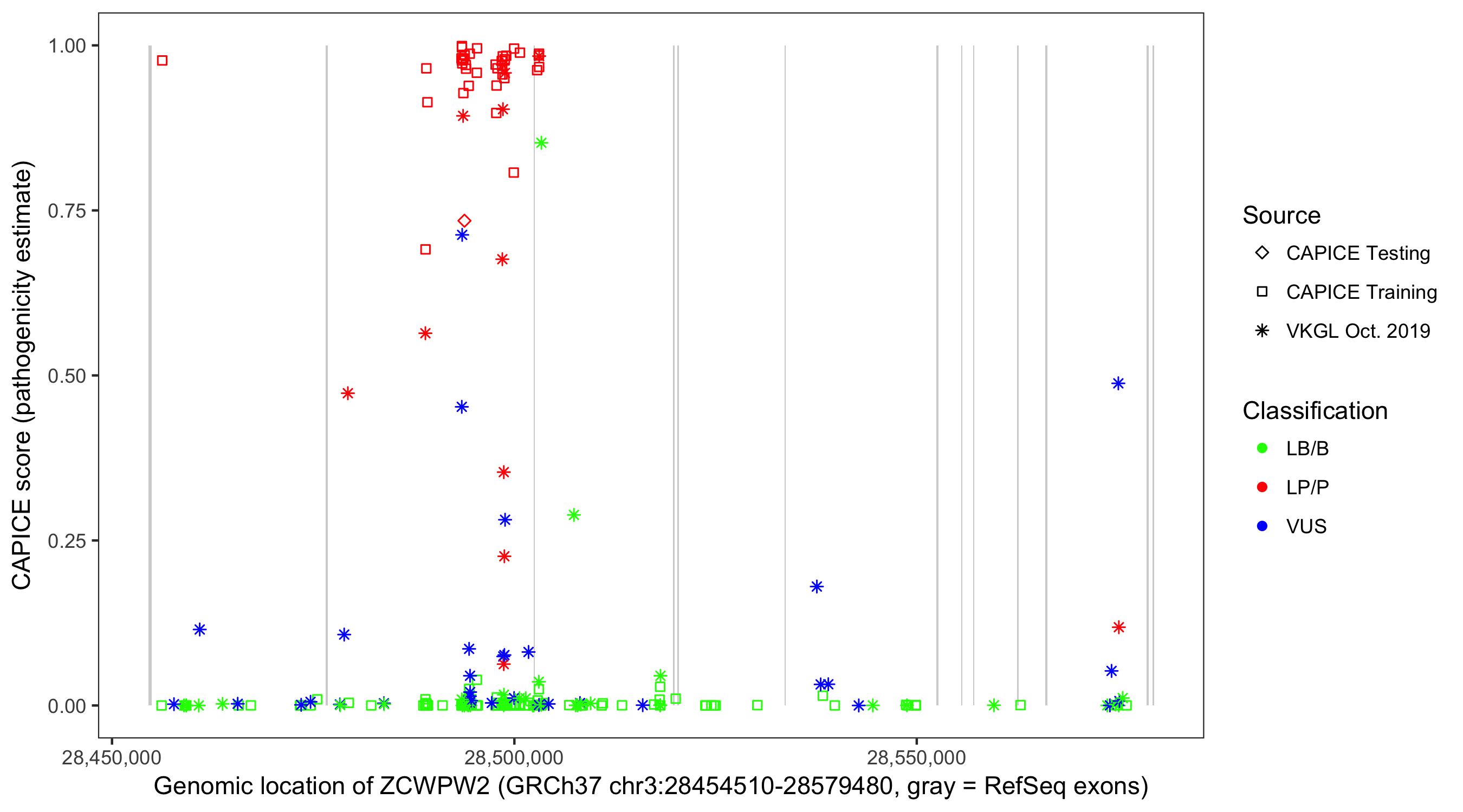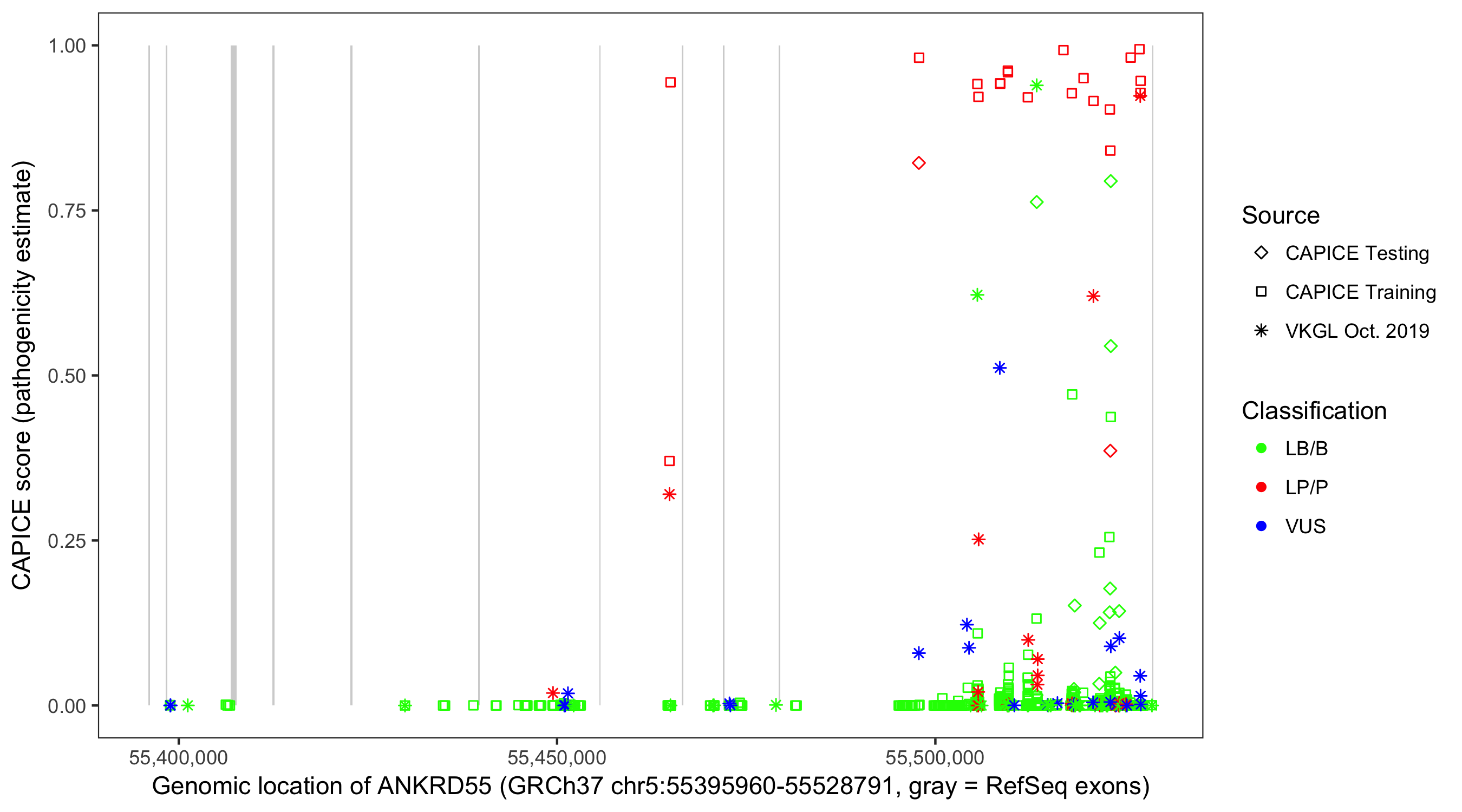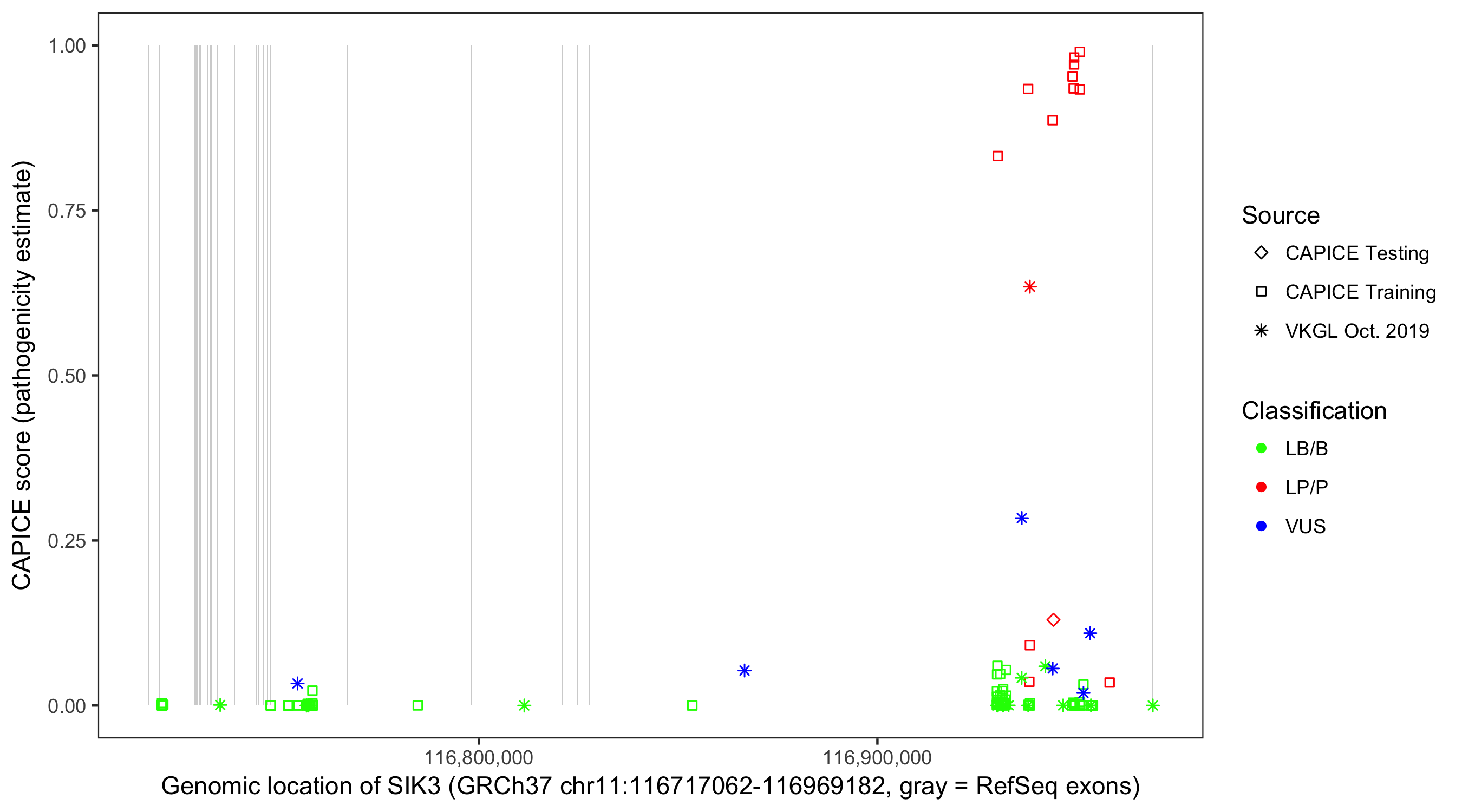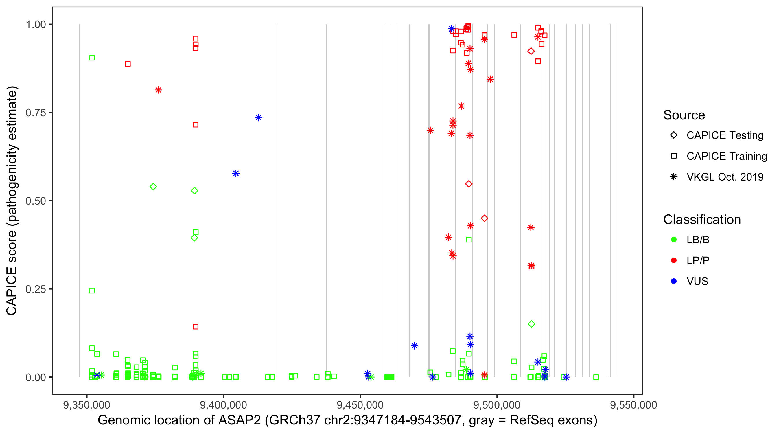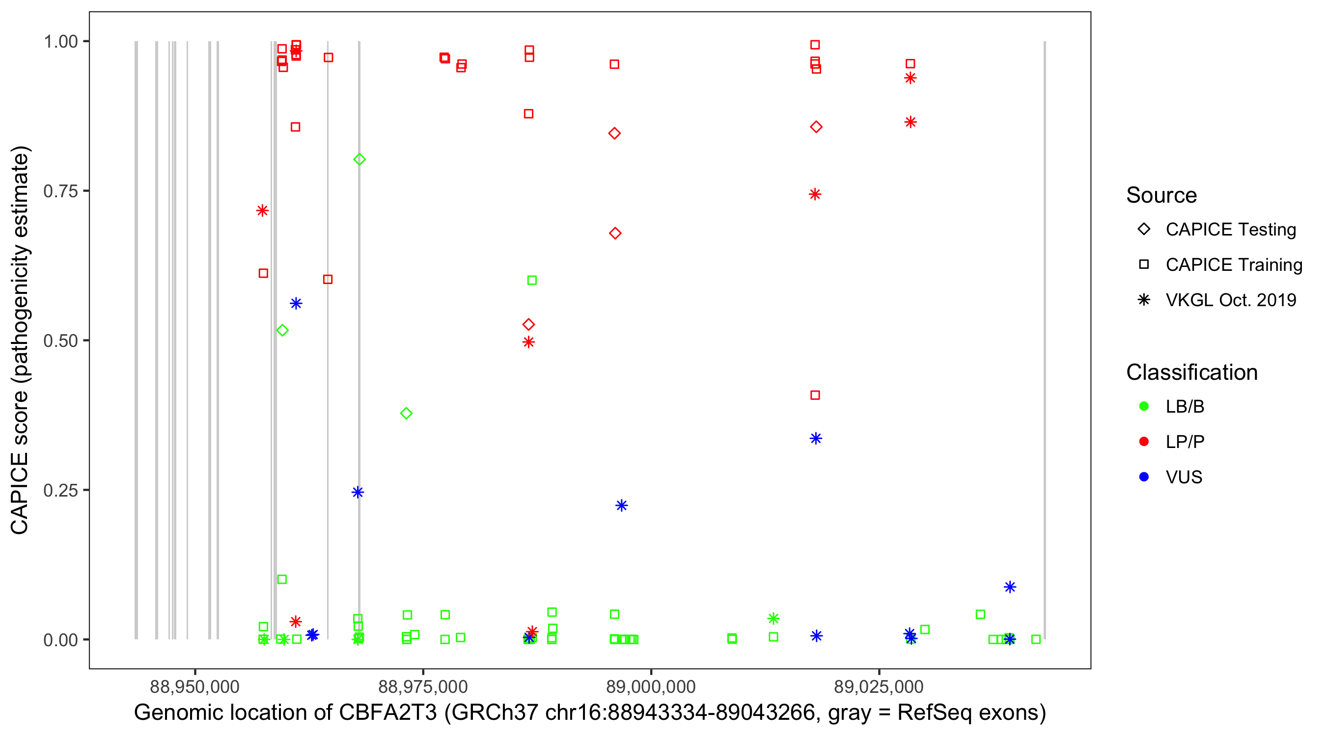 Shown are CAPICE train/test variants plus VKGL Oct 2019.