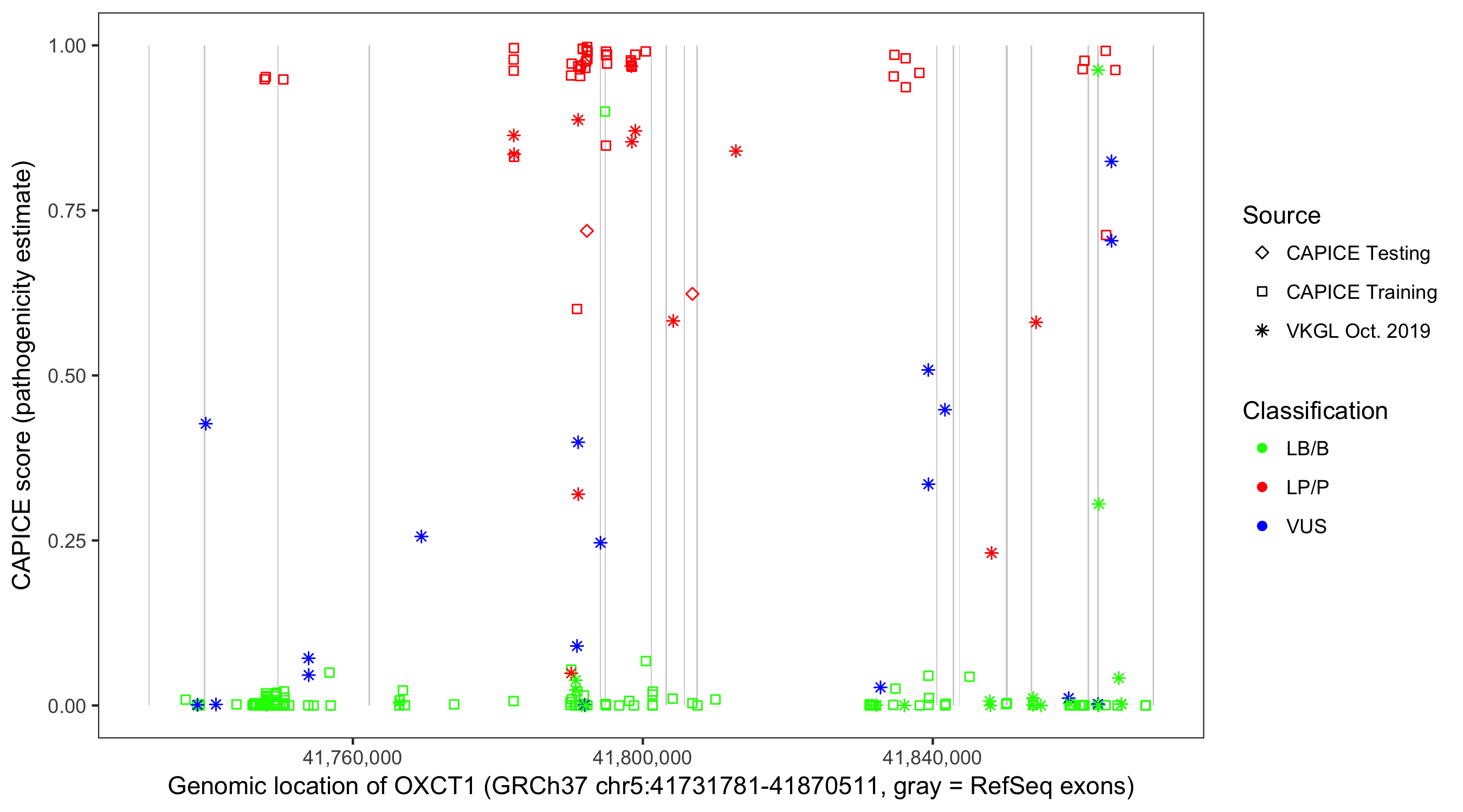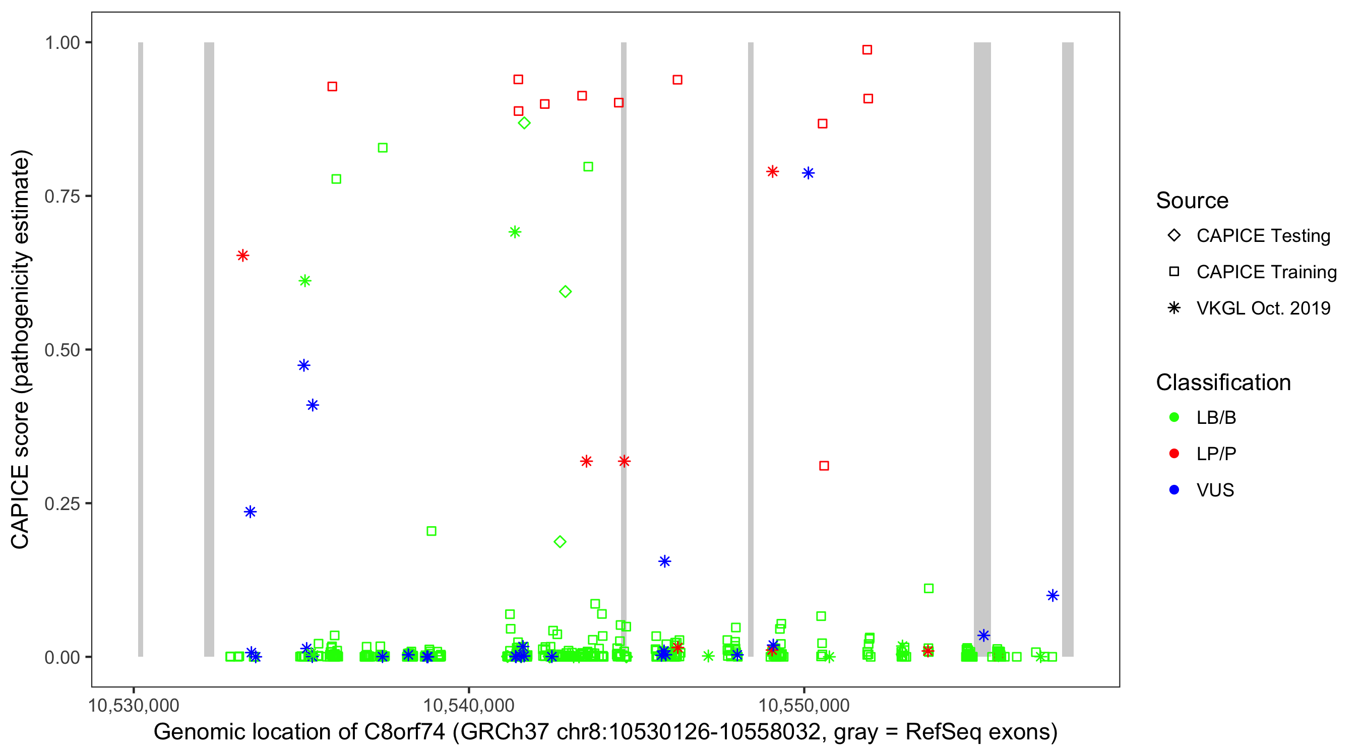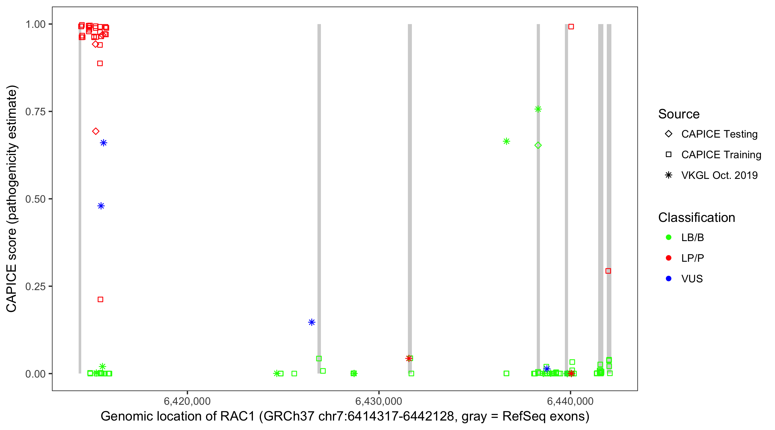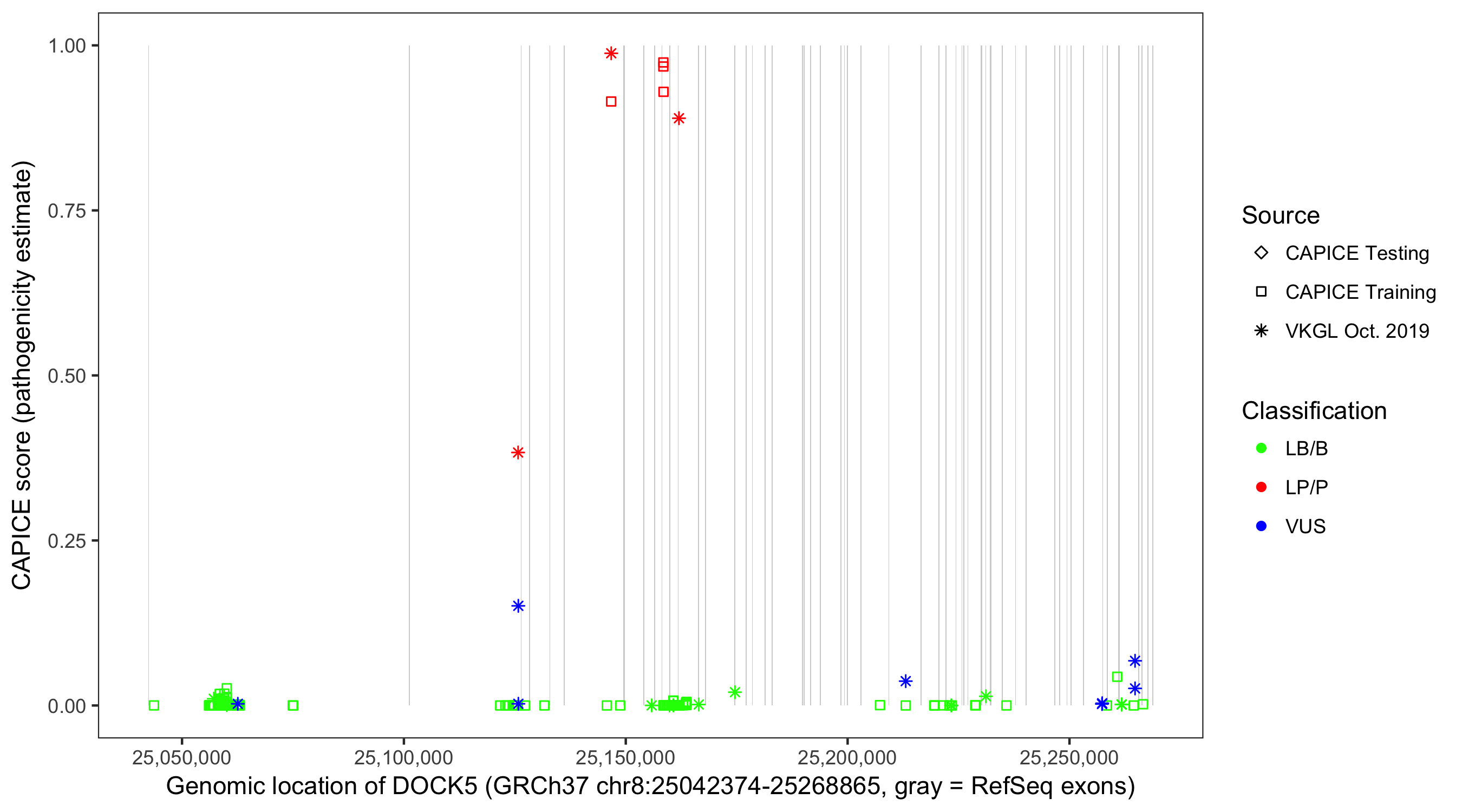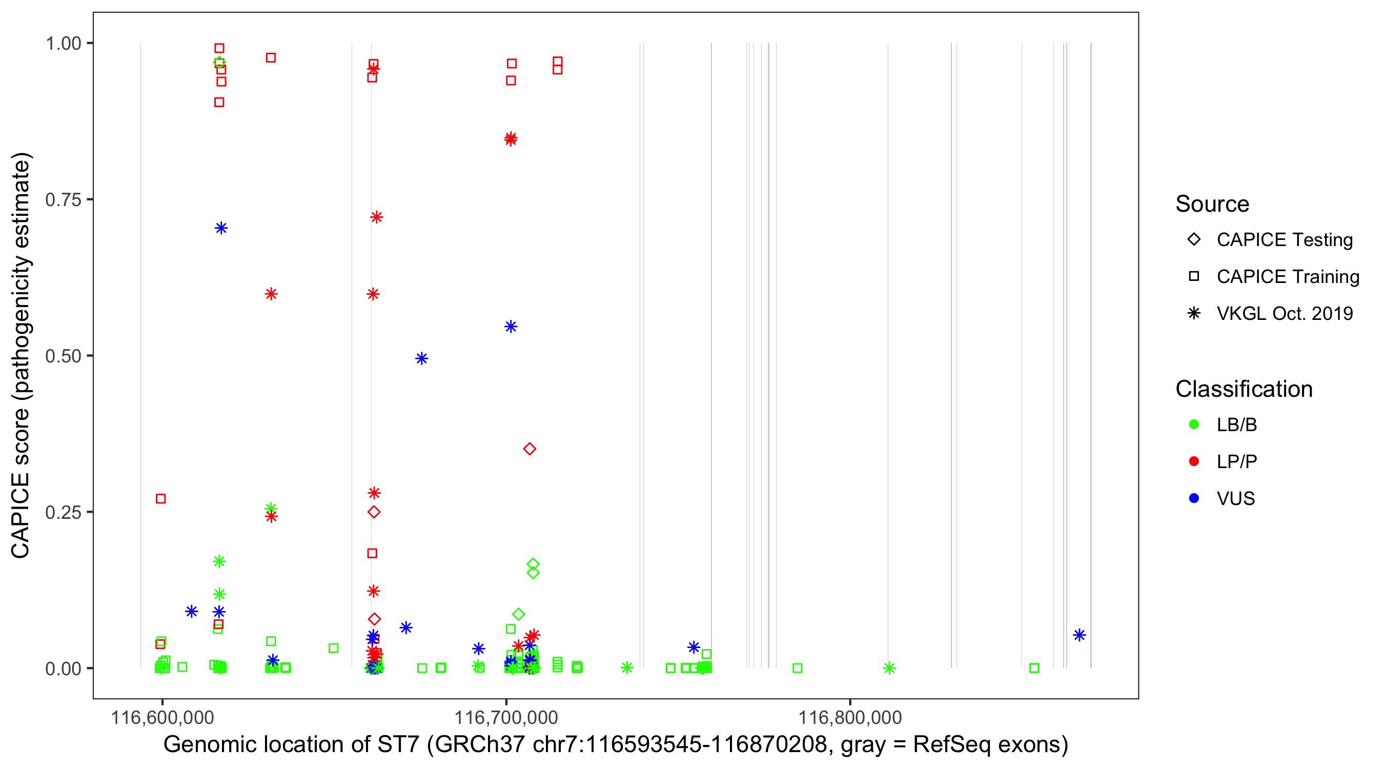Shown are CAPICE train/test variants plus VKGL Oct 2019.