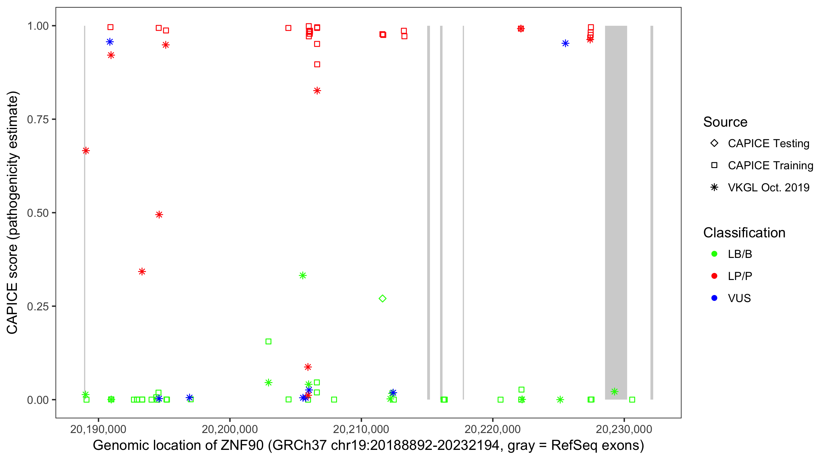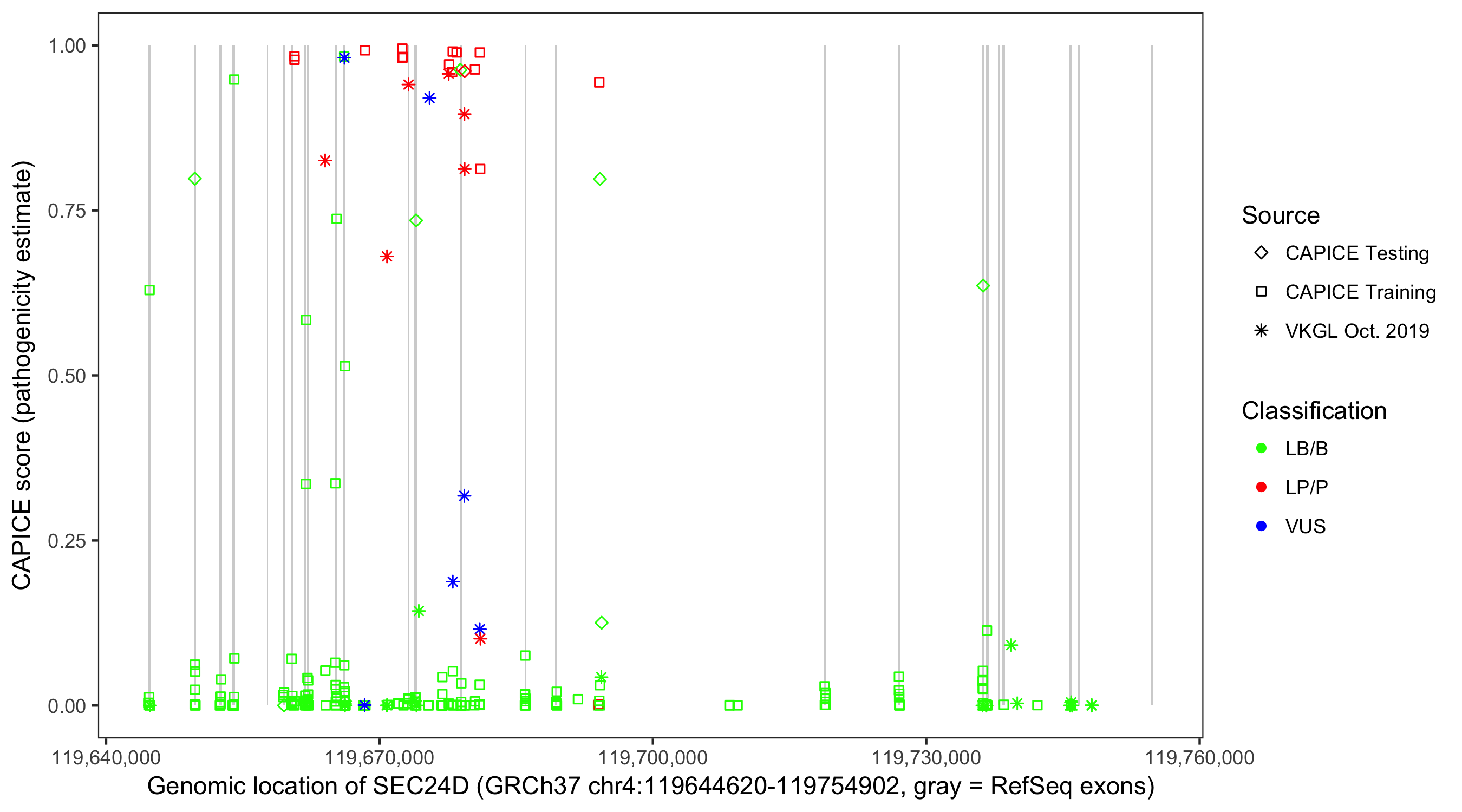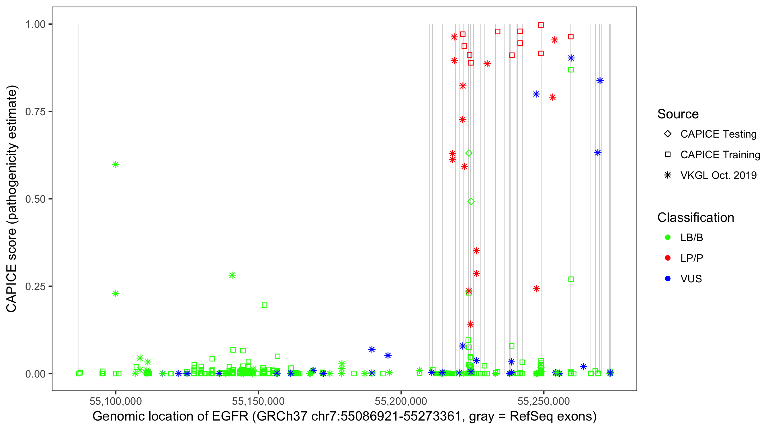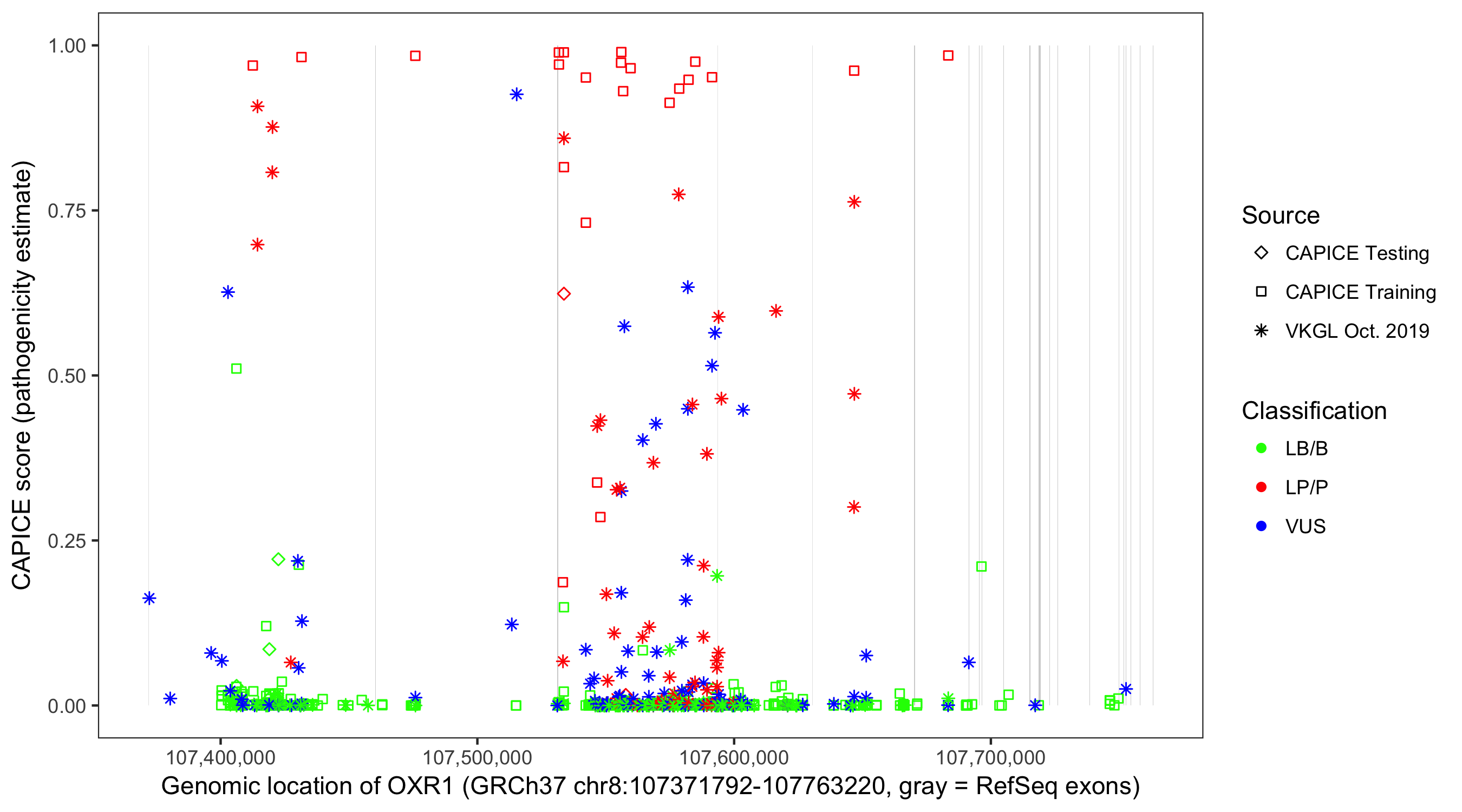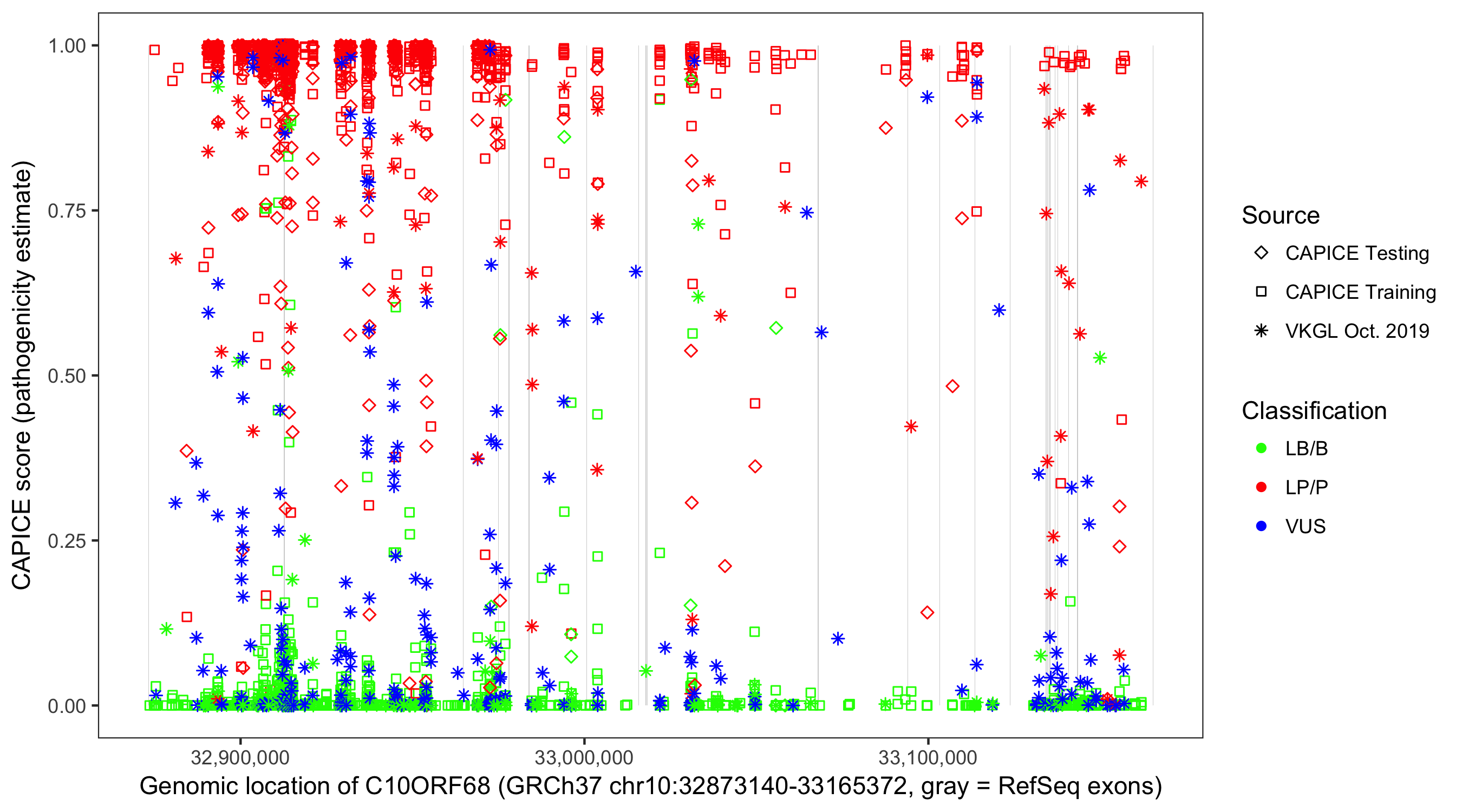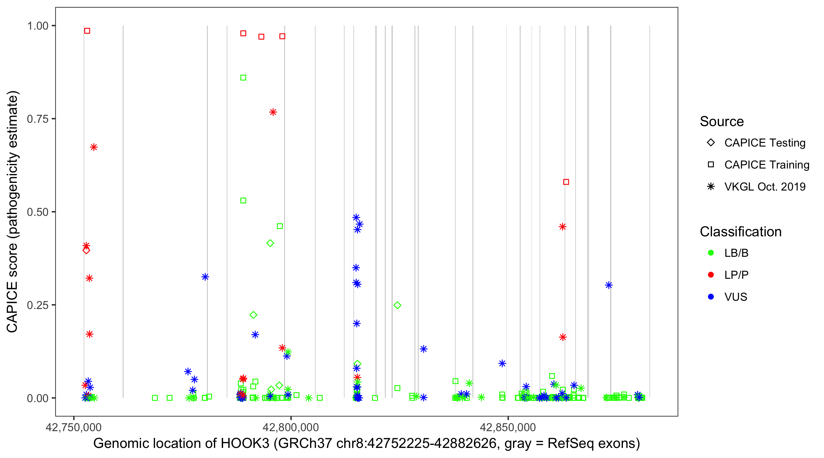 Shown are CAPICE train/test variants plus VKGL Oct 2019.