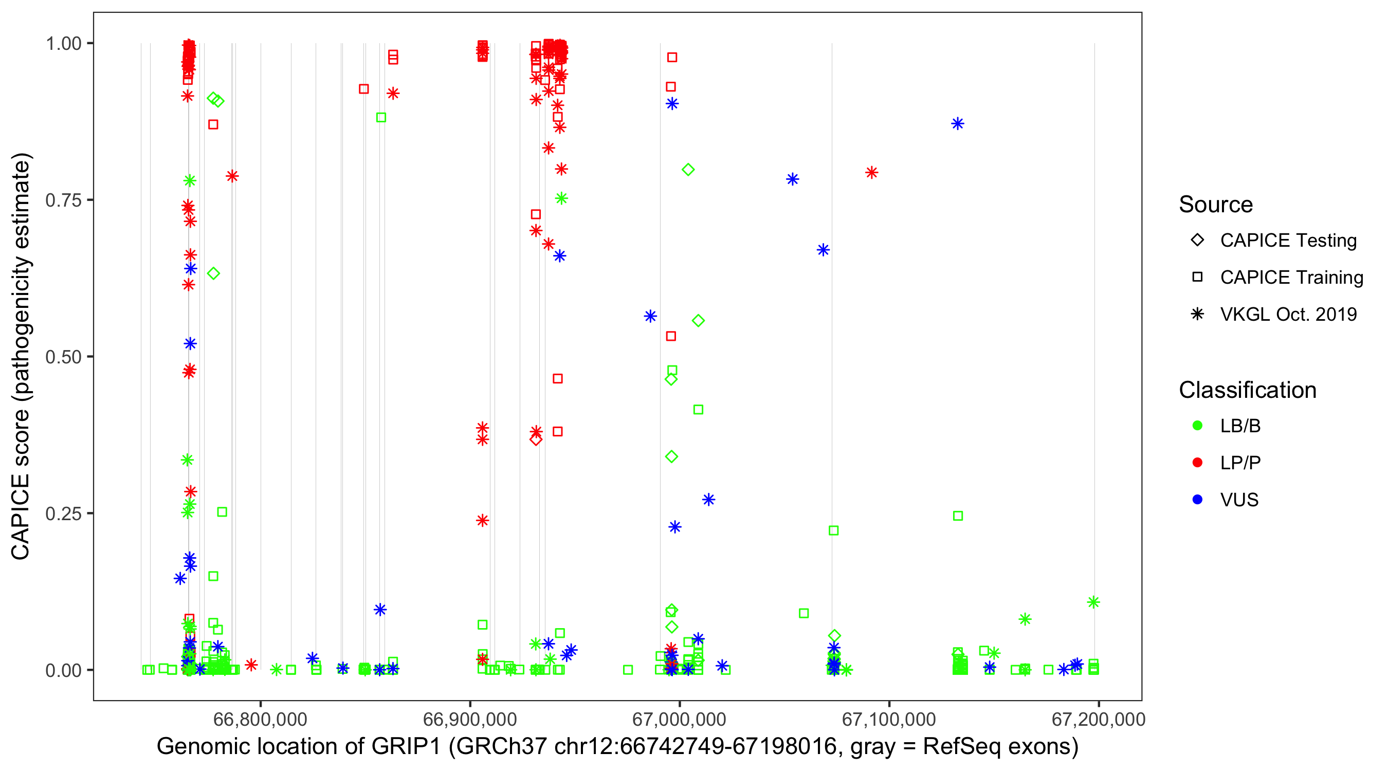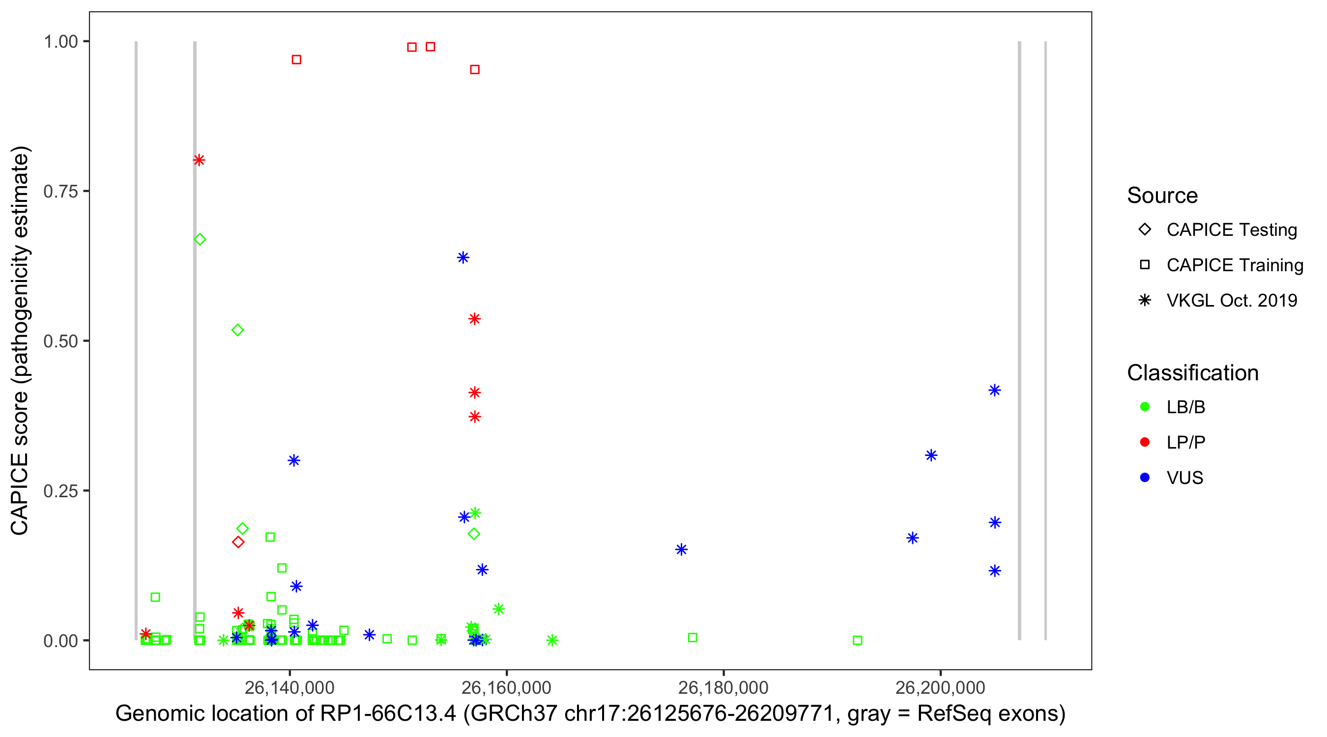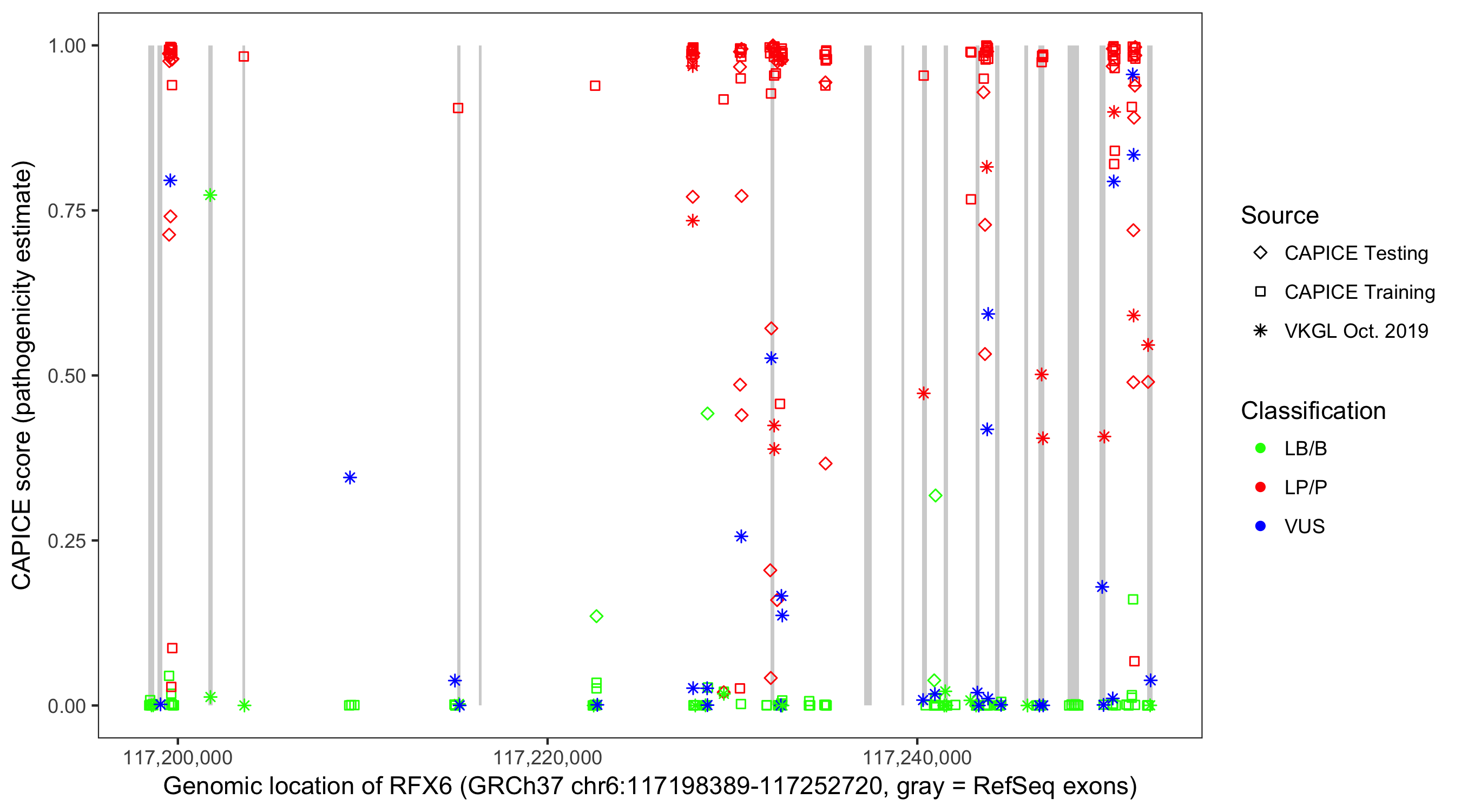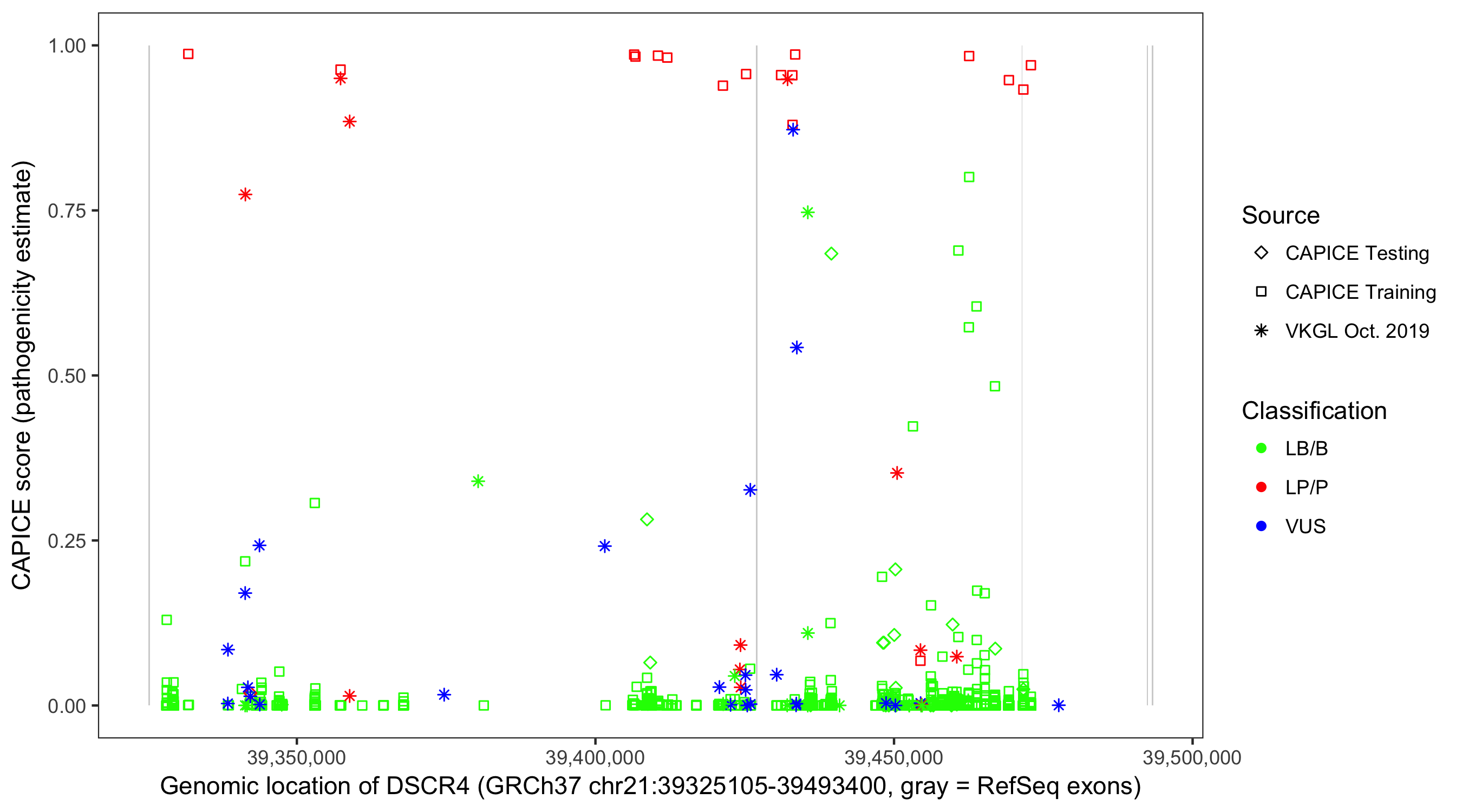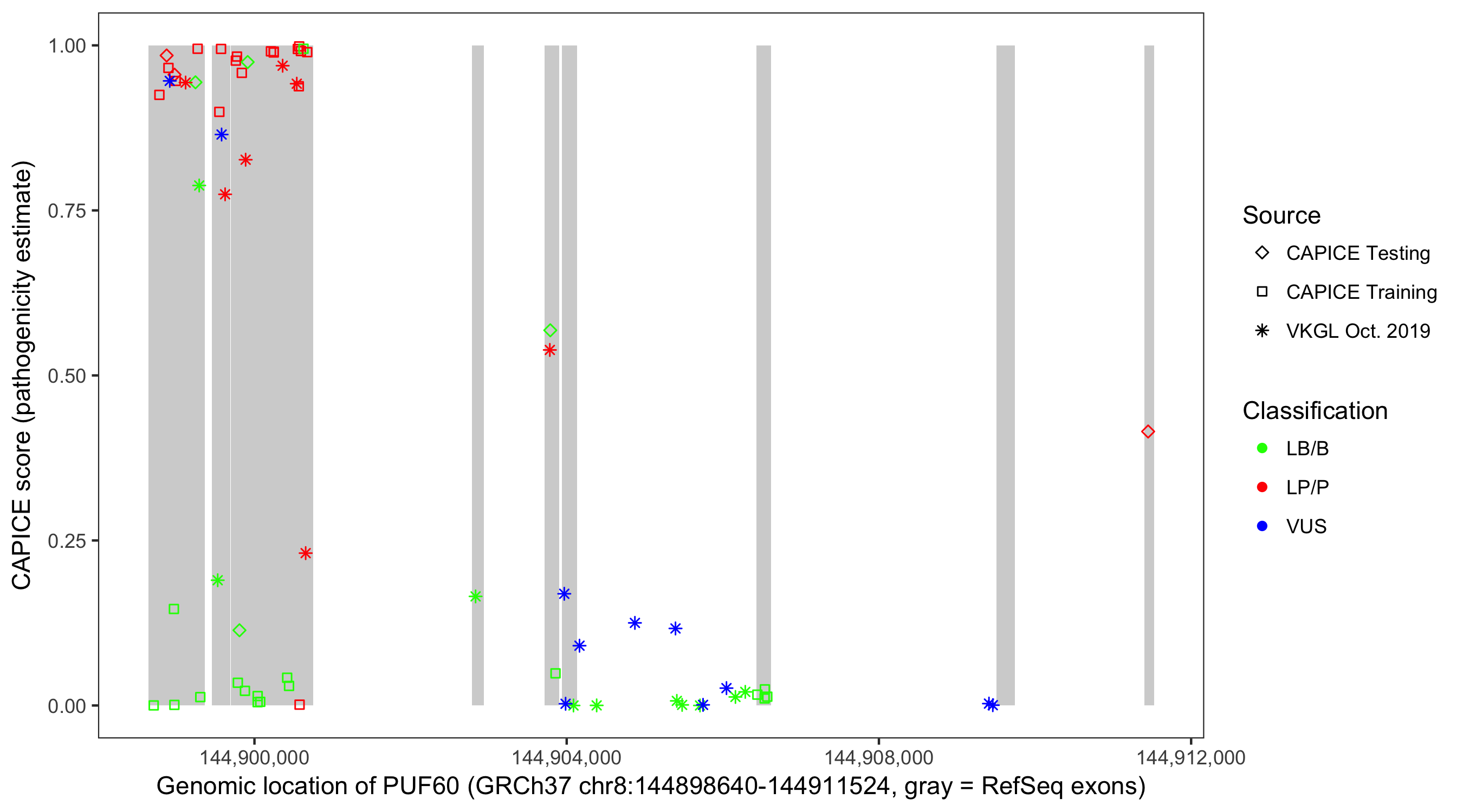 Shown are CAPICE train/test variants plus VKGL Oct 2019.