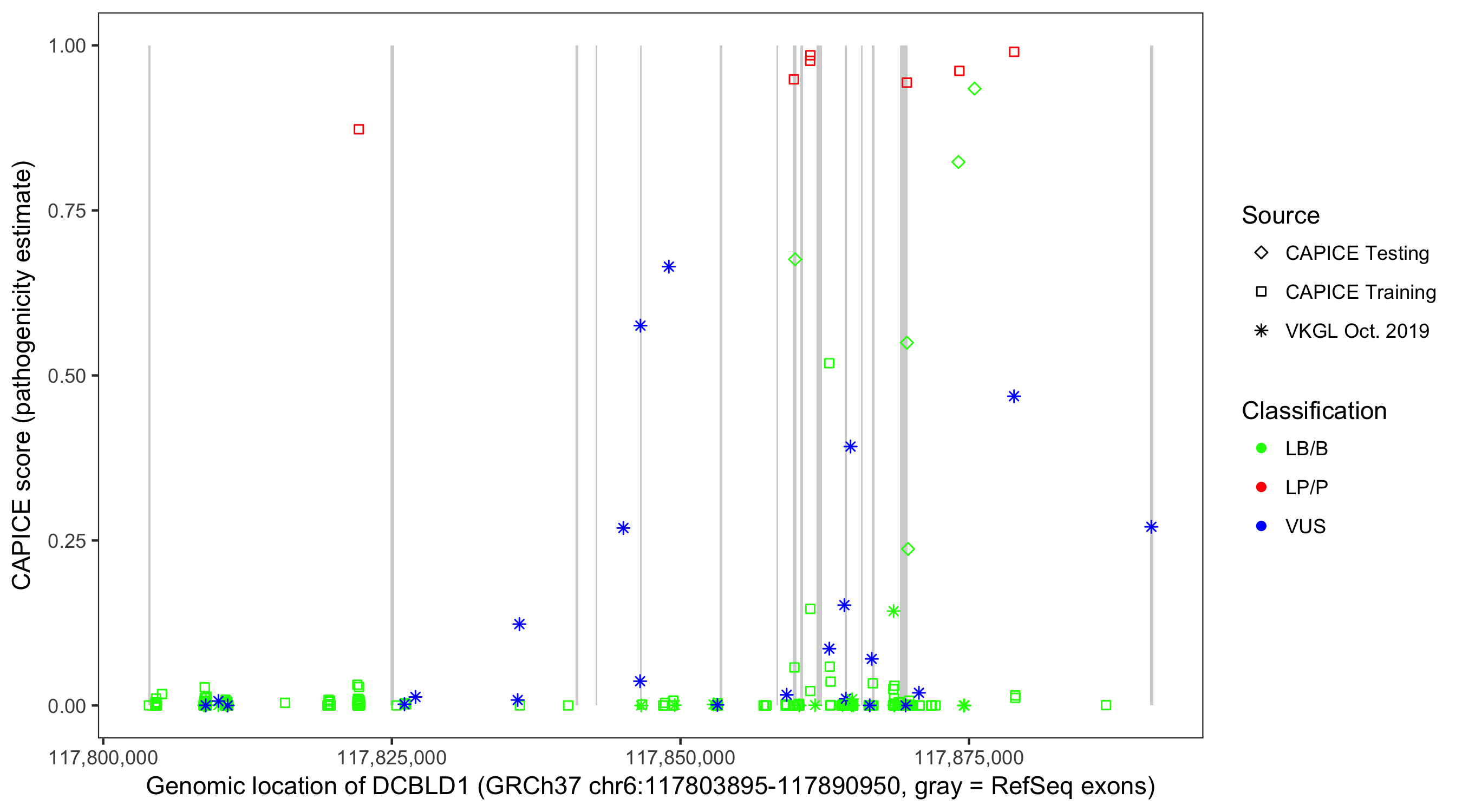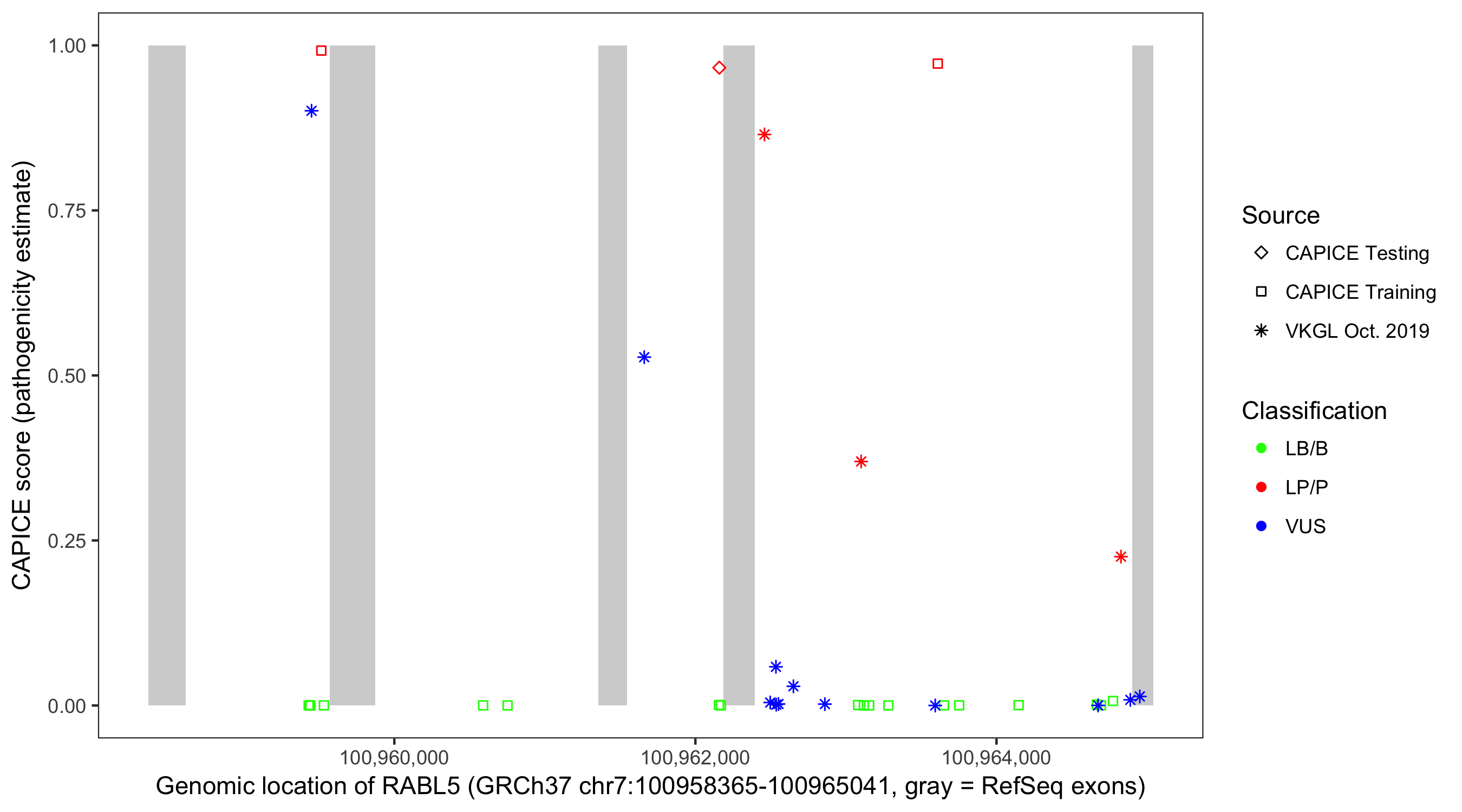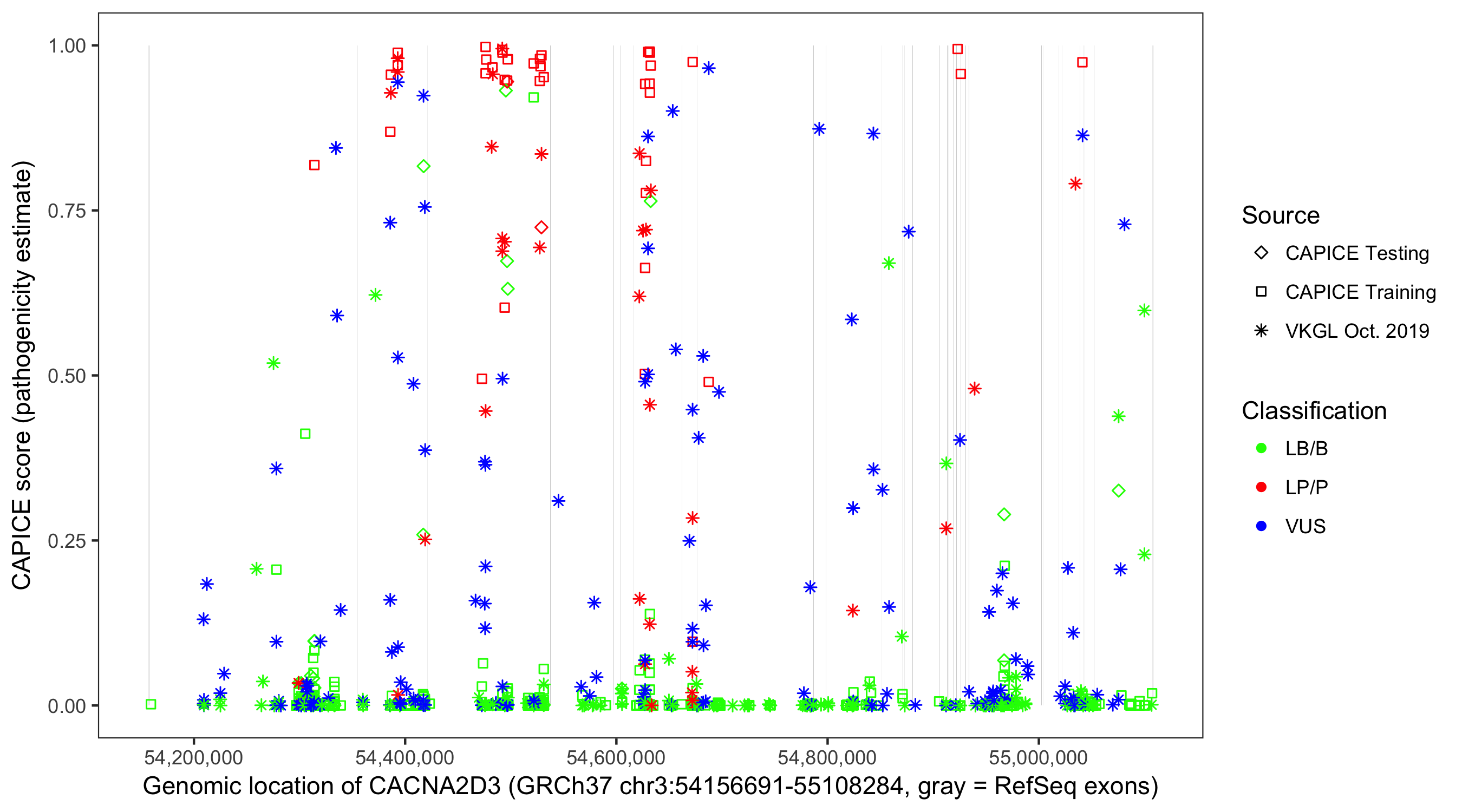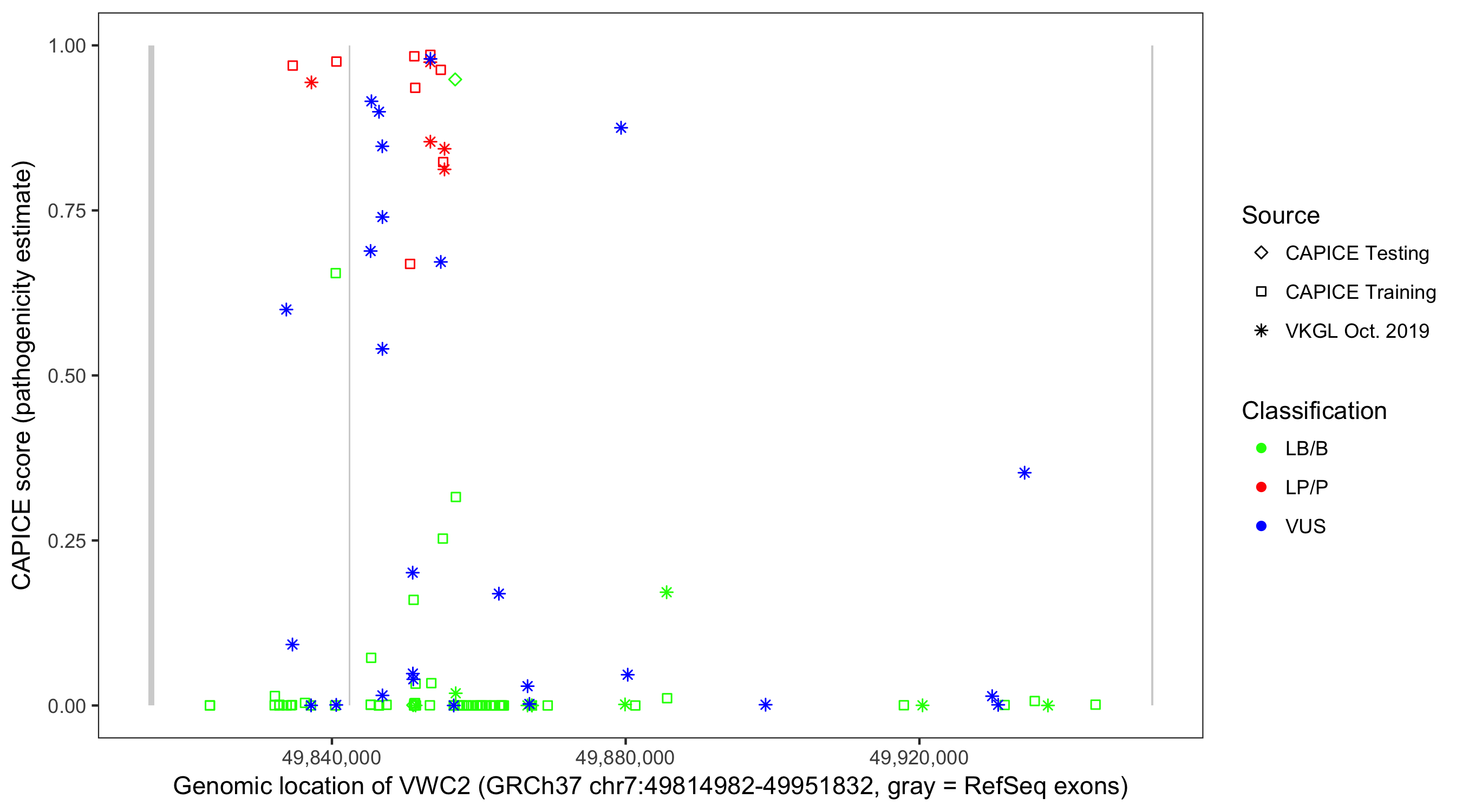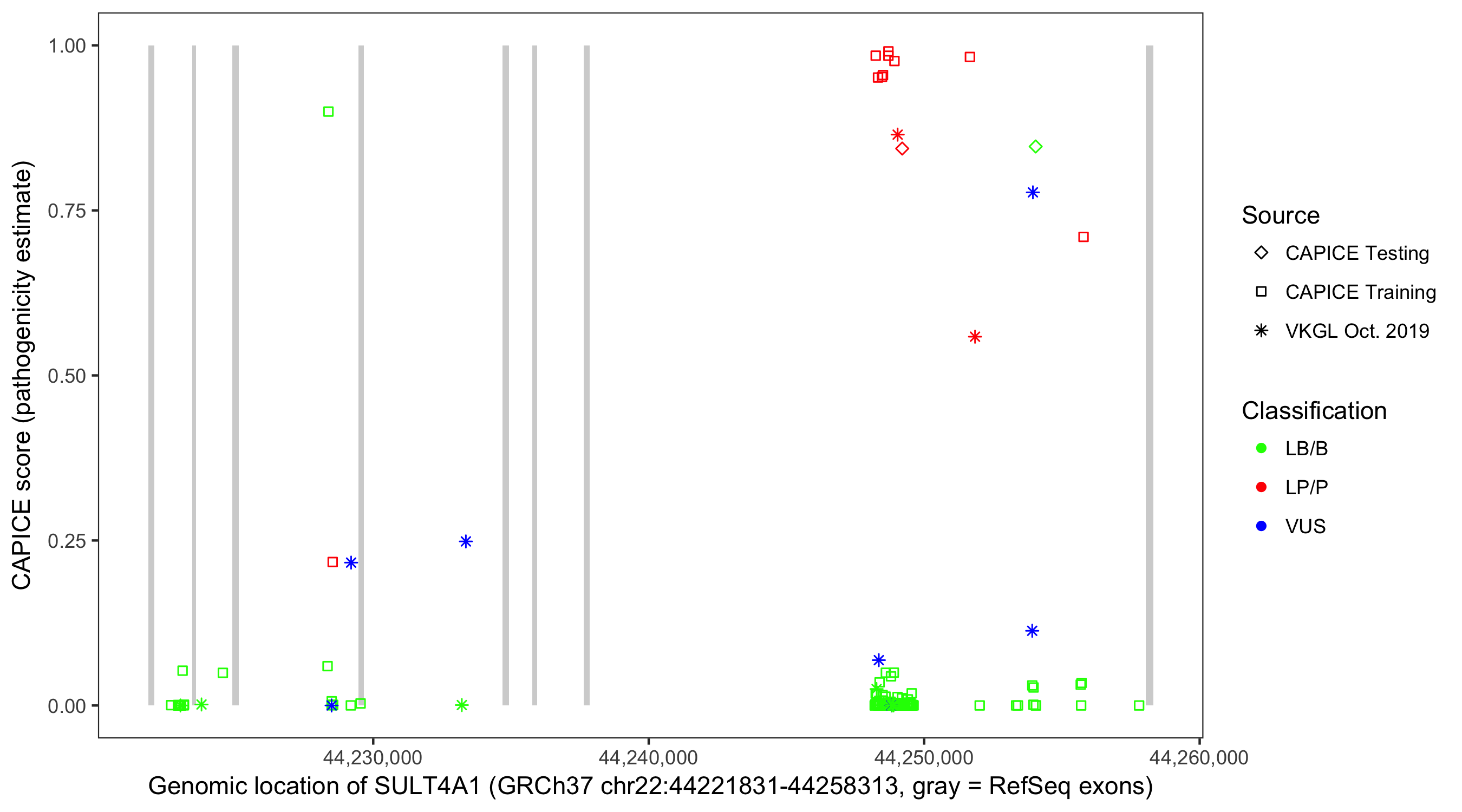 Shown are CAPICE train/test variants plus VKGL Oct 2019.