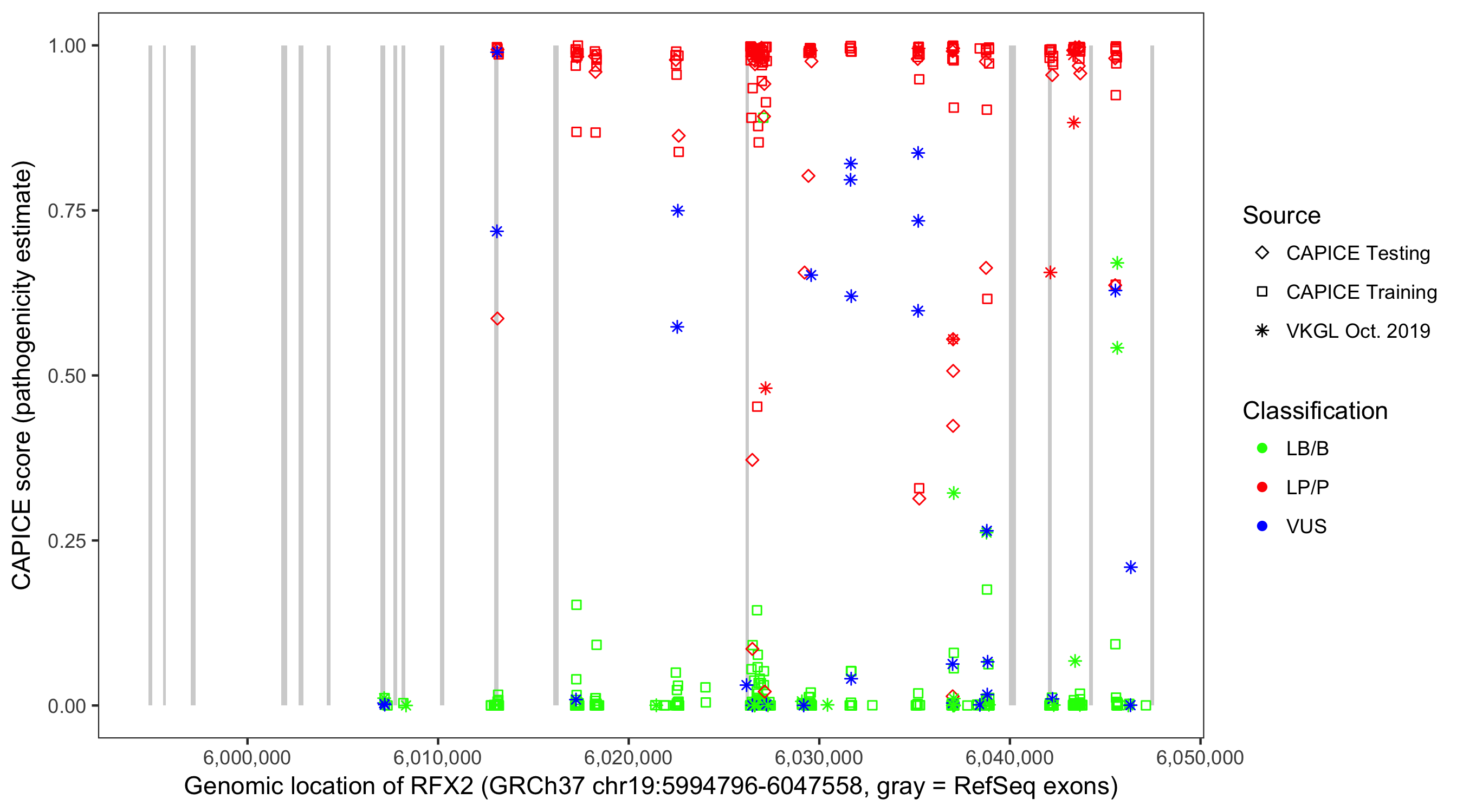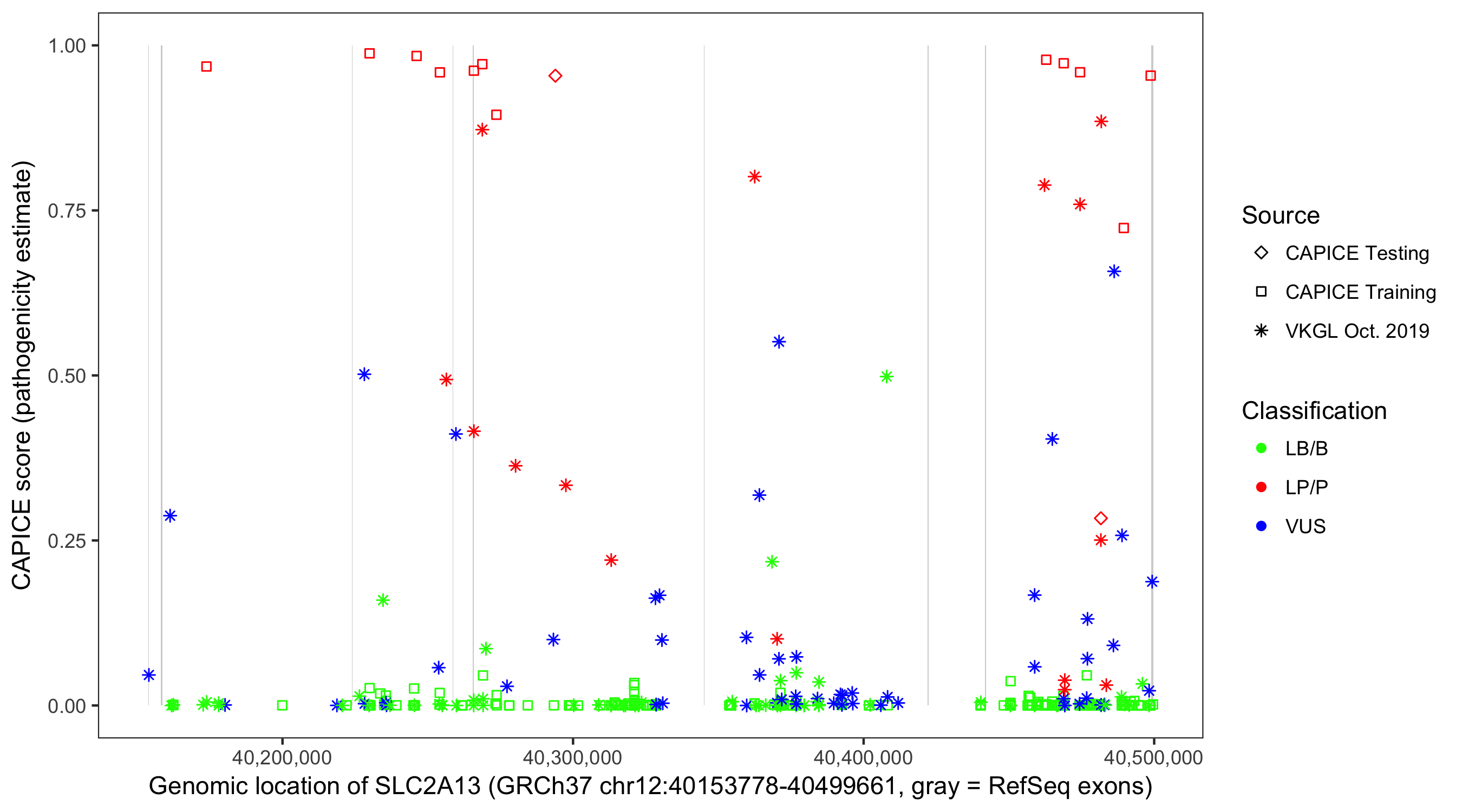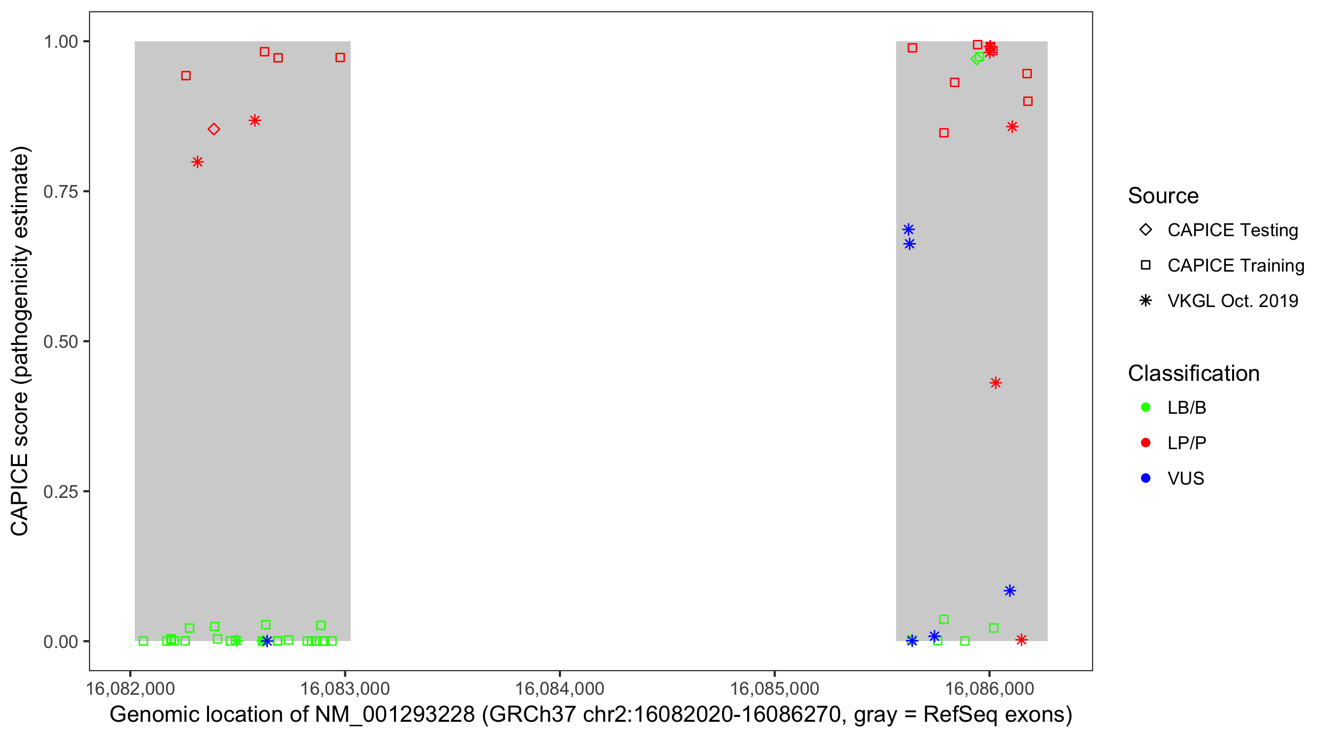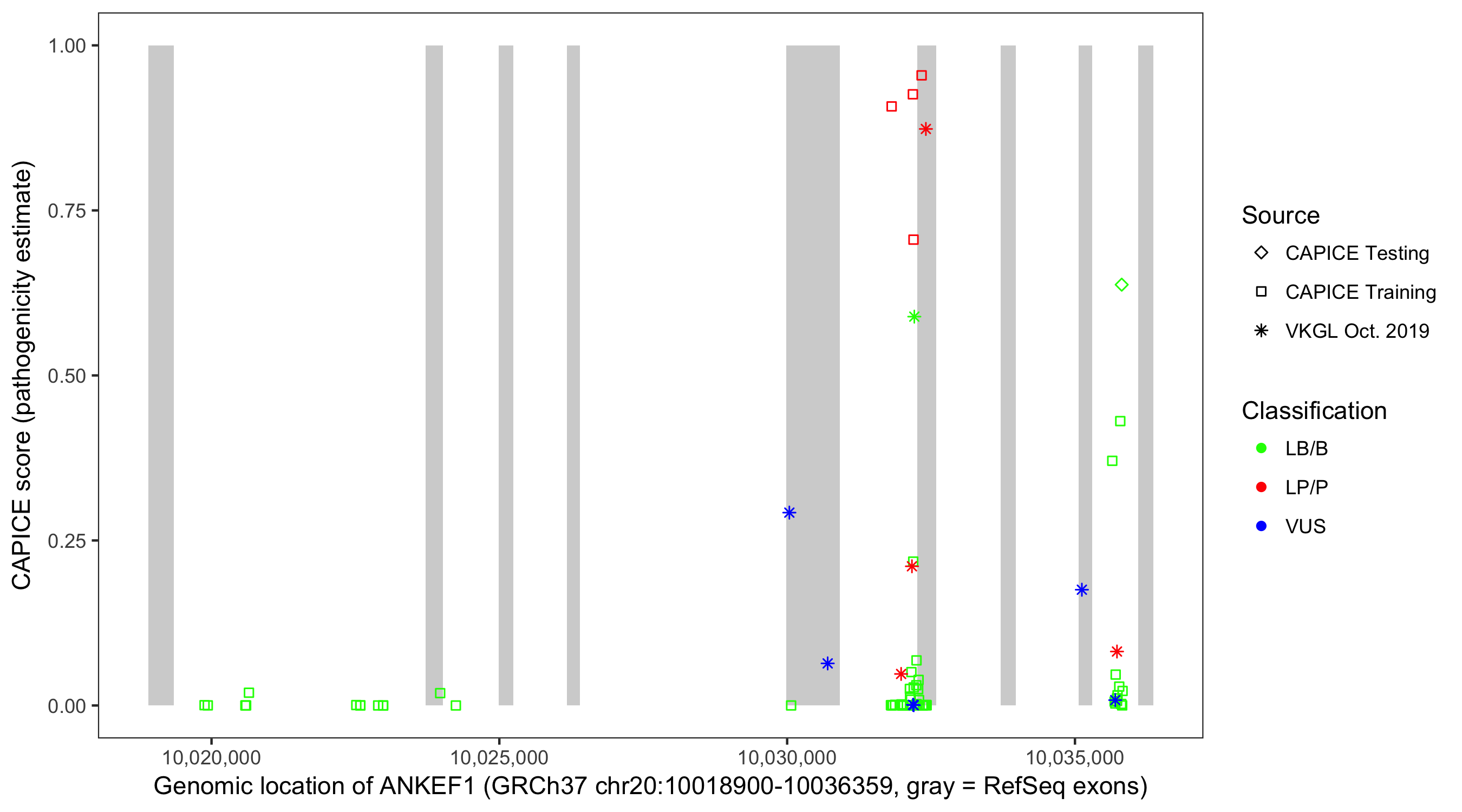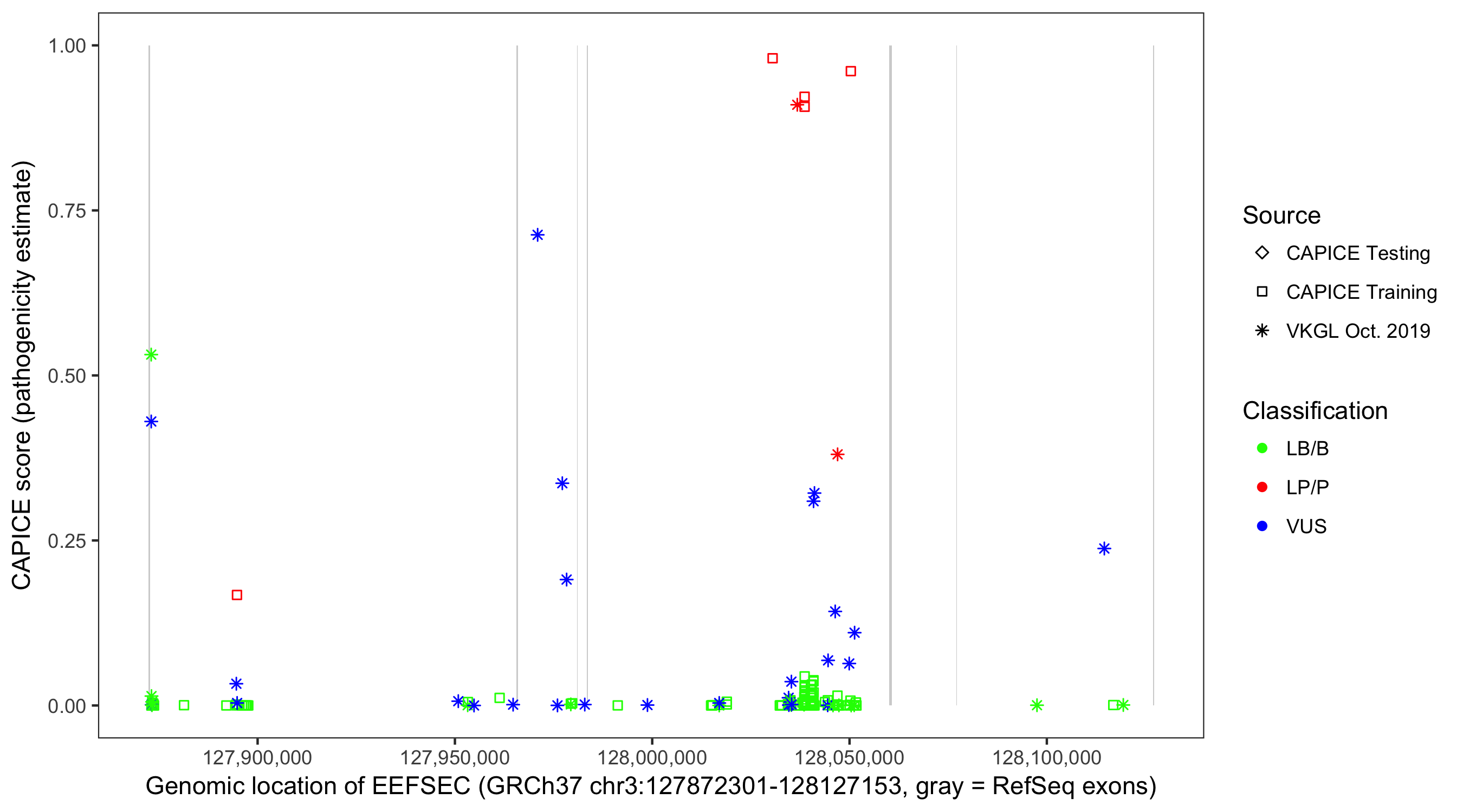 Shown are CAPICE train/test variants plus VKGL Oct 2019.