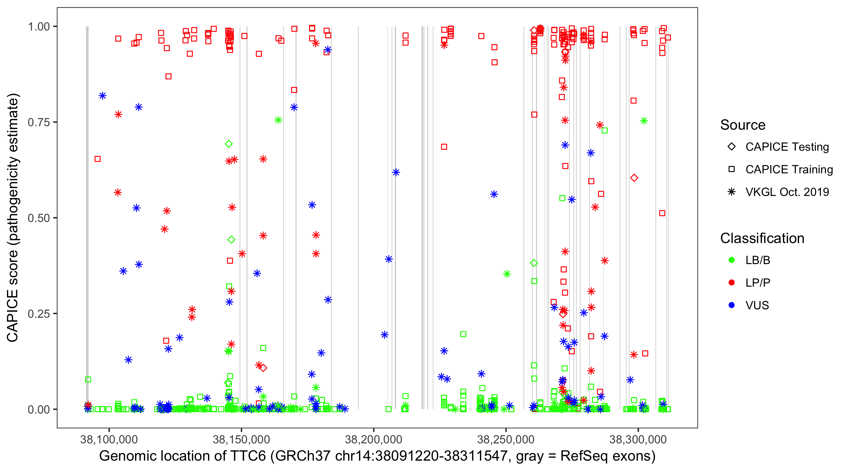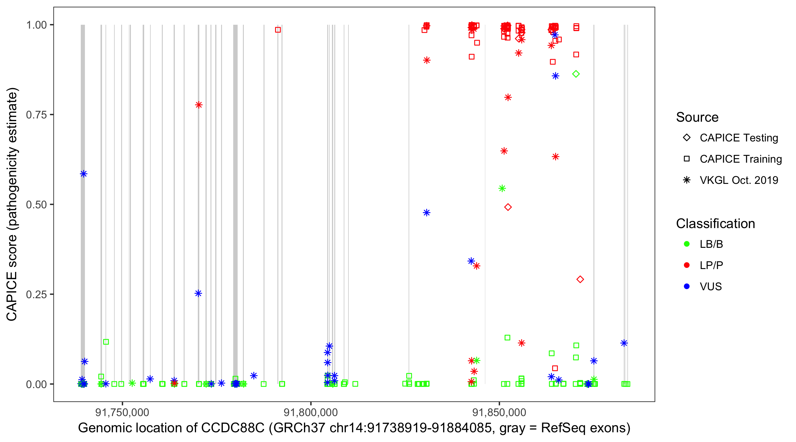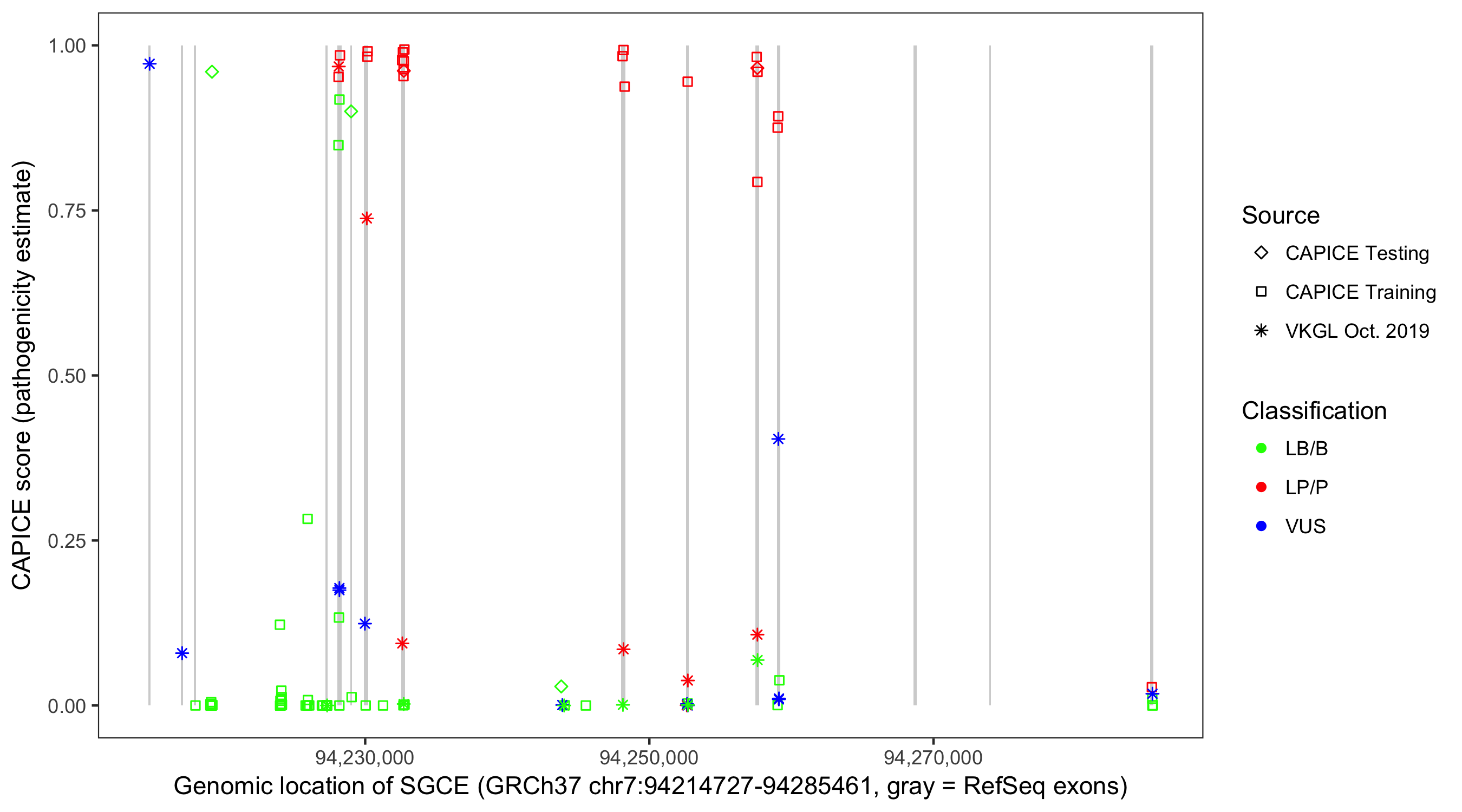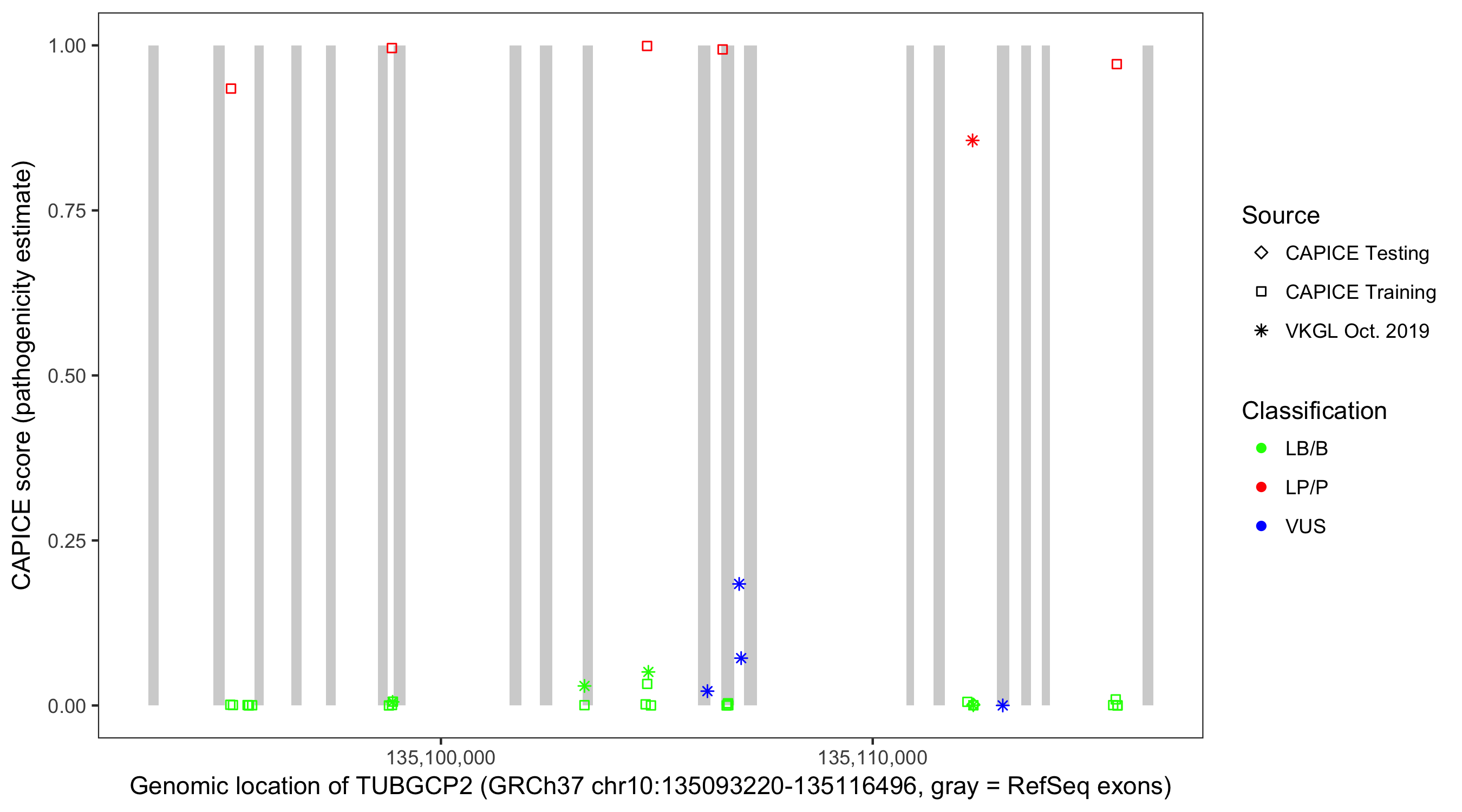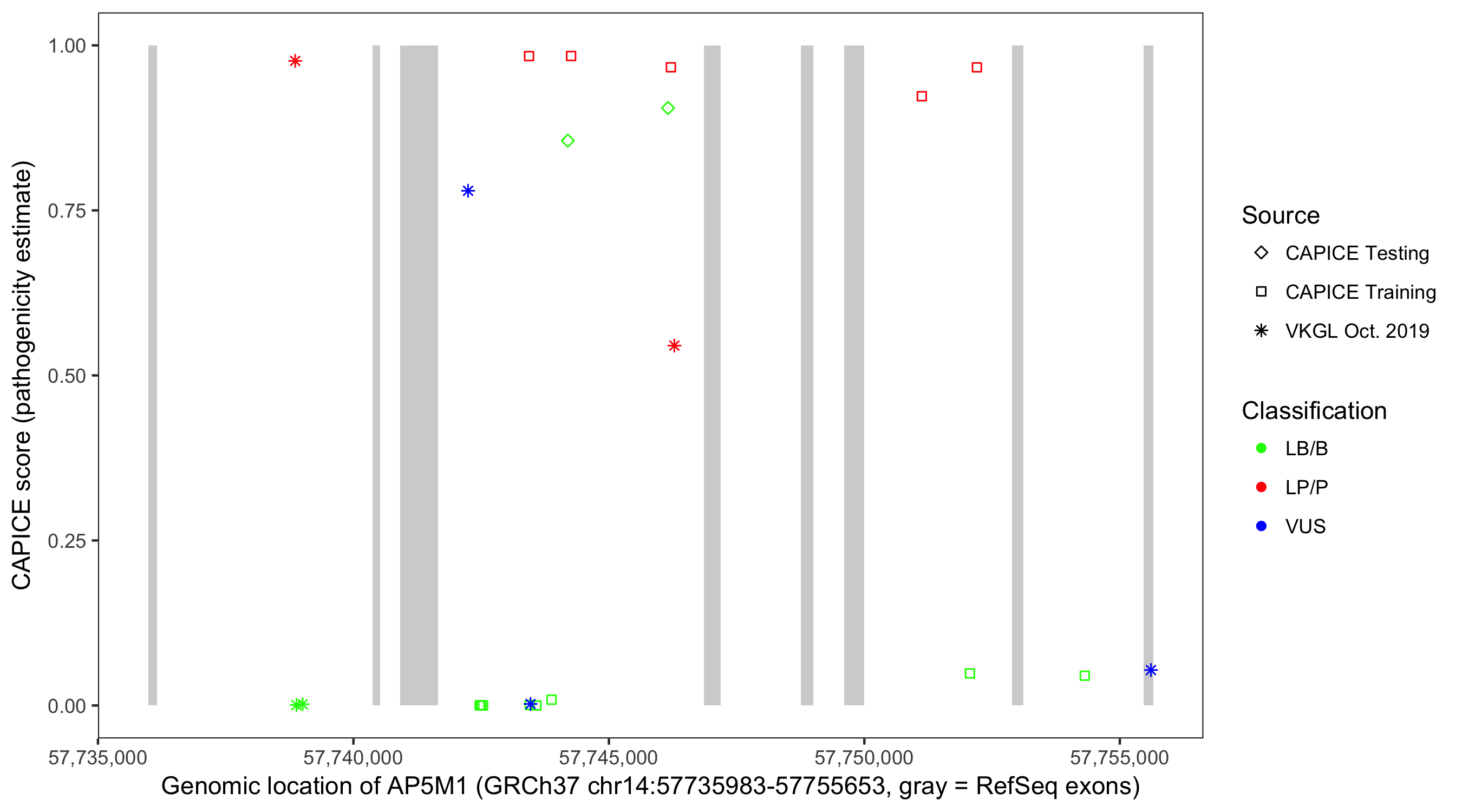 Shown are CAPICE train/test variants plus VKGL Oct 2019.