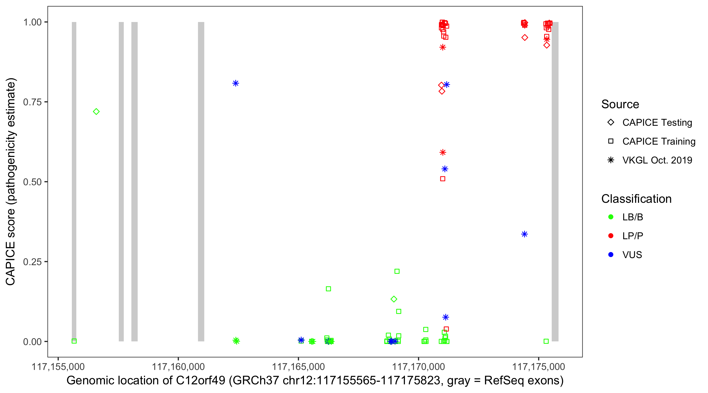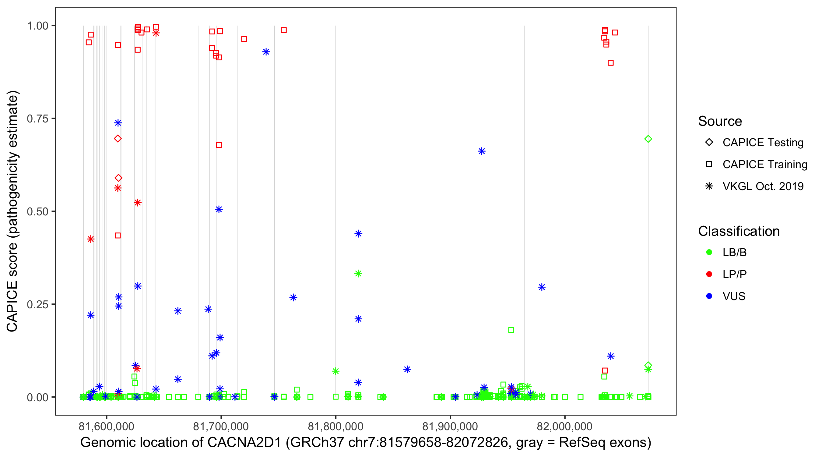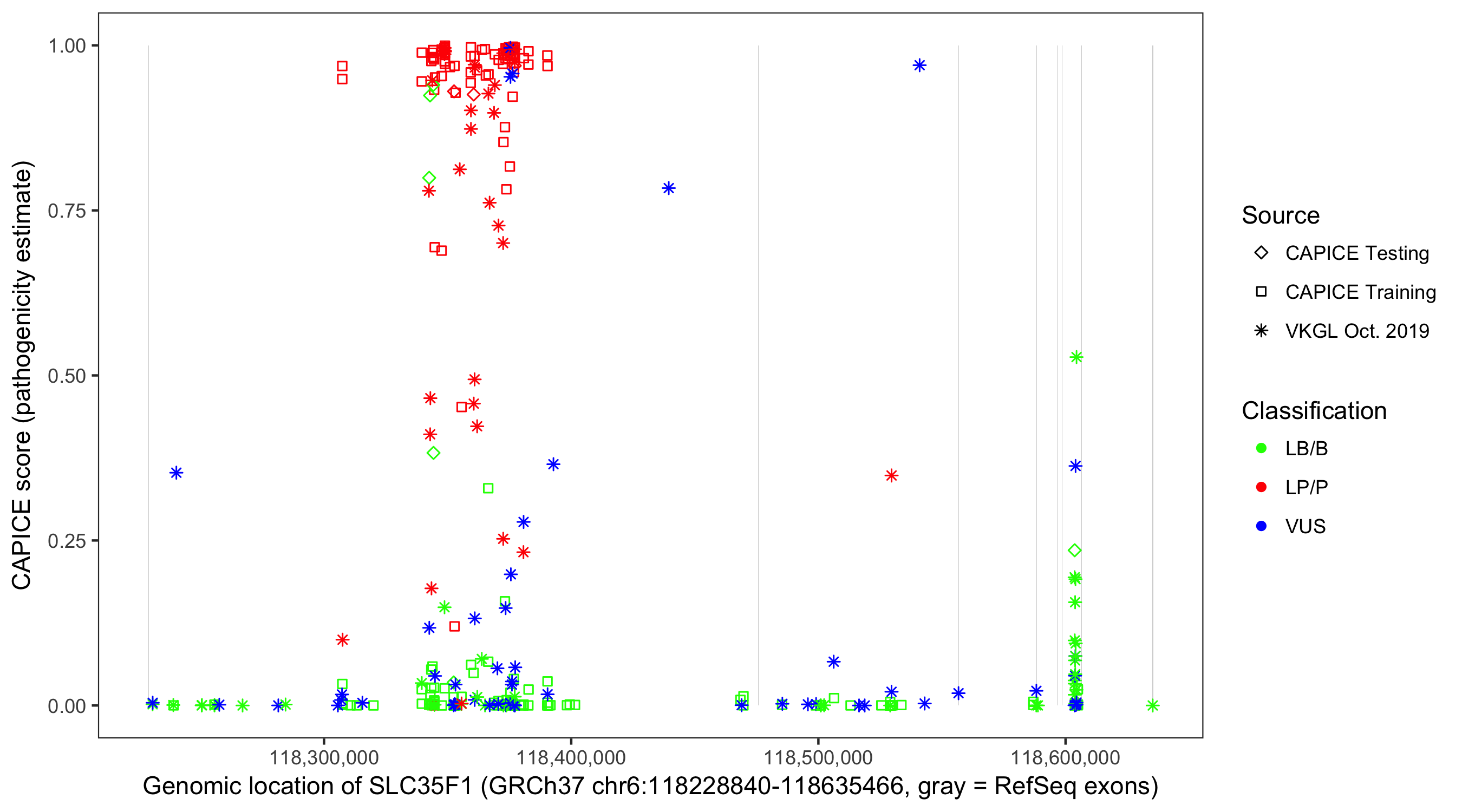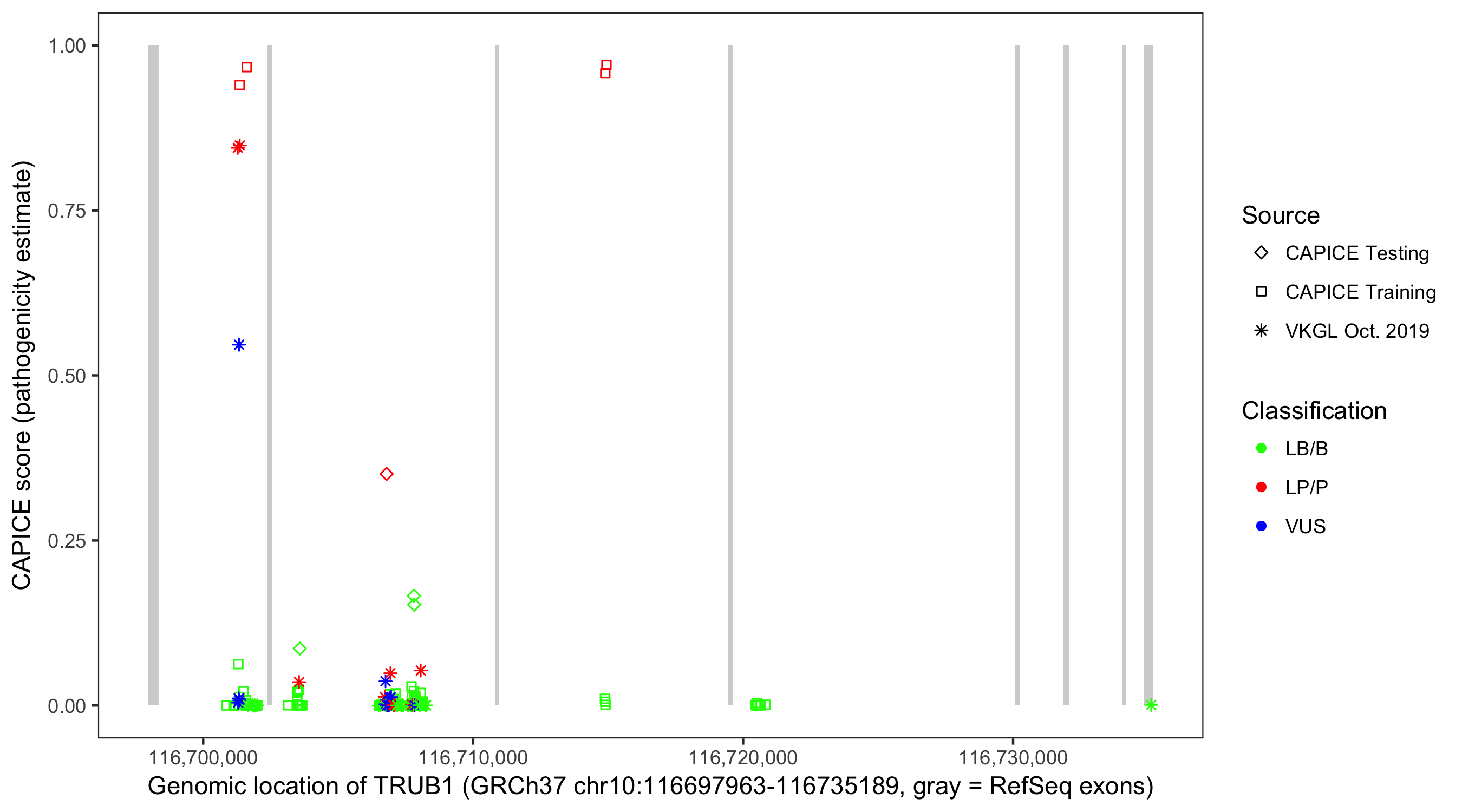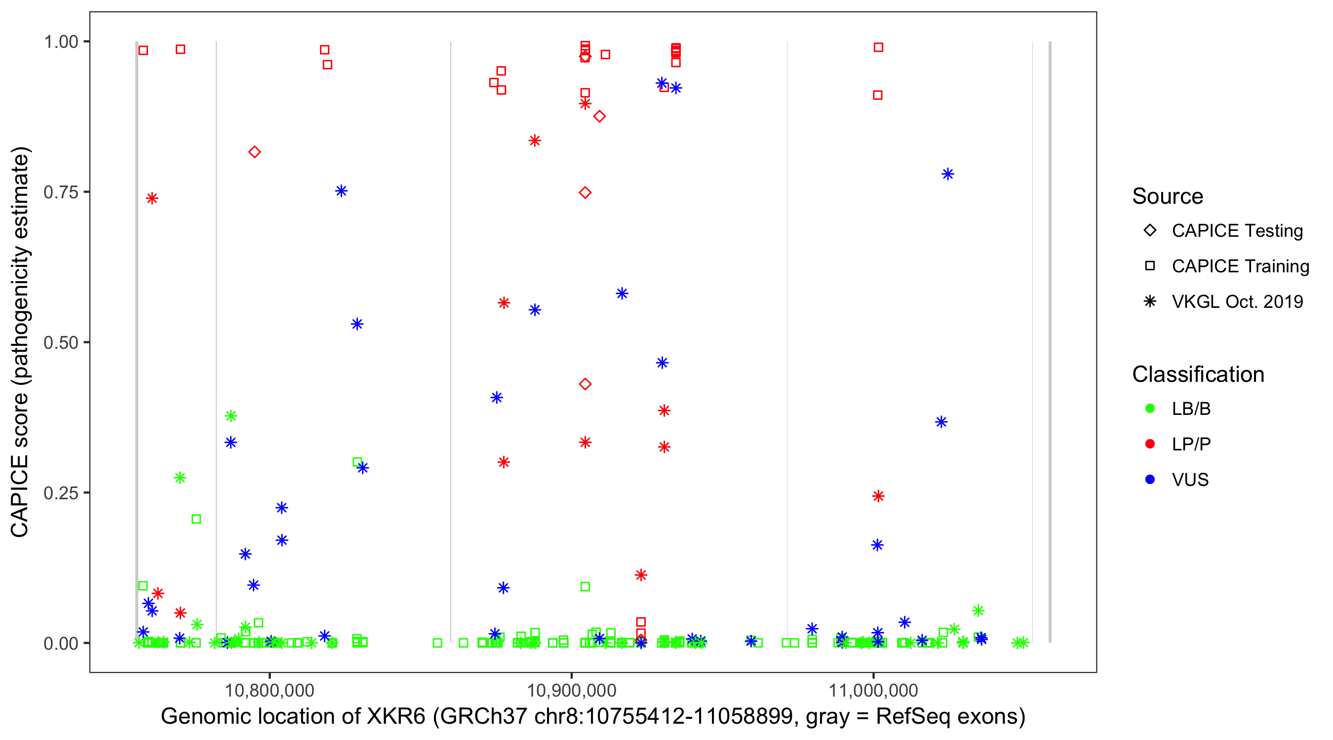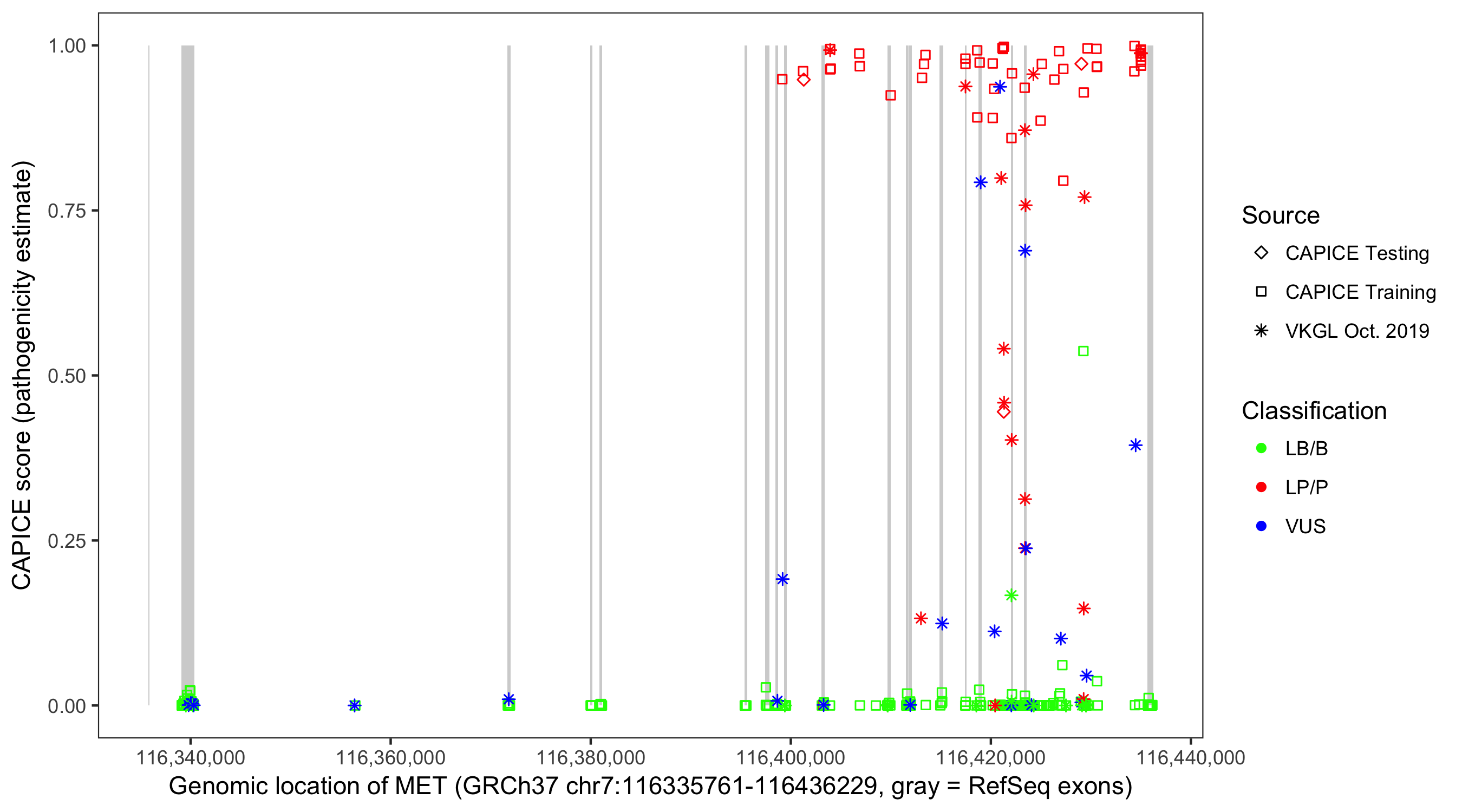 Shown are CAPICE train/test variants plus VKGL Oct 2019.