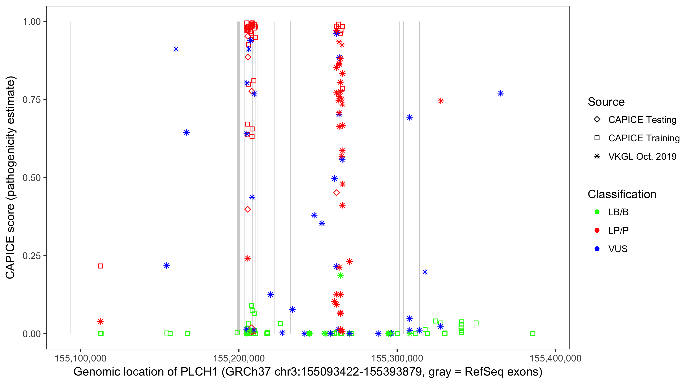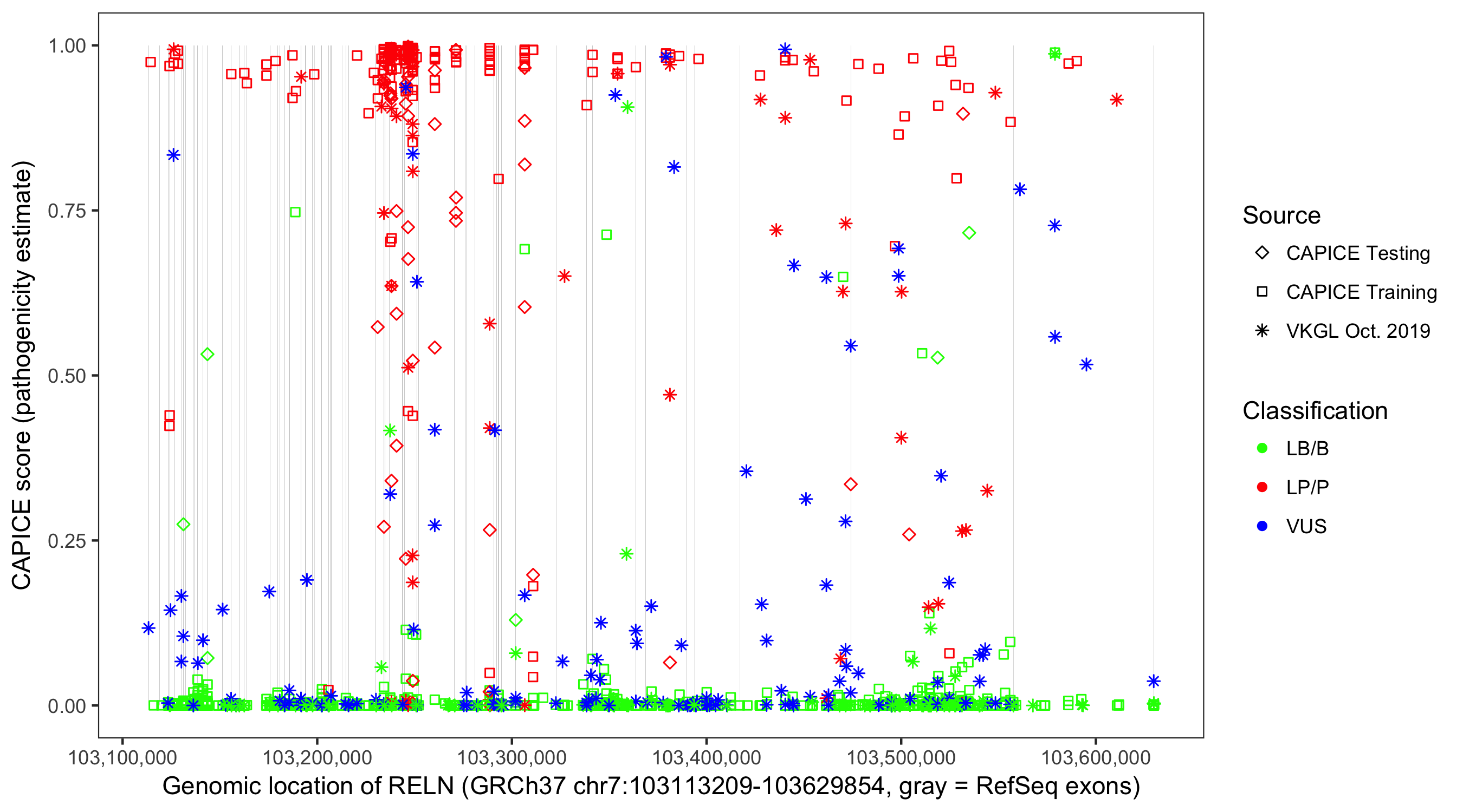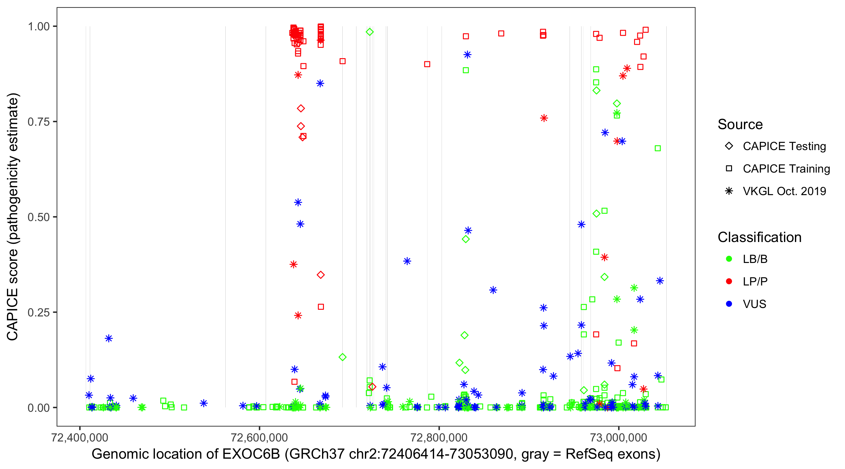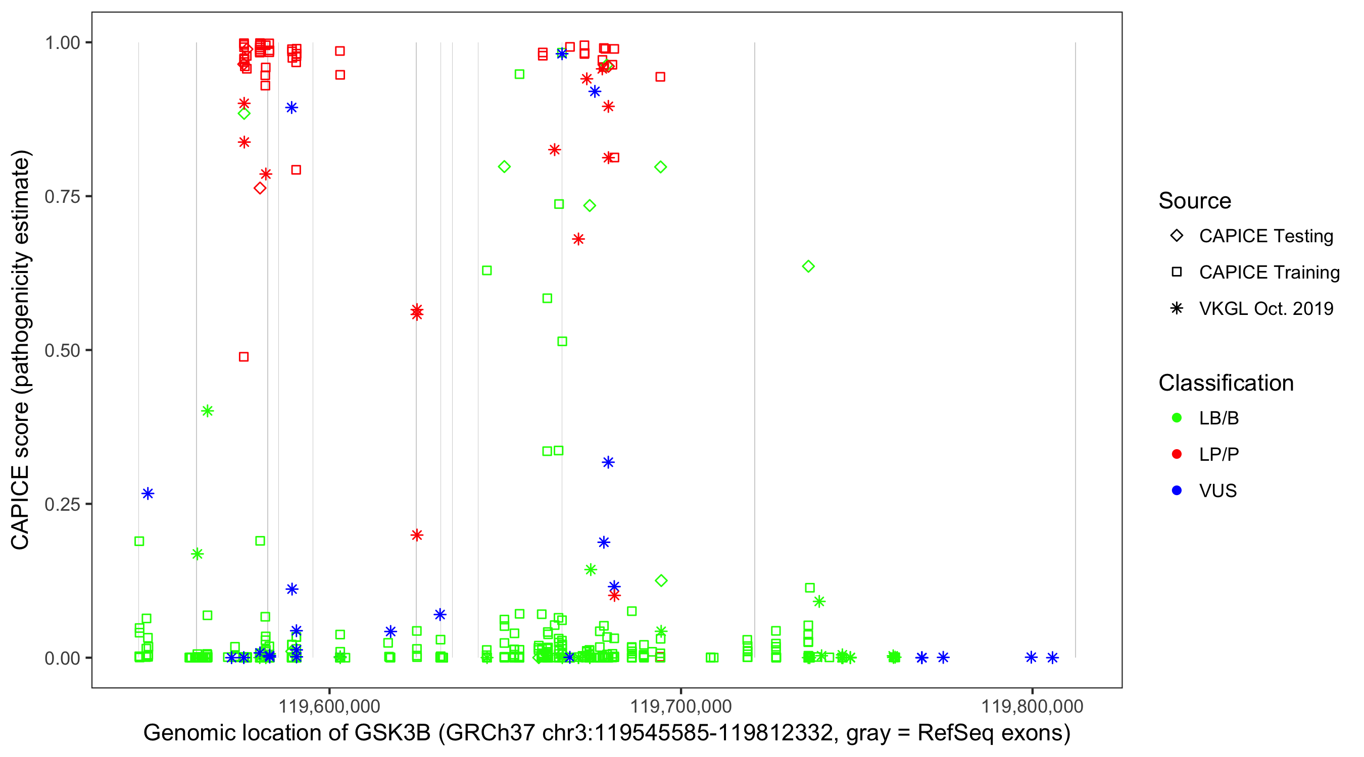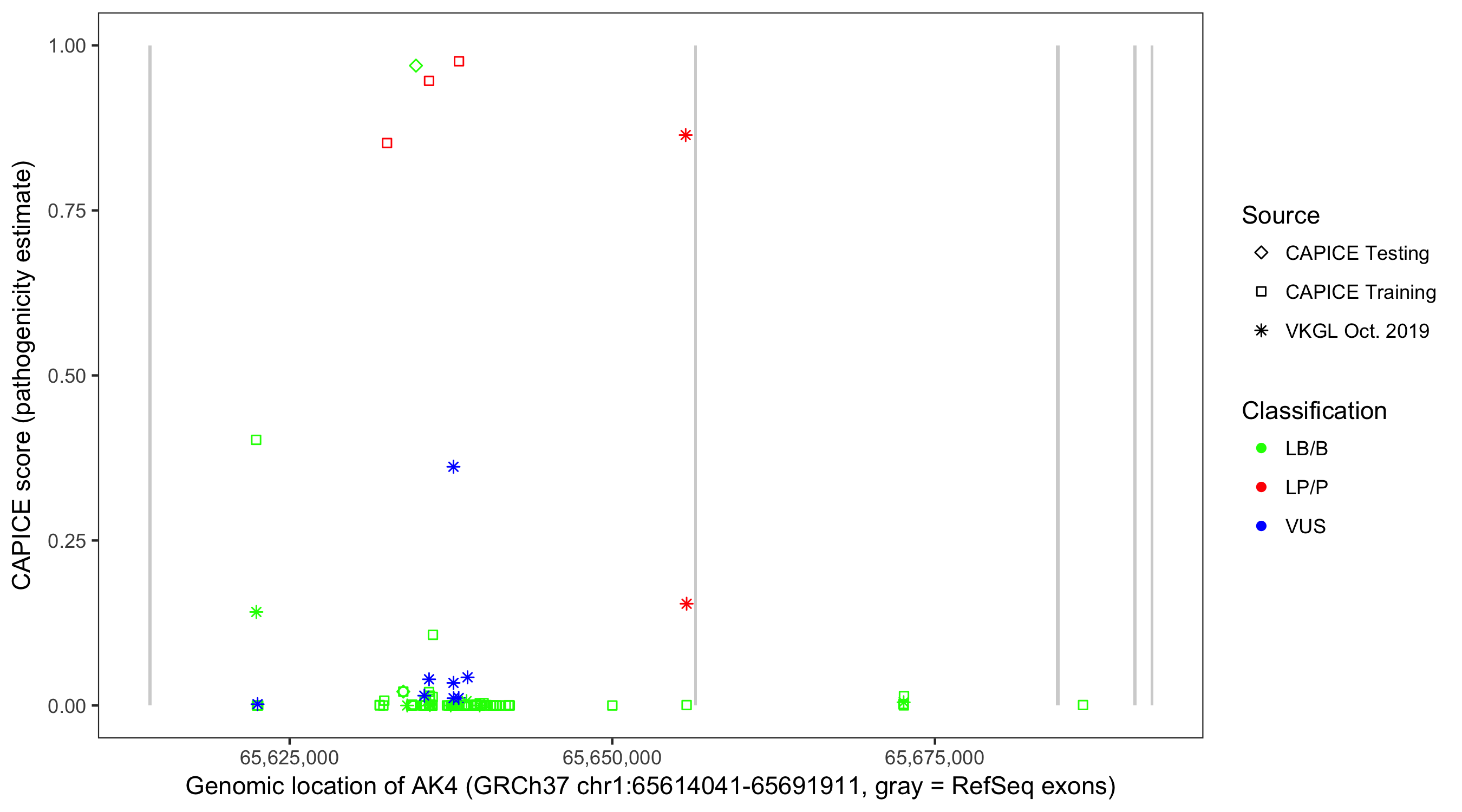 Shown are CAPICE train/test variants plus VKGL Oct 2019.