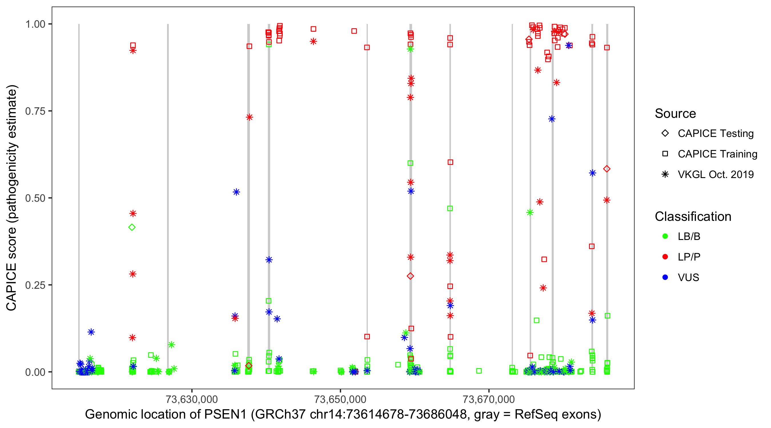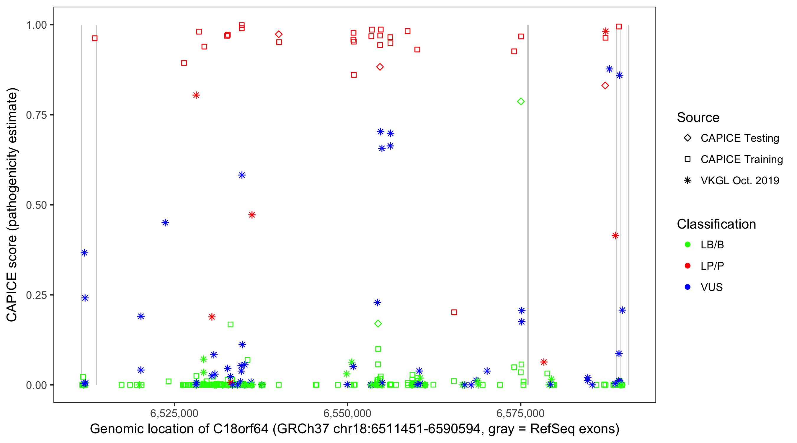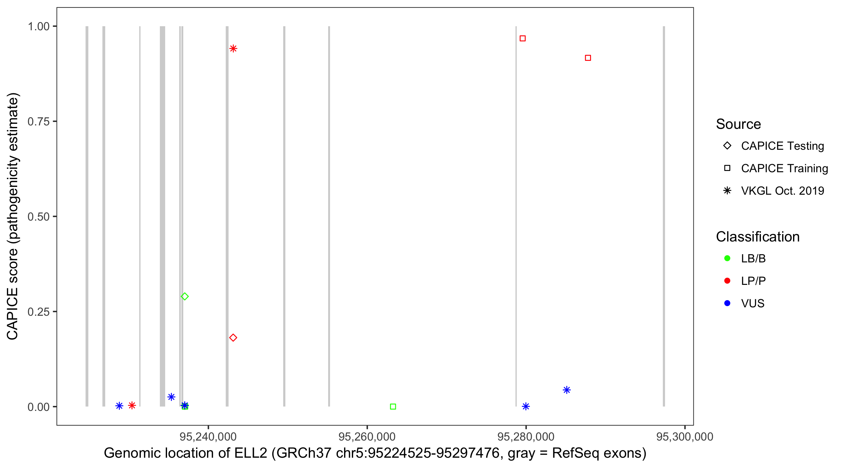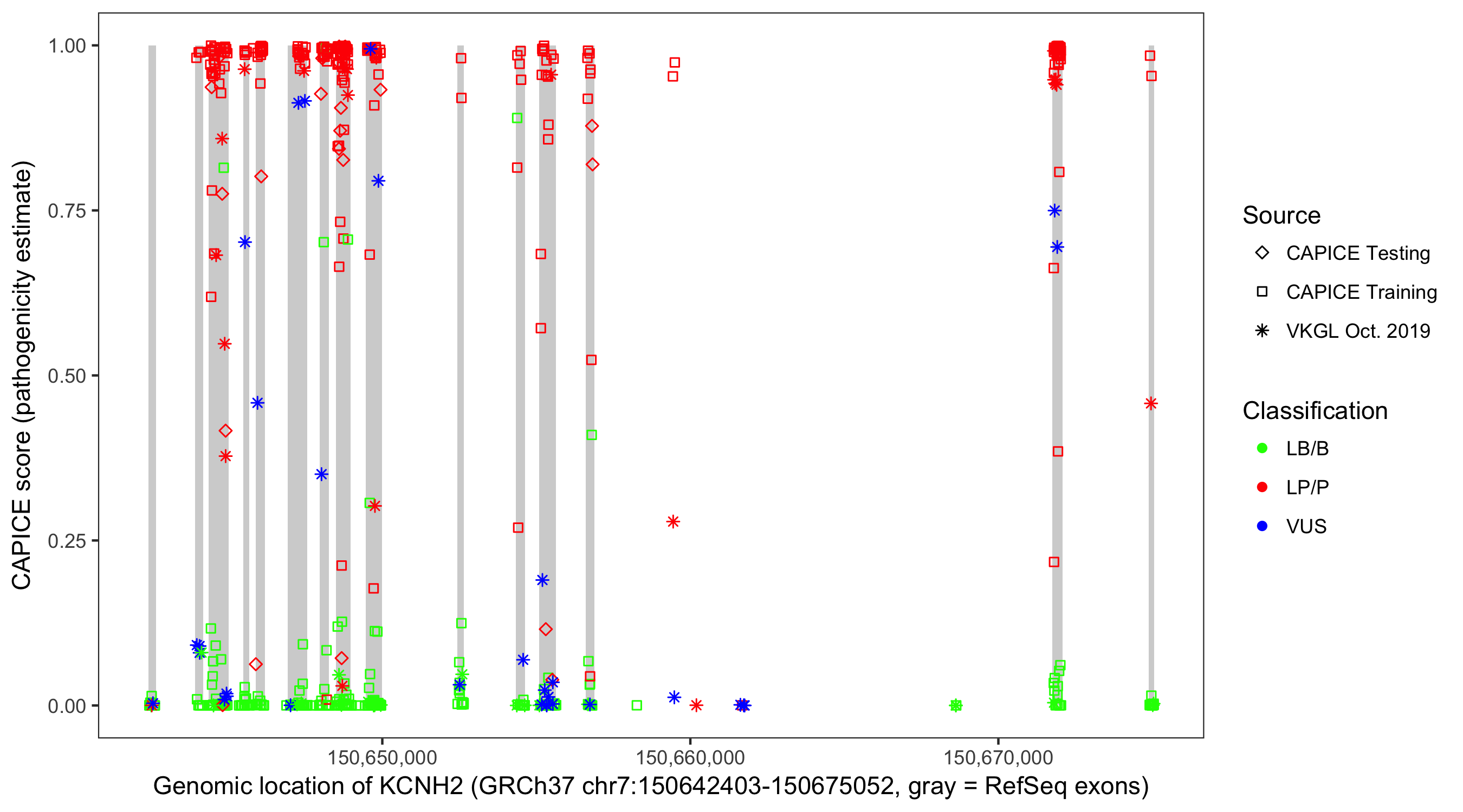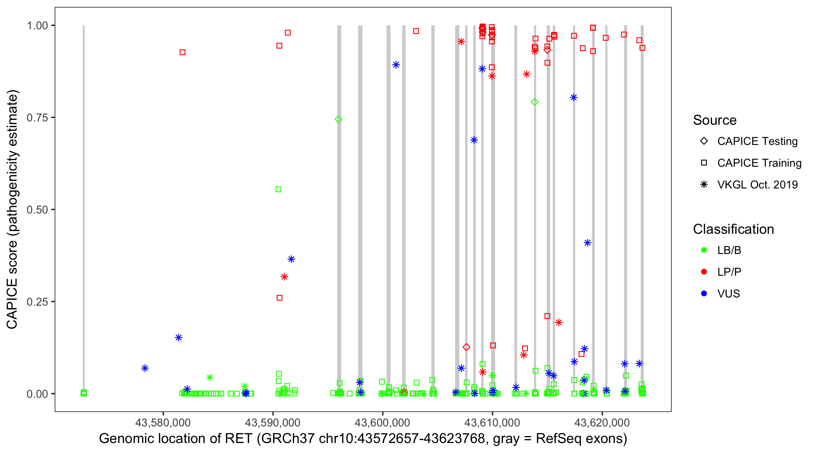 Shown are CAPICE train/test variants plus VKGL Oct 2019.