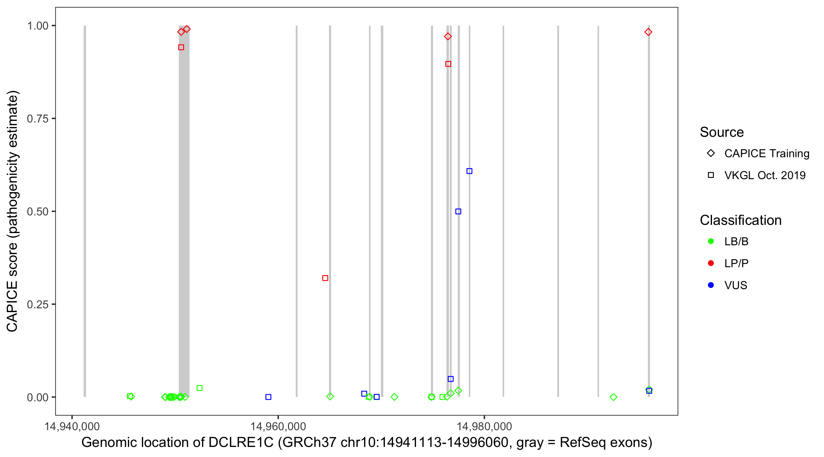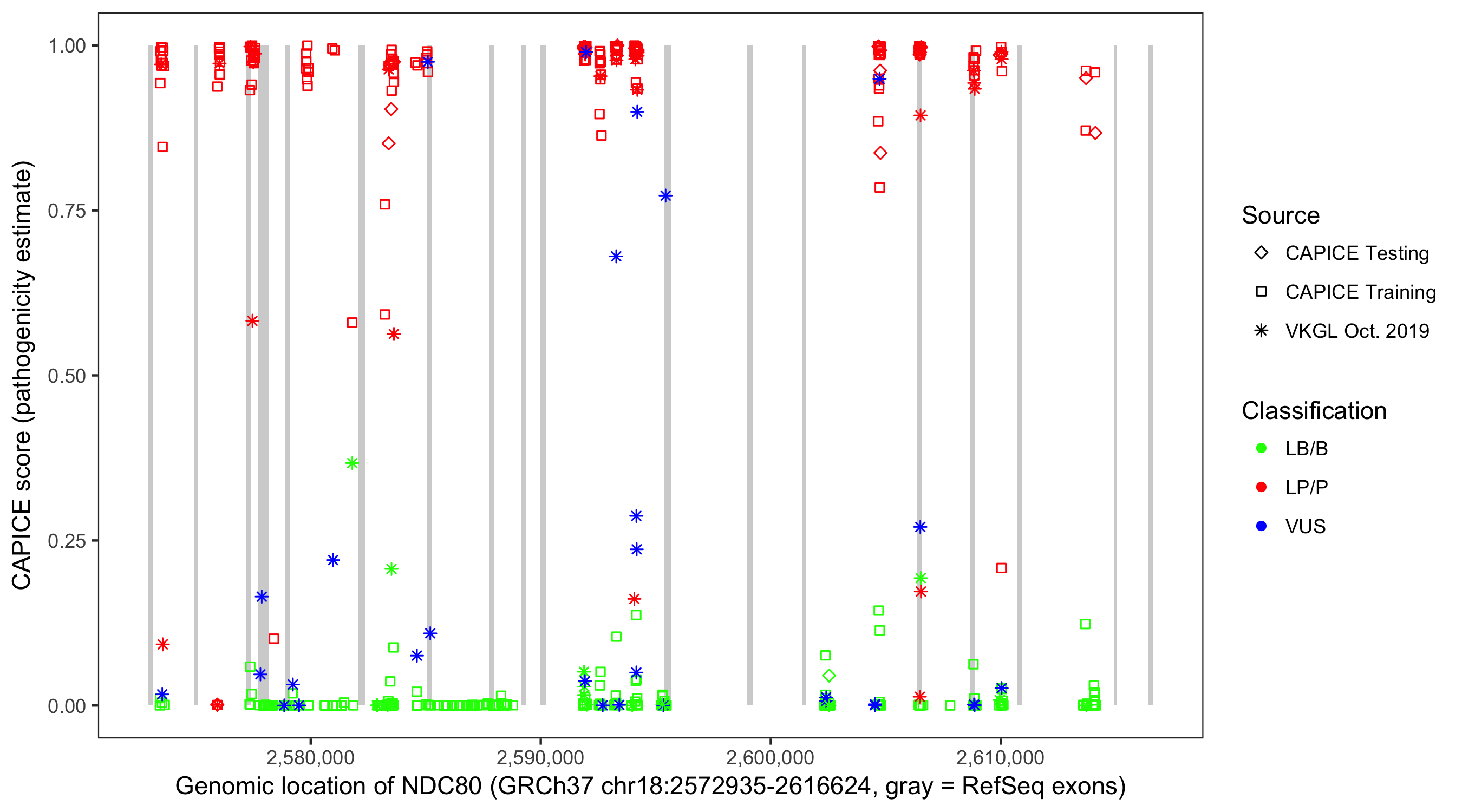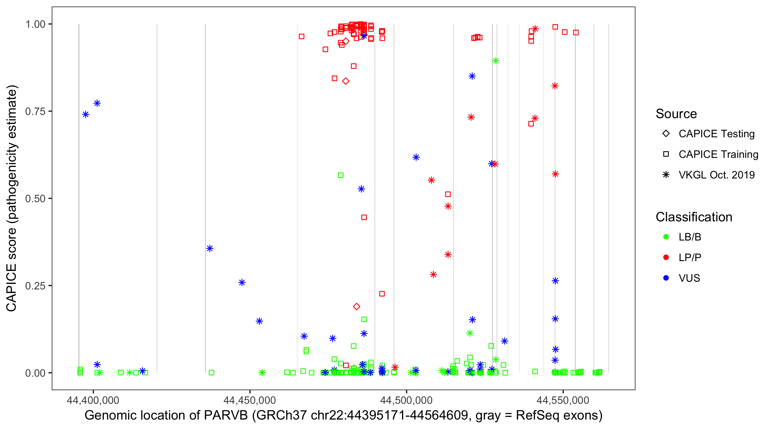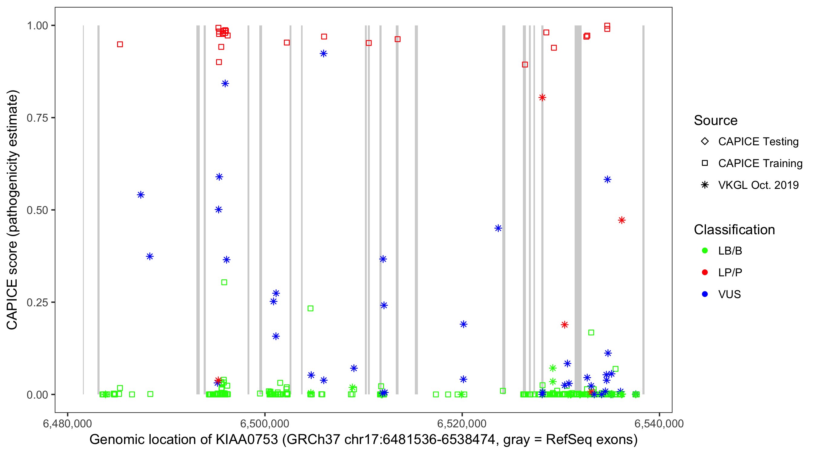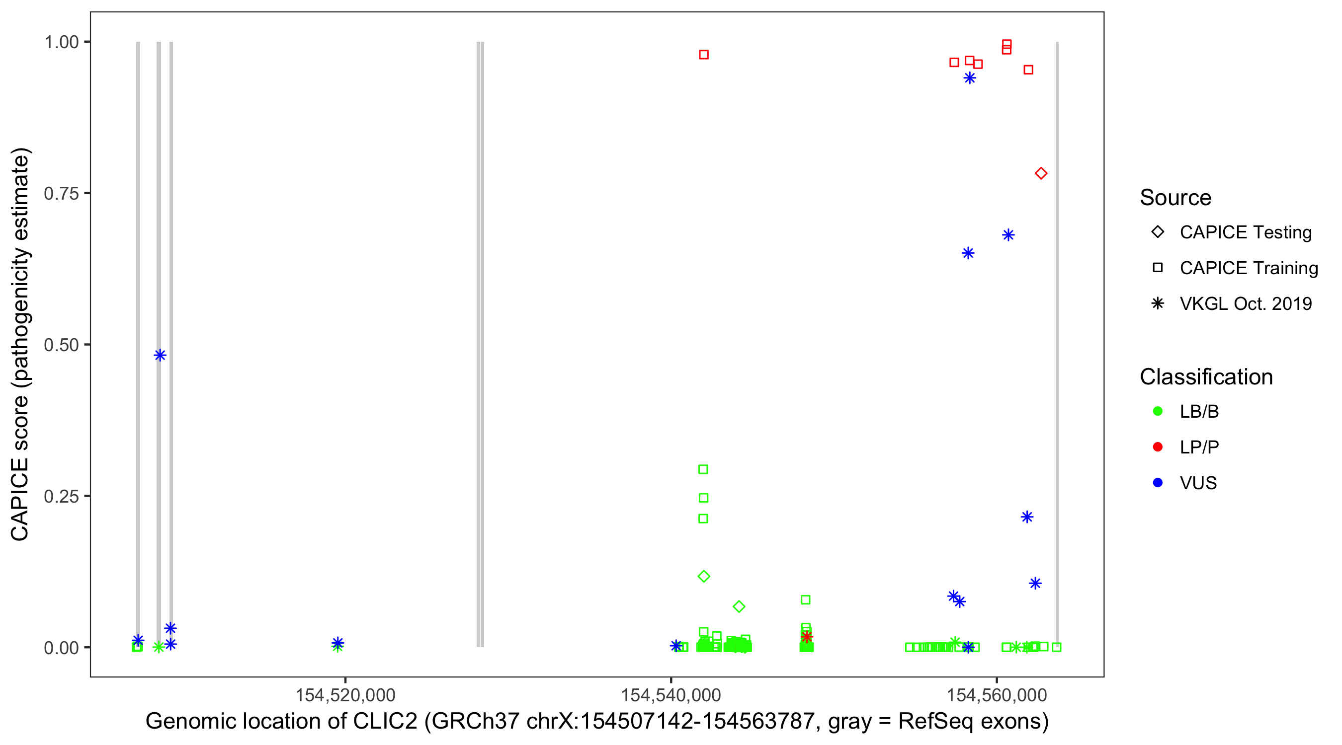 Shown are CAPICE train/test variants plus VKGL Oct 2019.