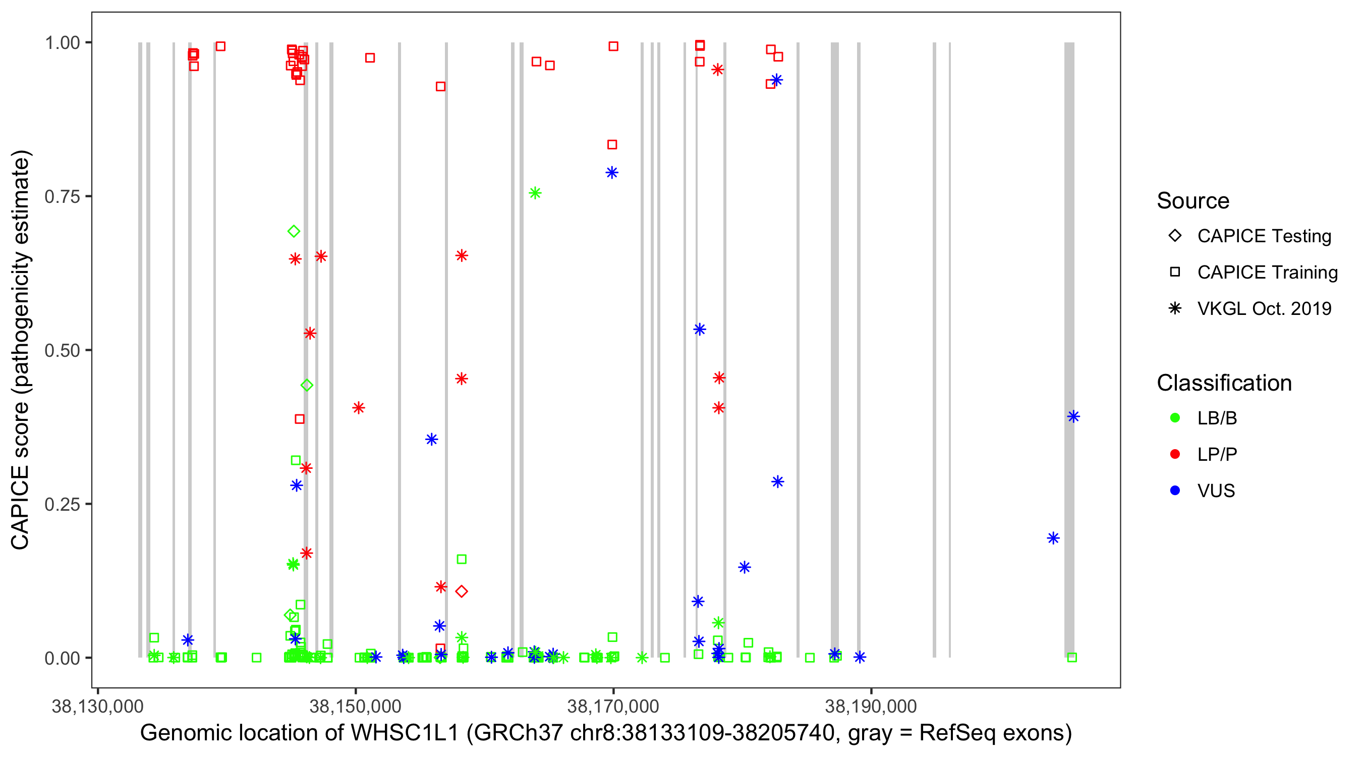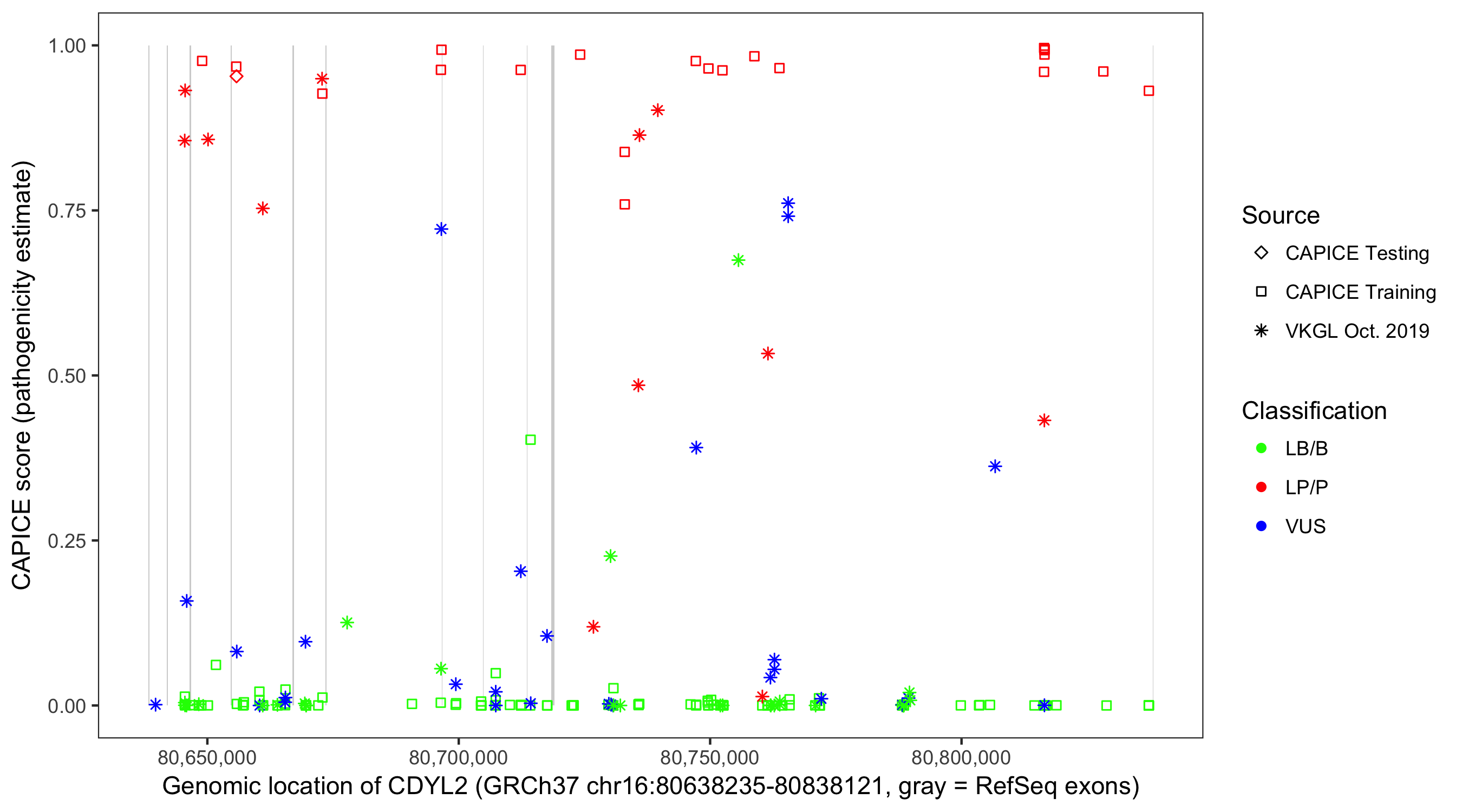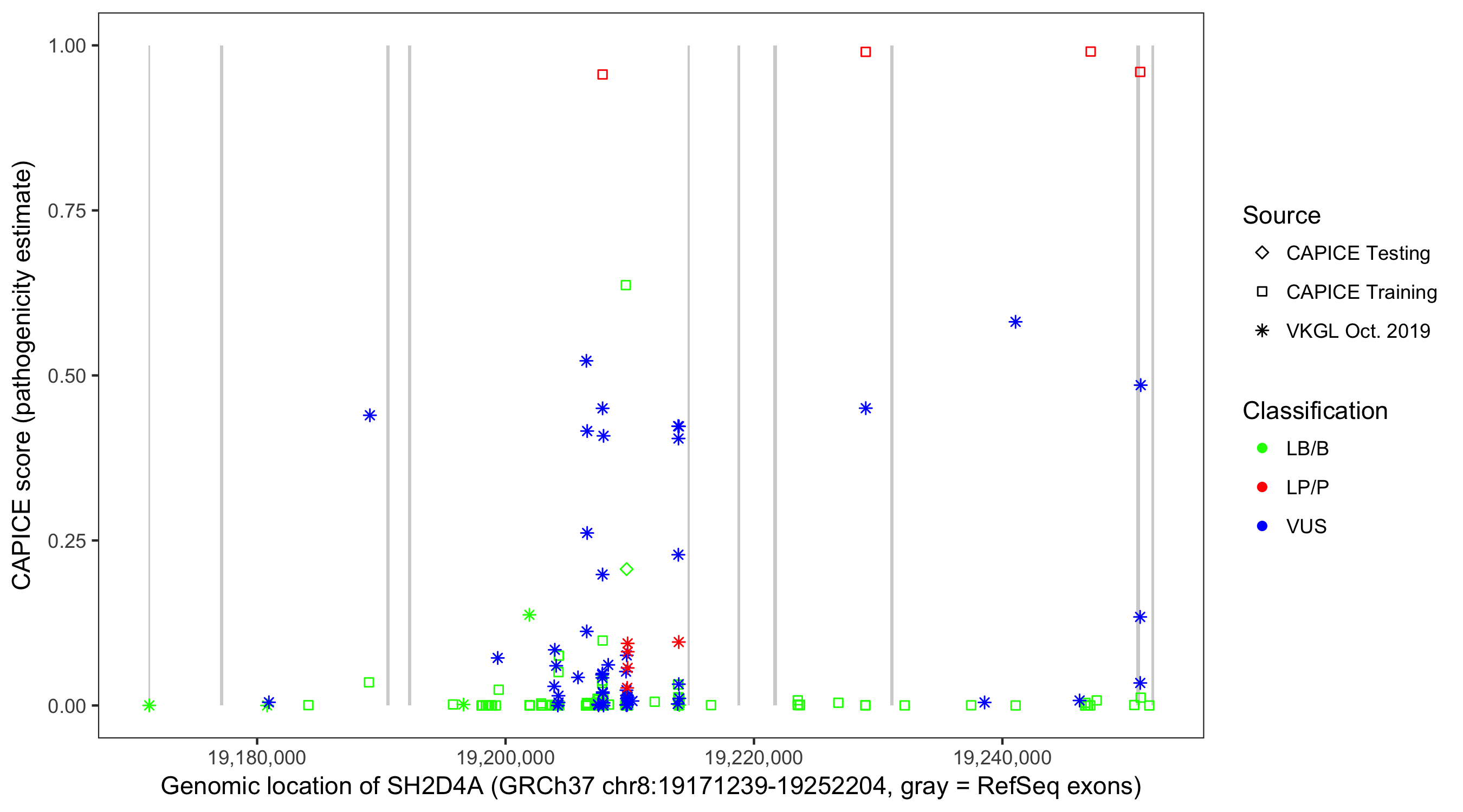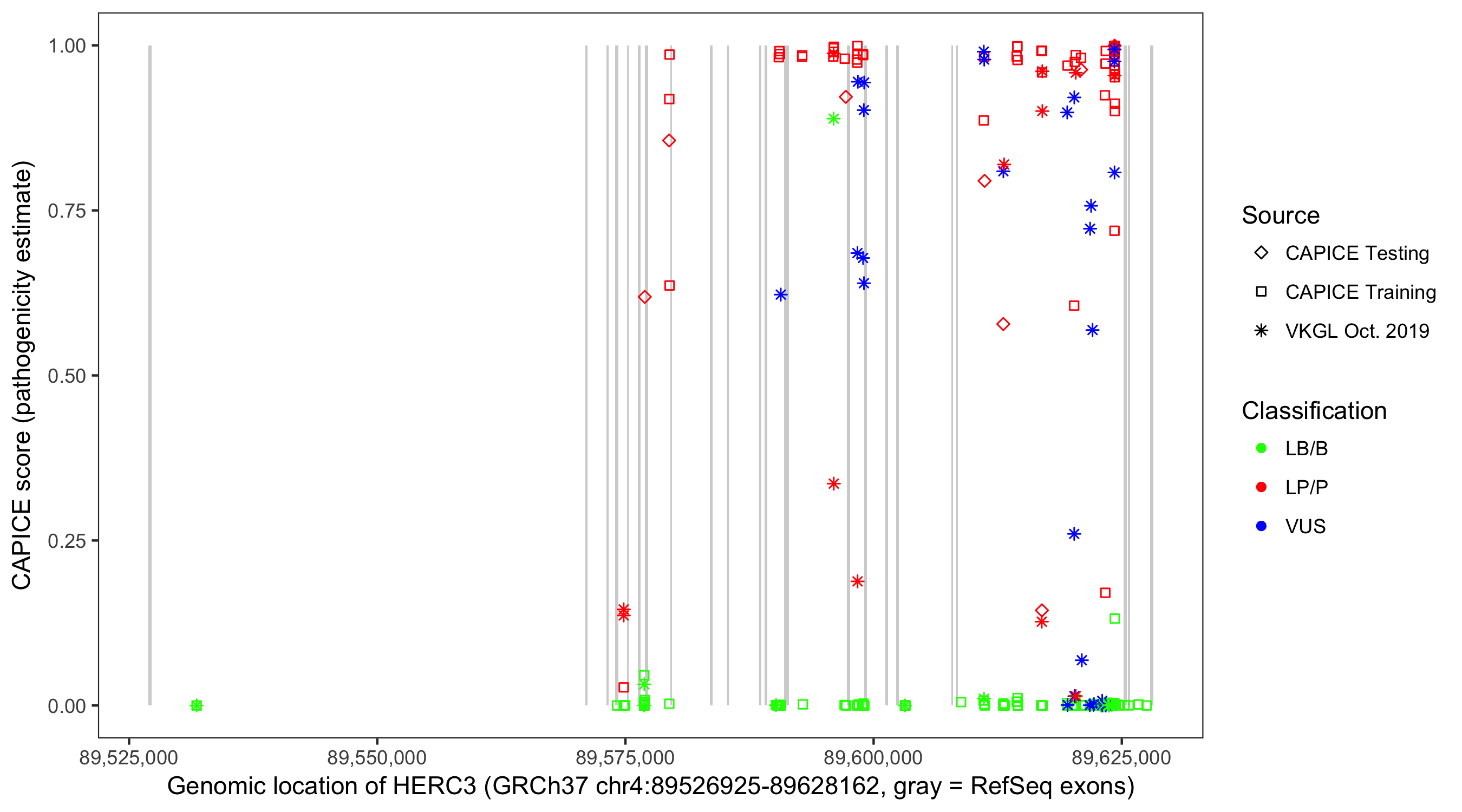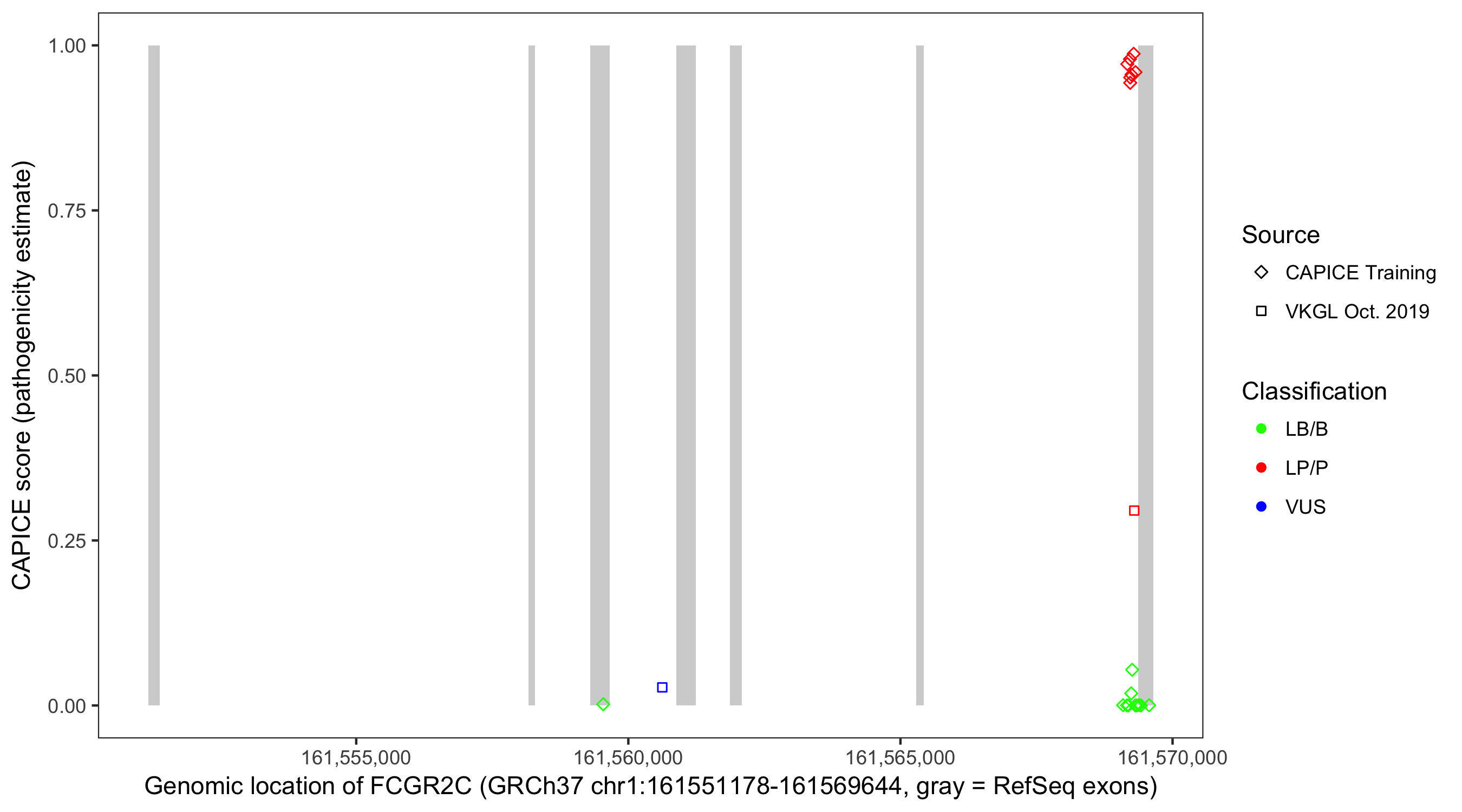 Shown are CAPICE train/test variants plus VKGL Oct 2019.