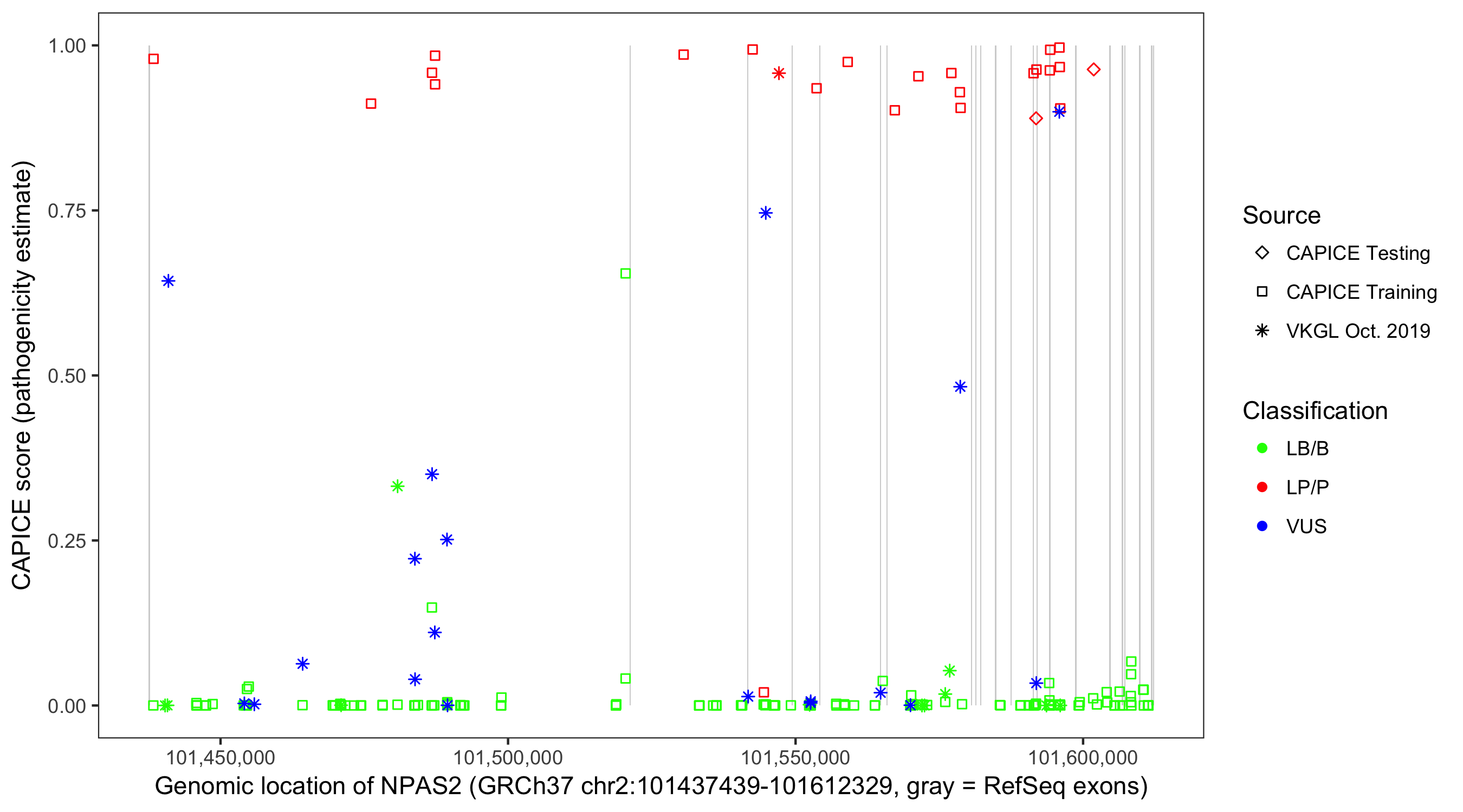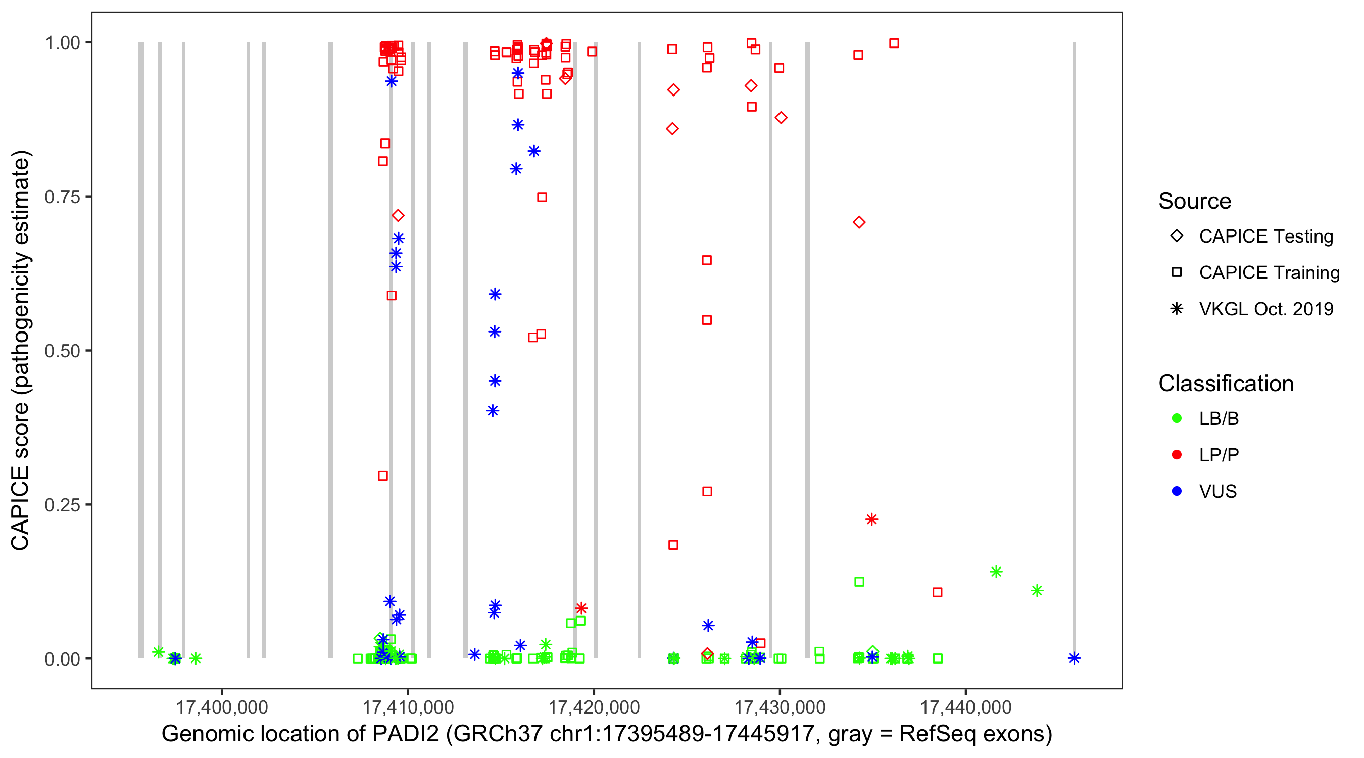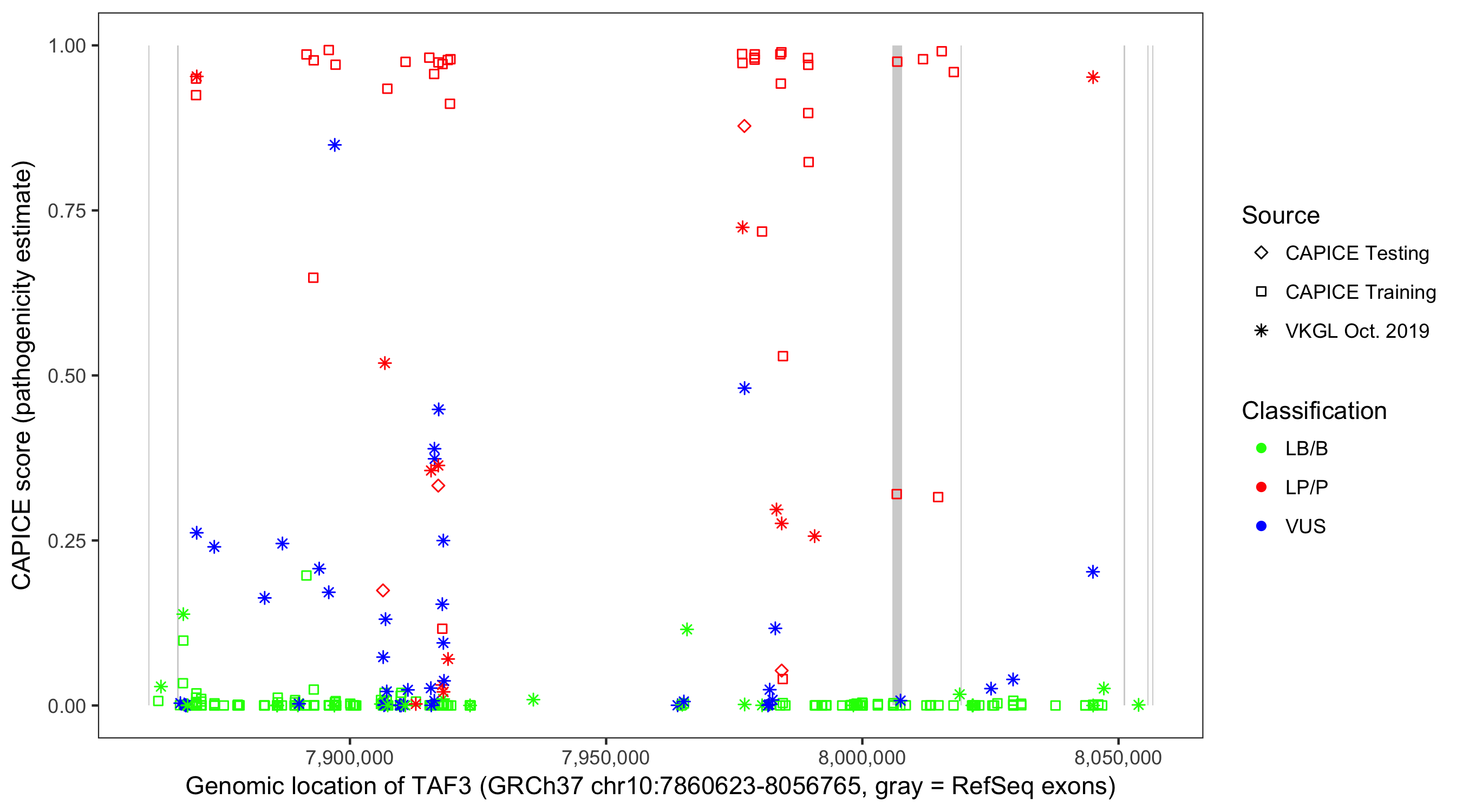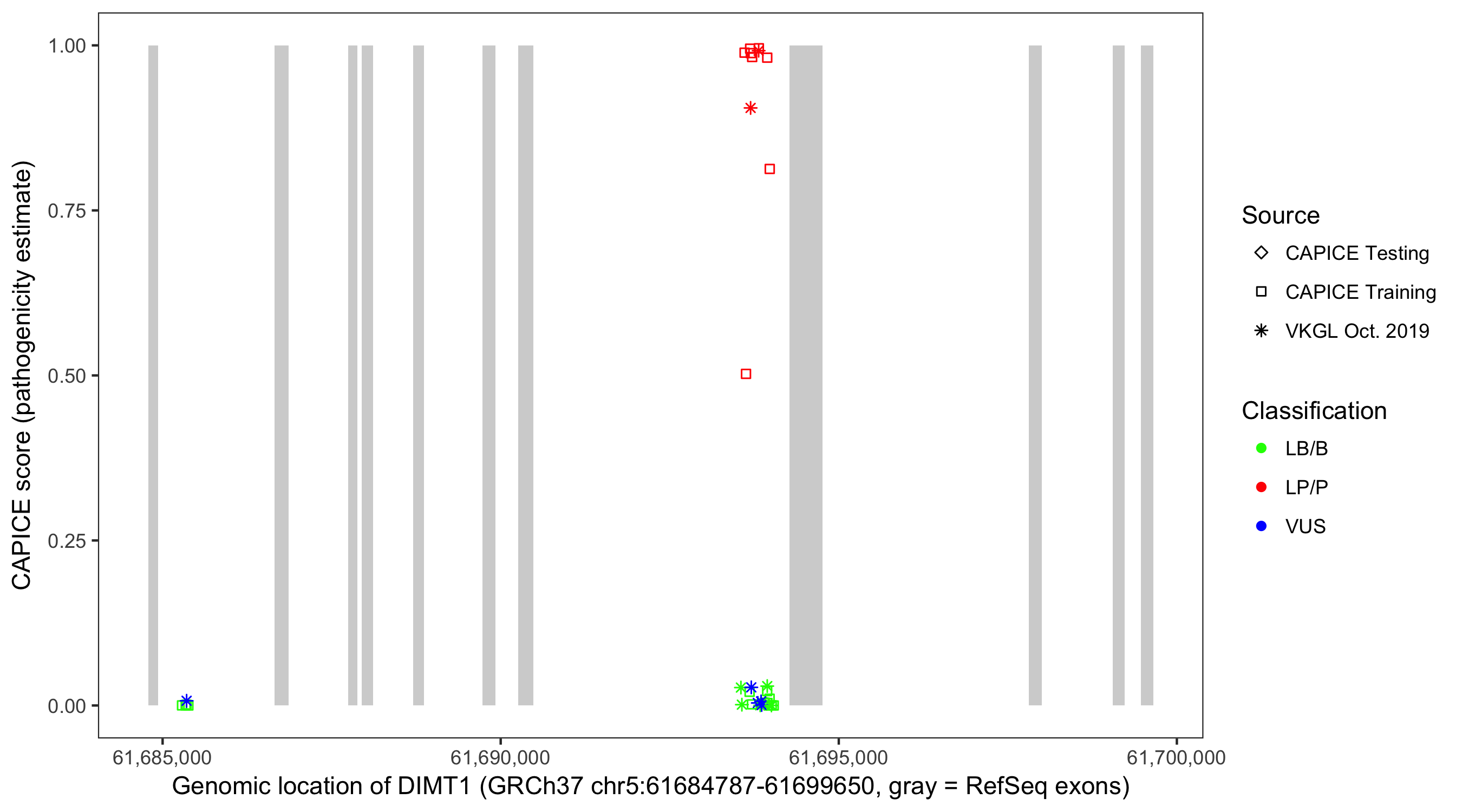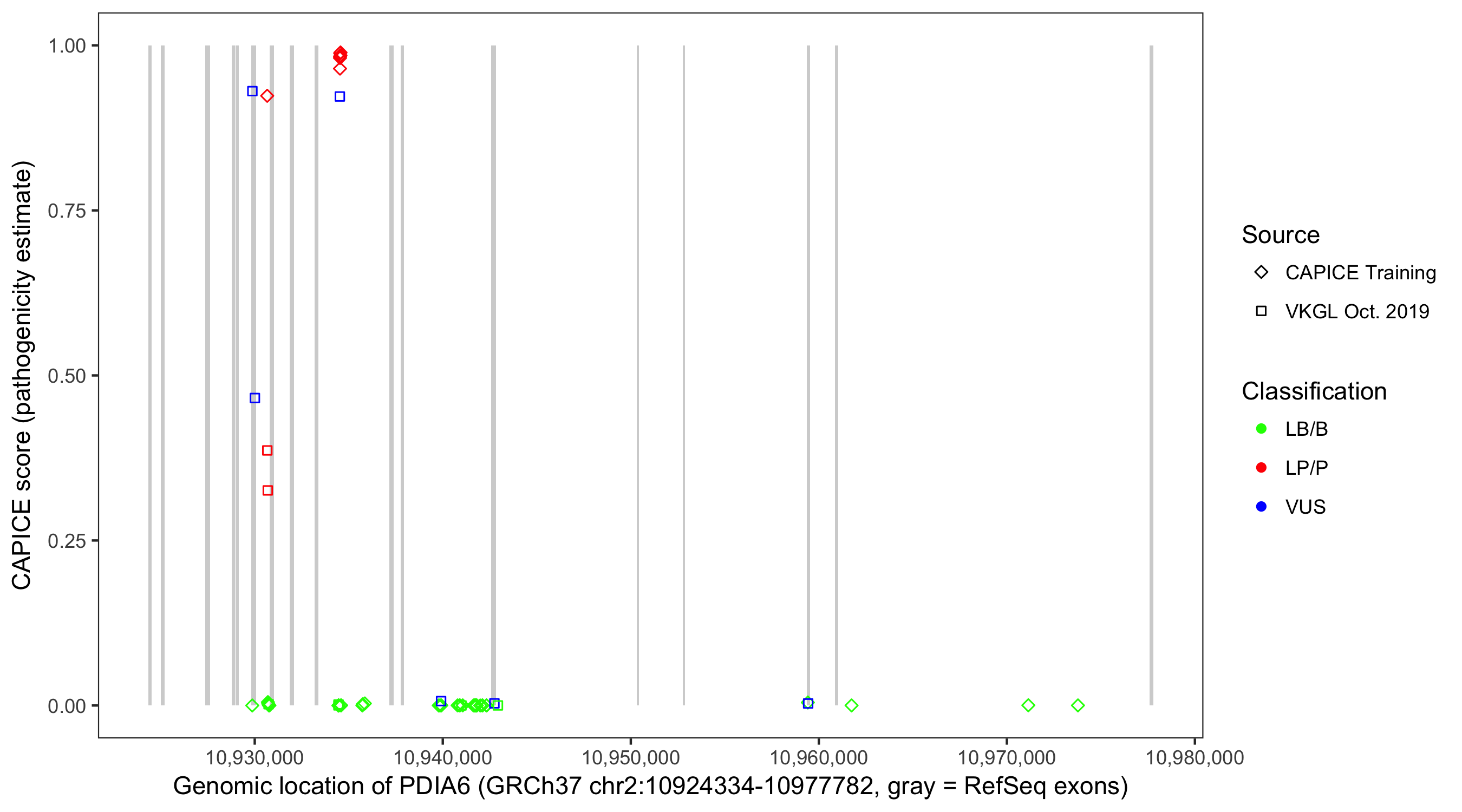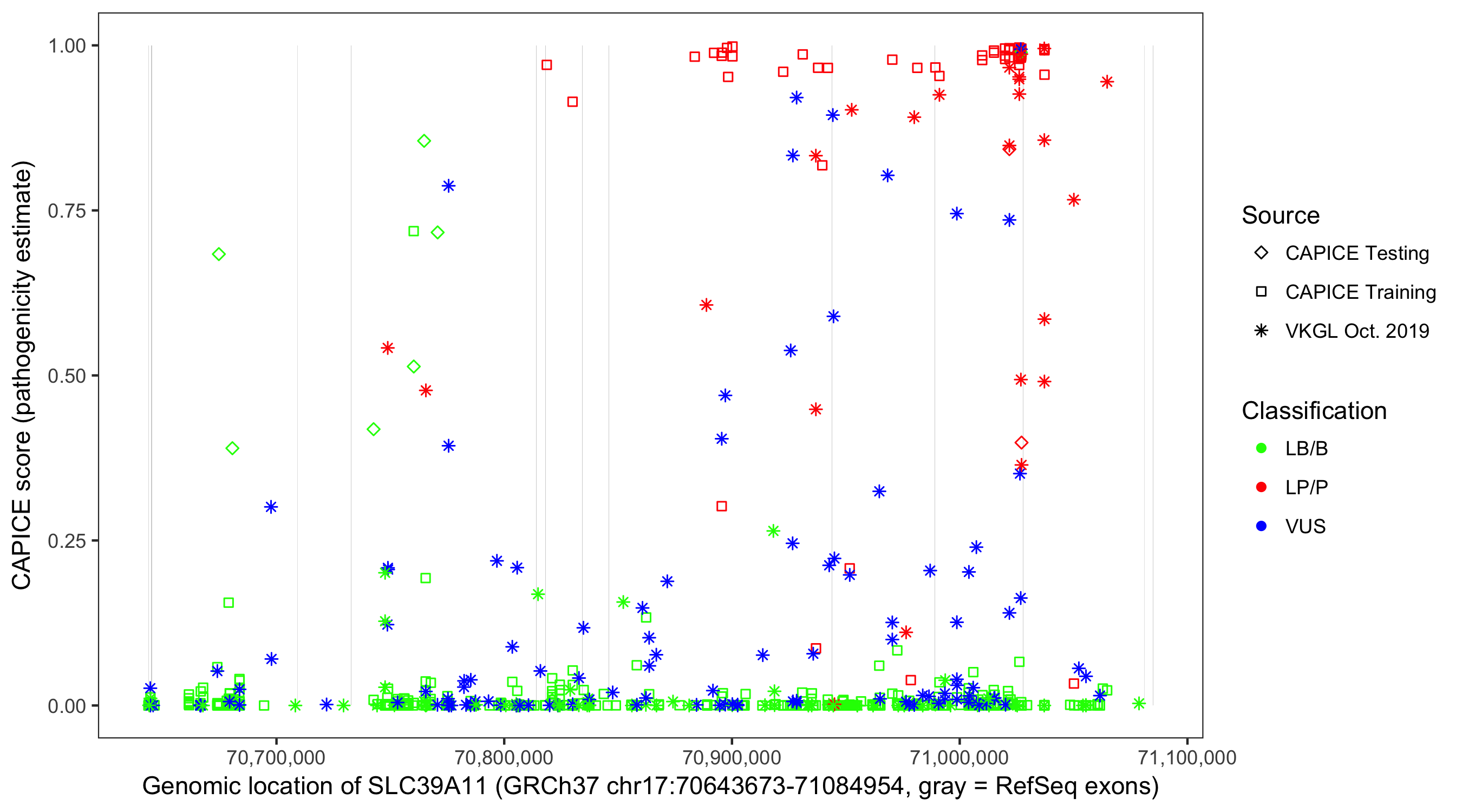 Shown are CAPICE train/test variants plus VKGL Oct 2019.