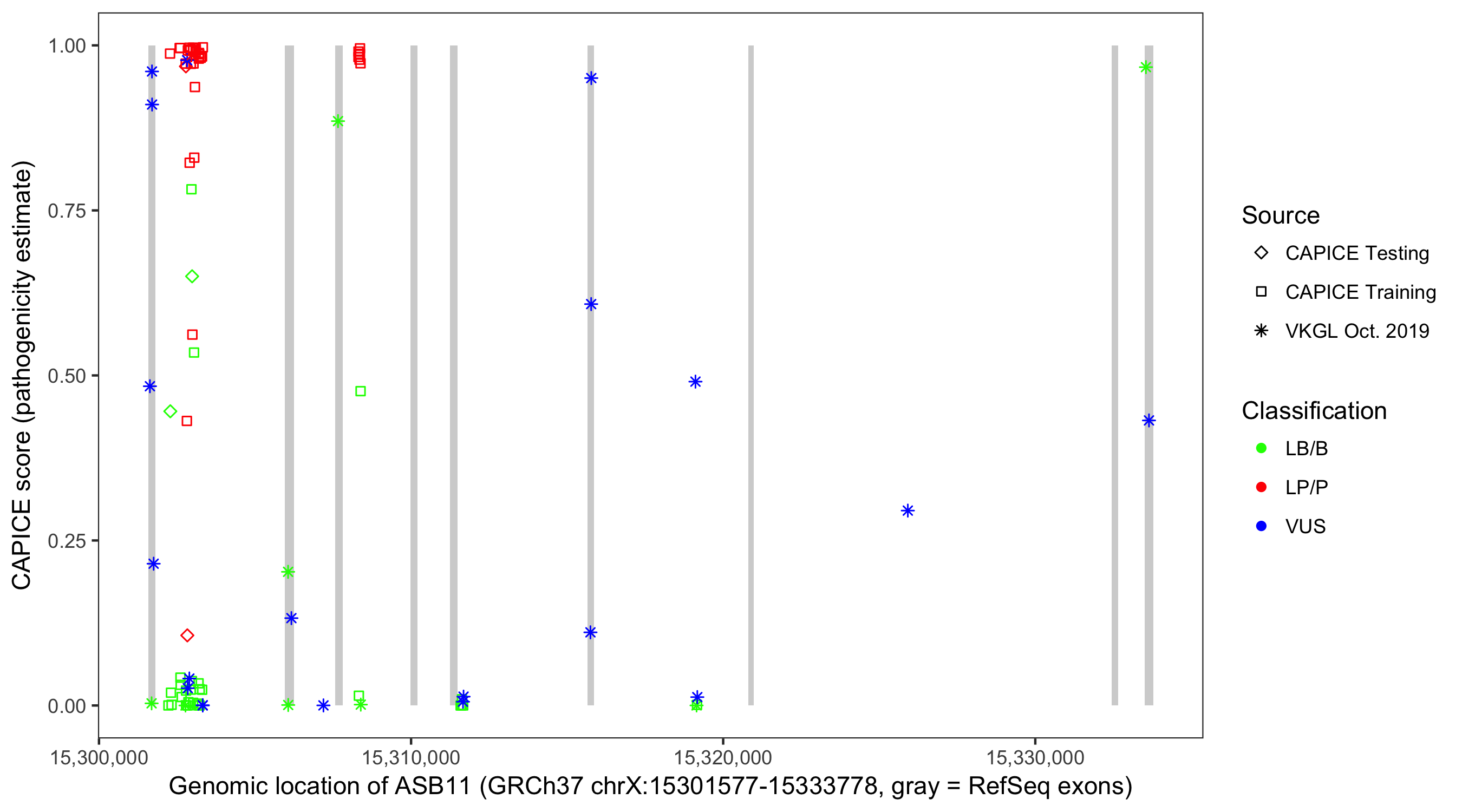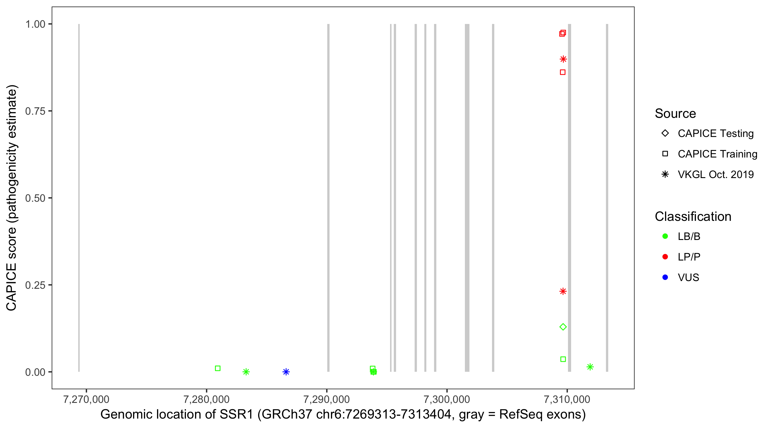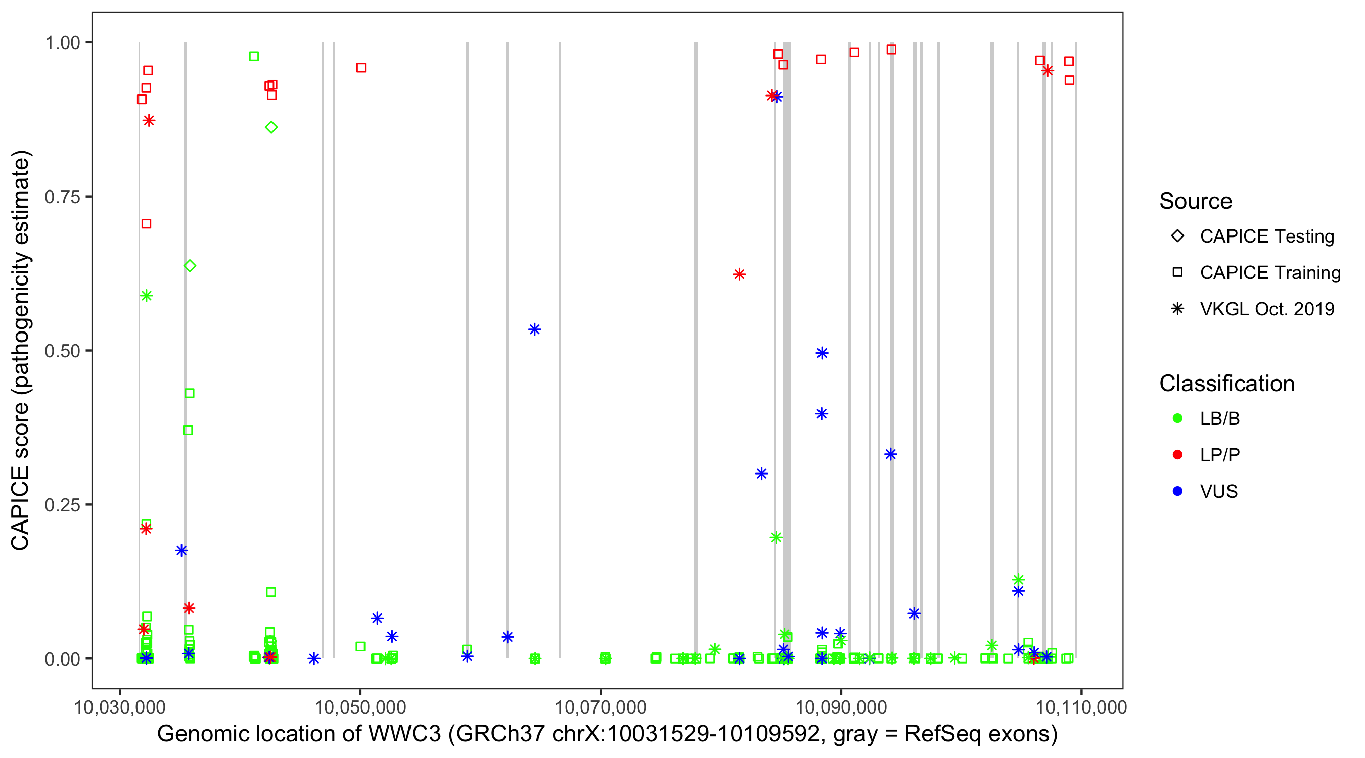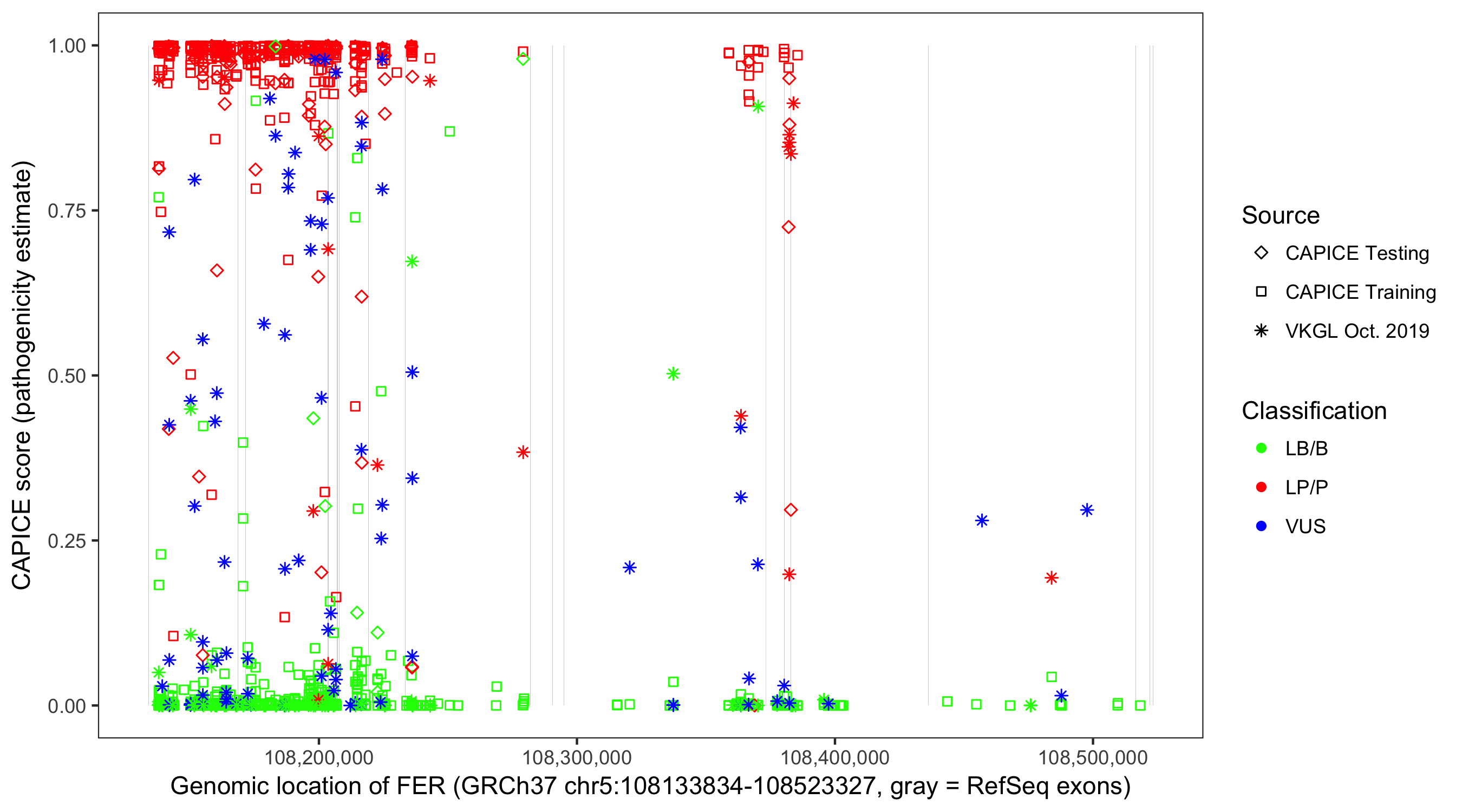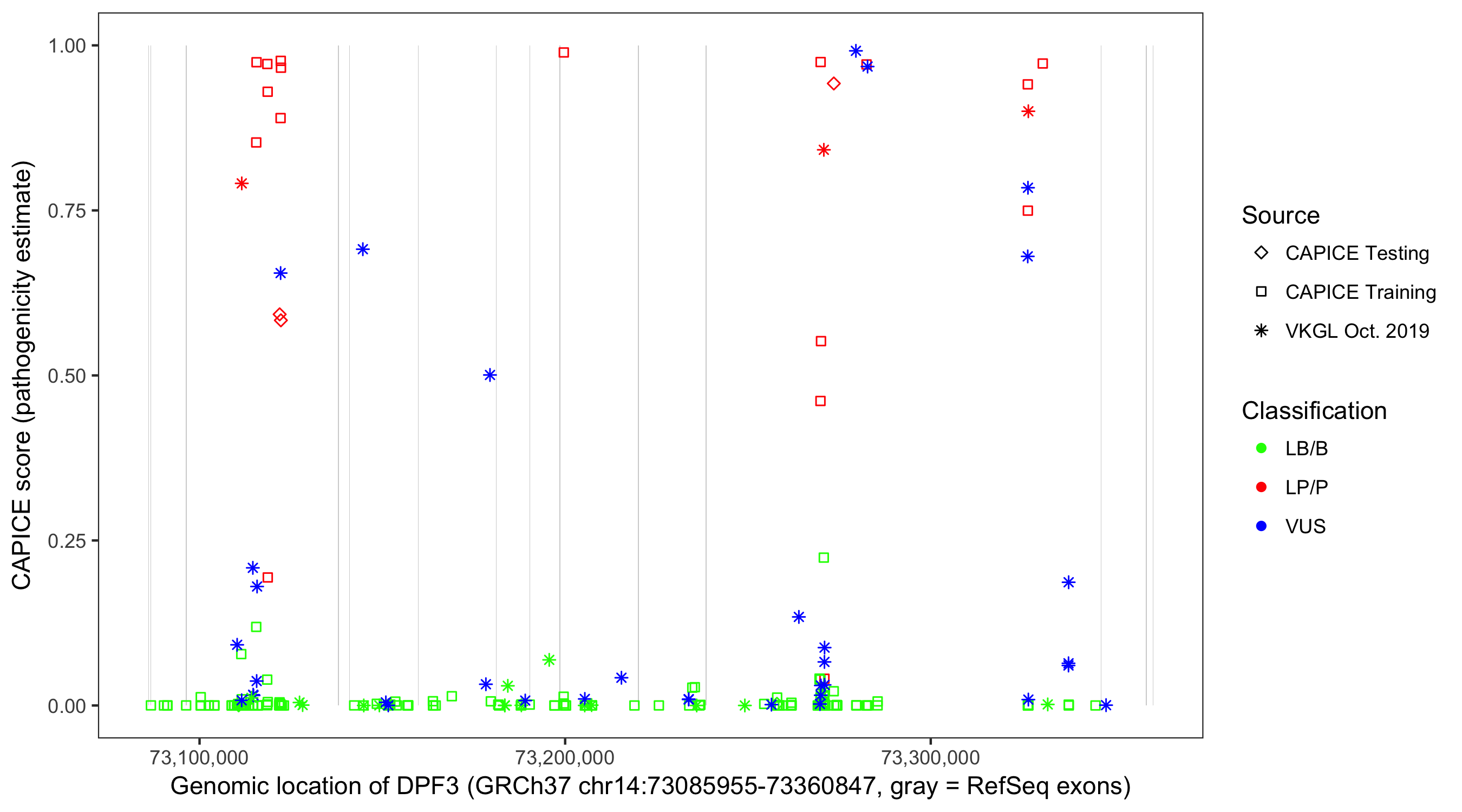 Shown are CAPICE train/test variants plus VKGL Oct 2019.