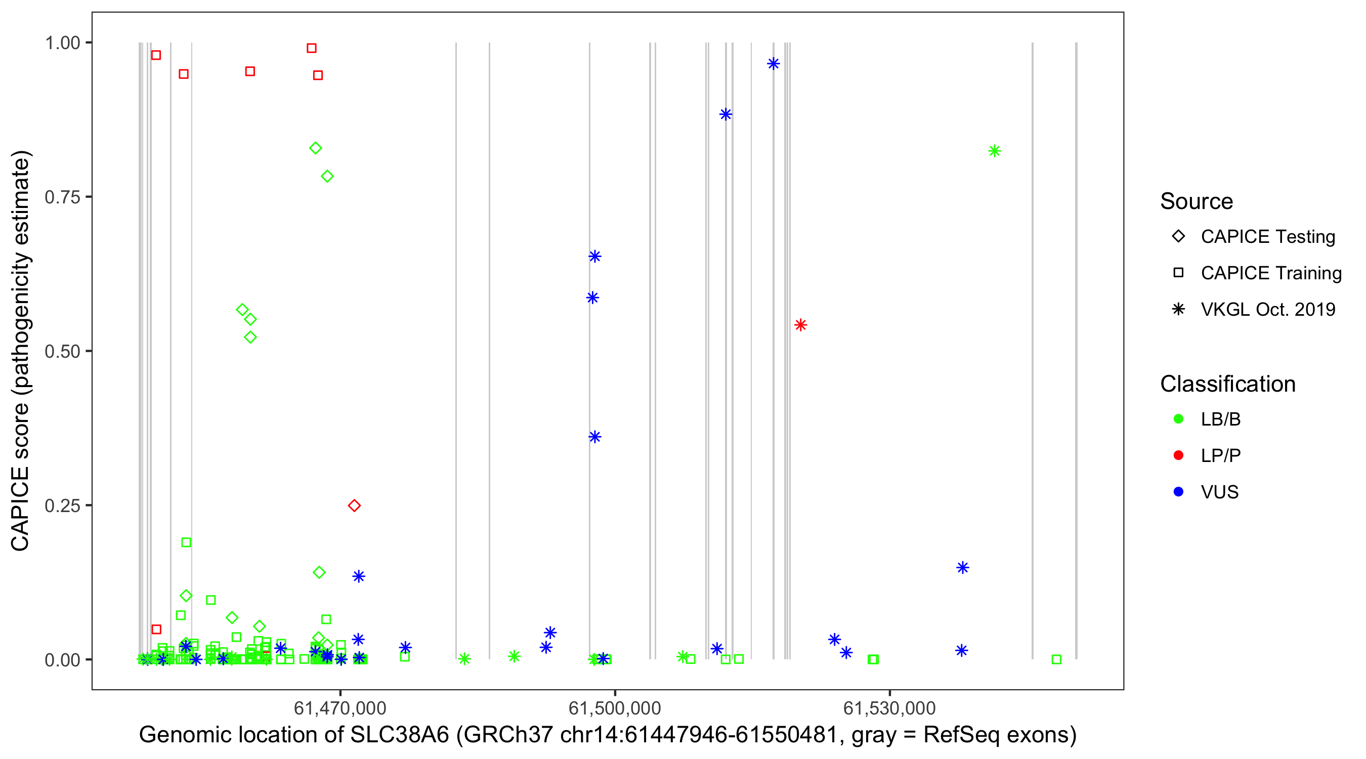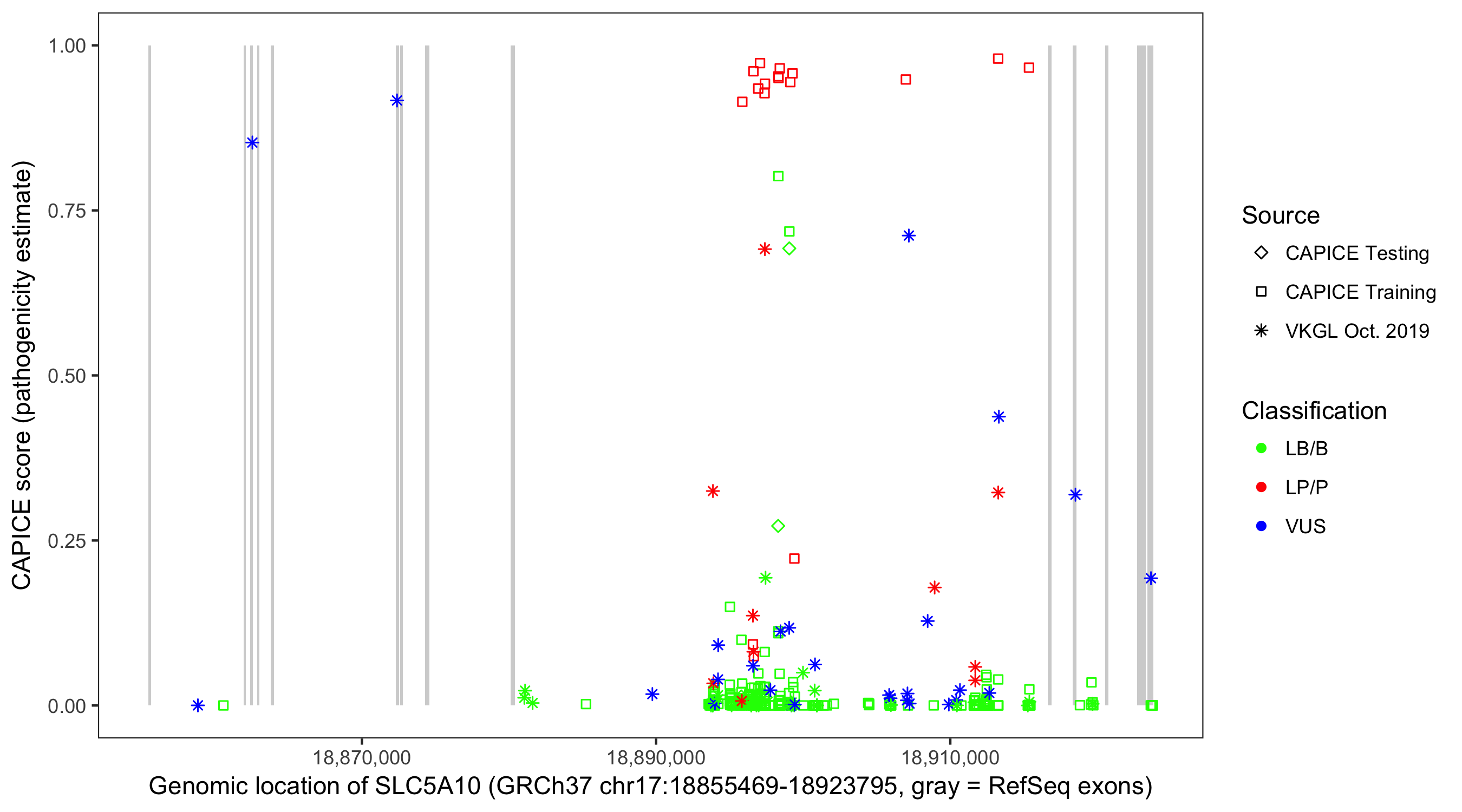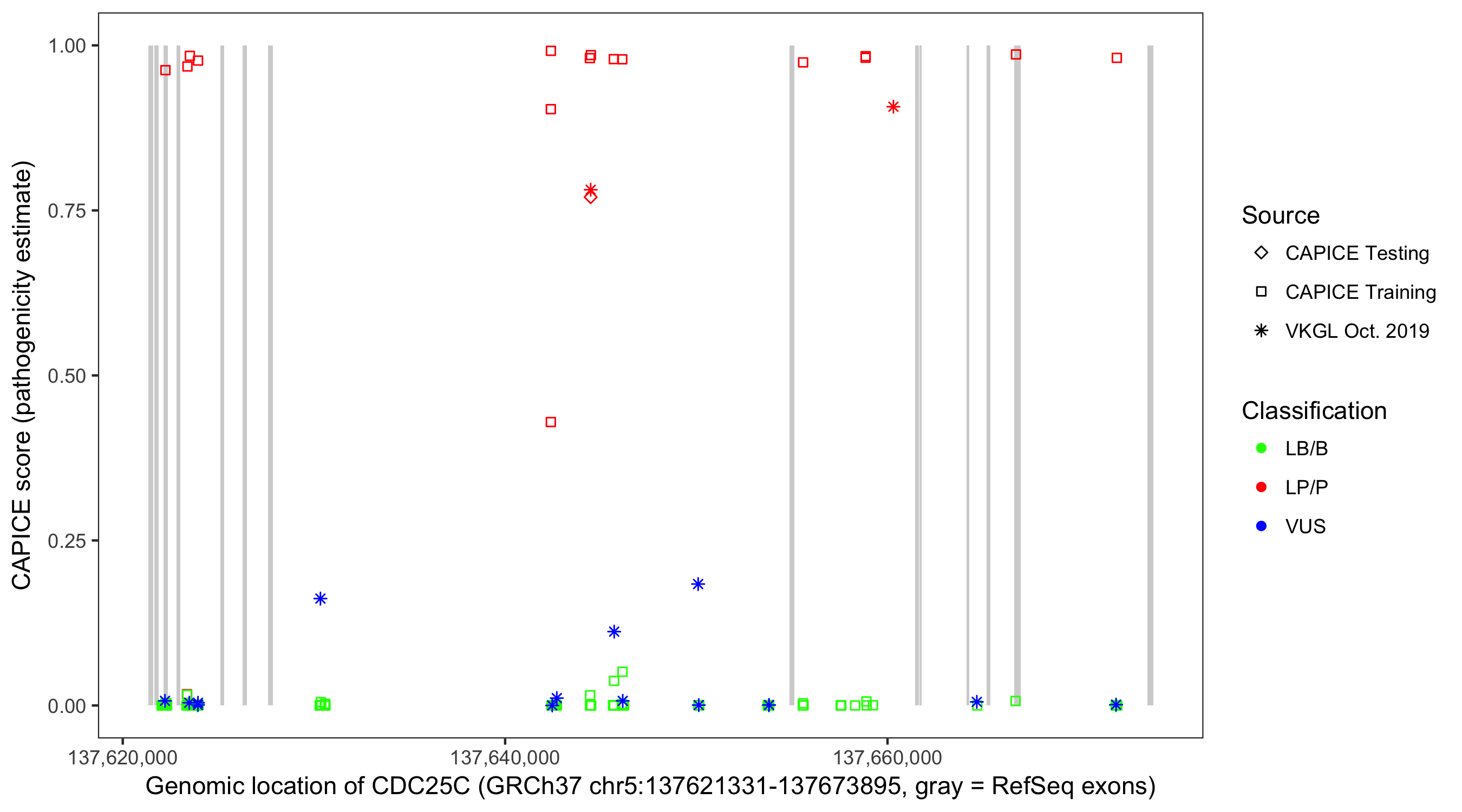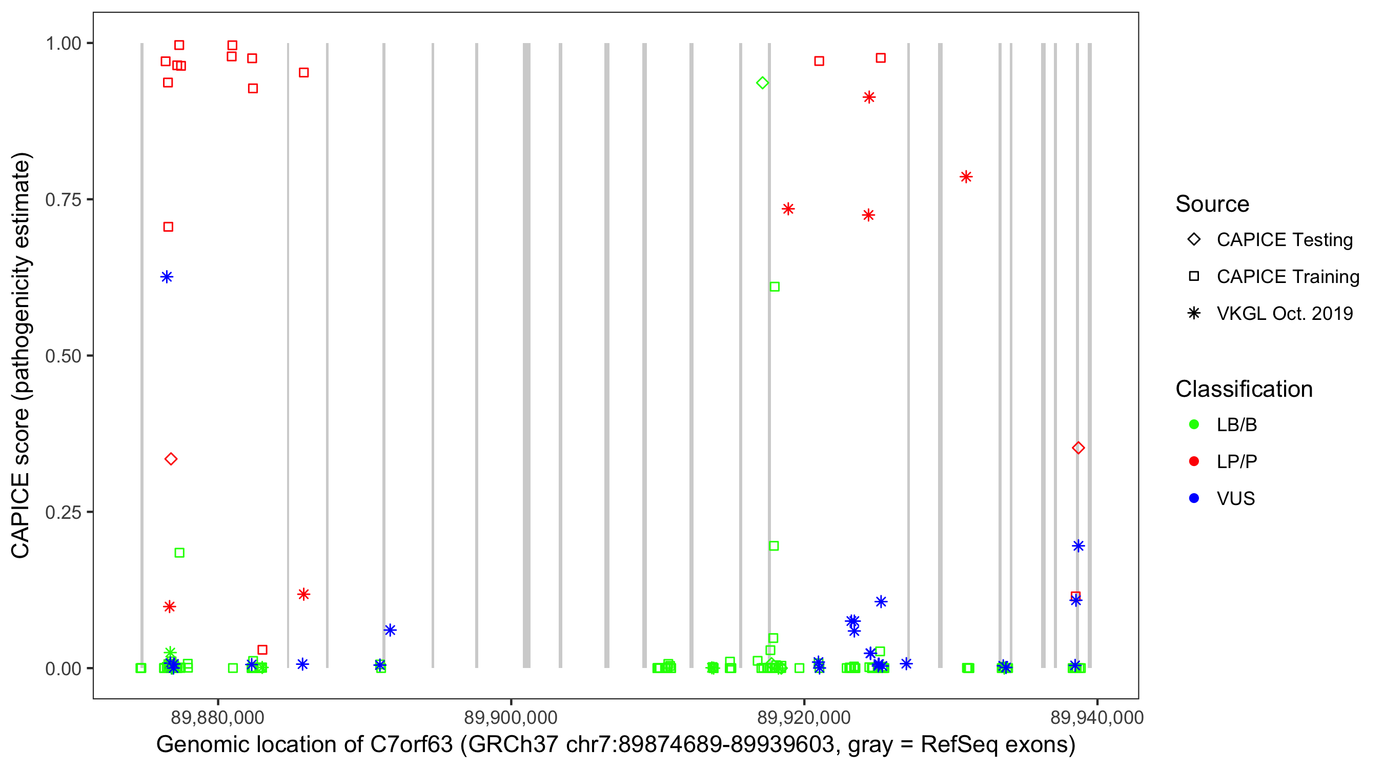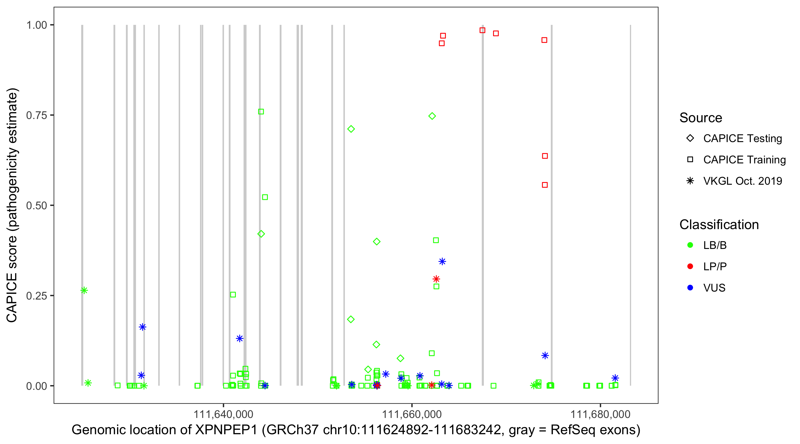 Shown are CAPICE train/test variants plus VKGL Oct 2019.