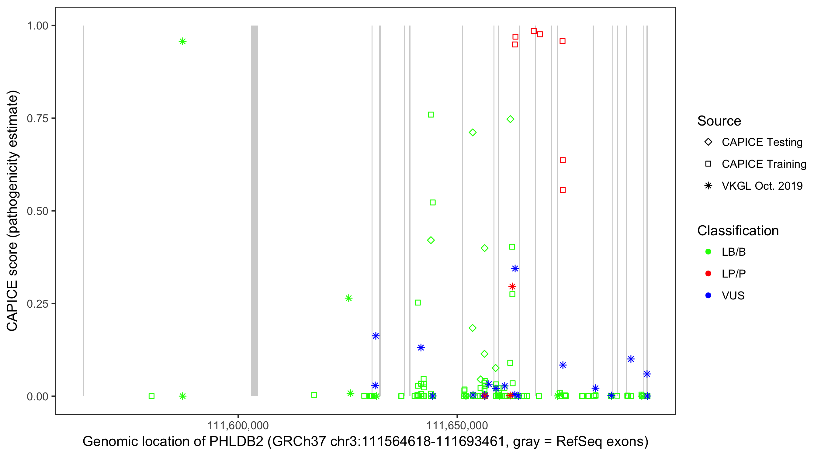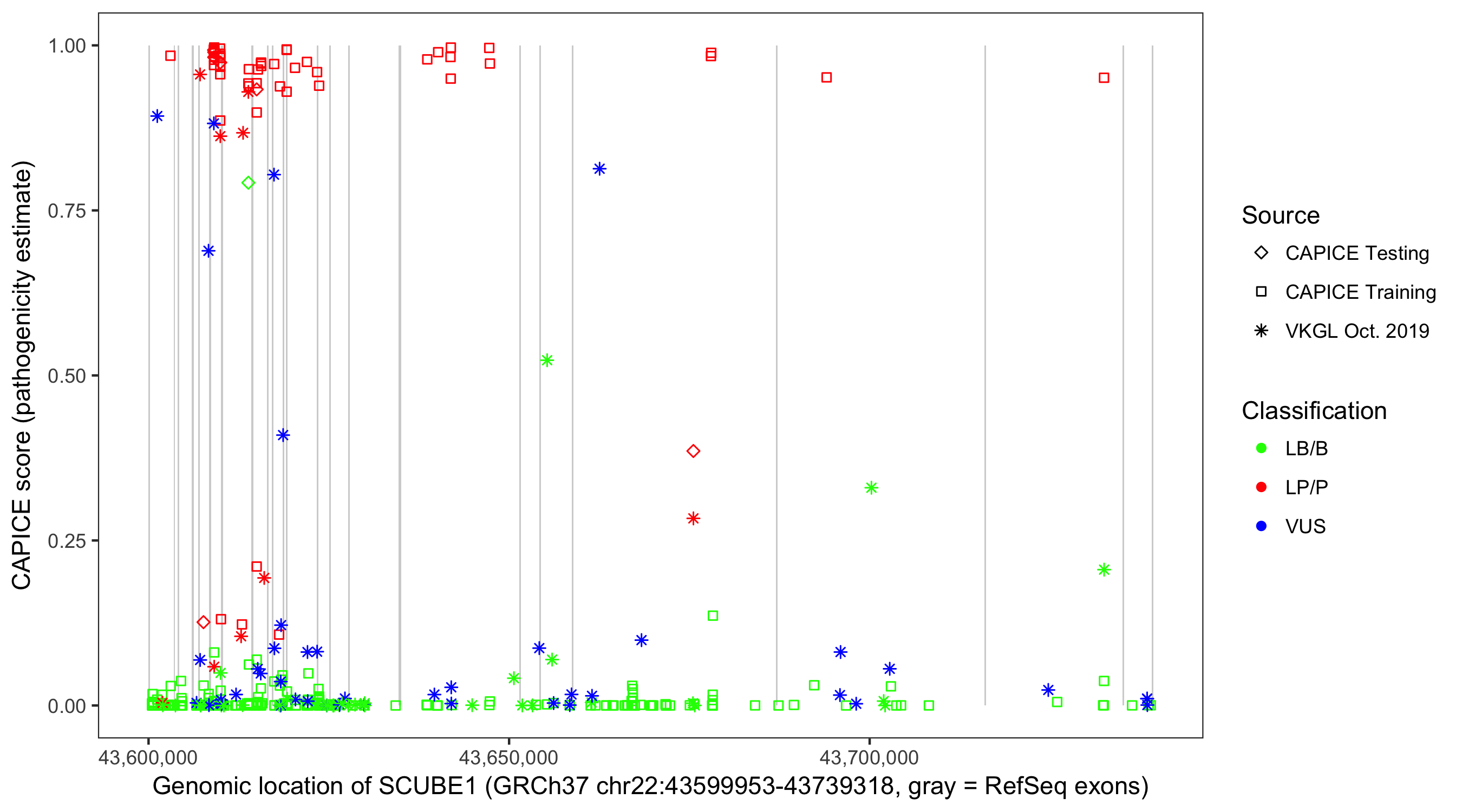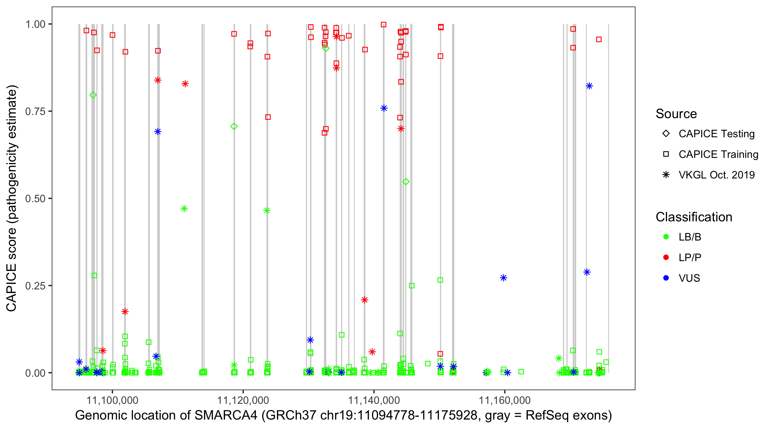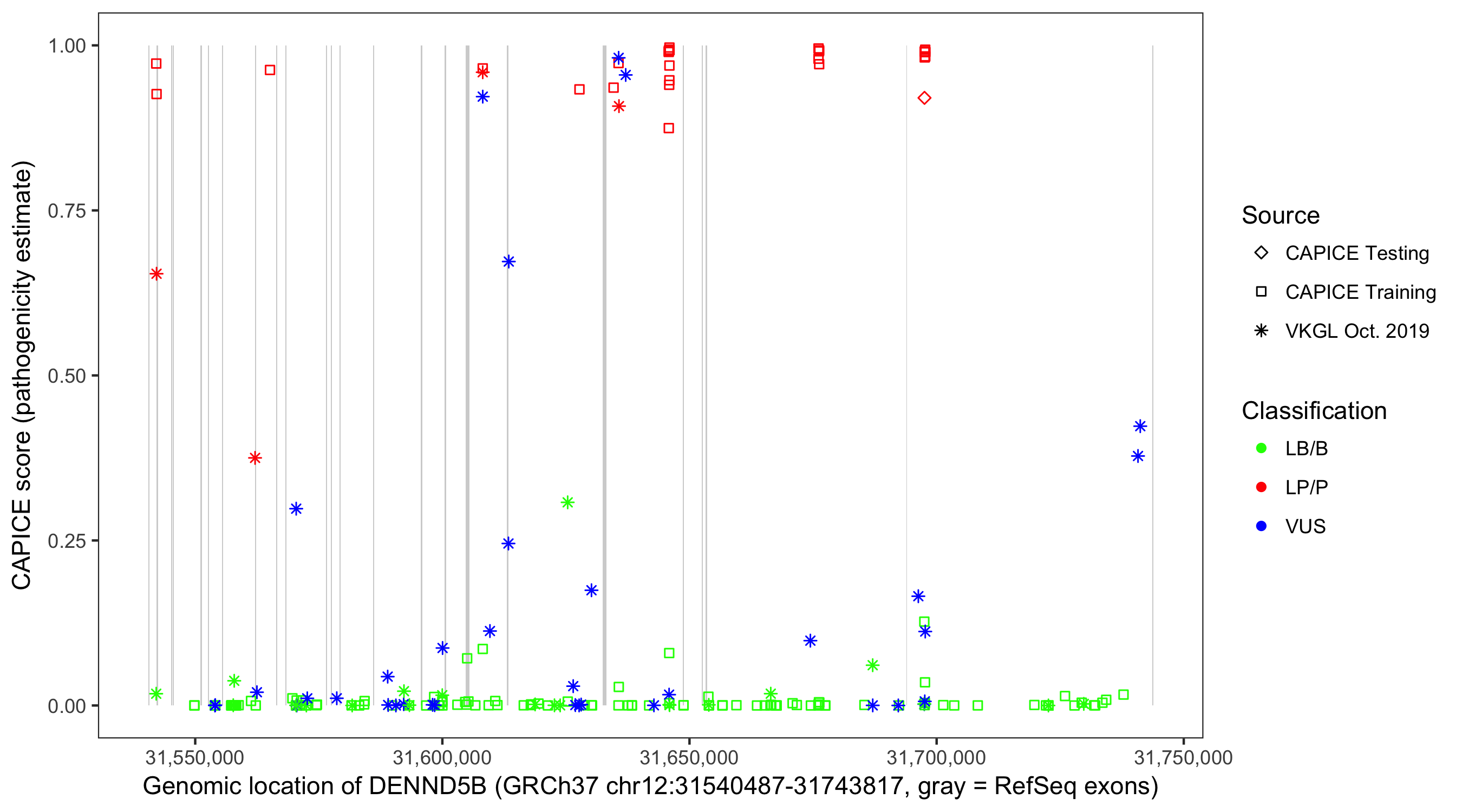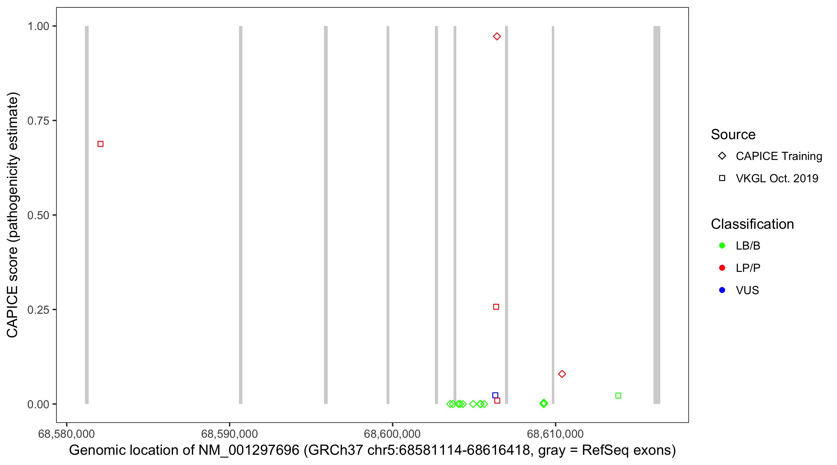 Shown are CAPICE train/test variants plus VKGL Oct 2019.