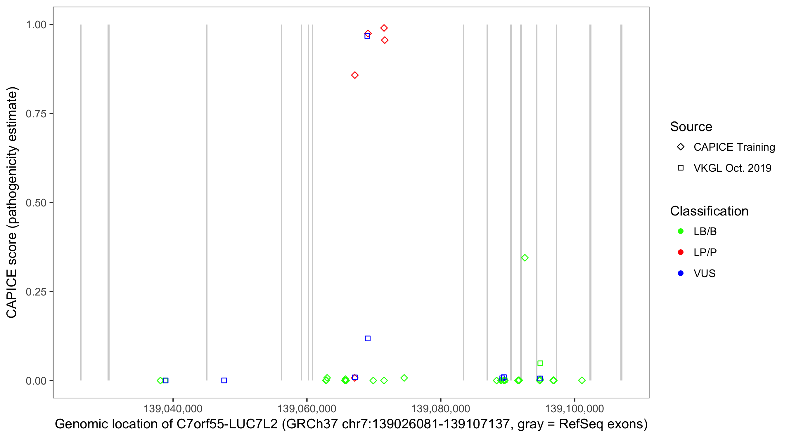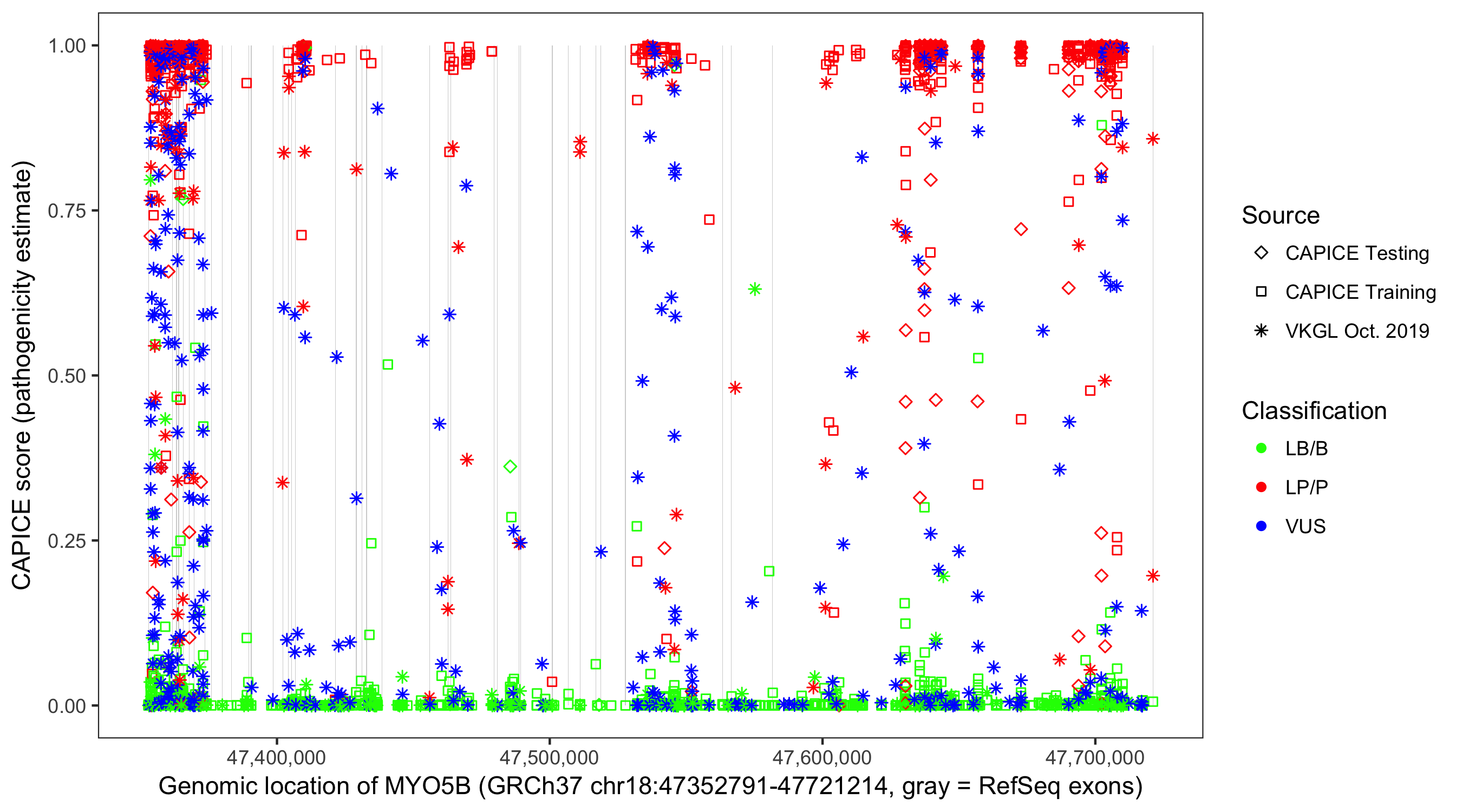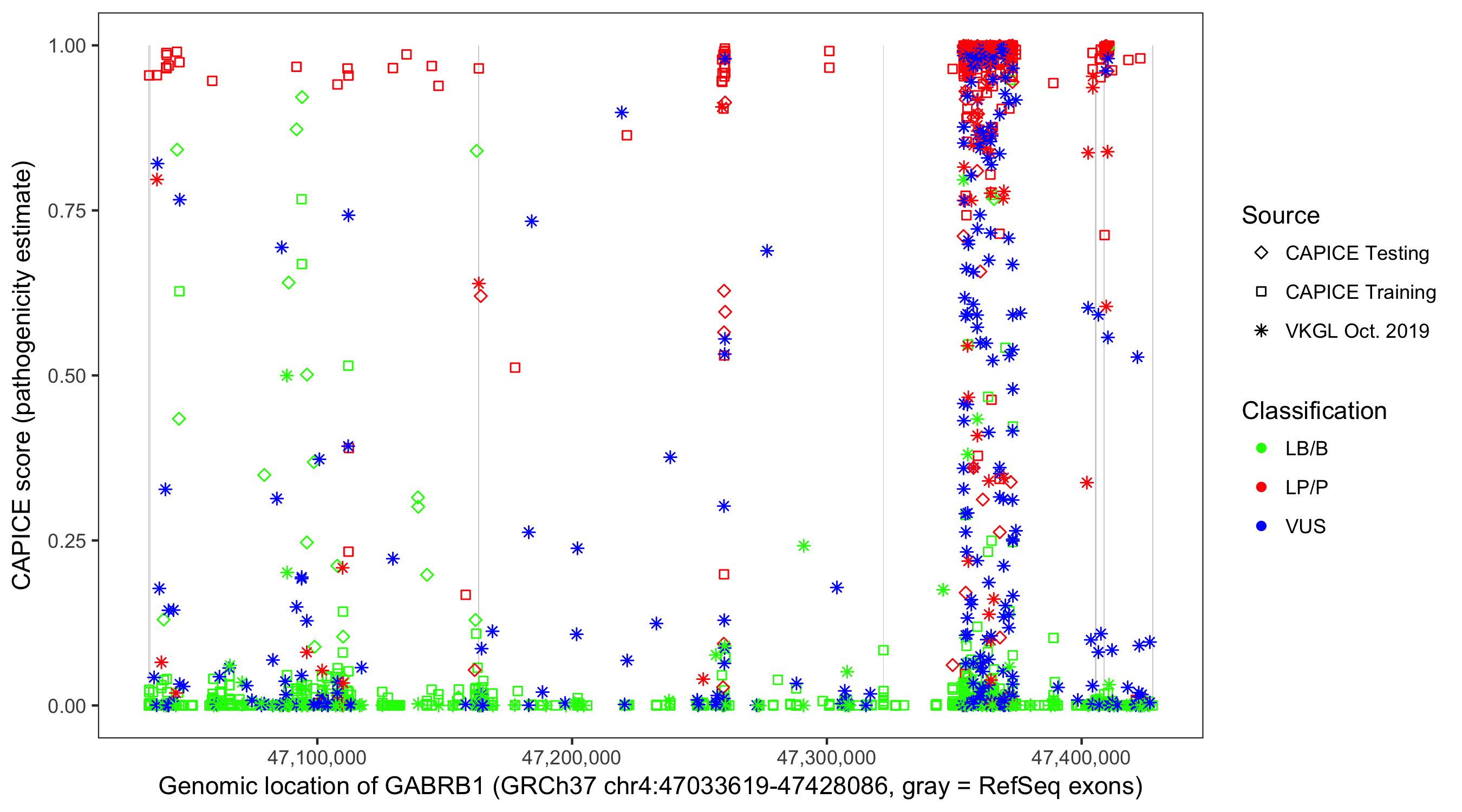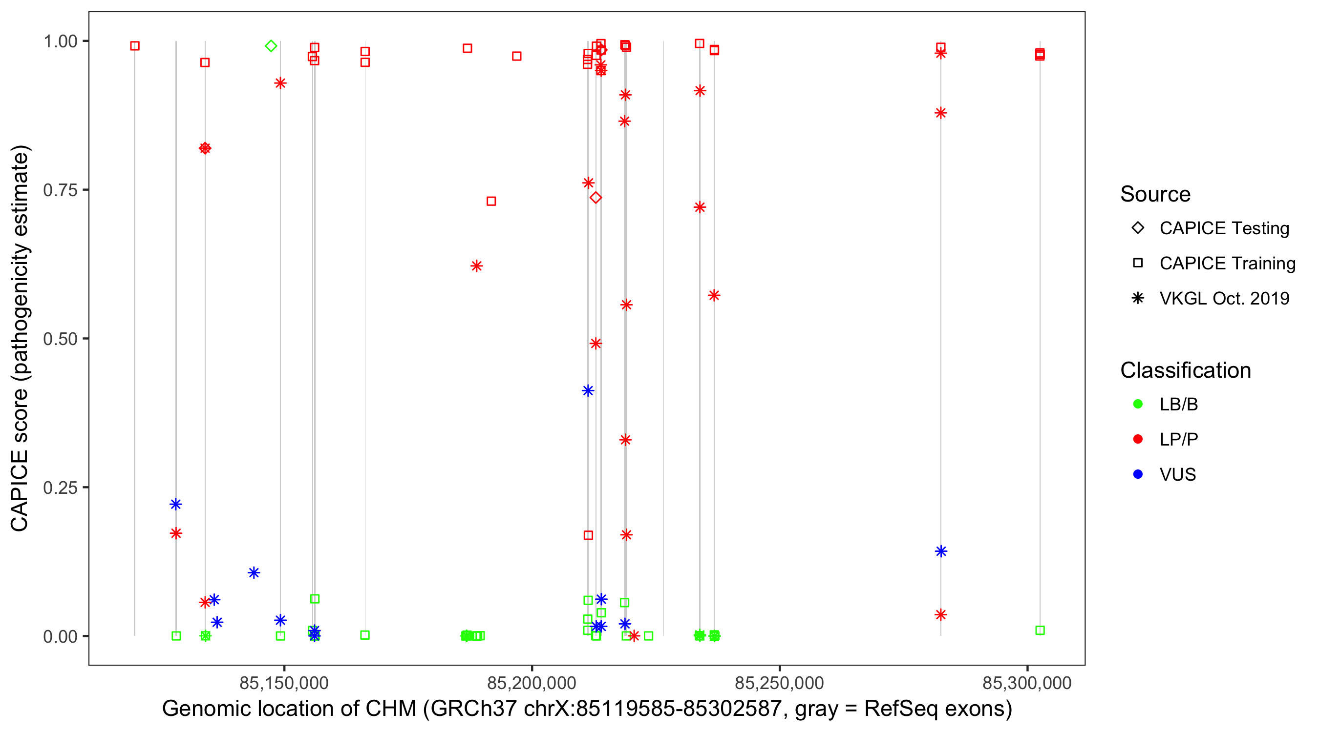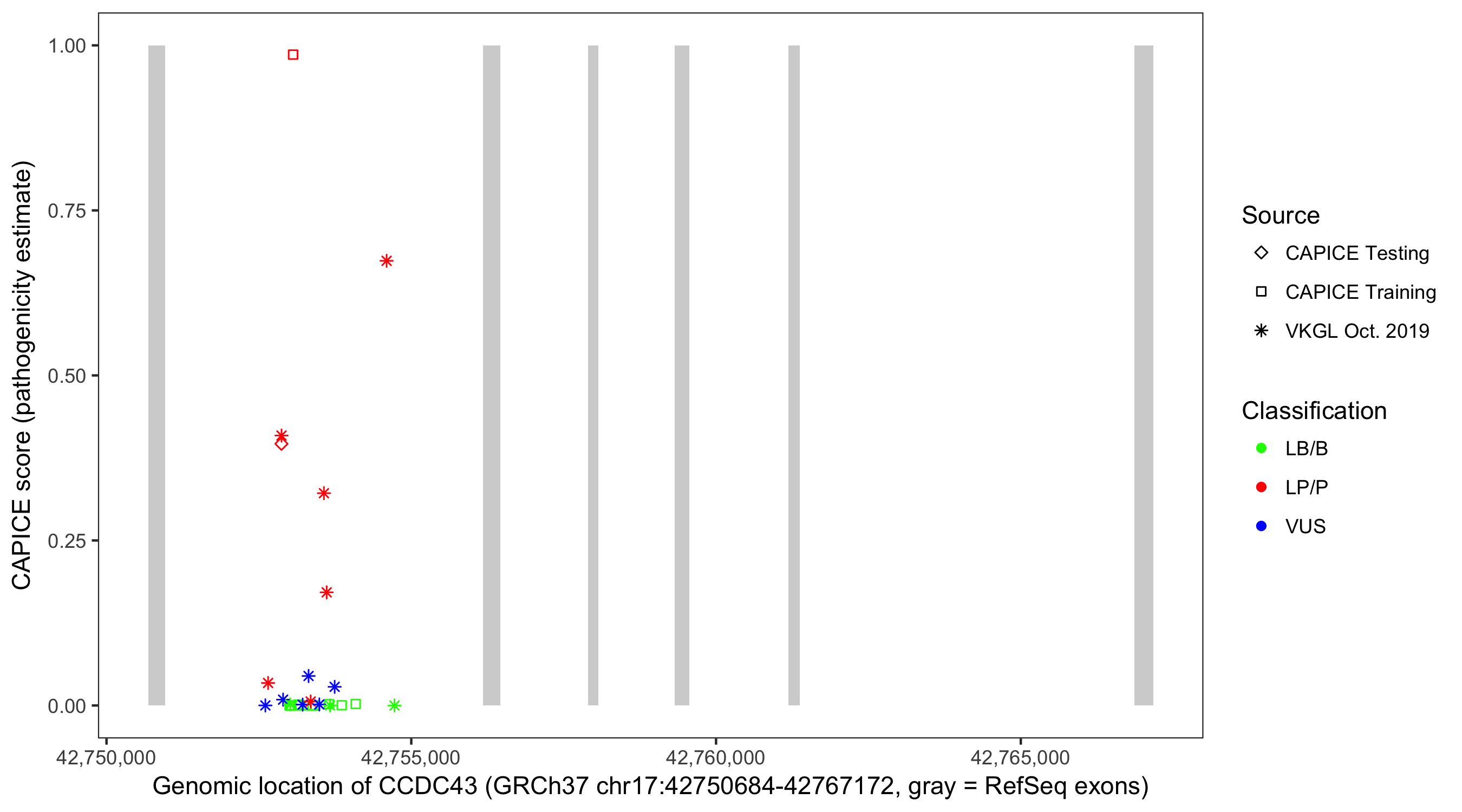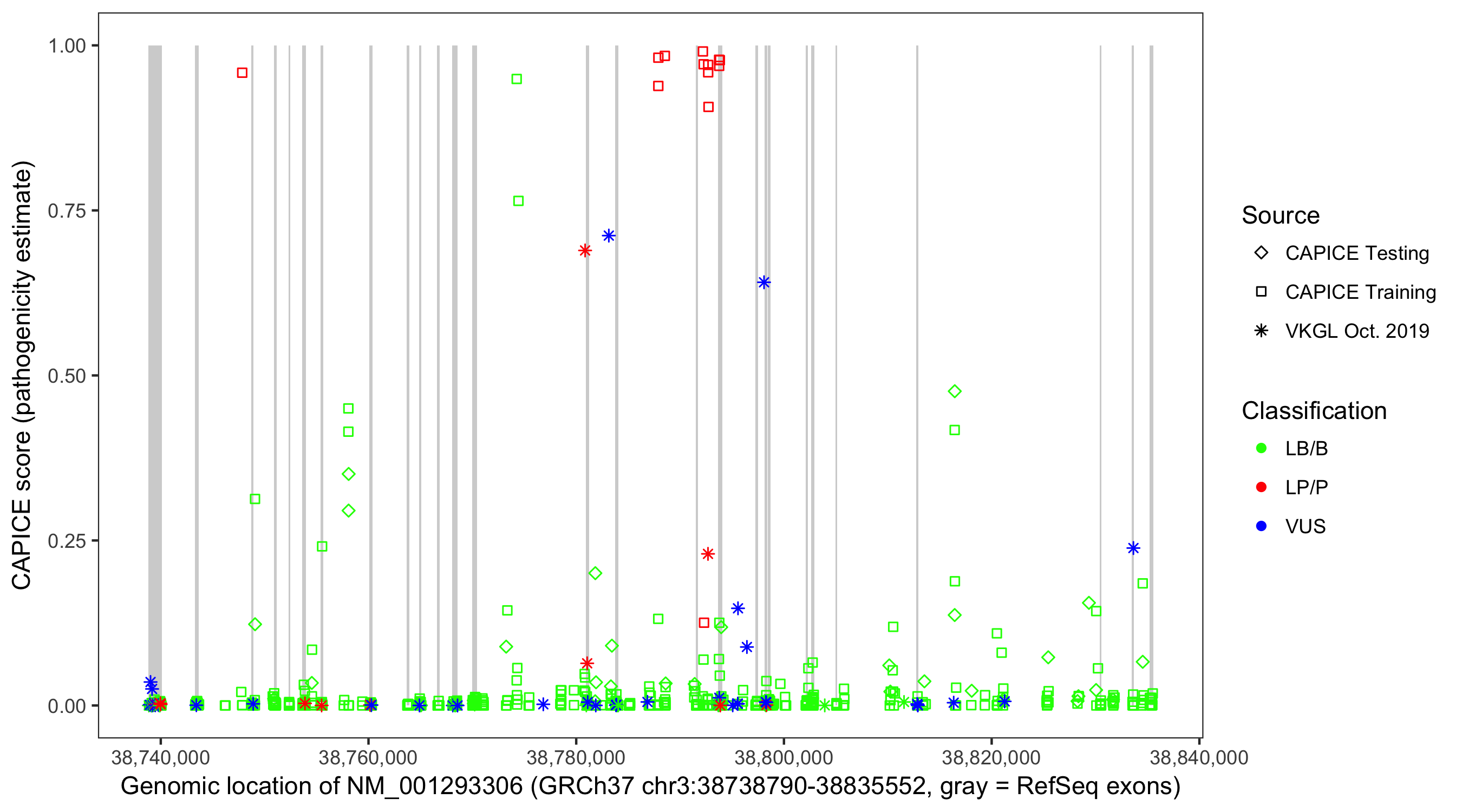 Shown are CAPICE train/test variants plus VKGL Oct 2019.