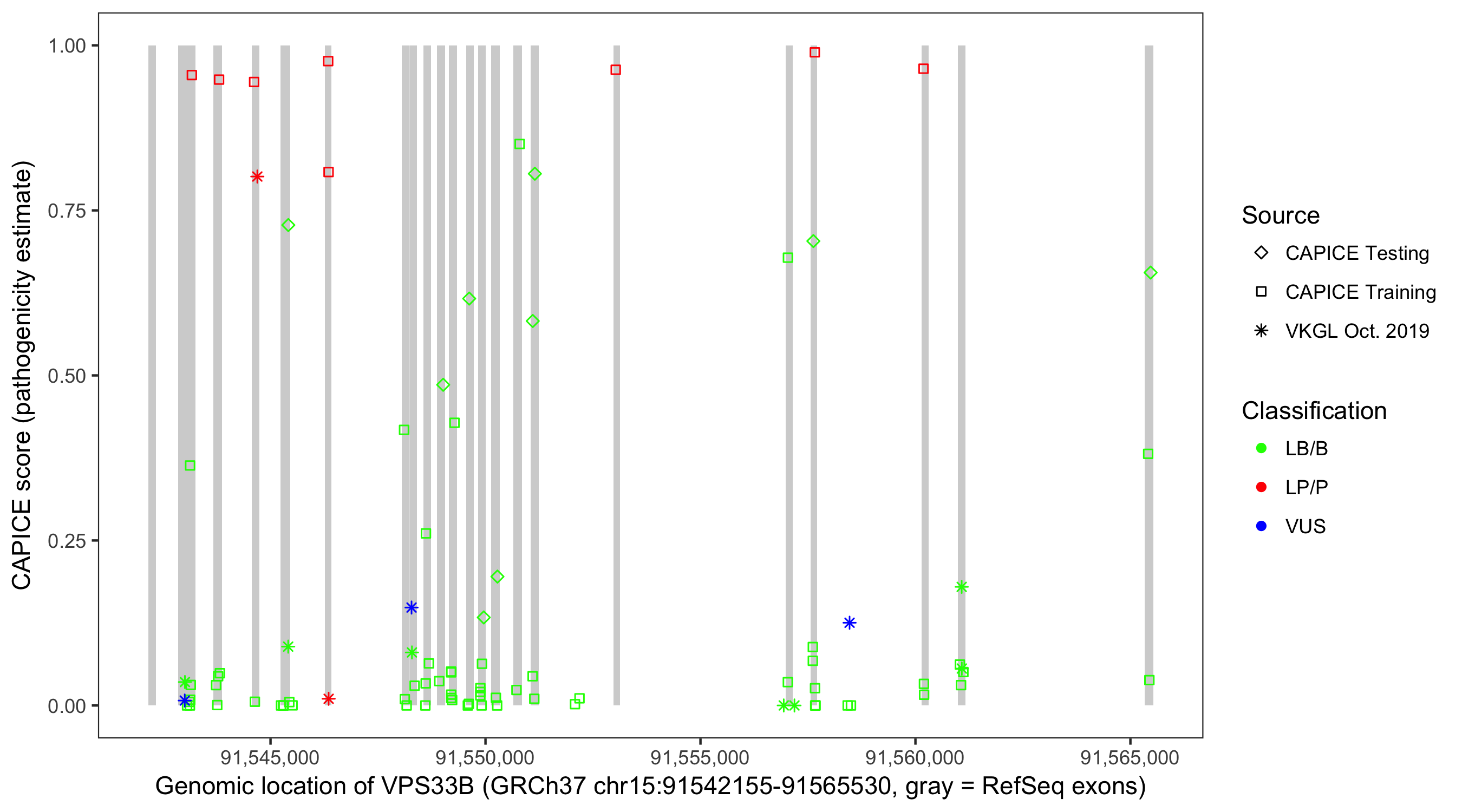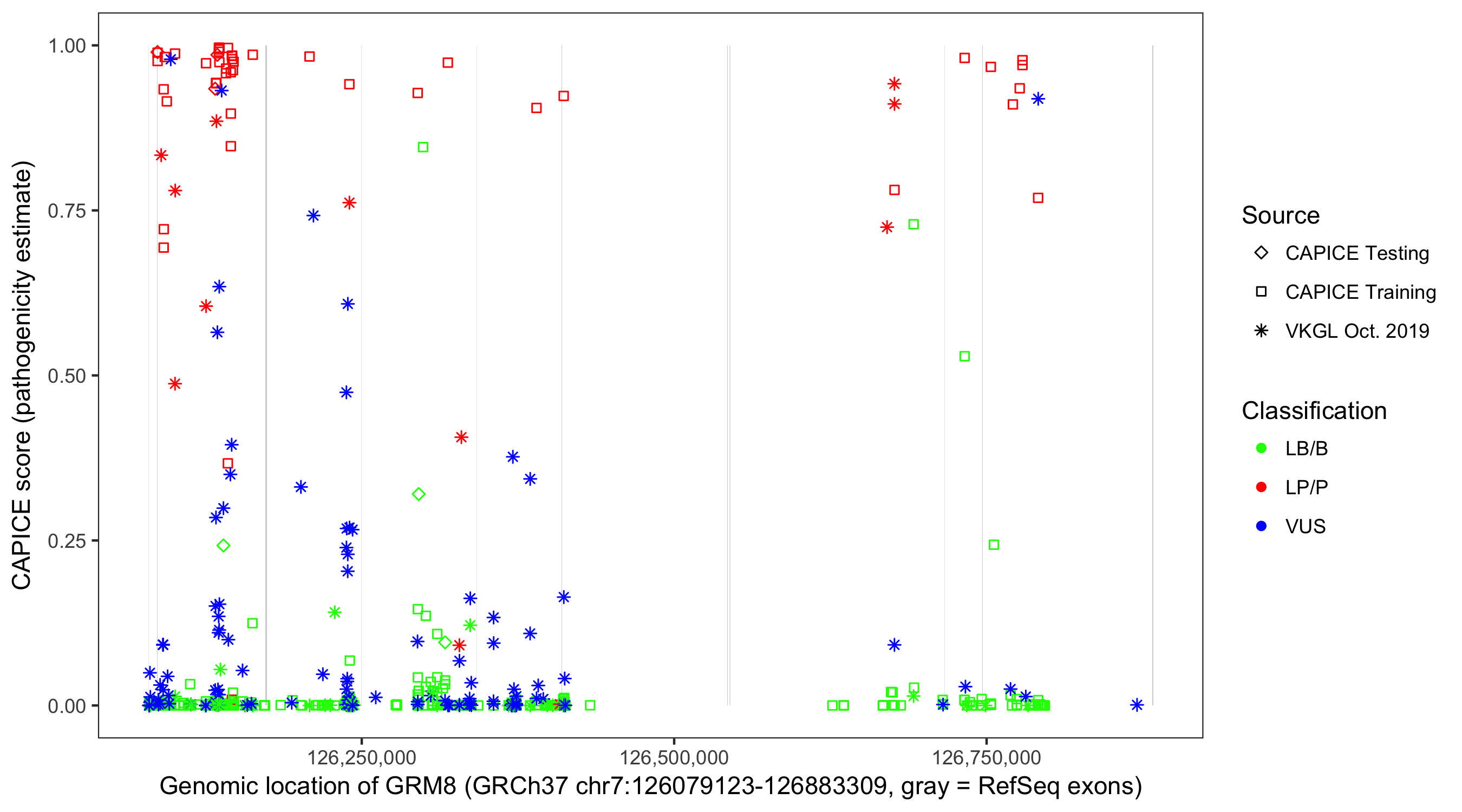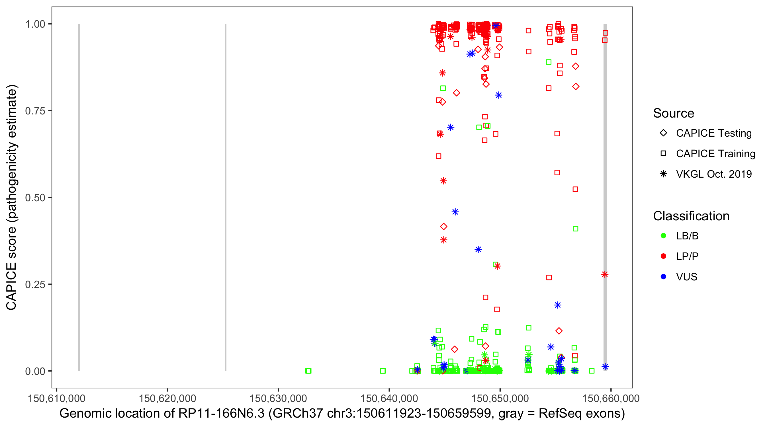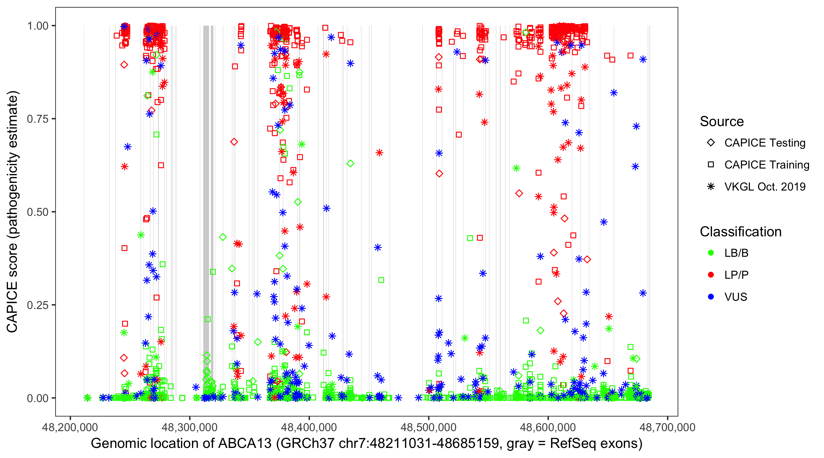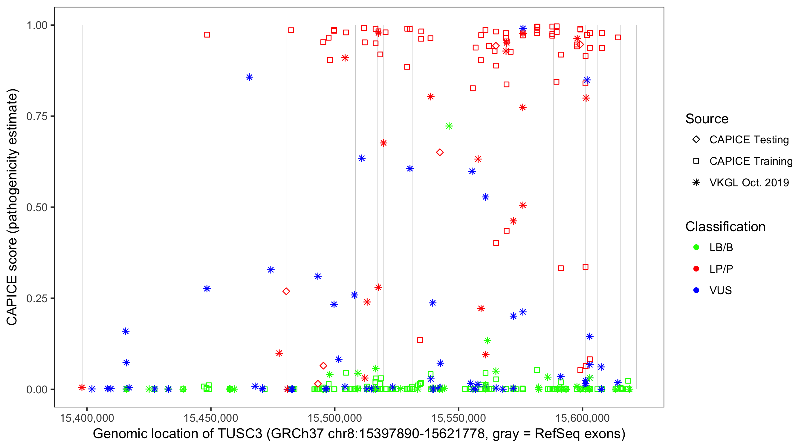 Shown are CAPICE train/test variants plus VKGL Oct 2019.