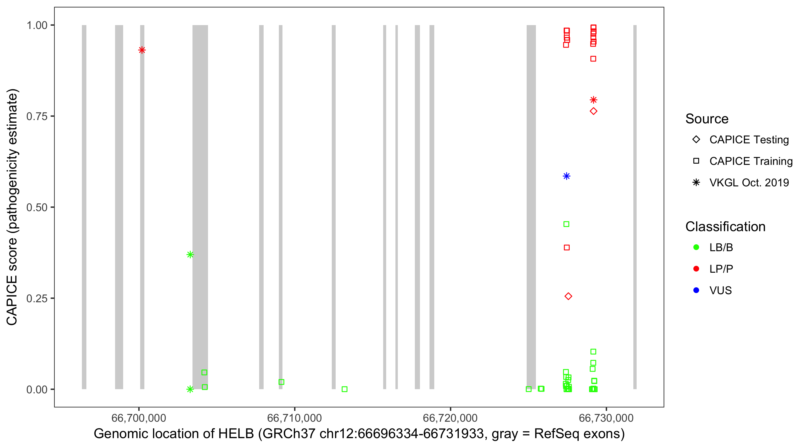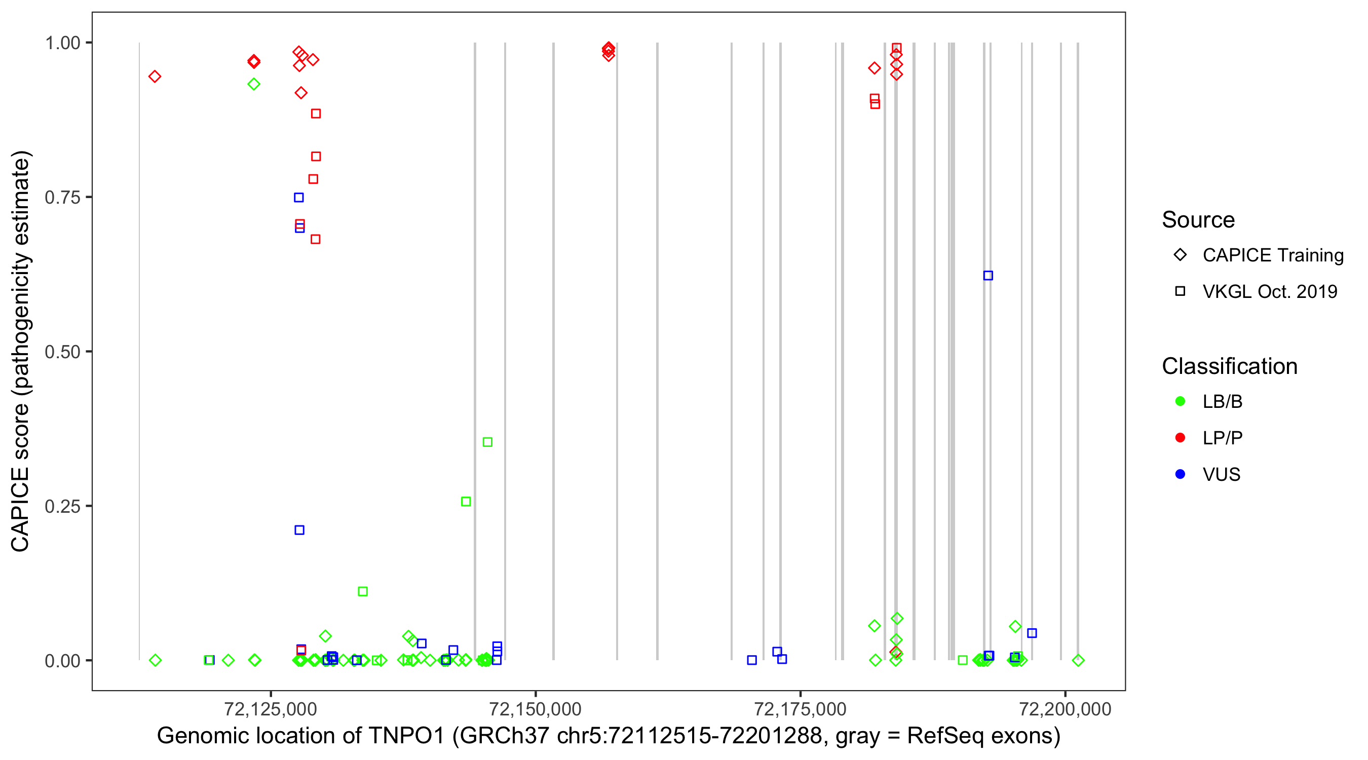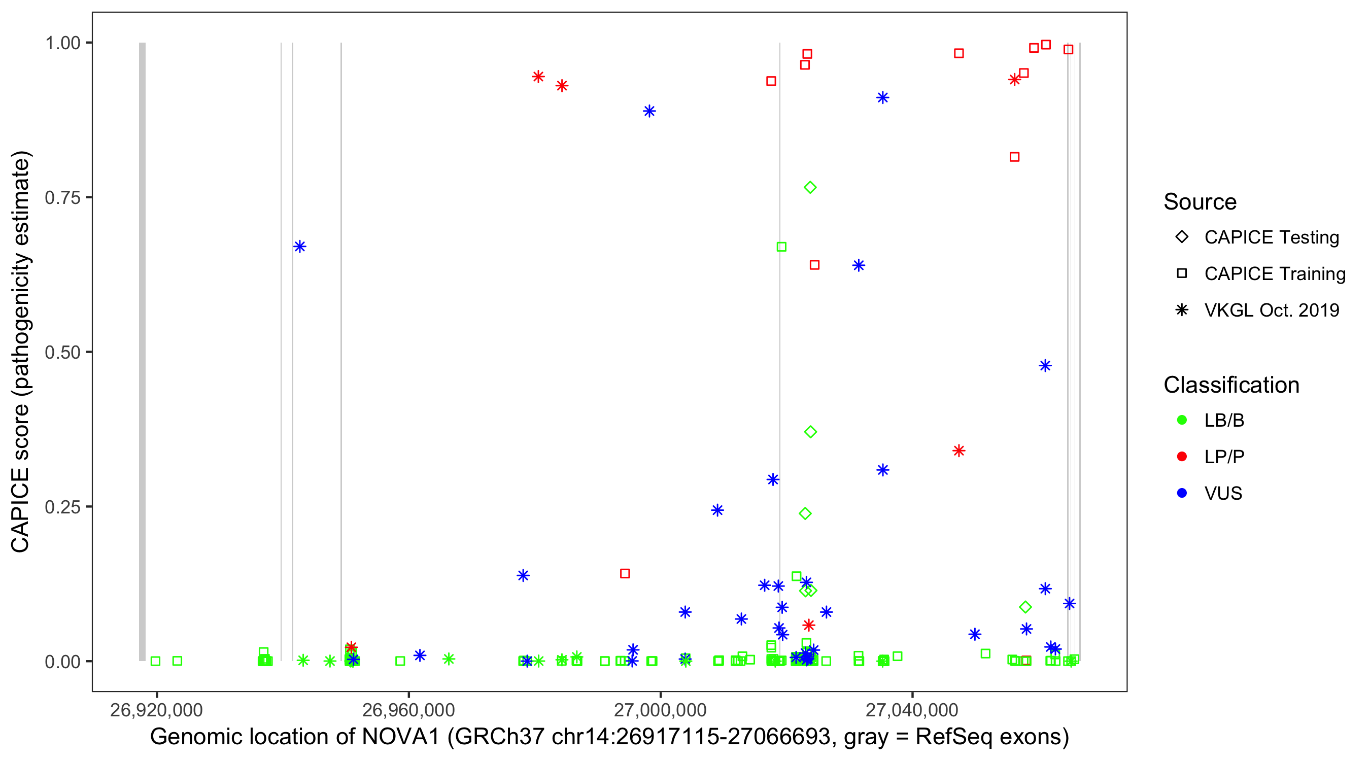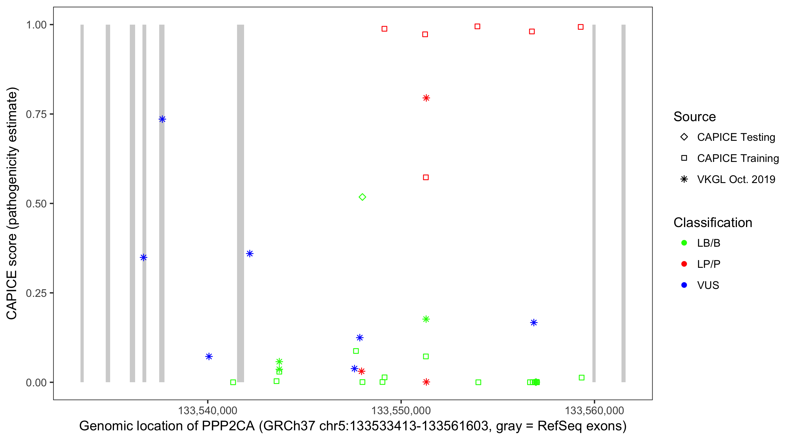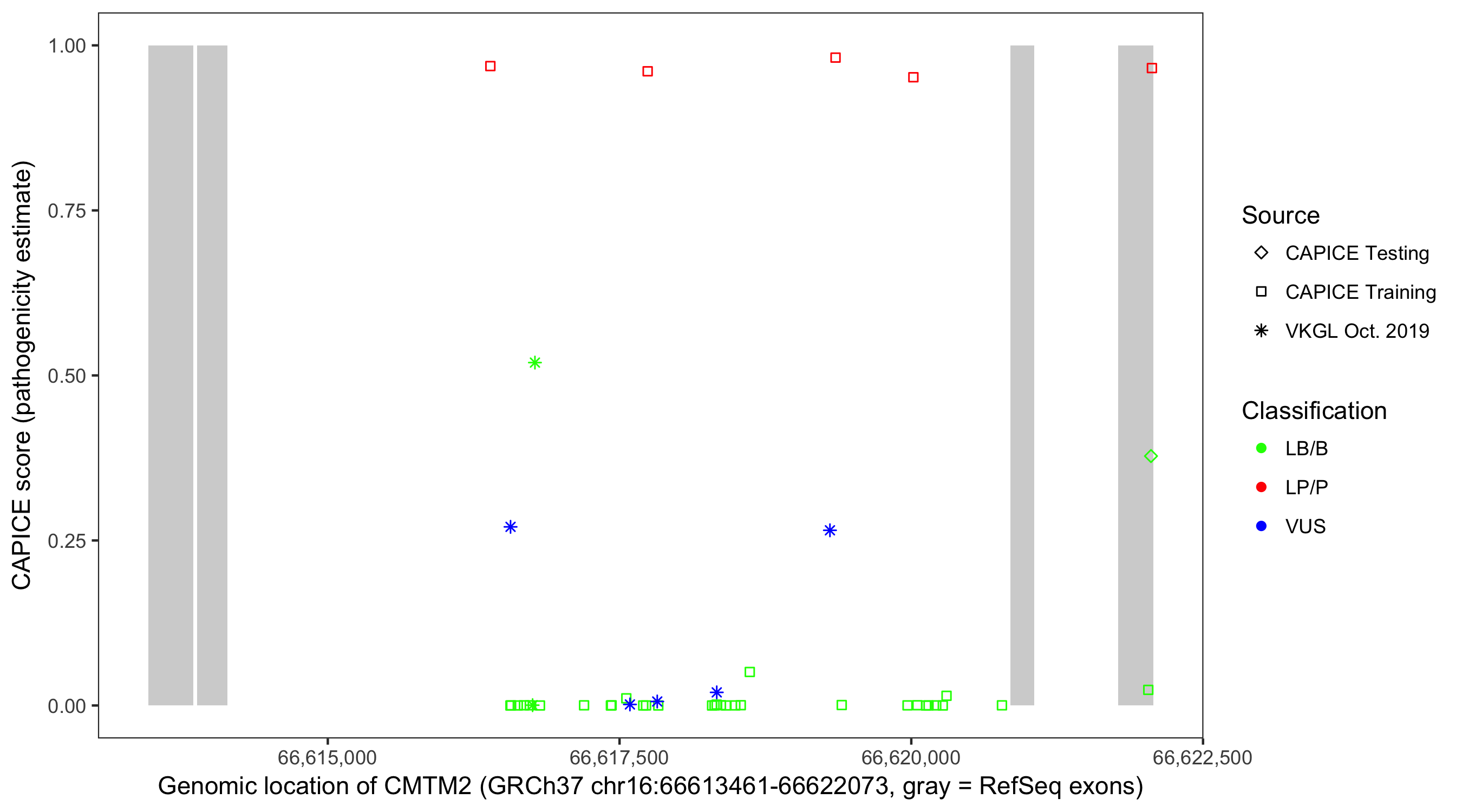 Shown are CAPICE train/test variants plus VKGL Oct 2019.