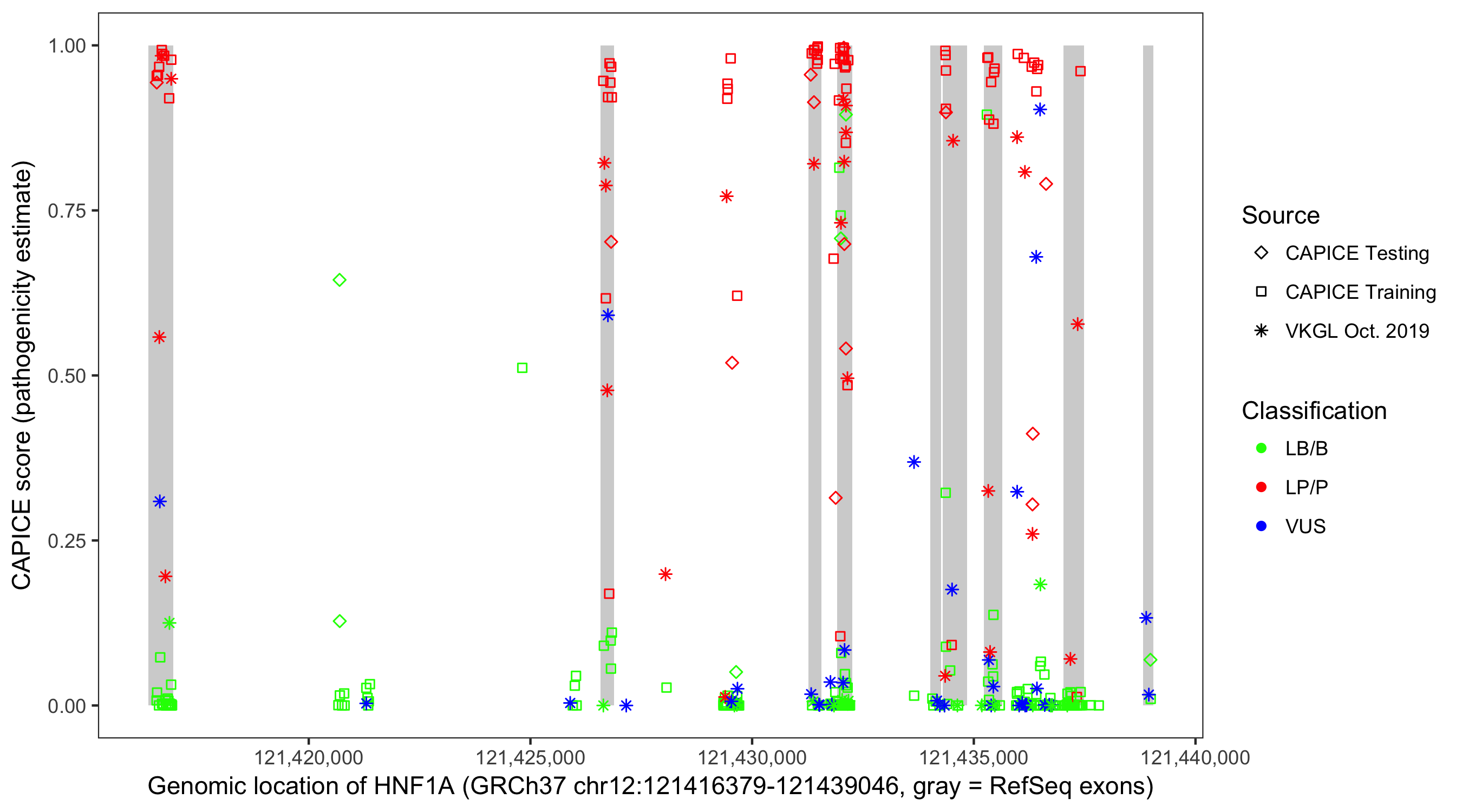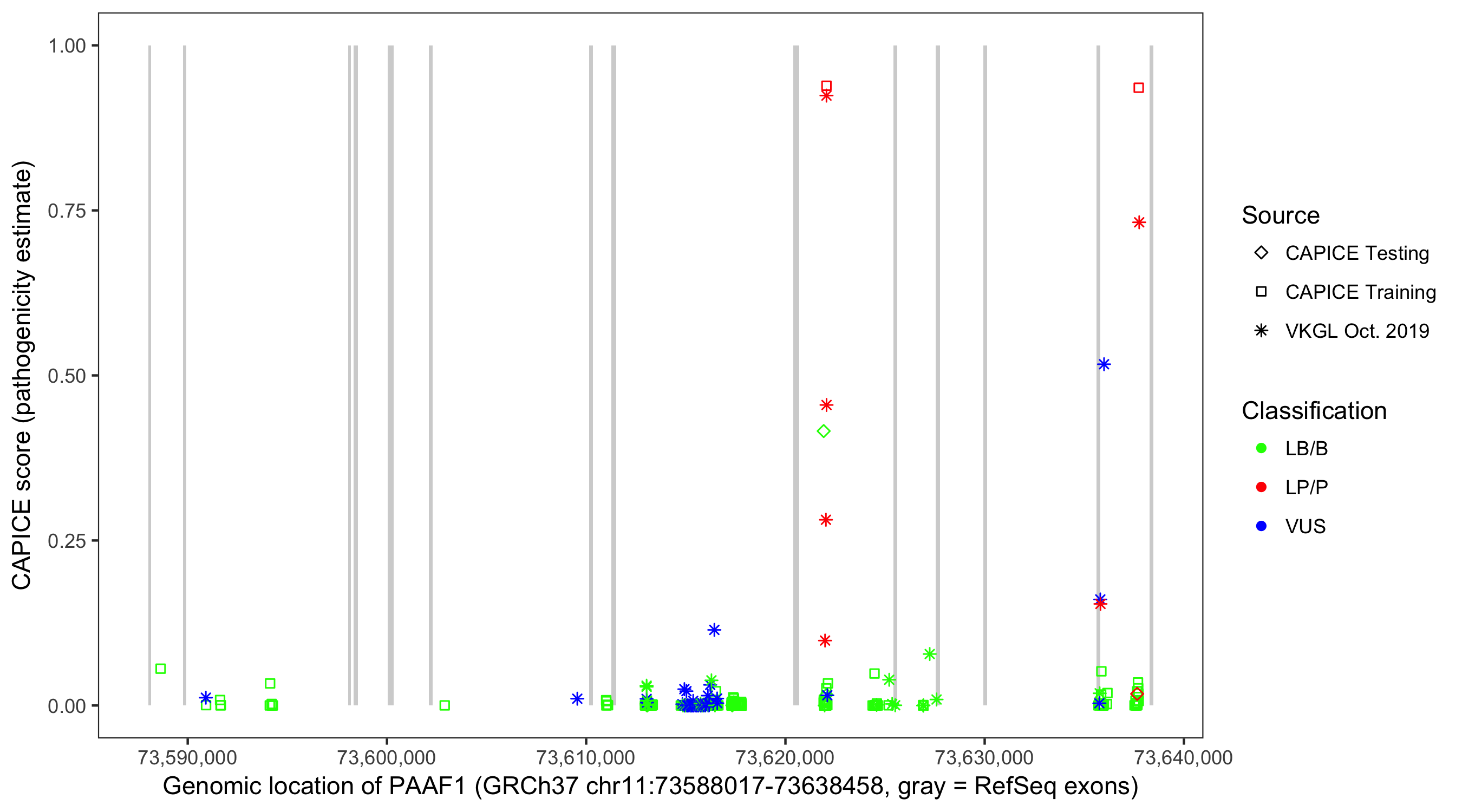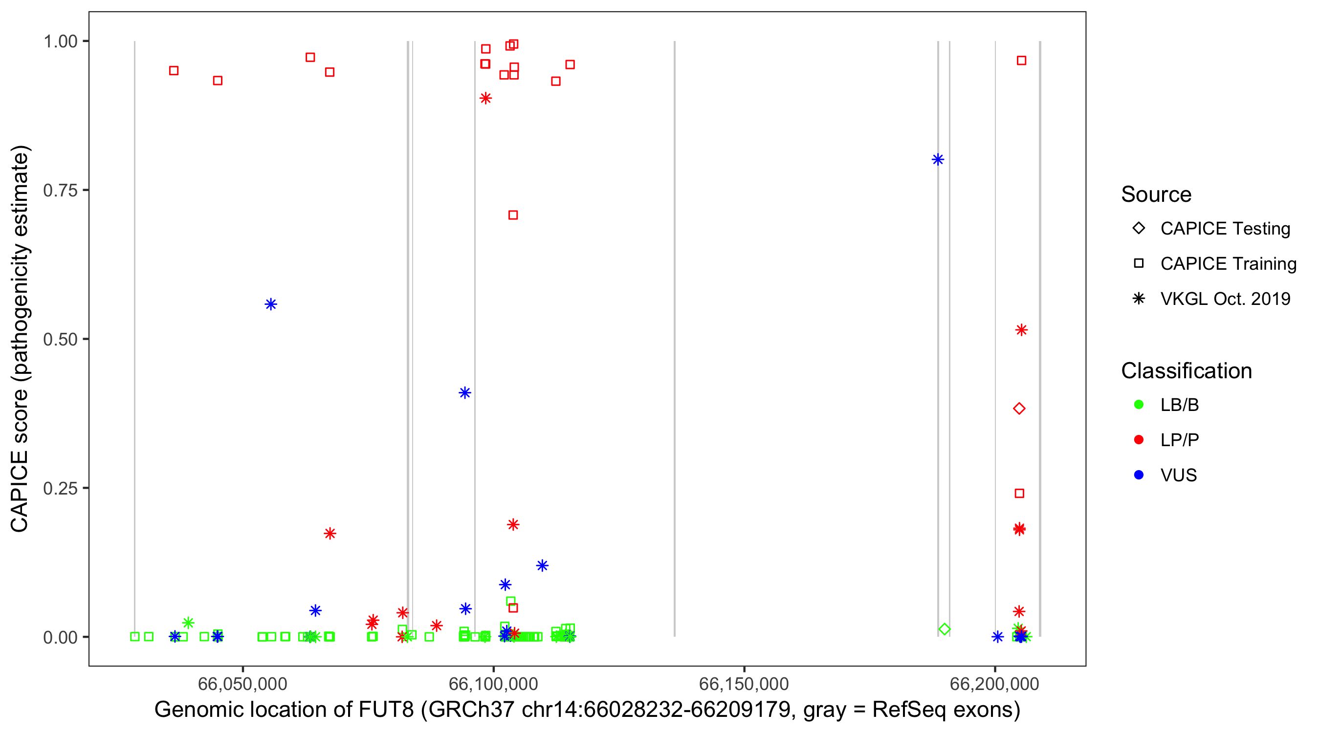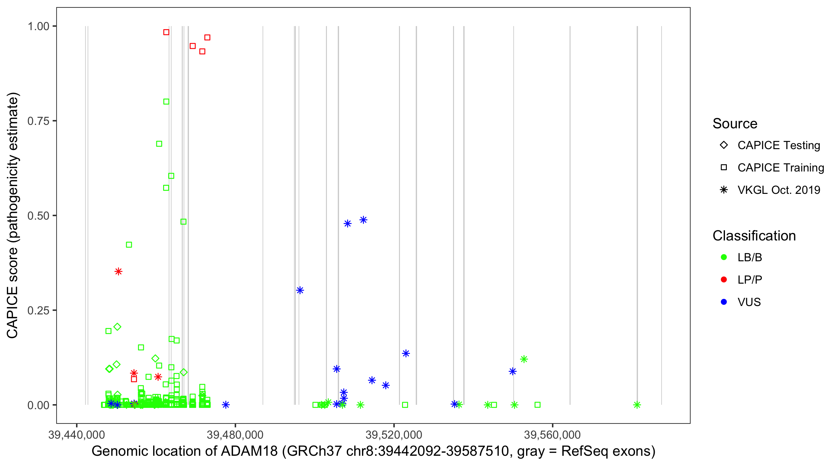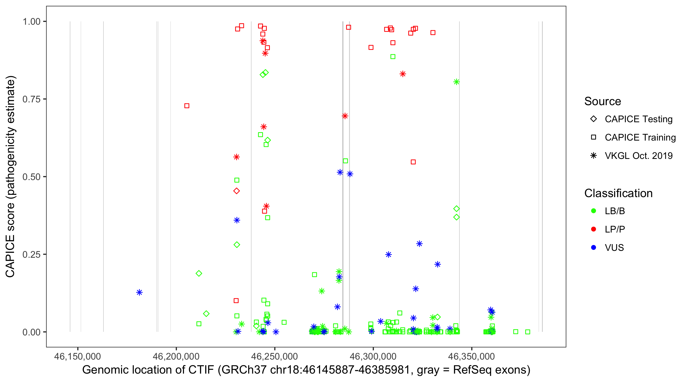 Shown are CAPICE train/test variants plus VKGL Oct 2019.