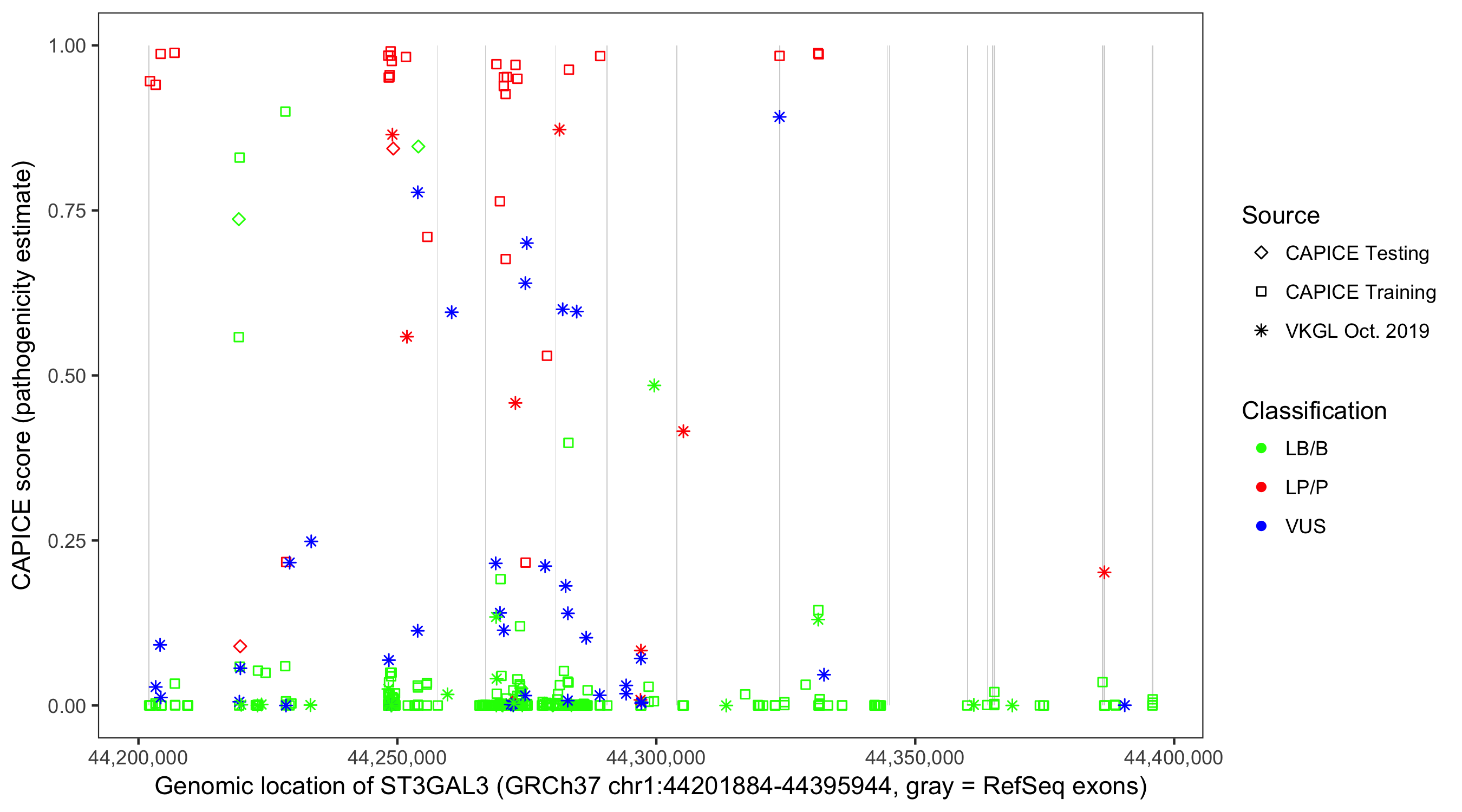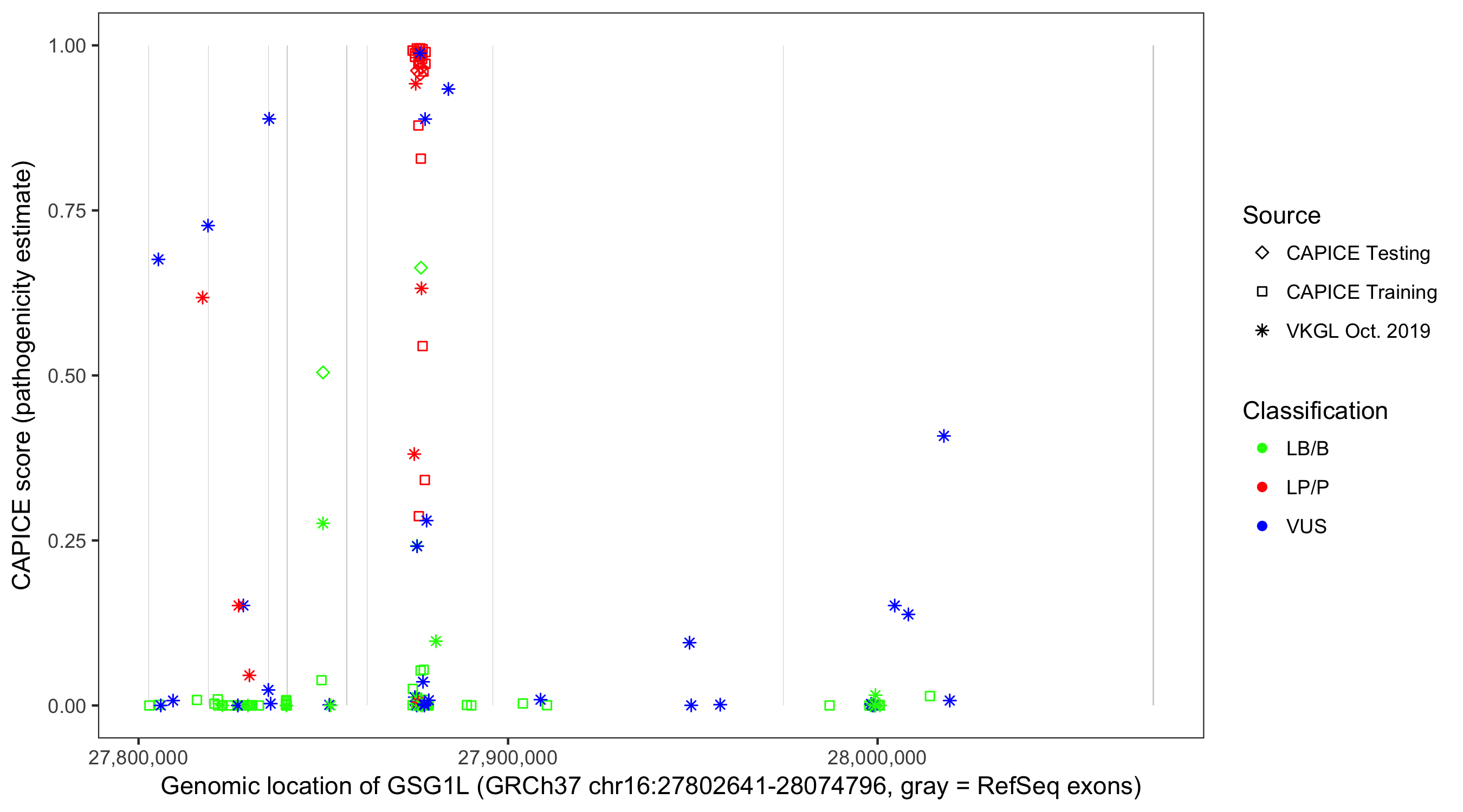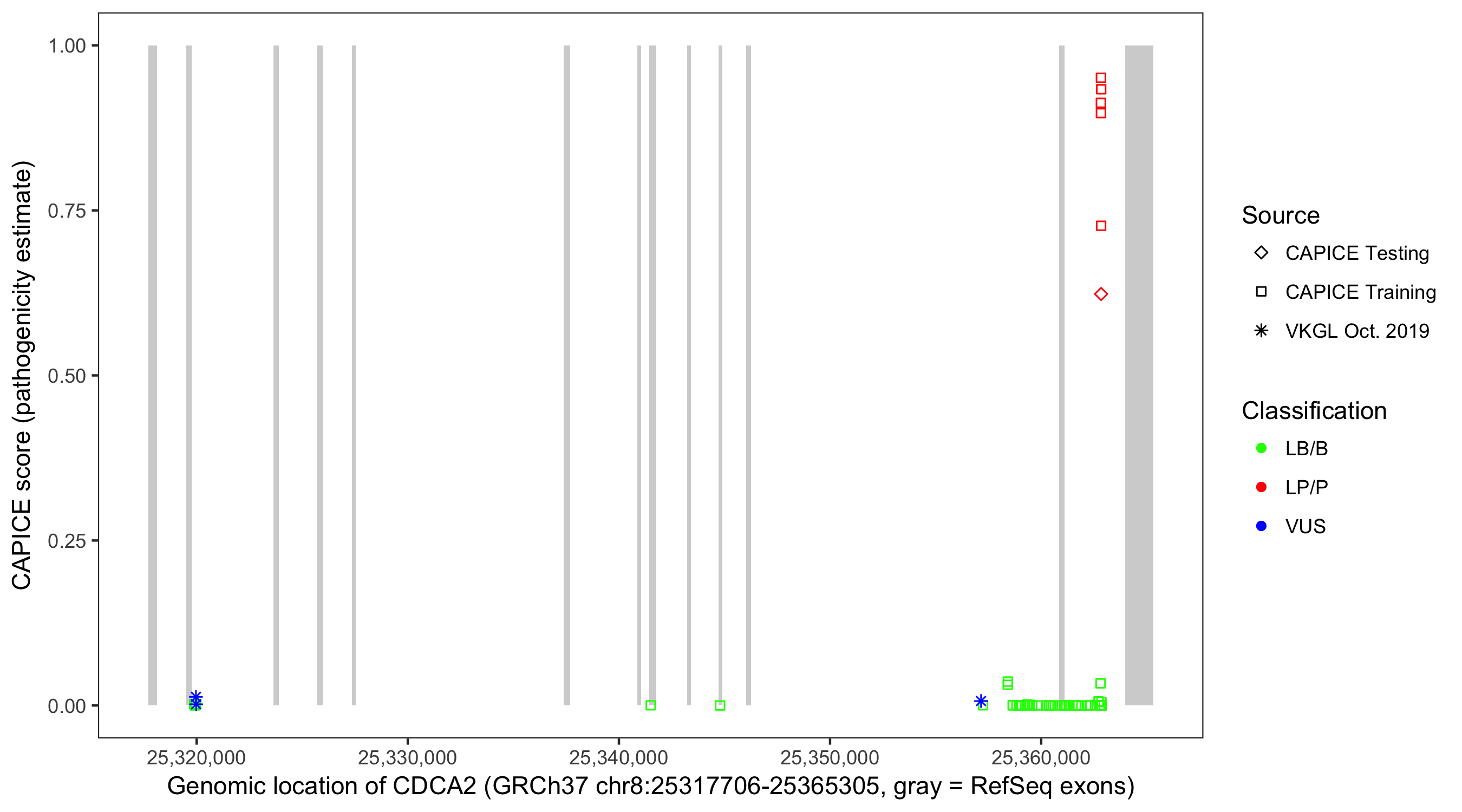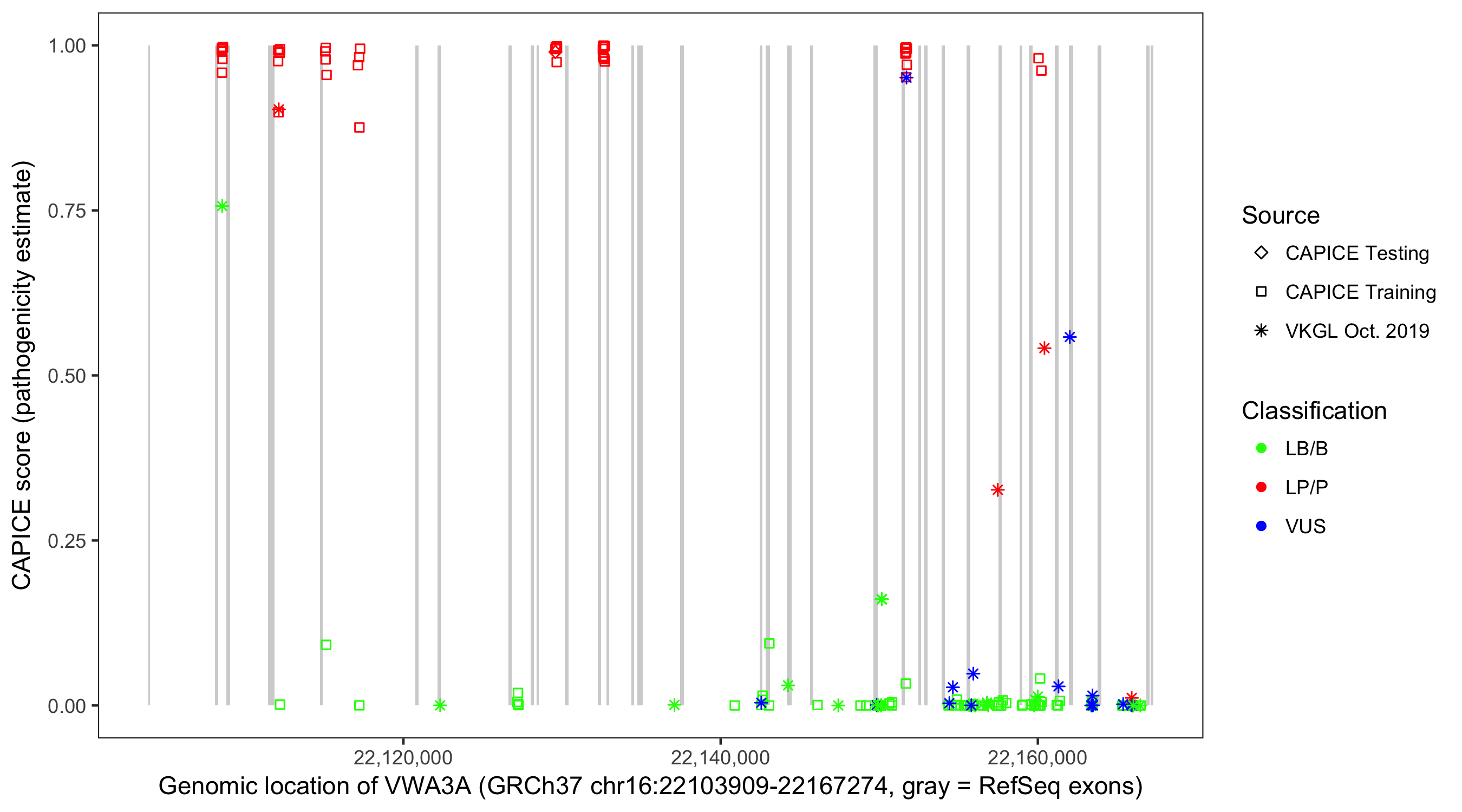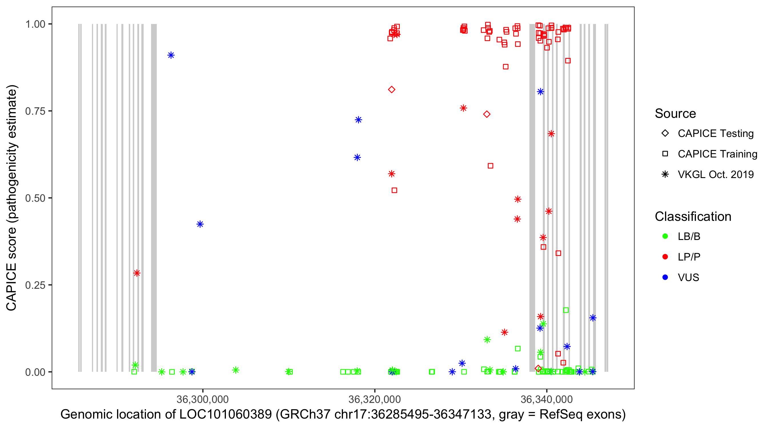Shown are CAPICE train/test variants plus VKGL Oct 2019.