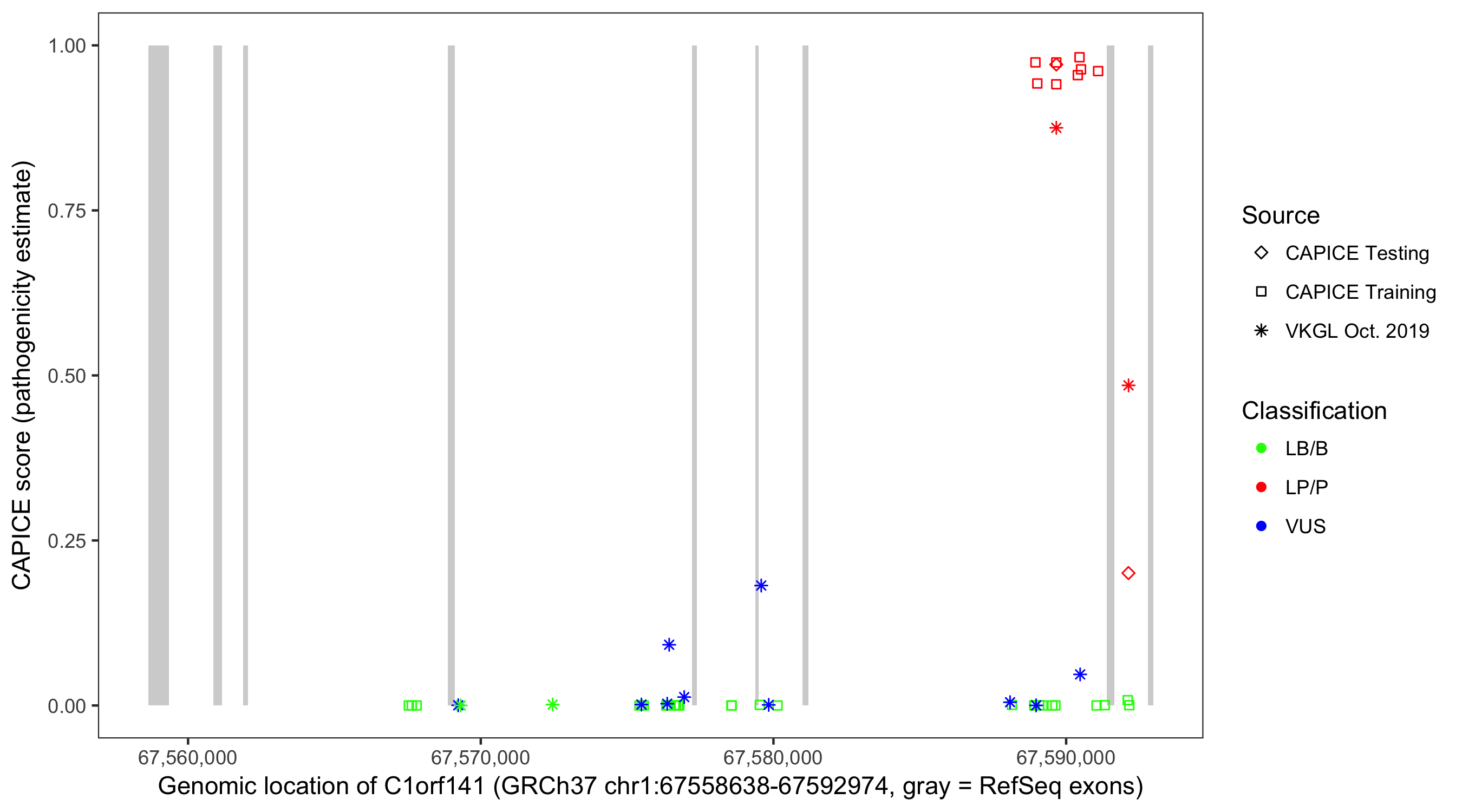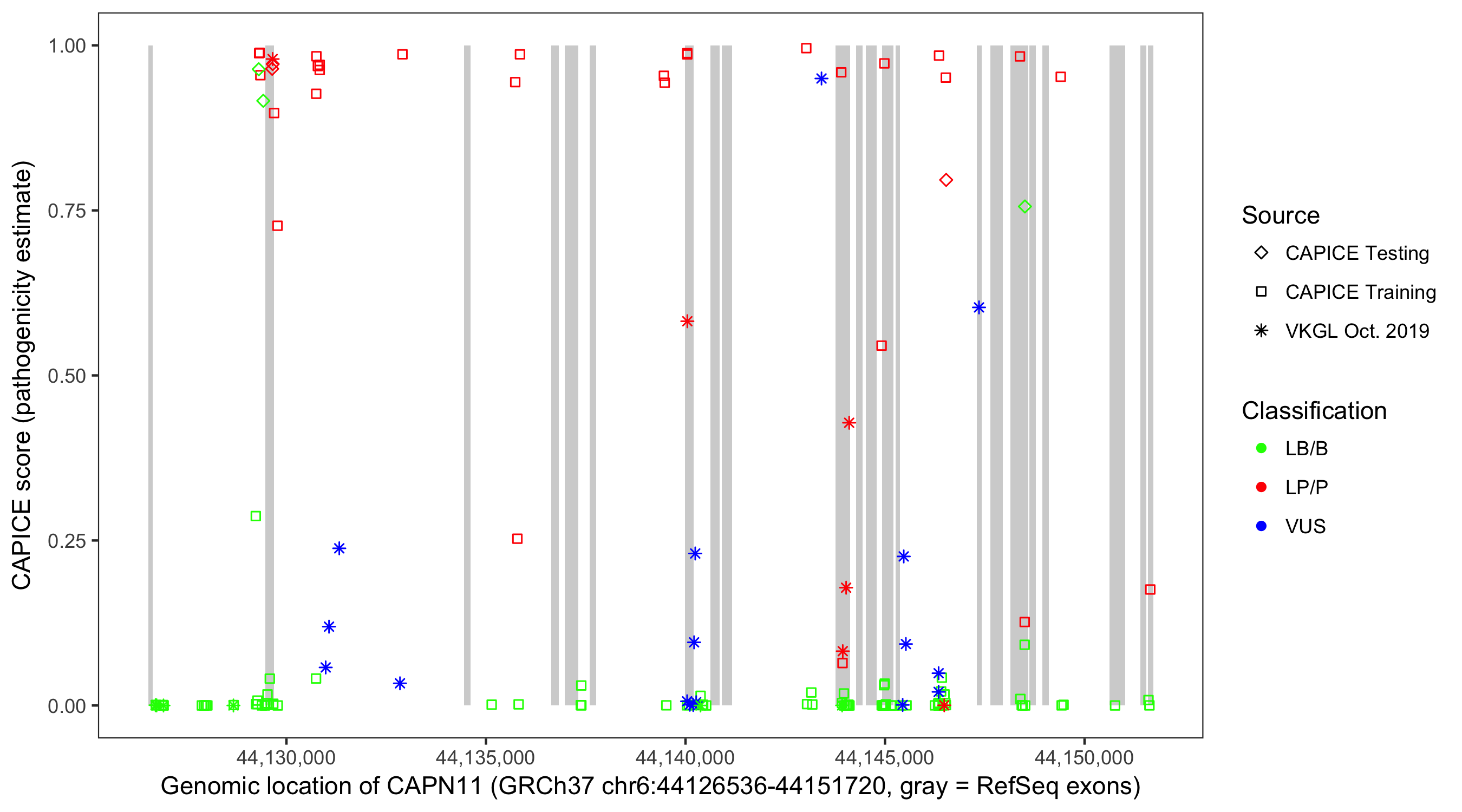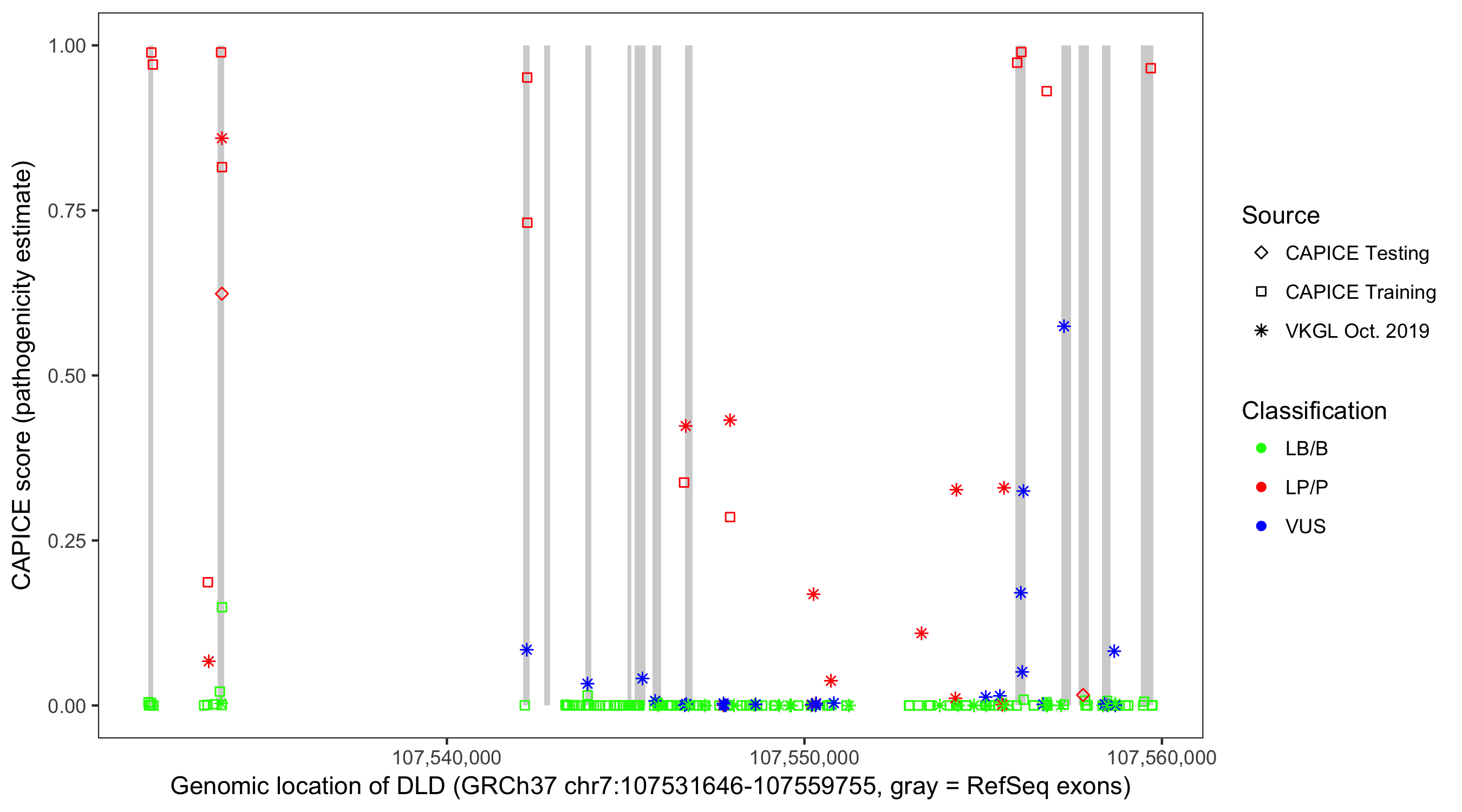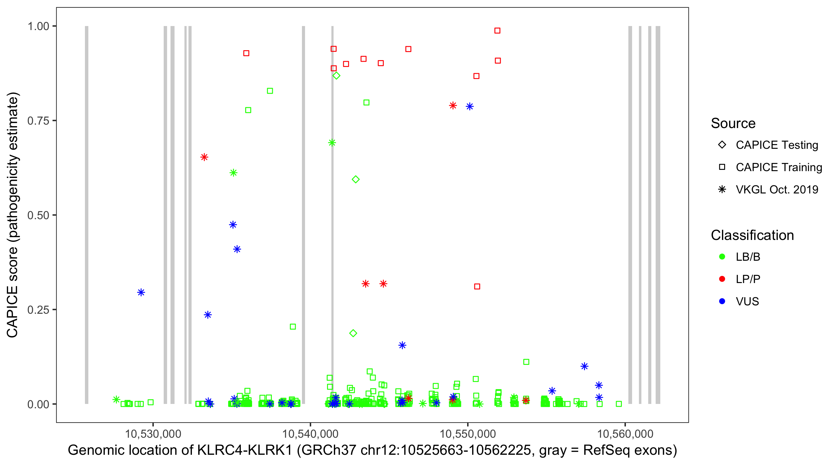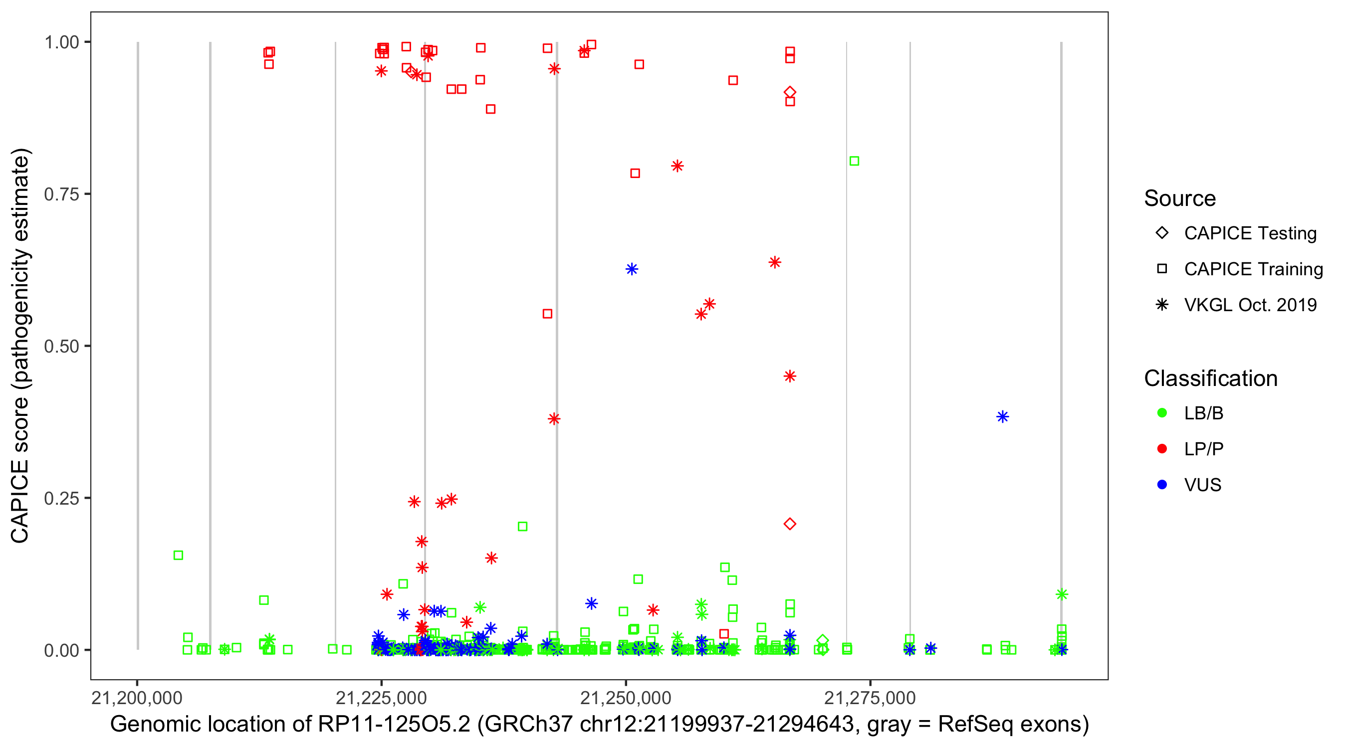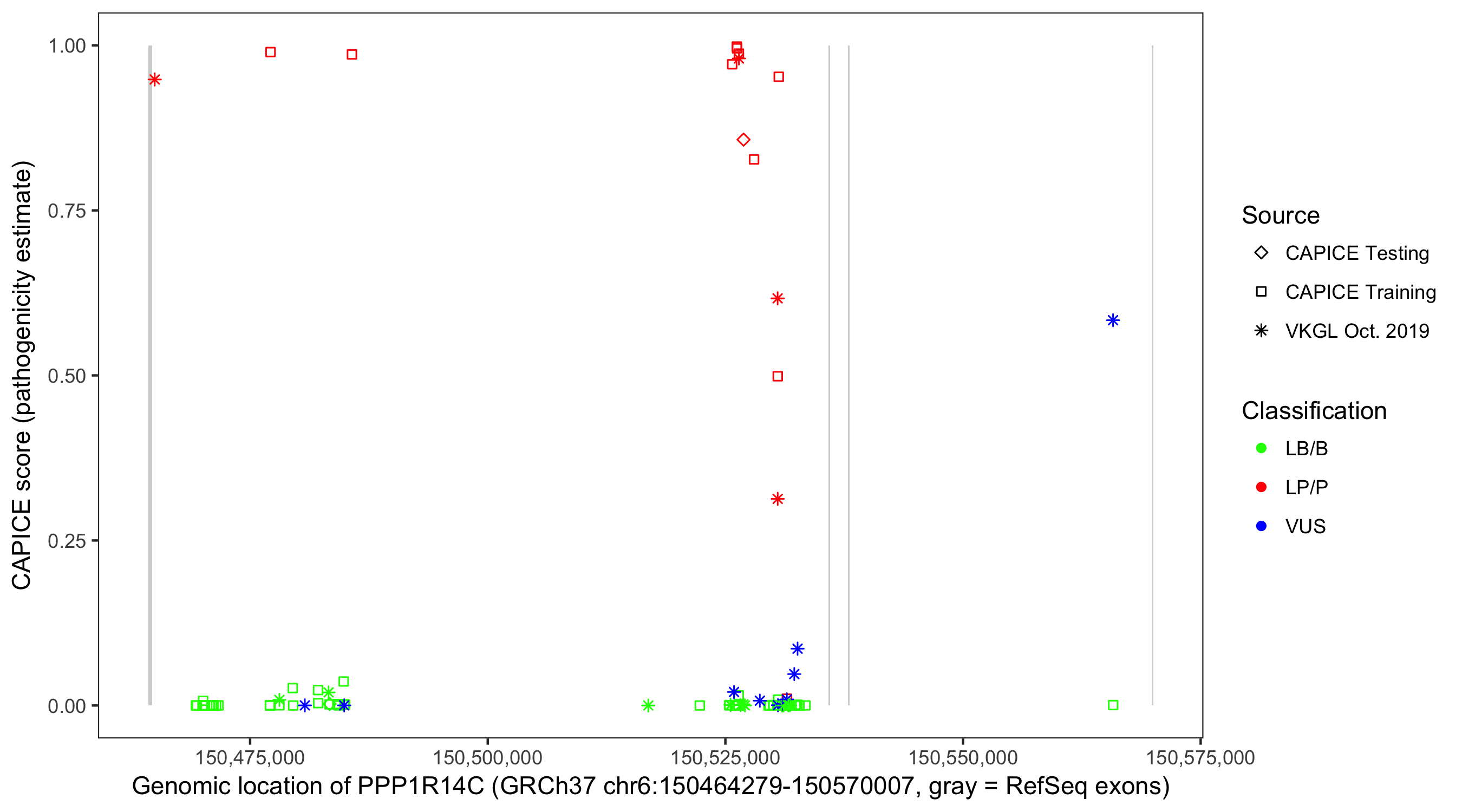 Shown are CAPICE train/test variants plus VKGL Oct 2019.