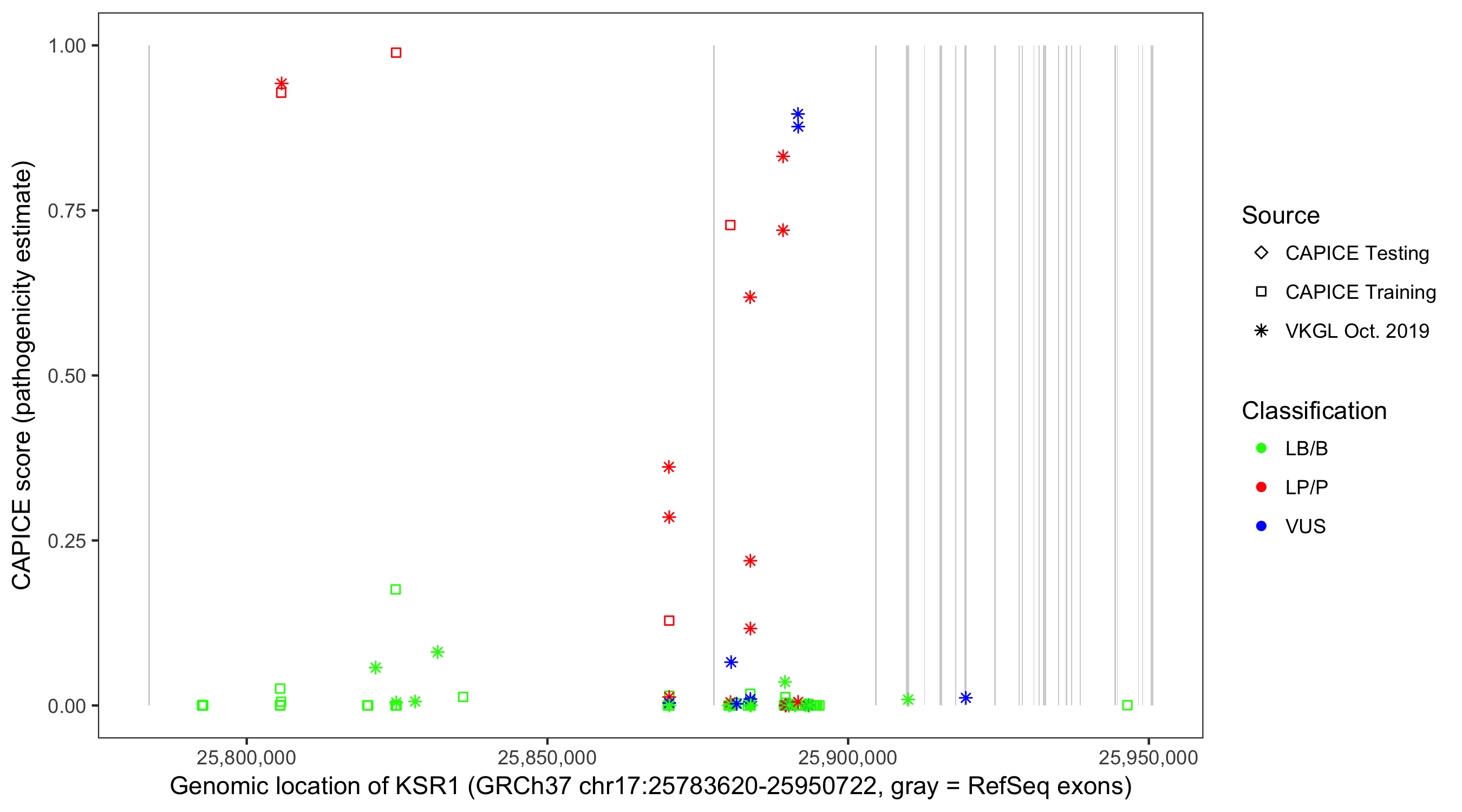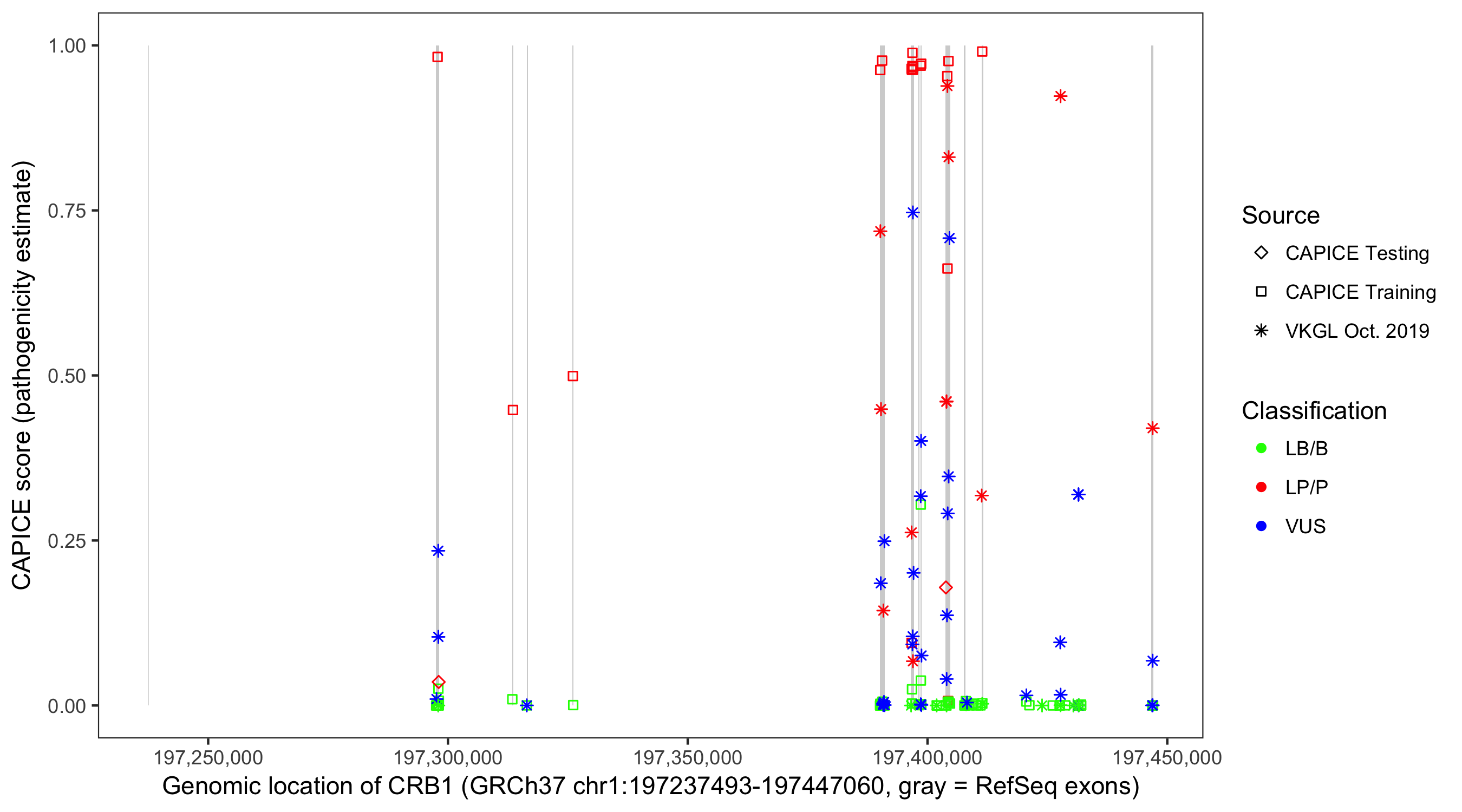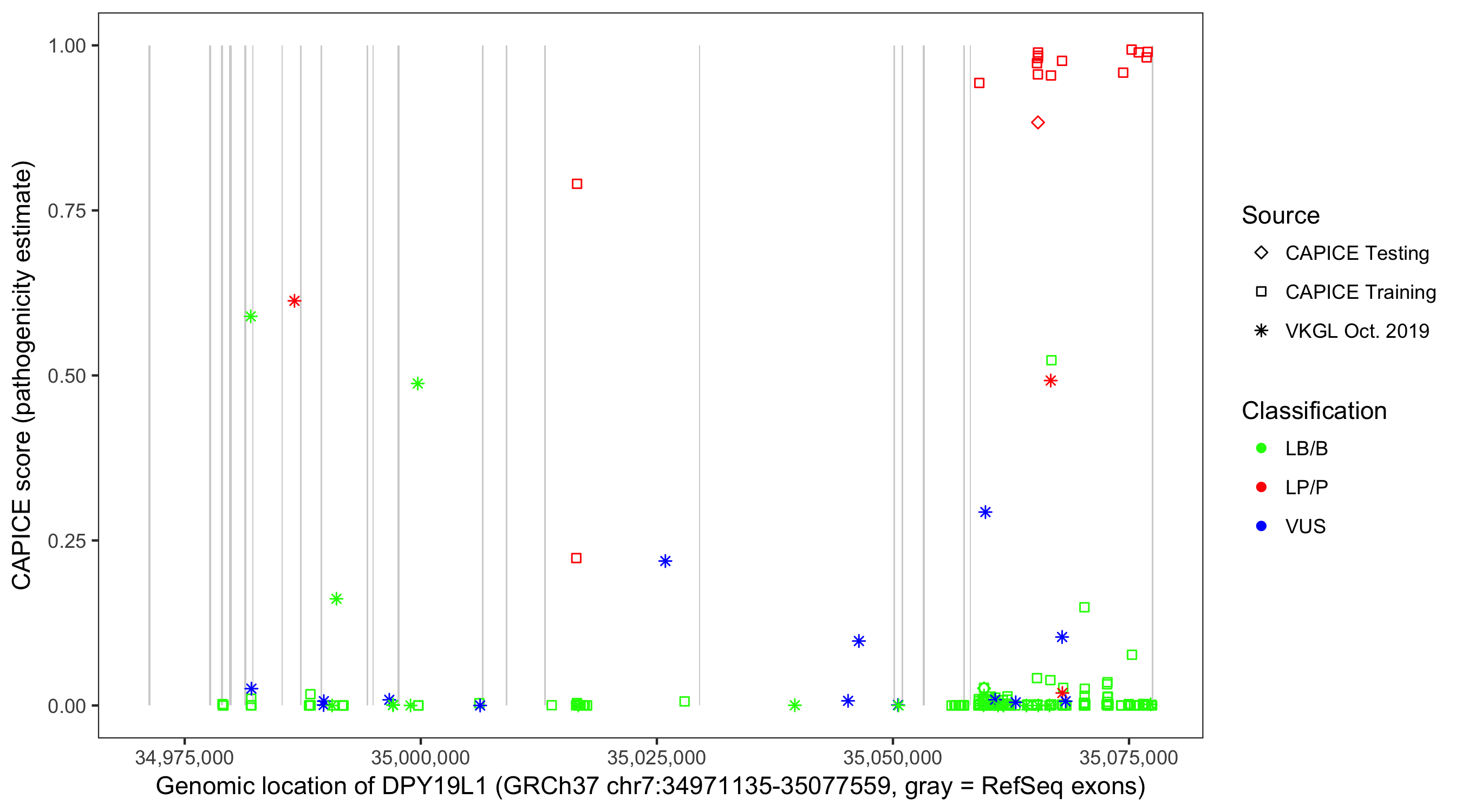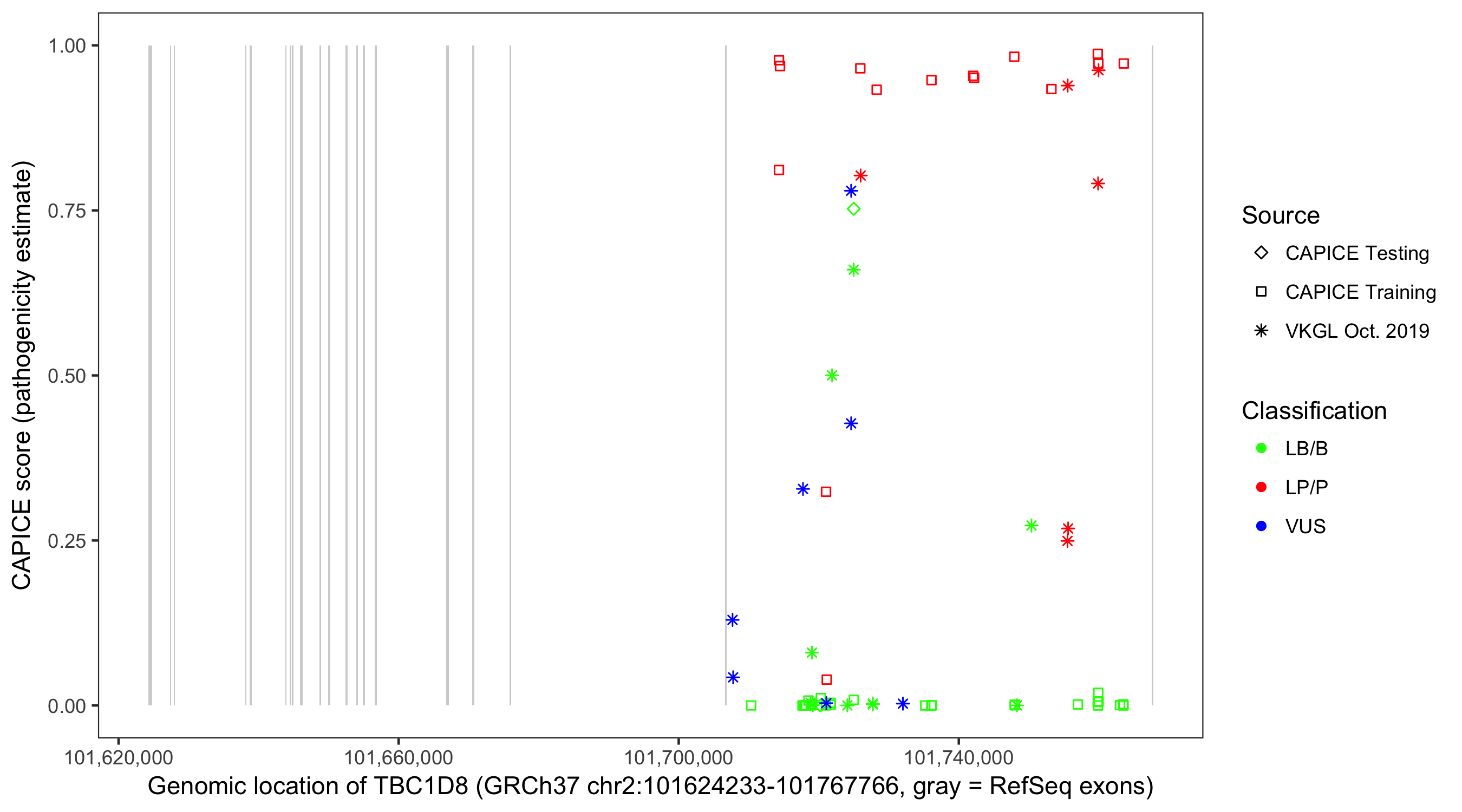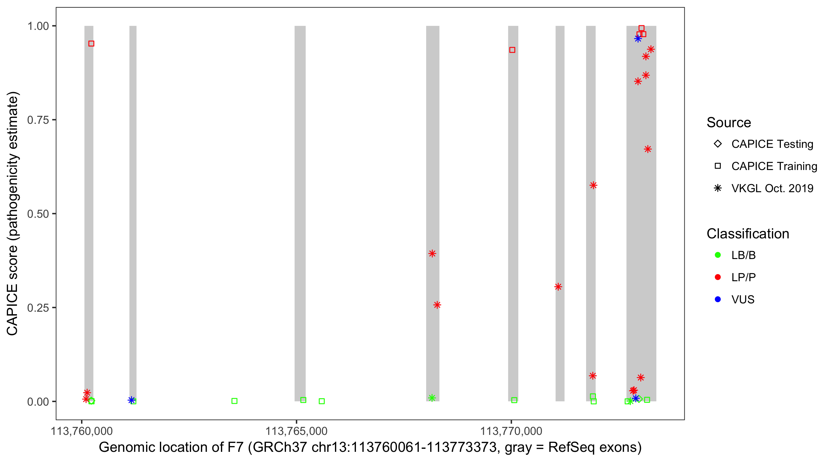 Shown are CAPICE train/test variants plus VKGL Oct 2019.