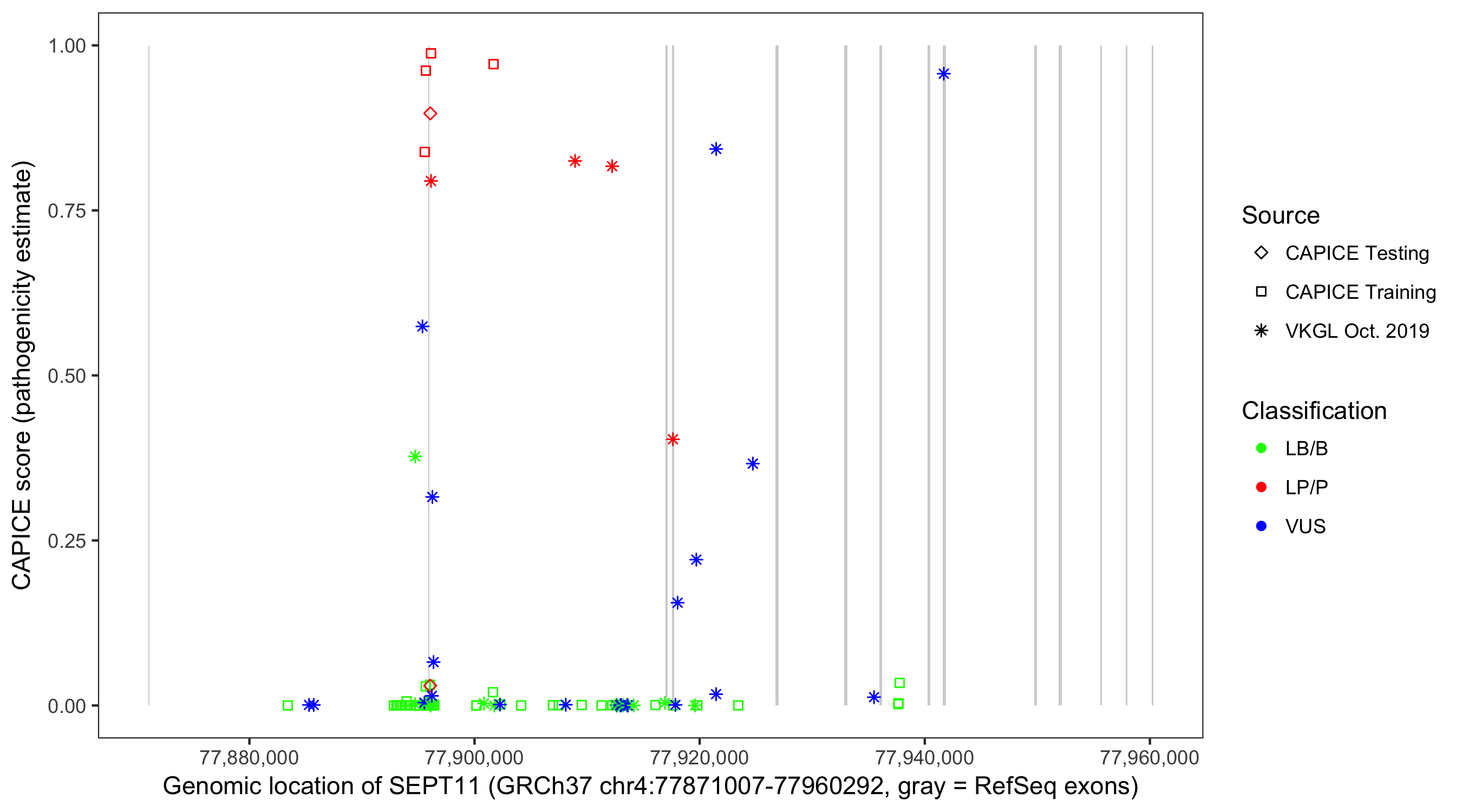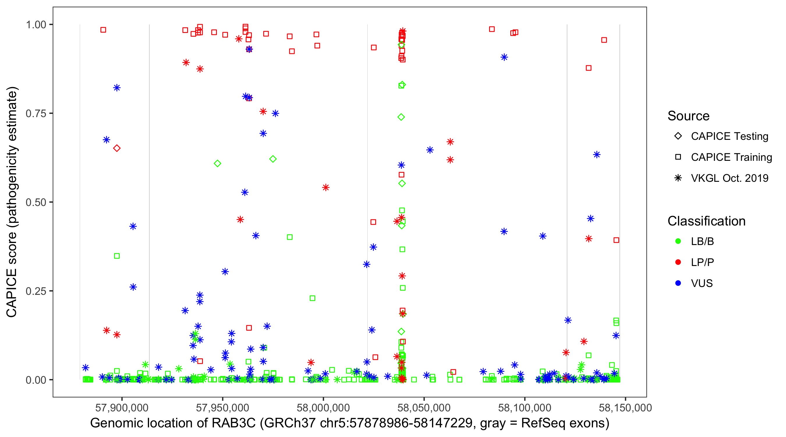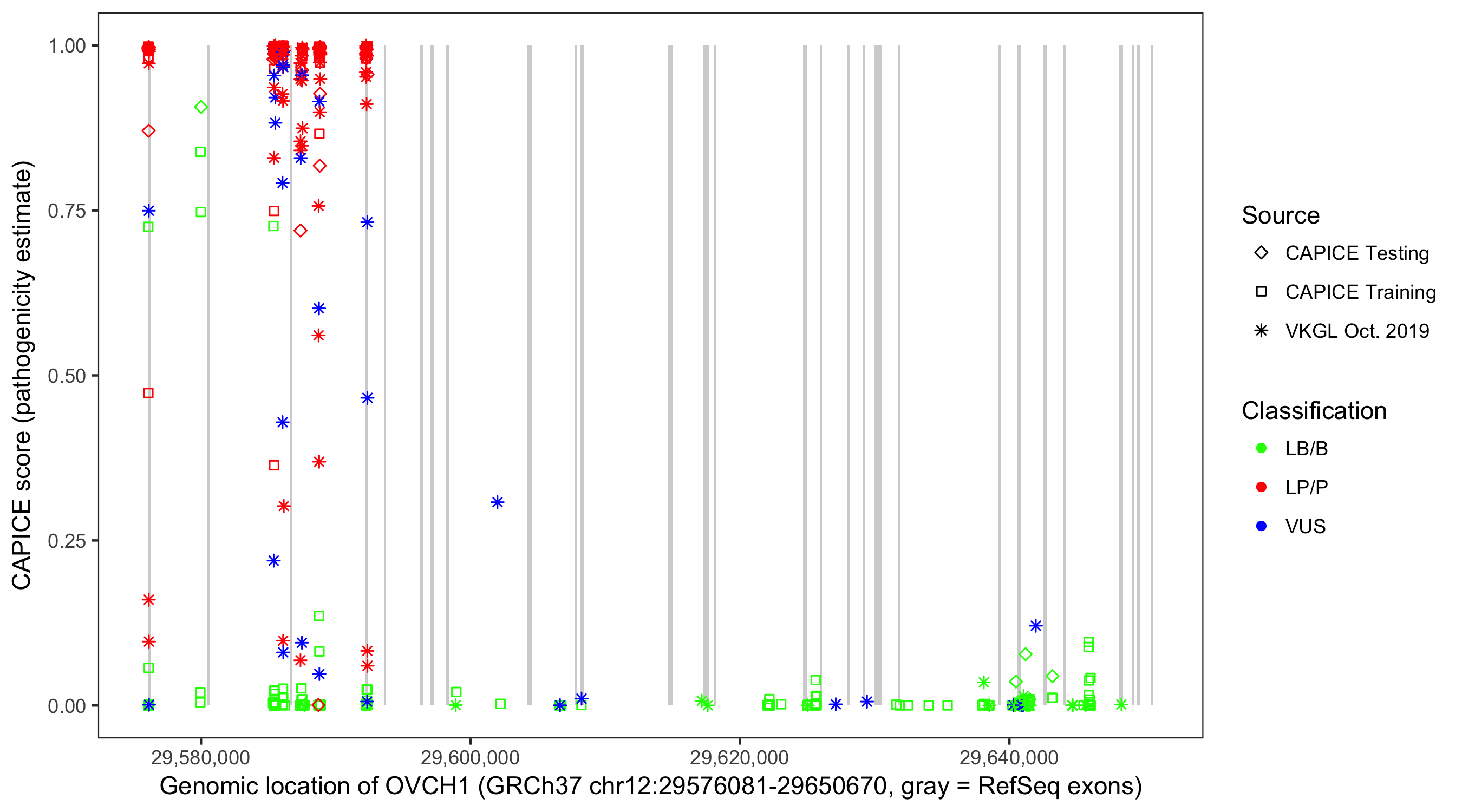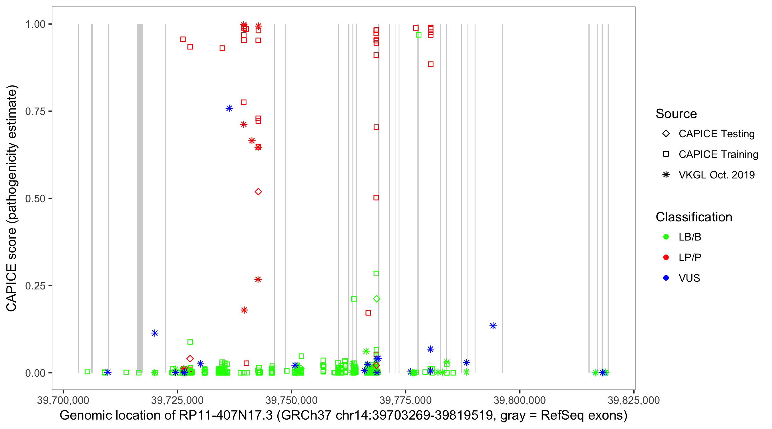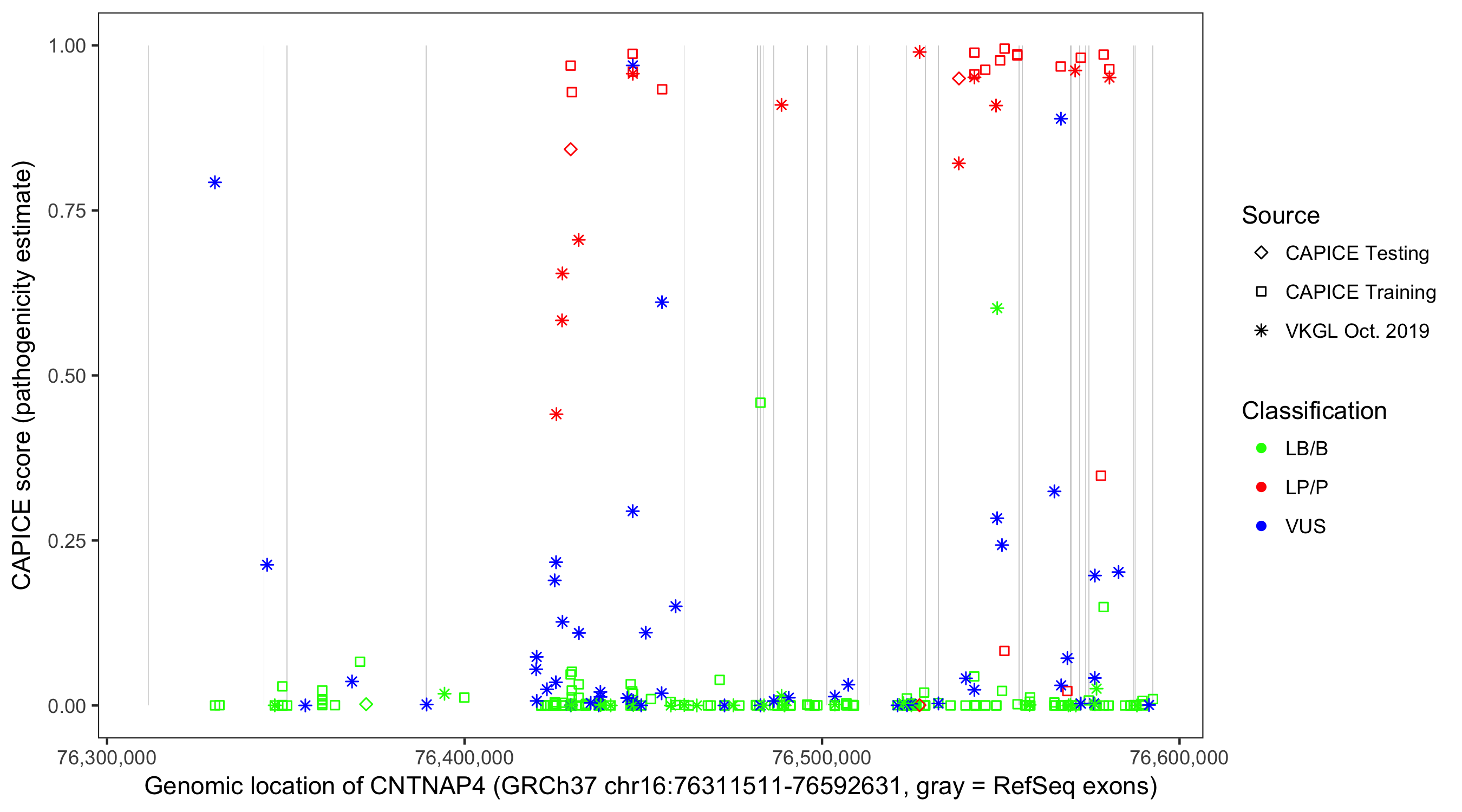 Shown are CAPICE train/test variants plus VKGL Oct 2019.