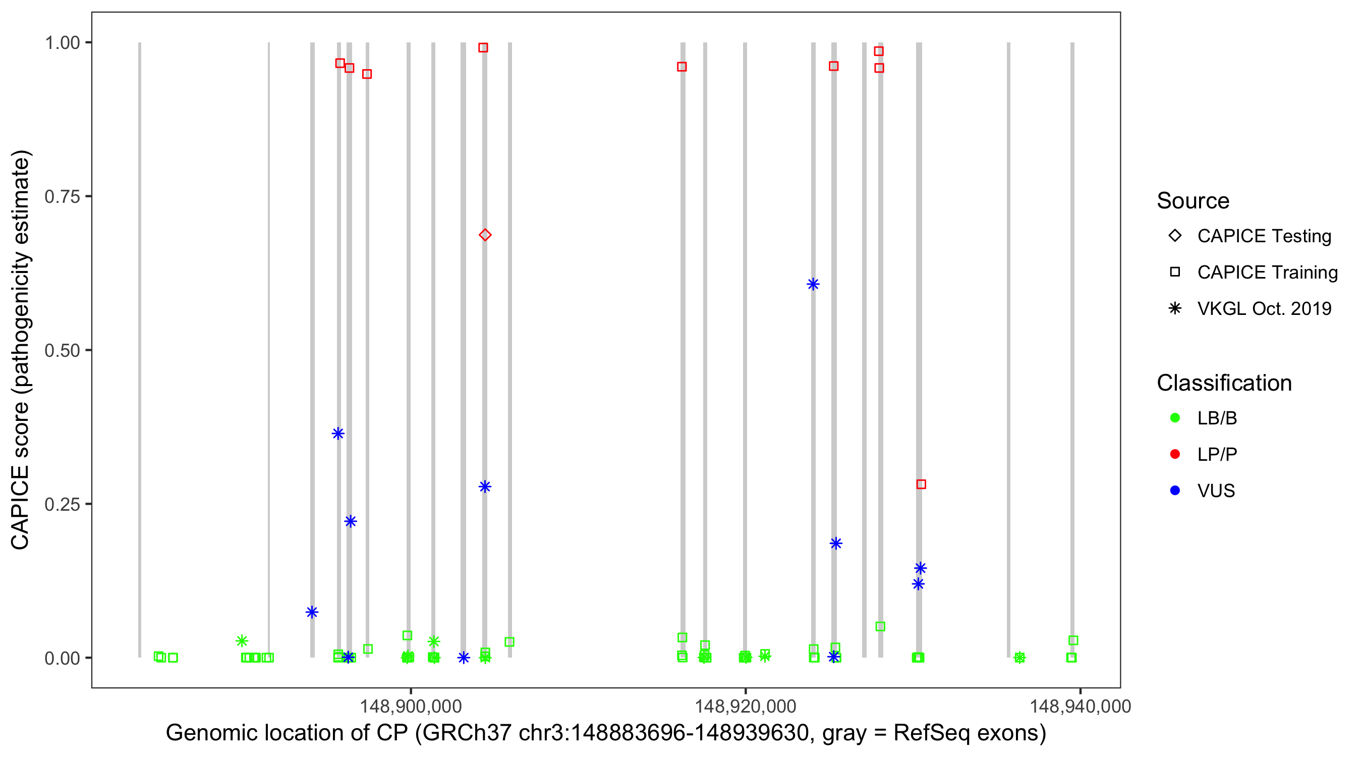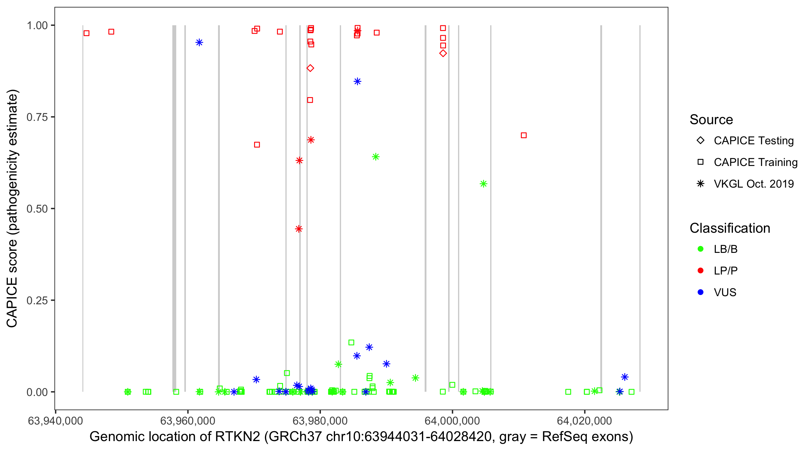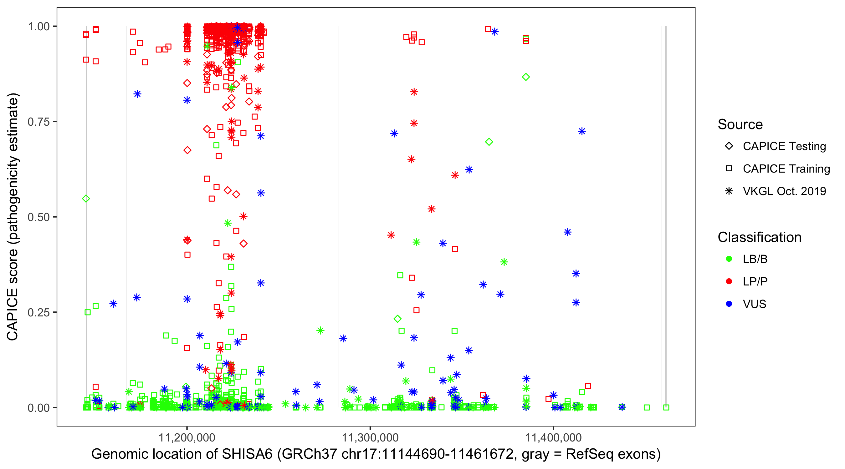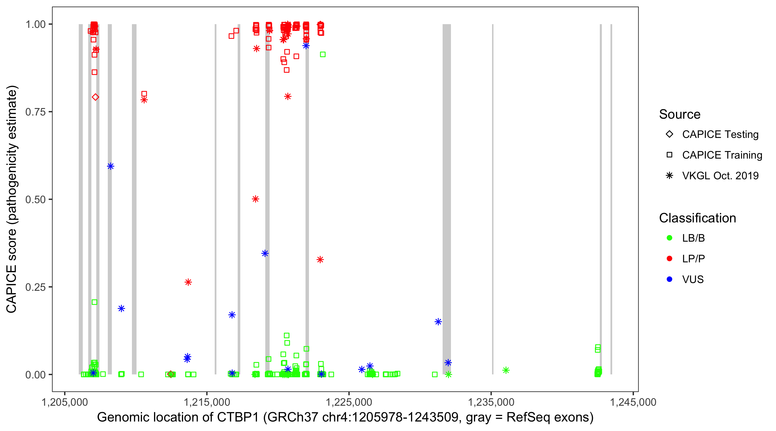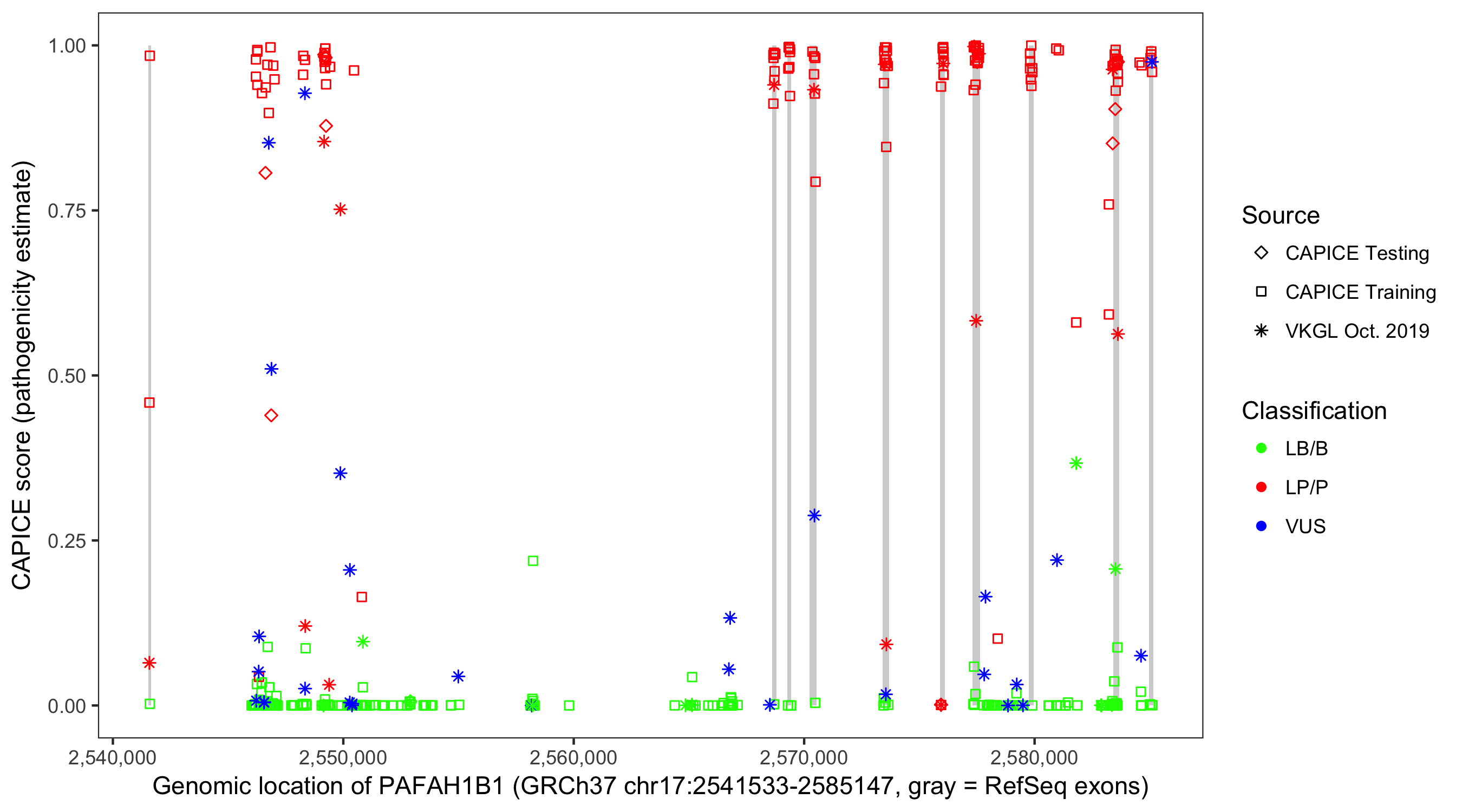 Shown are CAPICE train/test variants plus VKGL Oct 2019.