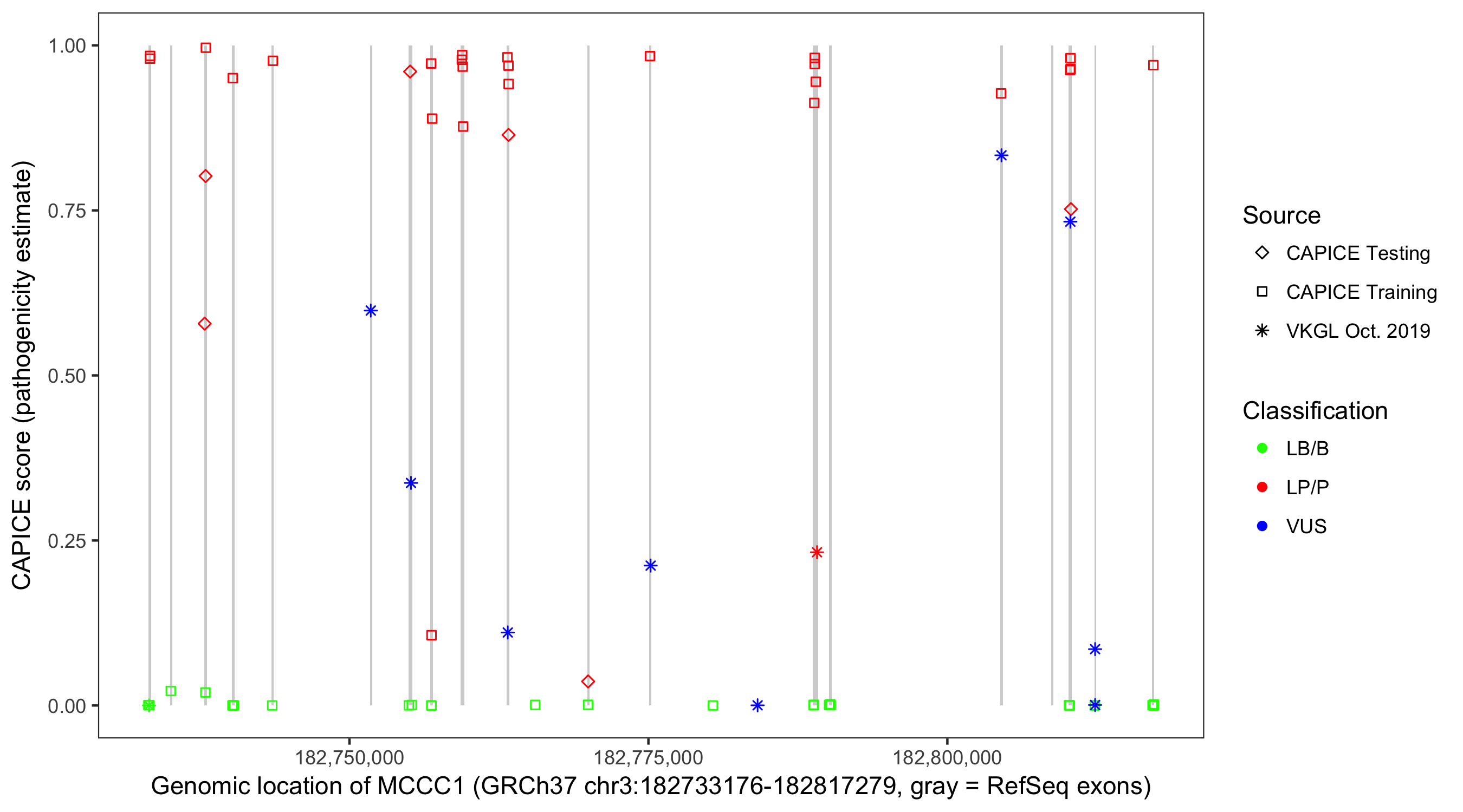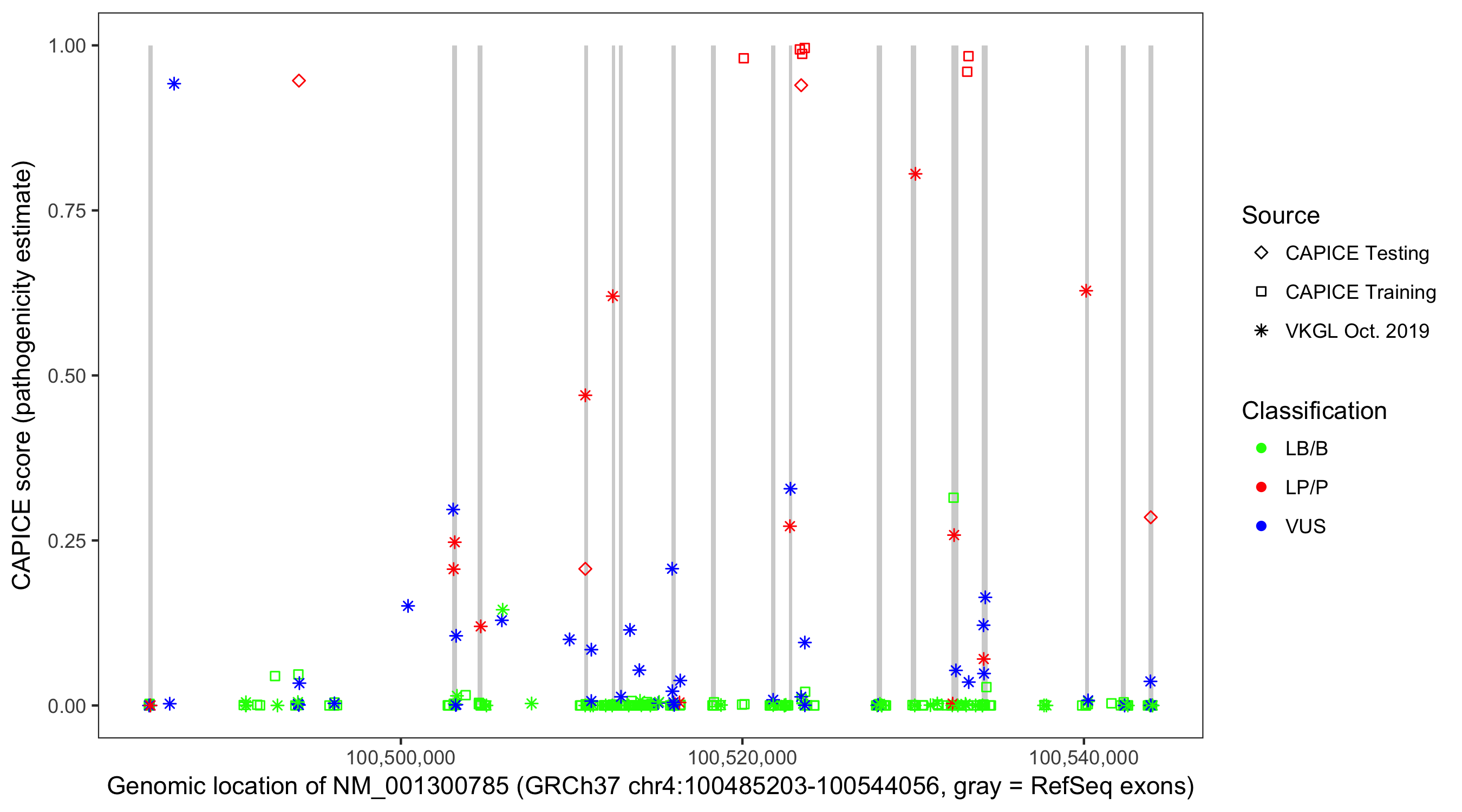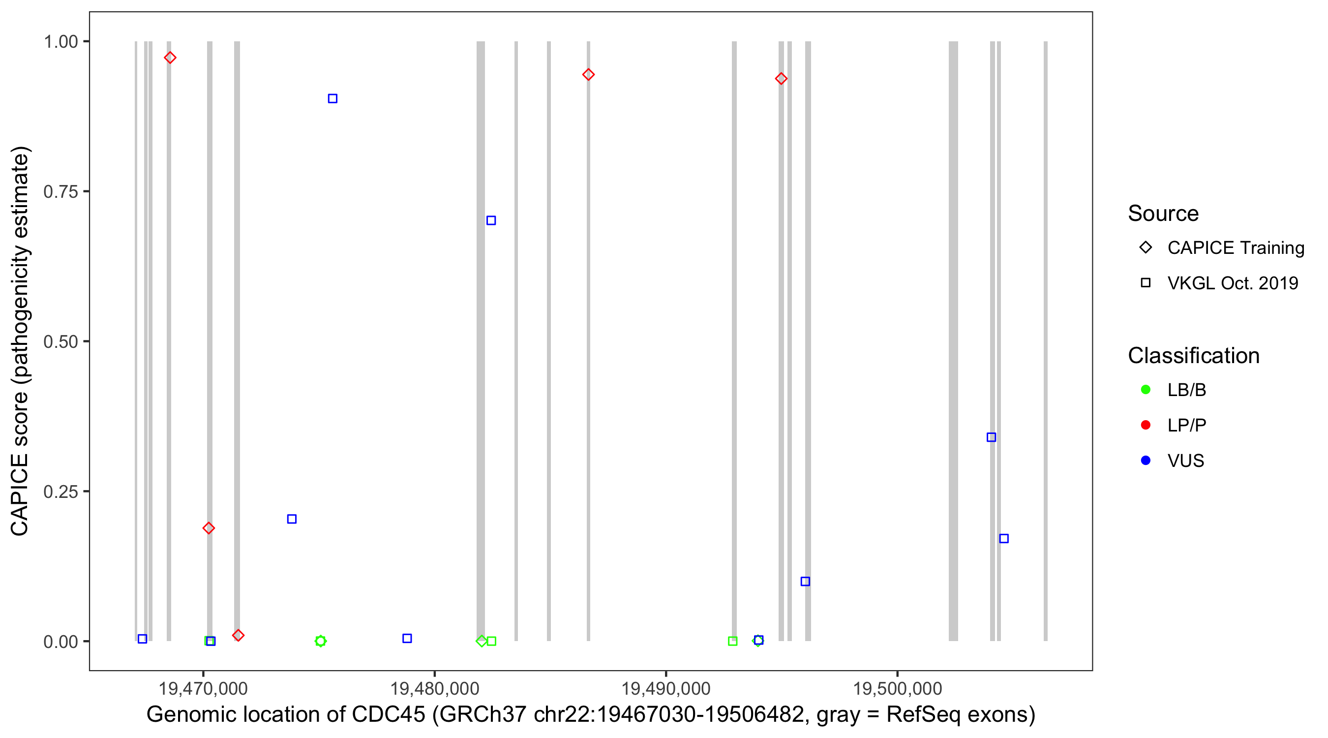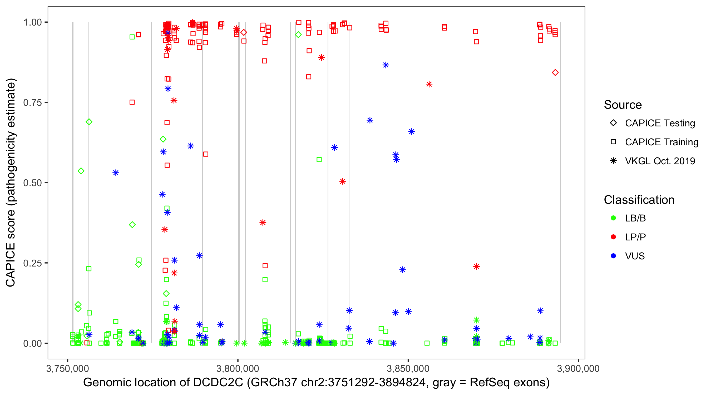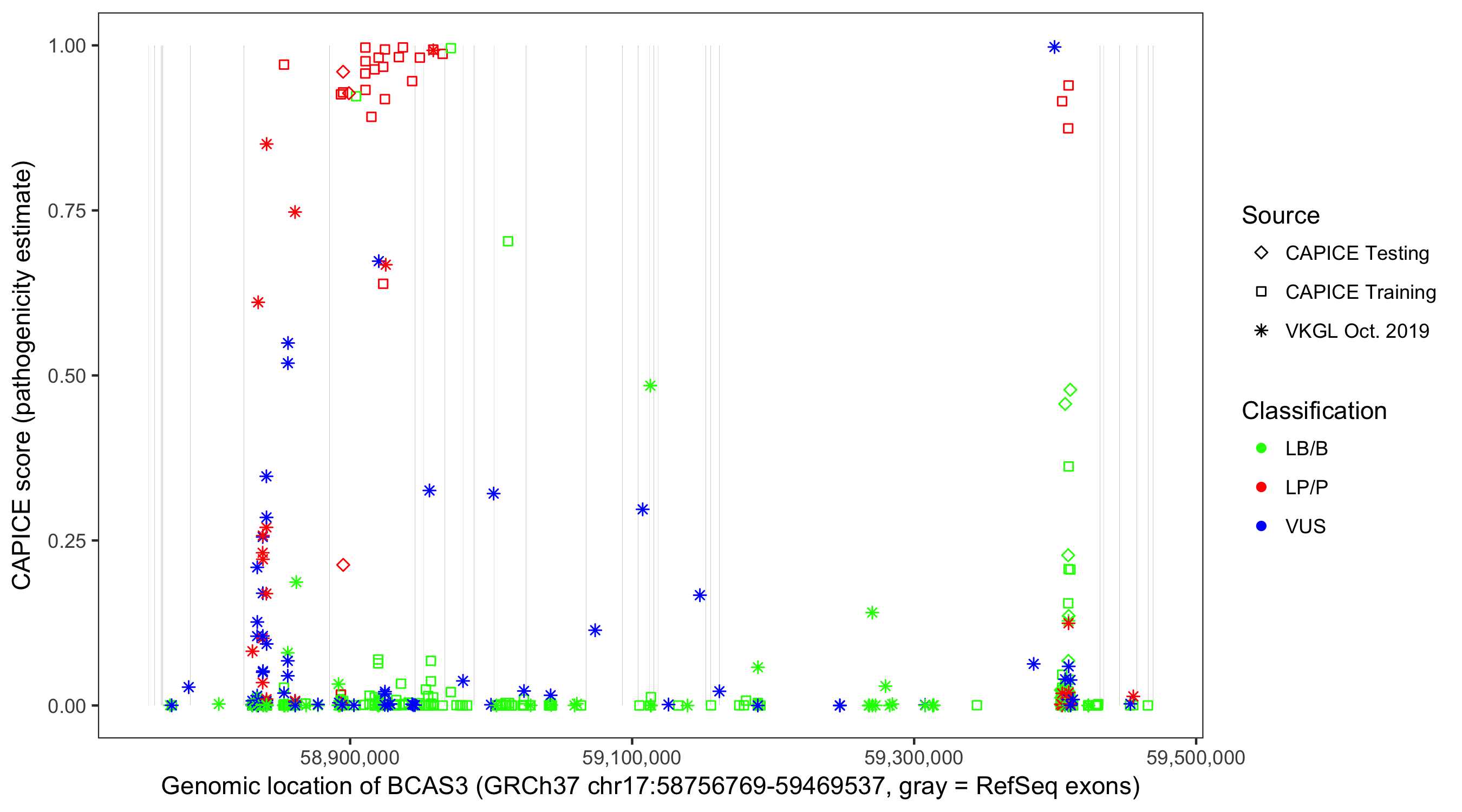 Shown are CAPICE train/test variants plus VKGL Oct 2019.