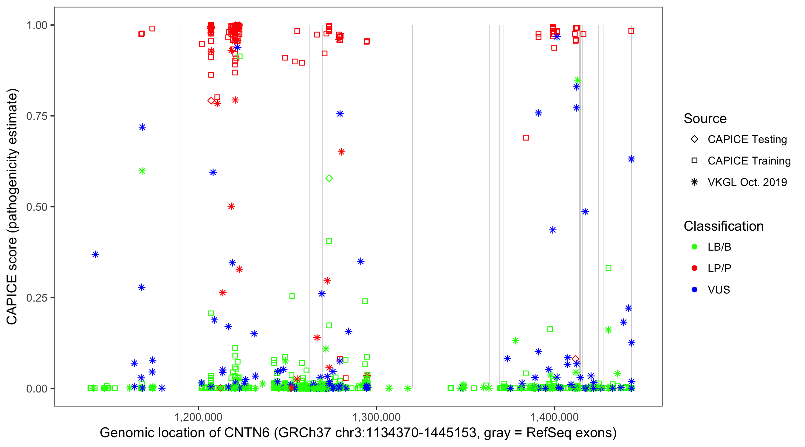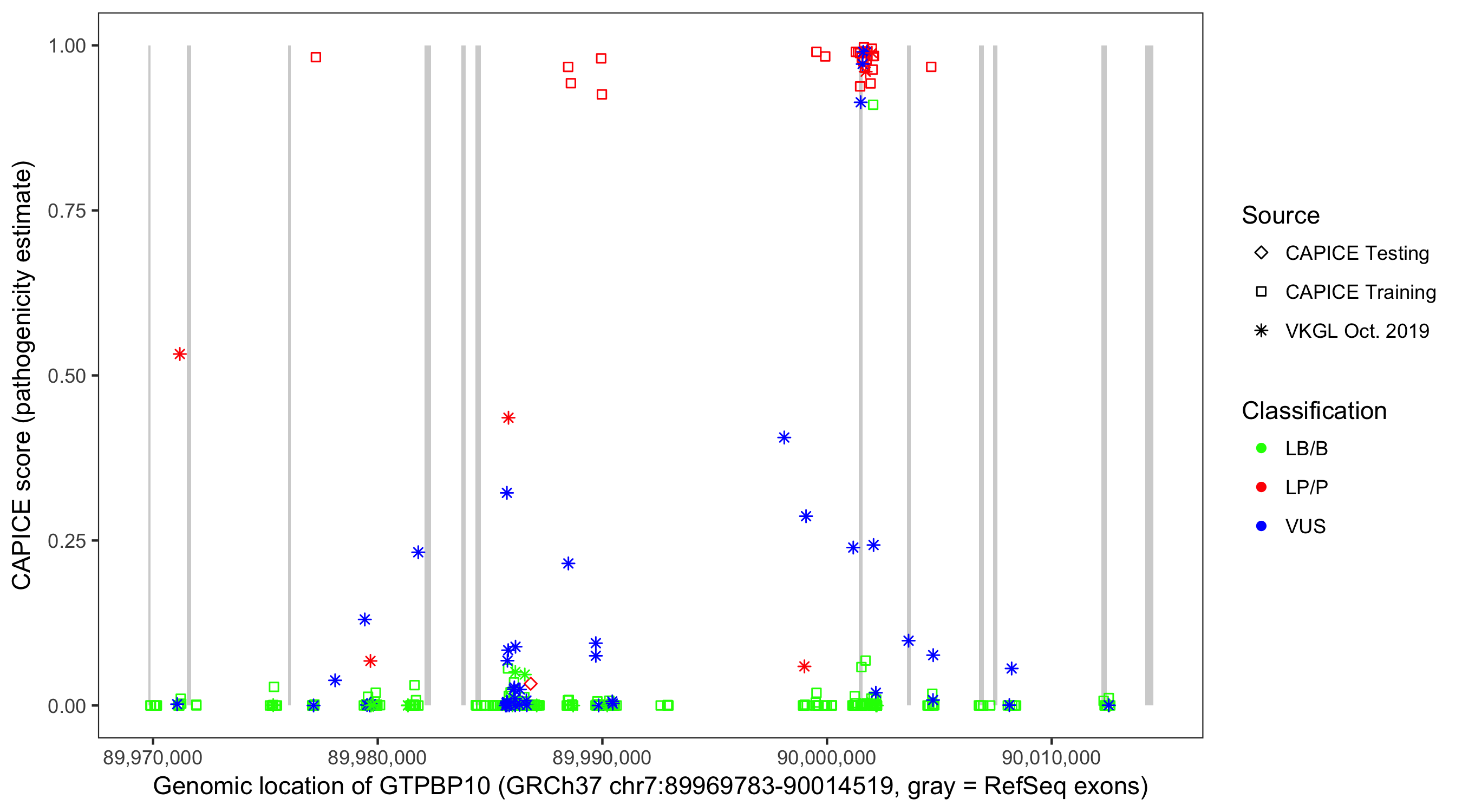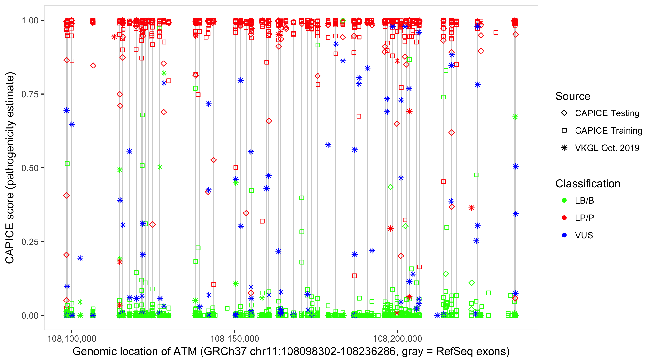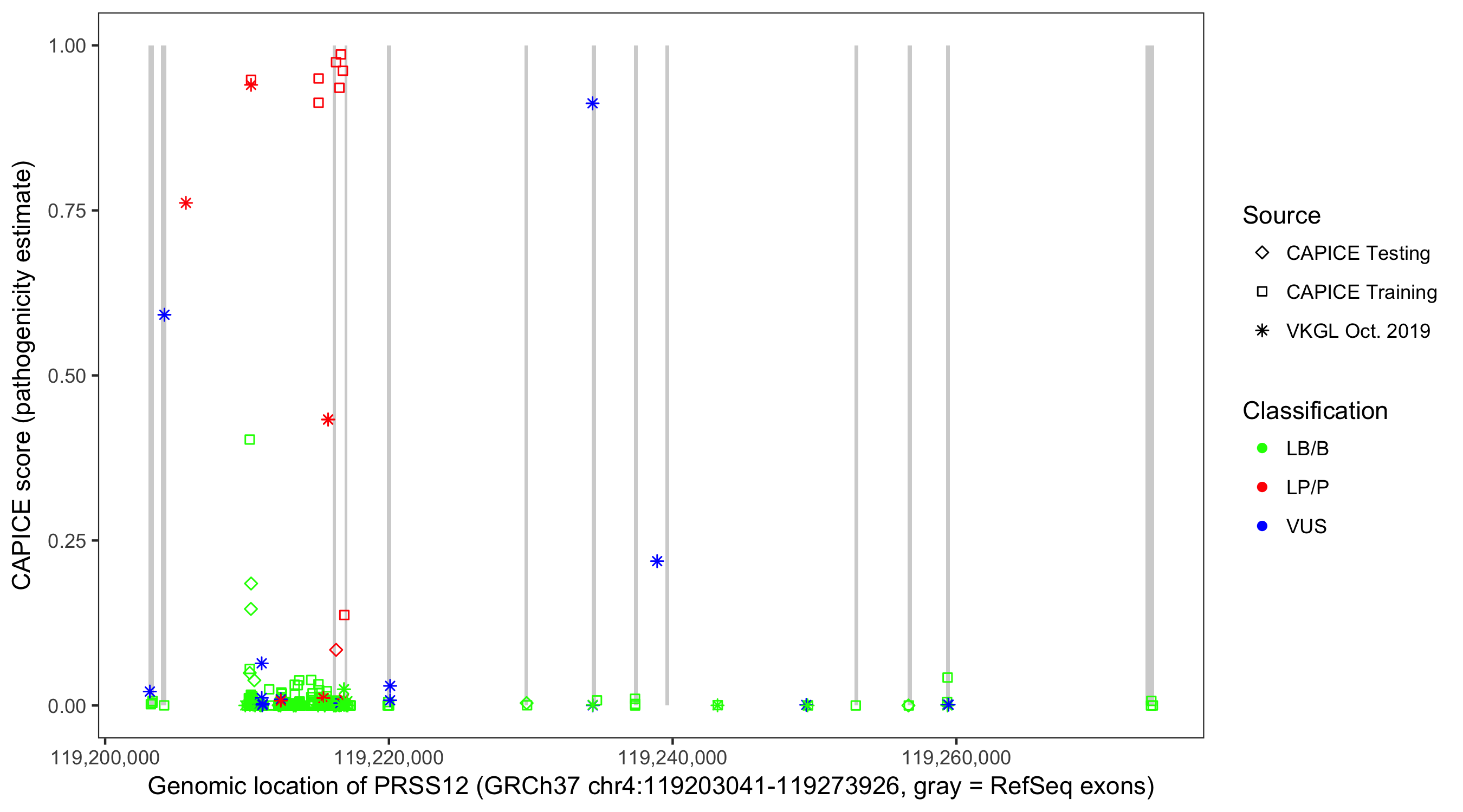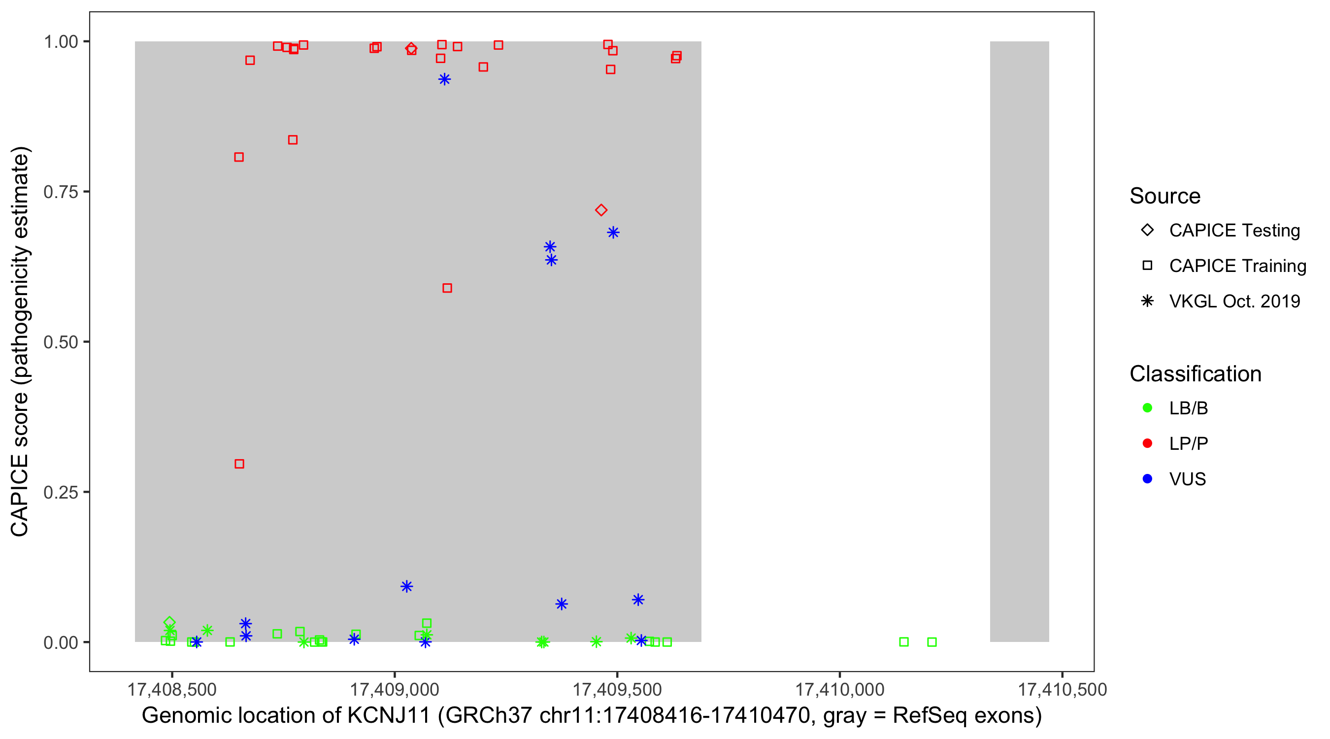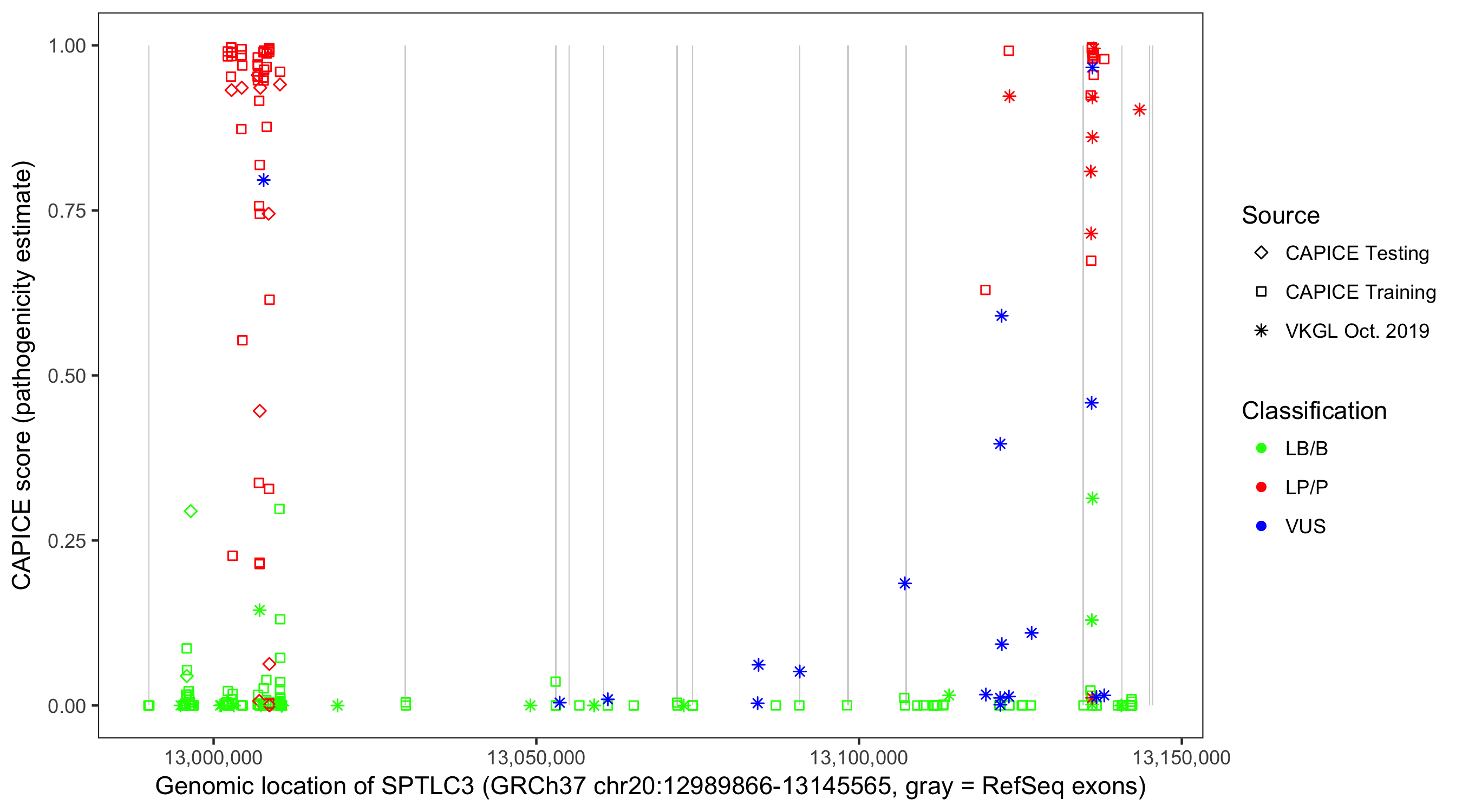 Shown are CAPICE train/test variants plus VKGL Oct 2019.