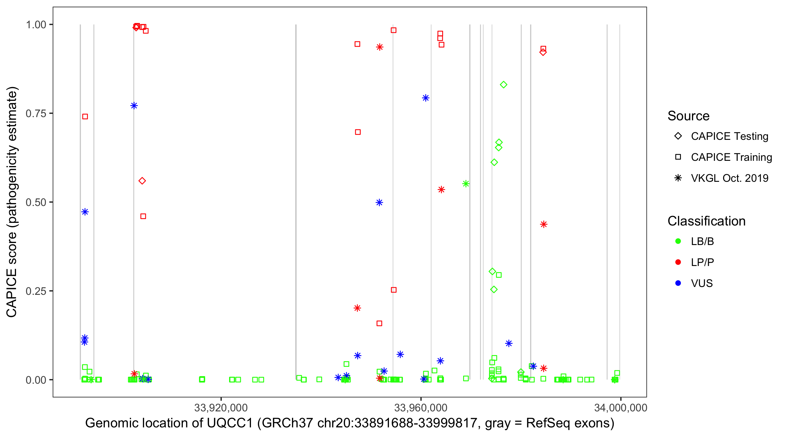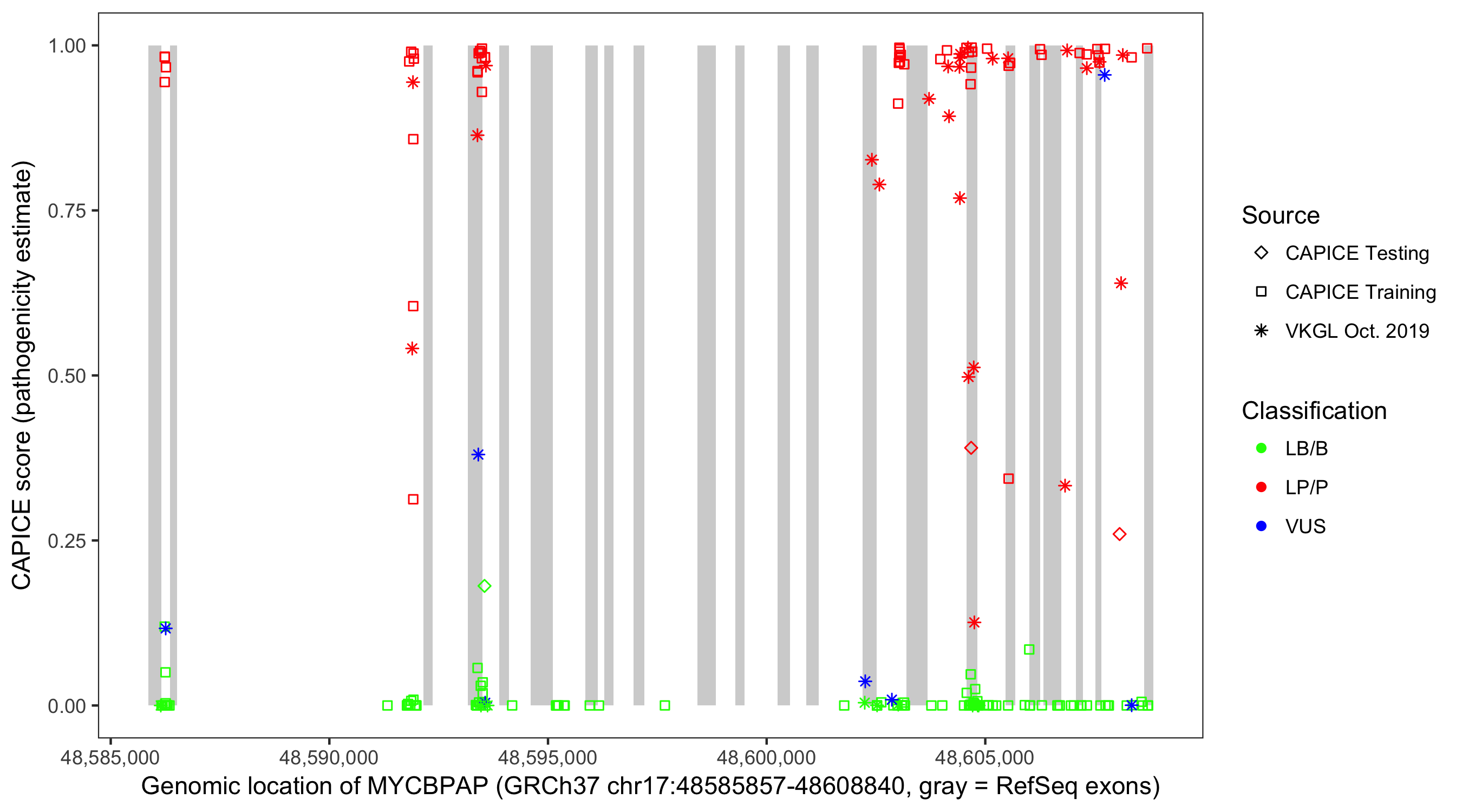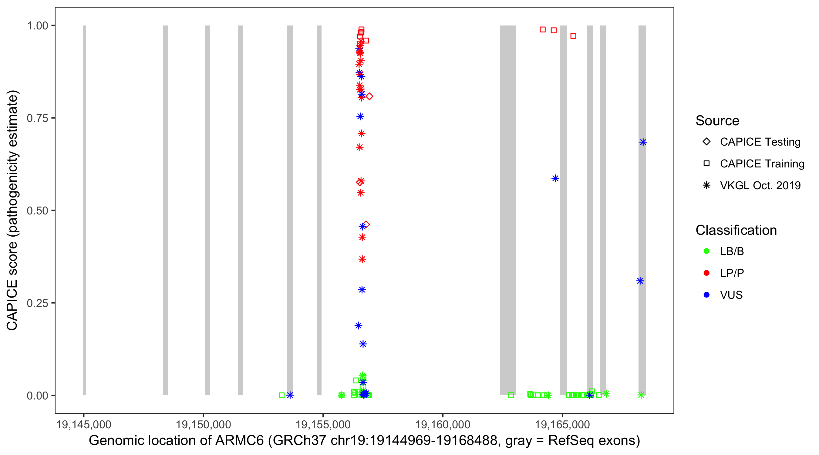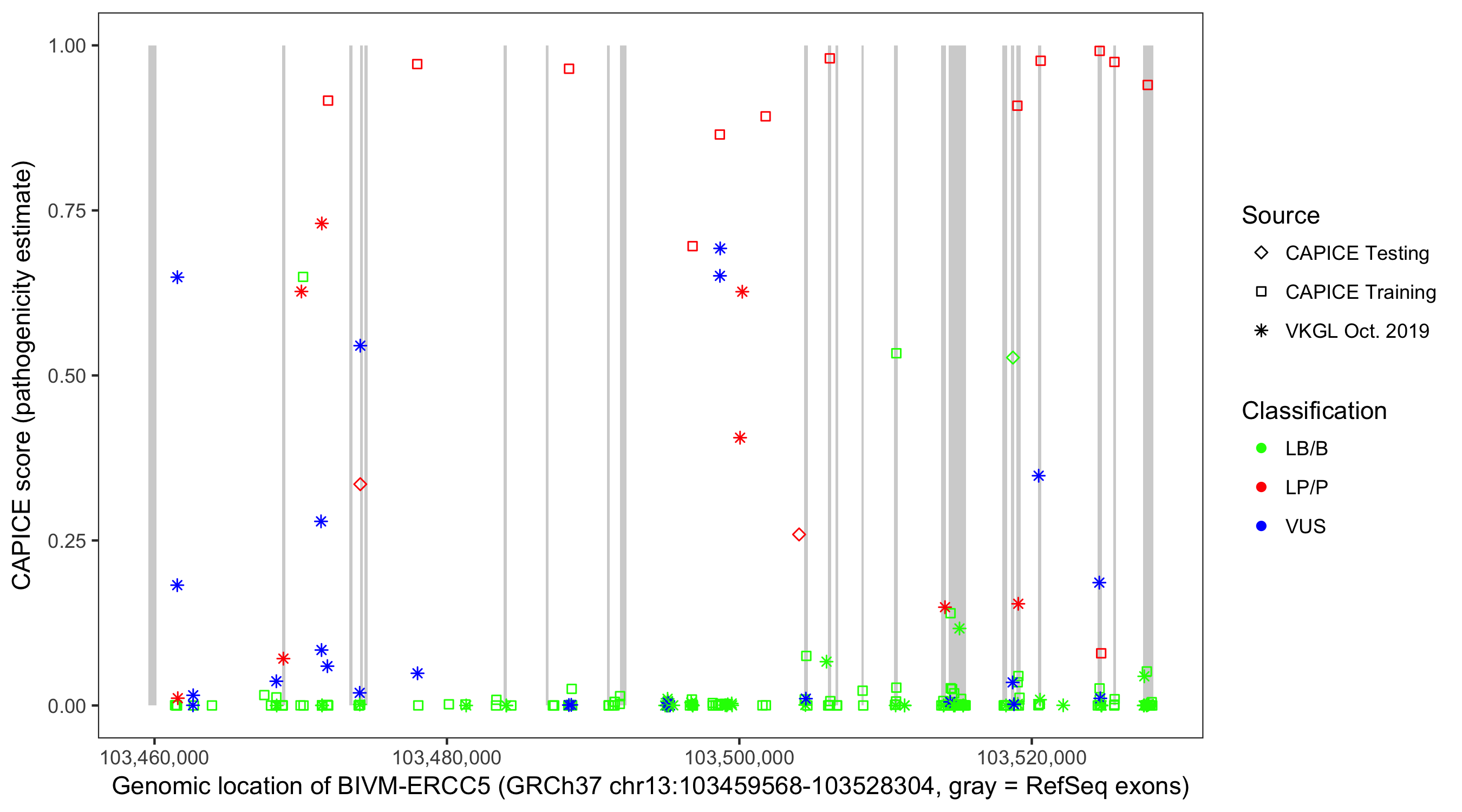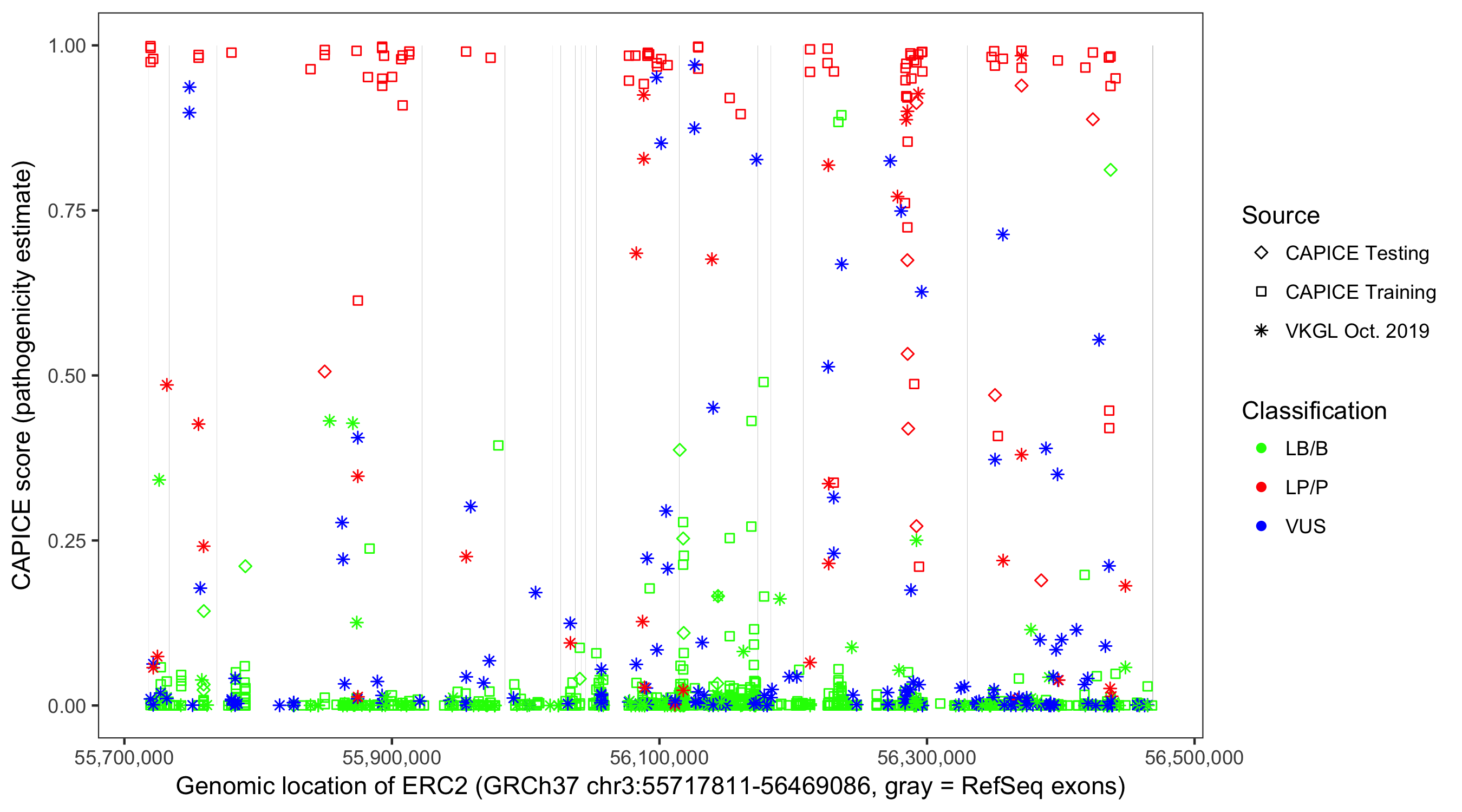 Shown are CAPICE train/test variants plus VKGL Oct 2019.
